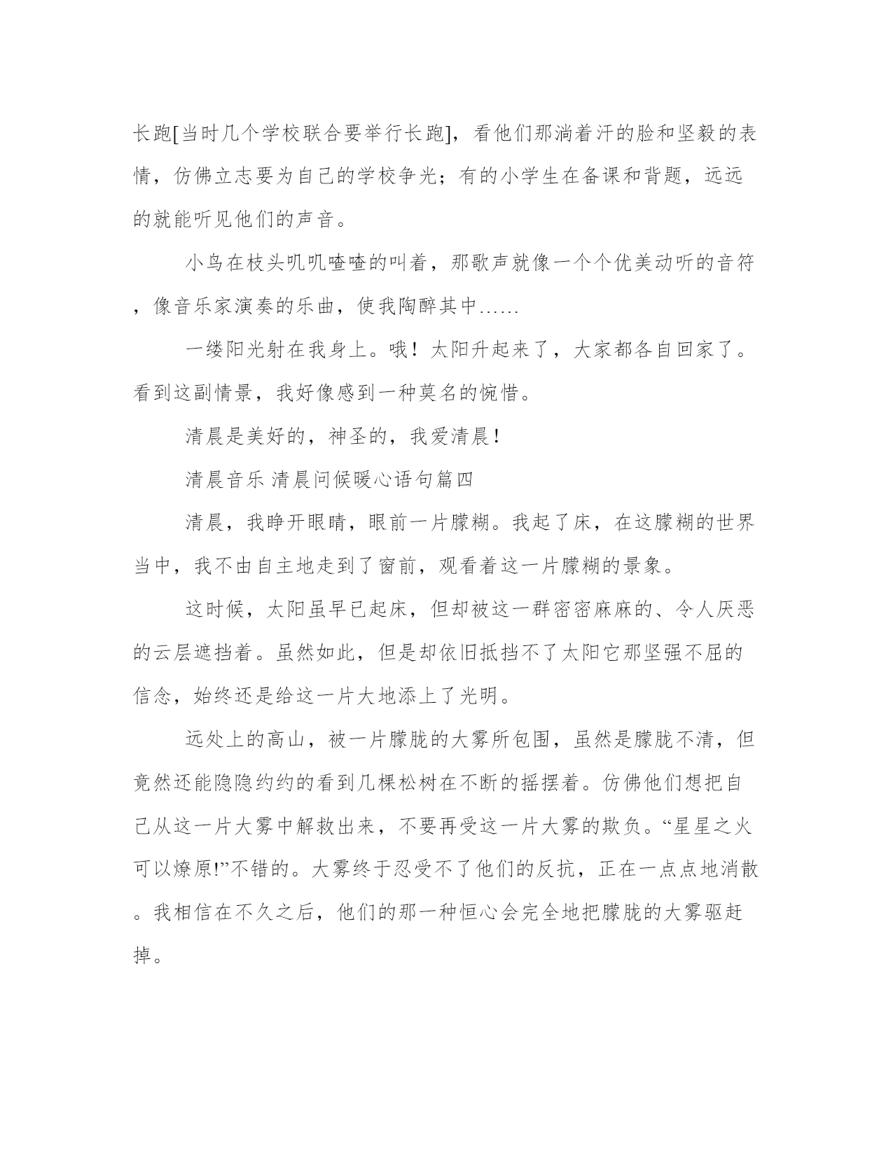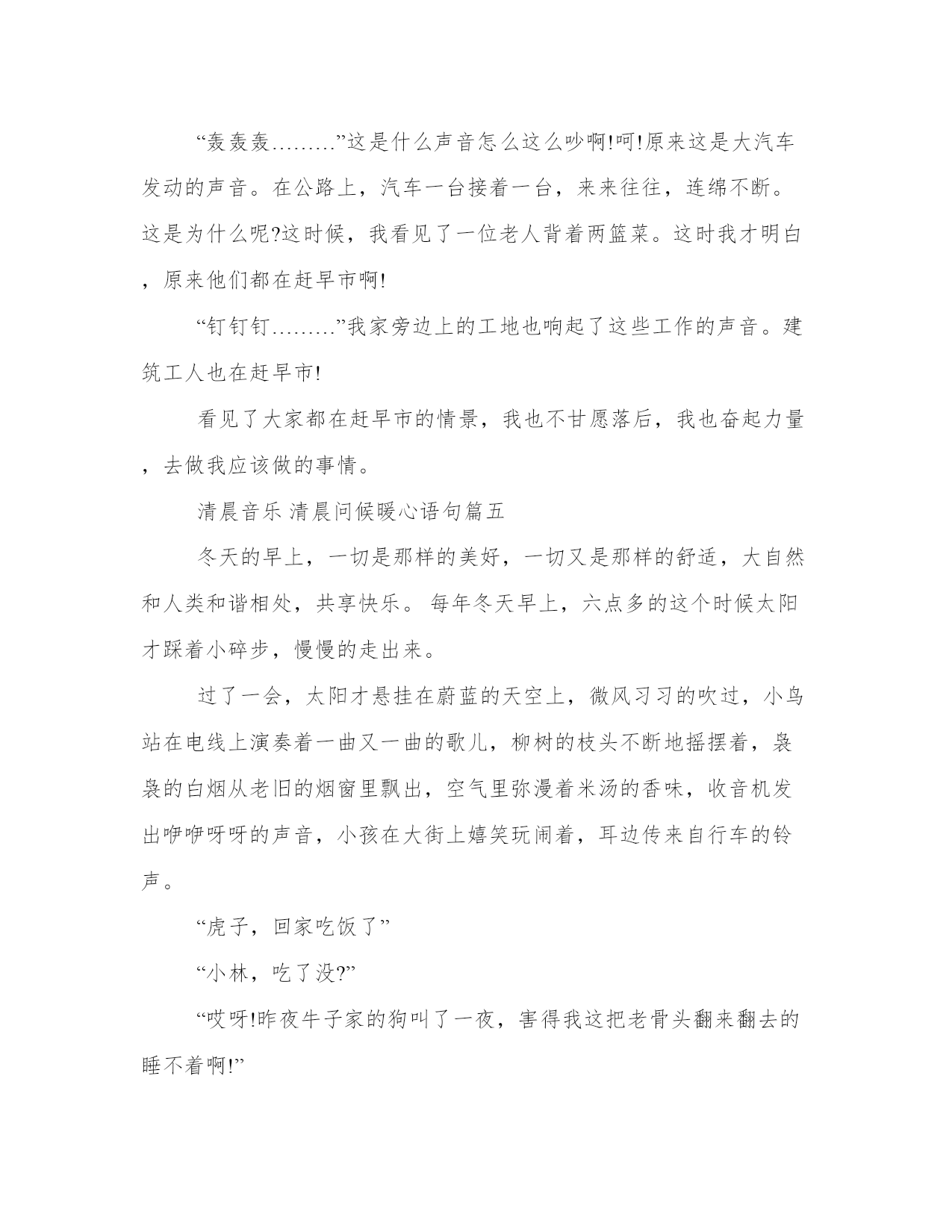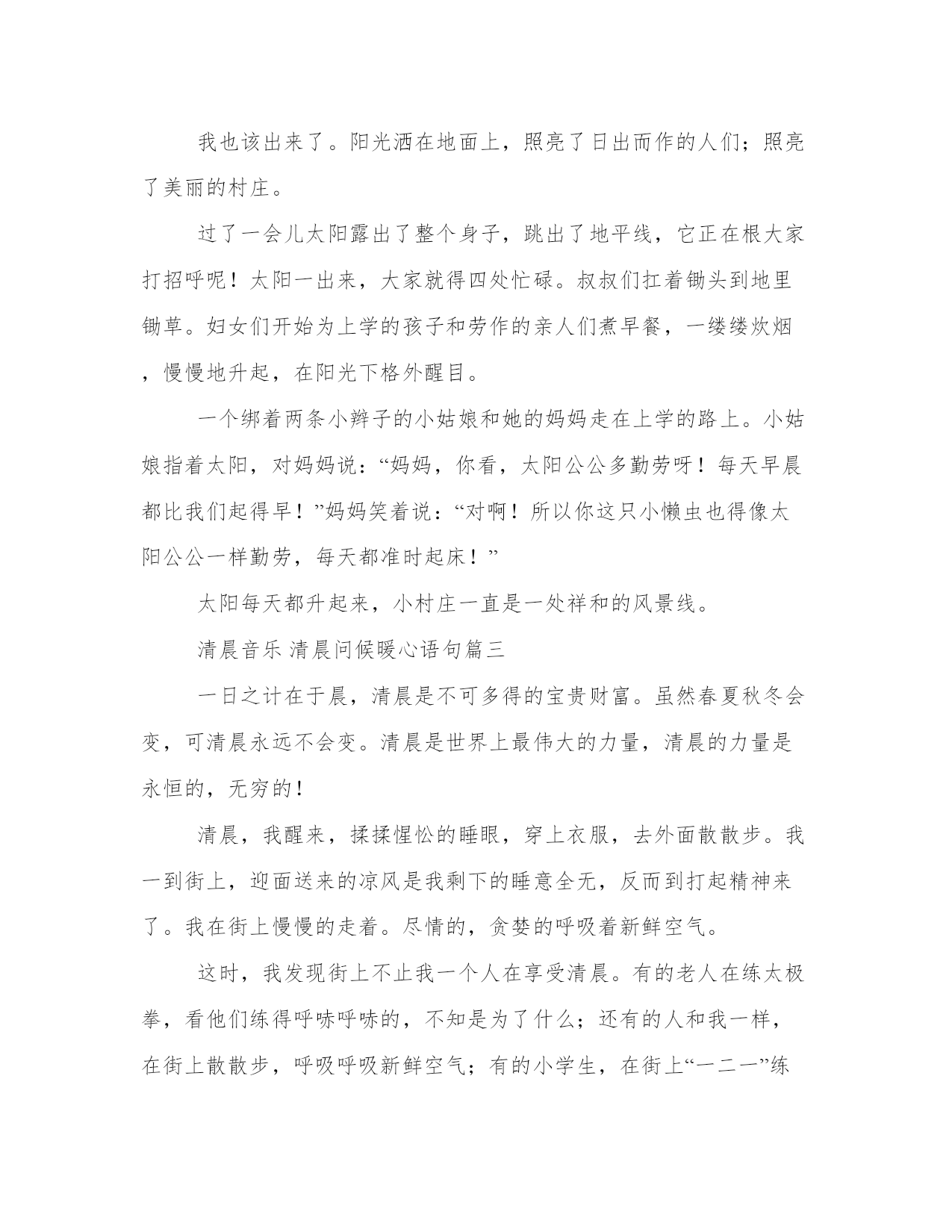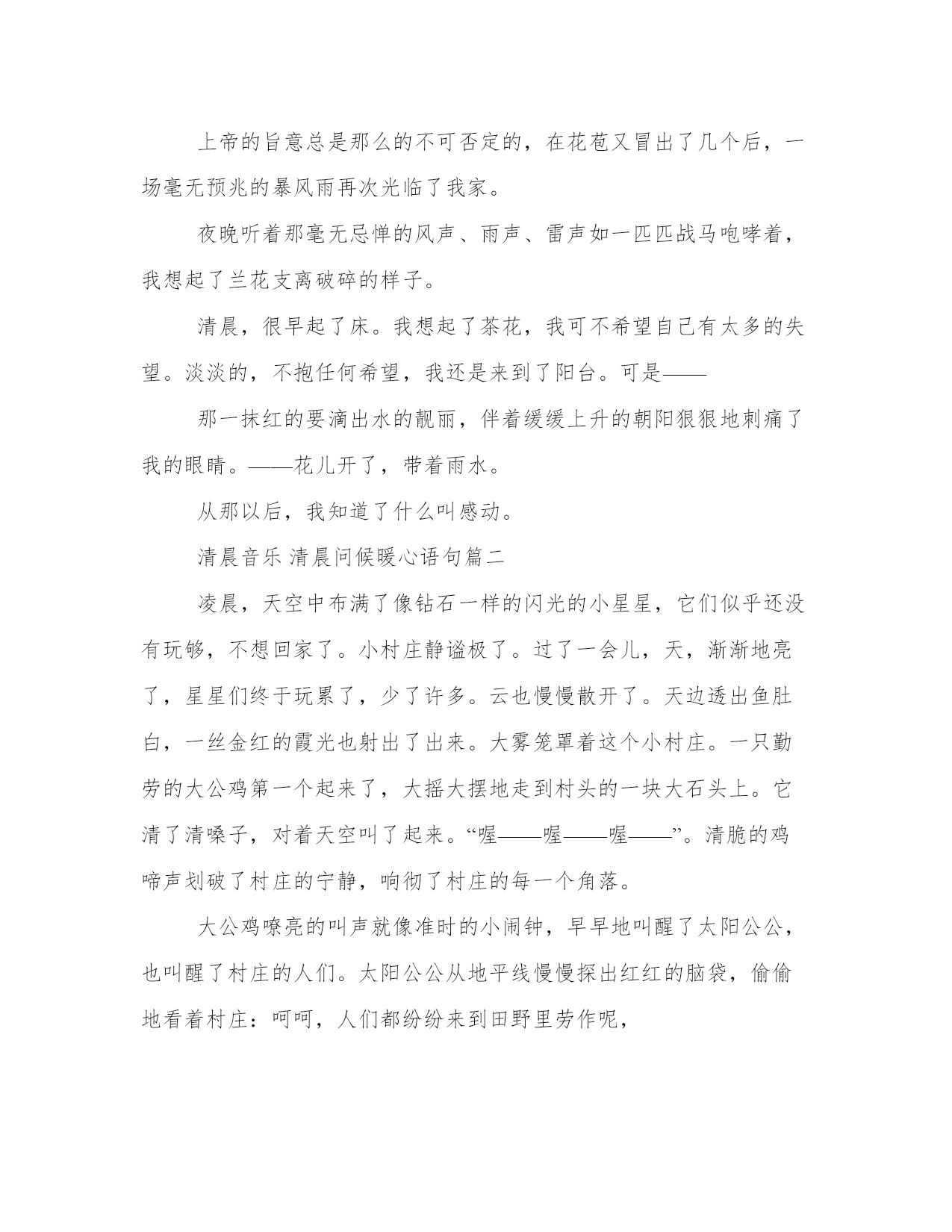 清晨音乐清晨问候暖心语句(优秀9篇)每个人都曾试图在平淡的学习、工作和生活中写一篇文章。写作是培养人的观察、联想、想象、思维和记忆的重要手段。大家想知道怎么样才能写一篇比较优质的范文吗?下面我给大家整理了一些优秀范文,希望能够帮助到大家,我们一起来看一看吧。清晨音乐清晨问候暖心语句篇一家一直住在高楼,浑浊不清的空气终于刺激到了妈妈。第二天,家里的阳台上多出了一盆高雅的兰花。淡淡的蓝色给天际添加了一抹温馨,兰花高贵的花儿却始终傲然挺立着。很不幸,第二个星期的一阵狂风暴雨使兰花傲然的花朵支离破碎……不久,在兰花原来的位置多出了一盆“树杈”。“这是什么东西,妈妈。”语气里没有任何的疑问。“茶花啊!兰花太难养了。”茶花,我淡淡地看了看那段“树杈”,并没有太多的好感,那只是一段“树杈”。……过了不是多久,“树杈”上配着淡绿的叶子丛中露出了几朵小小的花苞。心里有点欣喜也有了些失望——茶花的姿色比兰花差了许多。上帝的旨意总是那么的不可否定的,在花苞又冒出了几个后,一场毫无预兆的暴风雨再次光临了我家。夜晚听着那毫无忌惮的风声、雨声、雷声如一匹匹战马咆哮着,我想起了兰花支离破碎的样子。清晨,很早起了床。我想起了茶花,我可不希望自己有太多的失望。淡淡的,不抱任何希望,我还是来到了阳台。可是——那一抹红的要滴出水的靓丽,伴着缓缓上升的朝阳狠狠地刺痛了我的眼睛。——花儿开了,带着雨水。从那以后,我知道了什么叫感动。清晨音乐清晨问候暖心语句篇二凌晨,天空中布满了像钻石一样的闪光的小星星,它们似乎还没有玩够,不想回家了。小村庄静谧极了。过了一会儿,天,渐渐地亮了,星星们终于玩累了,少了许多。云也慢慢散开了。天边透出鱼肚白,一丝金红的霞光也射出了出来。大雾笼罩着这个小村庄。一只勤劳的大公鸡第一个起来了,大摇大摆地走到村头的一块大石头上。它清了清嗓子,对着天空叫了起来。“喔——喔——喔——”。清脆的鸡啼声划破了村庄的宁静,响彻了村庄的每一个角落。大公鸡嘹亮的叫声就像准时的小闹钟,早早地叫醒了太阳公公,也叫醒了村庄的人们。太阳公公从地平线慢慢探出红红的脑袋,偷偷地看着村庄:呵呵,人们都纷纷来到田野里劳作呢,我也该出来了。阳光洒在地面上,照亮了日出而作的人们;照亮了美丽的村庄。过了一会儿太阳露出了整个身子,跳出了地平线,它正在根大家打招呼呢!太阳一出来,大家就得四处忙碌。叔叔们扛着锄头到地里锄草。妇女们开始为上学的孩子和劳作的亲人们煮早餐,一缕缕炊烟,慢慢地升起,在阳光下格外醒目。一个绑着两条小辫子的小姑娘和她的妈妈走在上学的路上。小姑娘指着太阳,对妈妈说:“妈妈,你看,太阳公公多勤劳呀!每天早晨都比我们起得早!”妈妈笑着说:“对啊!所以你这只小懒虫也得像太阳公公一样勤劳,每天都准时起床!”太阳每天都升起来,小村庄一直是一处祥和的风景线。清晨音乐清晨问候暖心语句篇三一日之计在于晨,清晨是不可多得的宝贵财富。虽然春夏秋冬会变,可清晨永远不会变。清晨是世界上最伟大的力量,清晨的力量是永恒的,无穷的!清晨,我醒来,揉揉惺忪的睡眼,穿上衣服,去外面散散步。我一到街上,迎面送来的凉风是我剩下的睡意全无,反而到打起精神来了。我在街上慢慢的走着。尽情的,贪婪的呼吸着新鲜空气。这时,我发现街上不止我一个人在享受清晨。有的老人在练太极拳,看他们练得呼哧呼哧的,不知是为了什么;还有的人和我一样,在街上散散步,呼吸呼吸新鲜空气;有的小学生,在街上“一二一”练长跑[当时几个学校联合要举行长跑],看他们那淌着汗的脸和坚毅的表情,仿佛立志要为自己的学校争光;有的小学生在备课和背题,远远的就能听见他们的声音。小鸟在枝头叽叽喳喳的叫着,那歌声就像一个个优美动听的音符,像音乐家演奏的乐曲,使我陶醉其中……一缕阳光射在我身上。哦!太阳升起来了,大家都各自回家了。看到这副情景,我好像感到一种莫名的惋惜。清晨是美好的,神圣的,我爱清晨!清晨音乐清晨问候暖心语句篇四清晨,我睁开眼睛,眼前一片朦糊。我起了床,在这朦糊的世界当中,我不由自主地走到了窗前,观看着这一片朦糊的景象。这时候,太阳虽早已起床,但却被这一群密密麻麻的、令人厌恶的云层遮挡着。虽然如此,但是却依旧抵挡不了太阳它那坚强不屈的信念,始终还是给这一片大地添上了光明。远处上的高山,被一片朦胧的大雾所包围,虽然是朦胧不清,但竟然还能隐隐约约的看到几棵松树在不断的摇摆着。仿佛他们想把自己从这一片大雾中解救出来,不要再受这一片大雾的欺负。“星星之火可以燎原!”不错的。大雾终于忍受不了他们的反抗,正在一点点地消散。我相信在不久之后,他们的那一种恒心会完全地把朦胧的大雾驱赶掉。“轰轰轰………”这是什么声音怎么这么吵啊!呵!原来这是大汽车发动的声音。在公路上,汽车一台接着一台,来来往往,连绵不断。这是为什么呢?这时候,我看见了一位老人背着两篮菜。这时我才明白
