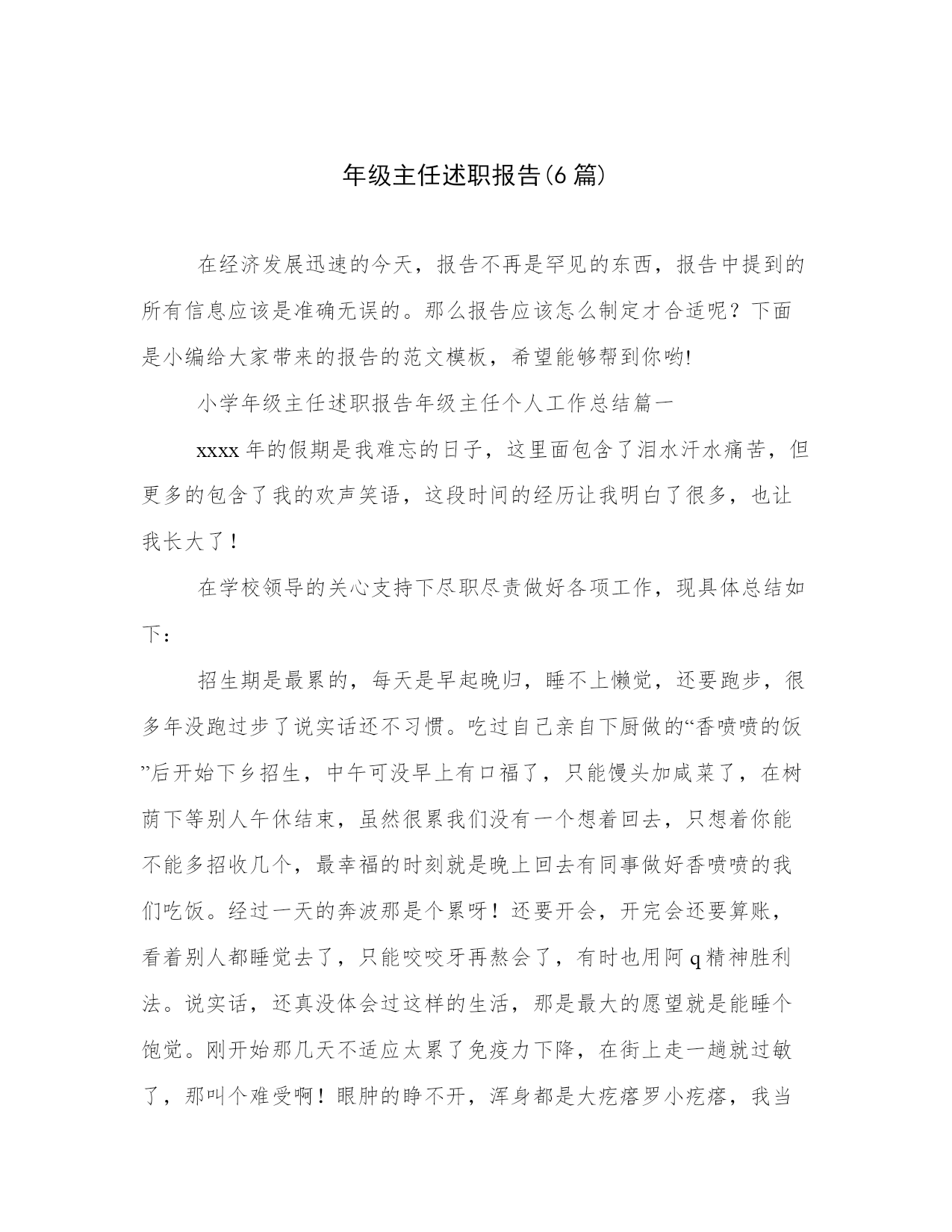 年级主任述职报告(6篇)在经济发展迅速的今天,报告不再是罕见的东西,报告中提到的所有信息应该是准确无误的。那么报告应该怎么制定才合适呢?下面是小编给大家带来的报告的范文模板,希望能够帮到你哟!小学年级主任述职报告年级主任个人工作总结篇一xxxx年的假期是我难忘的日子,这里面包含了泪水汗水痛苦,但更多的包含了我的欢声笑语,这段时间的经历让我明白了很多,也让我长大了!在学校领导的关心支持下尽职尽责做好各项工作,现具体总结如下:招生期是最累的,每天是早起晚归,睡不上懒觉,还要跑步,很多年没跑过步了说实话还不习惯。吃过自己亲自下厨做的“香喷喷的饭”后开始下乡招生,中午可没早上有口福了,只能馒头加咸菜了,在树荫下等别人午休结束,虽然很累我们没有一个想着回去,只想着你能不能多招收几个,最幸福的时刻就是晚上回去有同事做好香喷喷的我们吃饭。经过一天的奔波那是个累呀!还要开会,开完会还要算账,看着别人都睡觉去了,只能咬咬牙再熬会了,有时也用阿q精神胜利法。说实话,还真没体会过这样的生活,那是最大的愿望就是能睡个饱觉。刚开始那几天不适应太累了免疫力下降,在街上走一趟就过敏了,那叫个难受啊!眼肿的睁不开,浑身都是大疙瘩罗小疙瘩,我当时很想放弃,看着队员们都很卖劲,他们对我的关心,我打消了这个念头,我们是一个整体我不能丢下他们。在招生期老天好像也故意刁难我们连着下雨,这也没有阻止我们下乡招生,雨中人们都回到了自己温暖的家,唯有我们在雨中“赏雨中独有的风景”还会放几首歌曲,好不惬意!我们没有抱怨,我们把这当做是历练,还记得宋总说过一句话:“合理的是锻炼,不合理的是磨练”这些困难不算什么,最让人着急又无能为力的是,招生到的人数不理想。唯一能做的就是坚持走下去,用我们的毅力诚意抢他们相信我们不是骗子,用我们的细心关心真心爱心打动他们,雨中送伞,帮助救火等等。刚开始这的人有点排斥我们,是我们感染了他们,慢慢的对我们好了,这让我们很欣慰,心里暖暖的。招生期让我体会到了什么是生活,人活着实在不易,生活更是不易,我们要好好的生活,这期间教会了我生活不是现成的,我们要去创造自己想要的生活!教会了我要坚持,不怕困难的精神,教会了我要有团队精神,不能自私,懂得关心他人,团结就是力量!只要我们团结一致,一定能够克服困难,达到目标!招生期锻炼练了我,成长了我!终于盼到了授课期,这与想象的完全不一样,原以为可以放松一下不会再那么辛苦了,不是那样的,比招生期还累!担任六年级班主任工作中,我深刻的体会到了当老师的辛苦和不易。白天的课程满满的,晚上还要备。孩子还非常淘气,每天都是事,我只要一离开教室,总会弄出来点事,全班都喊:“老师她哭了,老师他打我了,老师他拿我的东西了,”太多了我的耳朵都装不公,每天都是处理不完的事。还有每天和他们在一起,我也快变成医生了,一会他肚子疼一会他发烧一会他吐了,唉,没办法,我这是身兼几职。还有的家长添乱,有的说教的慢了,还有说教的快了,众人口味难调呀!陈宾校长每天要处理很多事,还要和这些不明事理的家长解释,那几天陈校长几乎没吃过饭,嘴上面虚的都是泡。授课期让我学会了忍耐,让我学会了照顾小孩,这也算是为以后积累经验吧,陈校长的为让我感动,有什么事他都第一个冲在前面,无怨无悔,从不抱怨,他教会了我“责任”二字。感受颇多,受益匪浅!在学校领导关心支持下,同事的热情帮助下,我完成了我的教学工作。我认真完成学校不值得各项工作,培养学生学习清洁卫生遵守纪律等良好的习惯。努力创造一个团结向上富有朝气的班集体。课下家访,和家长沟通交流,为孩子改进提高共同努力!家长非常支持我们的工作。学生经过一个月有计划有步骤的培训后,学生水平有了很大的提高,不仅在学习文课方面,在习惯态度方面也有不小改进。在学校的支持下建成本校特色的风采!在这期间,我自己做的尚有不足,还需改进,我会继续努力,改进自己。学习其他同事的优点,以及他们好的教学方法,改变自己的不足!xxxx,是让人成长的地方!选择xxxx,我不后悔!!小学年级主任述职报告年级主任个人工作总结篇二大家好!时间过得真快,转眼间,本学期将顺利结束。在我向在座的各位作述职之前,先对平时给予我关心和帮助的学校领导、同事以及支持与配合我们级部工作的老师们表示万分的感谢!为了反思和总结工作经验,使下一期的工作有所进步和提高,下面,我就简单介绍一下我们三年级级部的总体情况。在全校的科室中,三年级办公室的老师是人最多,平均年龄最大,干劲最足,最团结,最求上进的团体。我们三年级共有13名教师,5位青年教师(全担任班主任工作),8位在职教师(且全在40岁以上)。其中xx老师、xxx老师、xx老师分别是数学、语文、艺体教师中年龄最大的。这些教师都能做到爱岗敬业,乐于奉献,积极工作。平时尽心尽力,团结协作,共同奋斗。年轻教师有创劲,有干劲,有毅力,