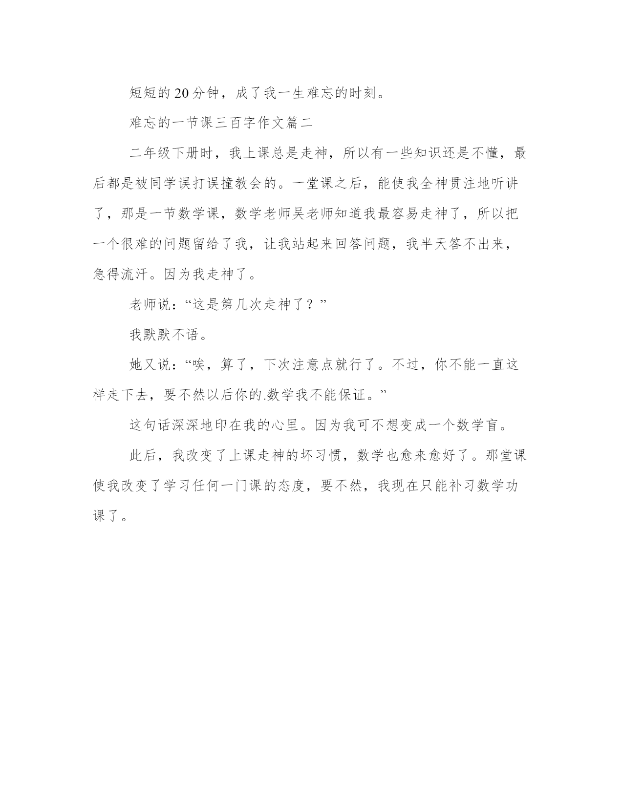 难忘的一节课三百字作文模板每个人都曾试图在平淡的学习、工作和生活中写一篇文章。写作是培养人的观察、联想、想象、思维和记忆的重要手段。范文怎么写才能发挥它最大的作用呢?接下来小编就给大家介绍一下优秀的范文该怎么写,我们一起来看一看吧。难忘的一节课三百字作文篇一我们在礼堂外等了好久,不耐烦时,班长说:“排队。”我一进礼堂就被下了一大跳,我们在舞台上上课,台下有一百多位老师在听课。台上摆着课桌,和一个屏幕,还有一面黑板。“上课”。我正对着前面的东西出神,老师忽然喊了一声,下了我一大跳。下面开始上课了。老师说:“在生活中,有些微不足道的小事令我们感动。”我的脑子里净是一些乱七八糟的事,什么也听不进去。过了一会儿,我调整了一下神态继续听了下去。“请同学们回想一下,自己感动的事。”老师说。刚开始一个人也不敢举手,刘杲最勇敢,第一个举手。刘杲这一举,同学们也一个接一个举起了小手。最后,老师说:“同学们只要用心去感悟,用眼去多看,你就会有一双发现美的眼睛。”“请看屏幕吧。”屏幕上感人的事情我差一点哭。短短的20分钟,成了我一生难忘的时刻。难忘的一节课三百字作文篇二二年级下册时,我上课总是走神,所以有一些知识还是不懂,最后都是被同学误打误撞教会的。一堂课之后,能使我全神贯注地听讲了,那是一节数学课,数学老师吴老师知道我最容易走神了,所以把一个很难的问题留给了我,让我站起来回答问题,我半天答不出来,急得流汗。因为我走神了。老师说:“这是第几次走神了?”我默默不语。她又说:“唉,算了,下次注意点就行了。不过,你不能一直这样走下去,要不然以后你的.数学我不能保证。”这句话深深地印在我的心里。因为我可不想变成一个数学盲。此后,我改变了上课走神的坏习惯,数学也愈来愈好了。那堂课使我改变了学习任何一门课的态度,要不然,我现在只能补习数学功课了。