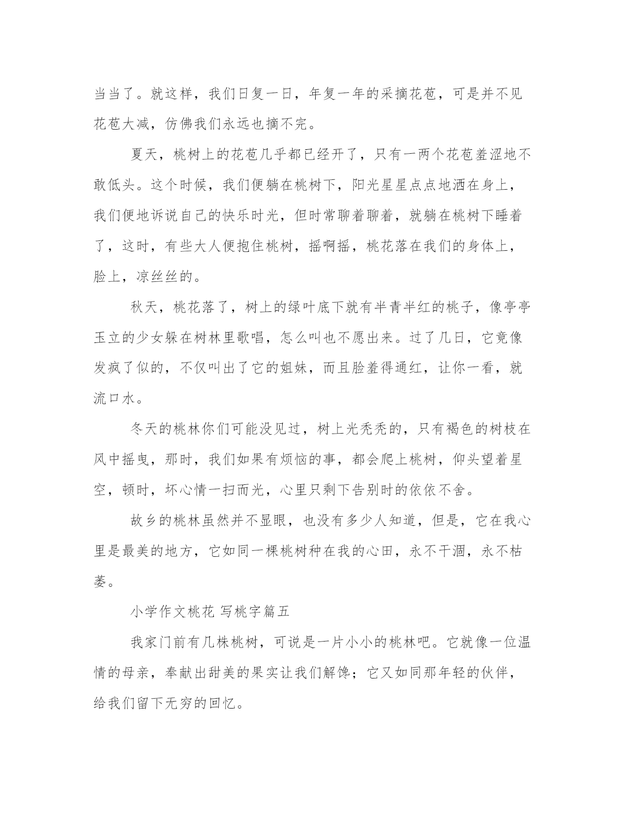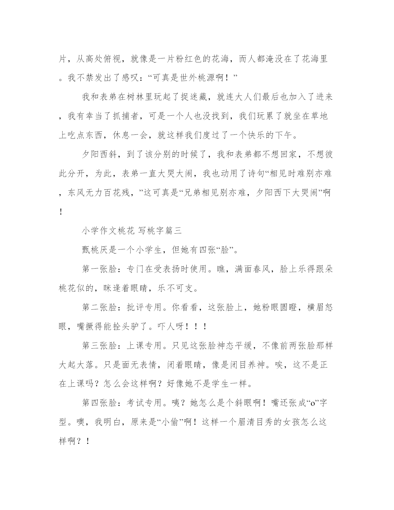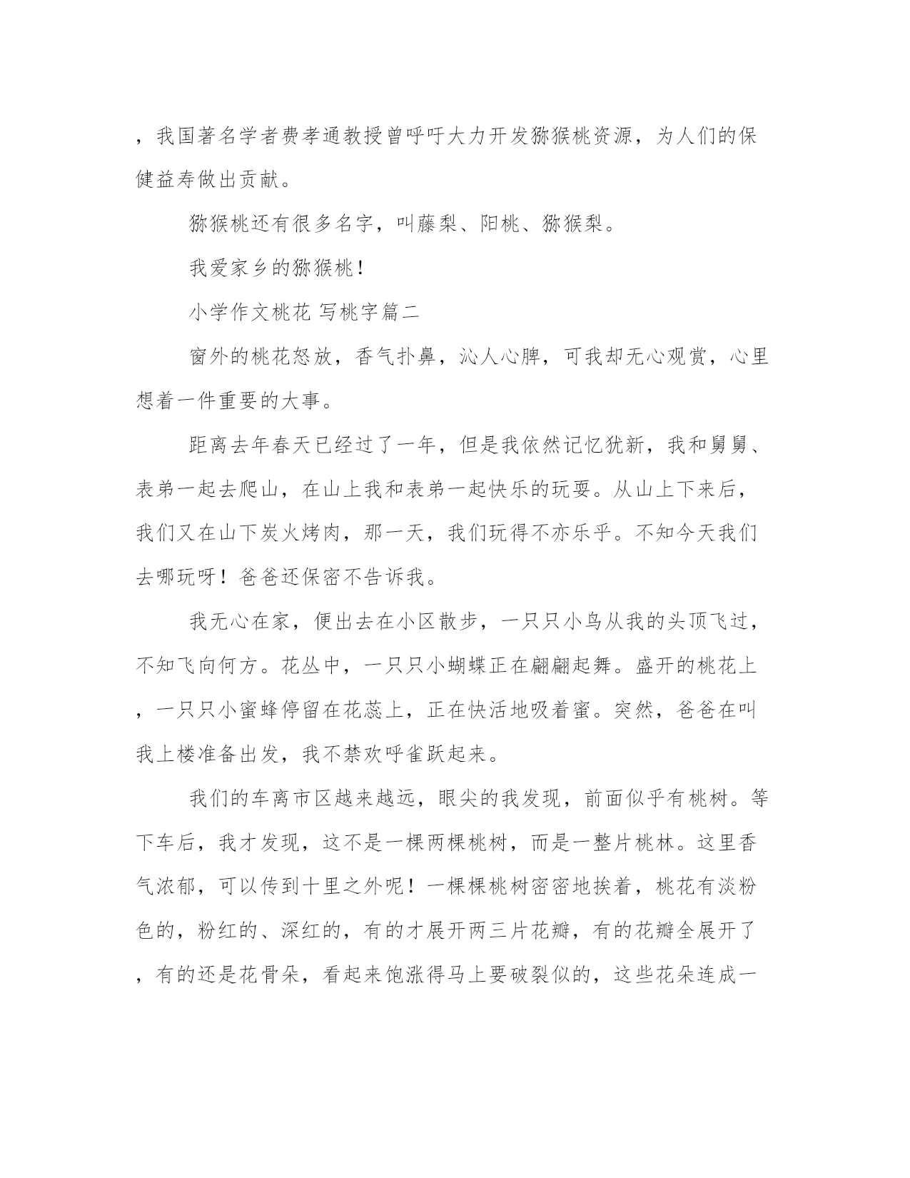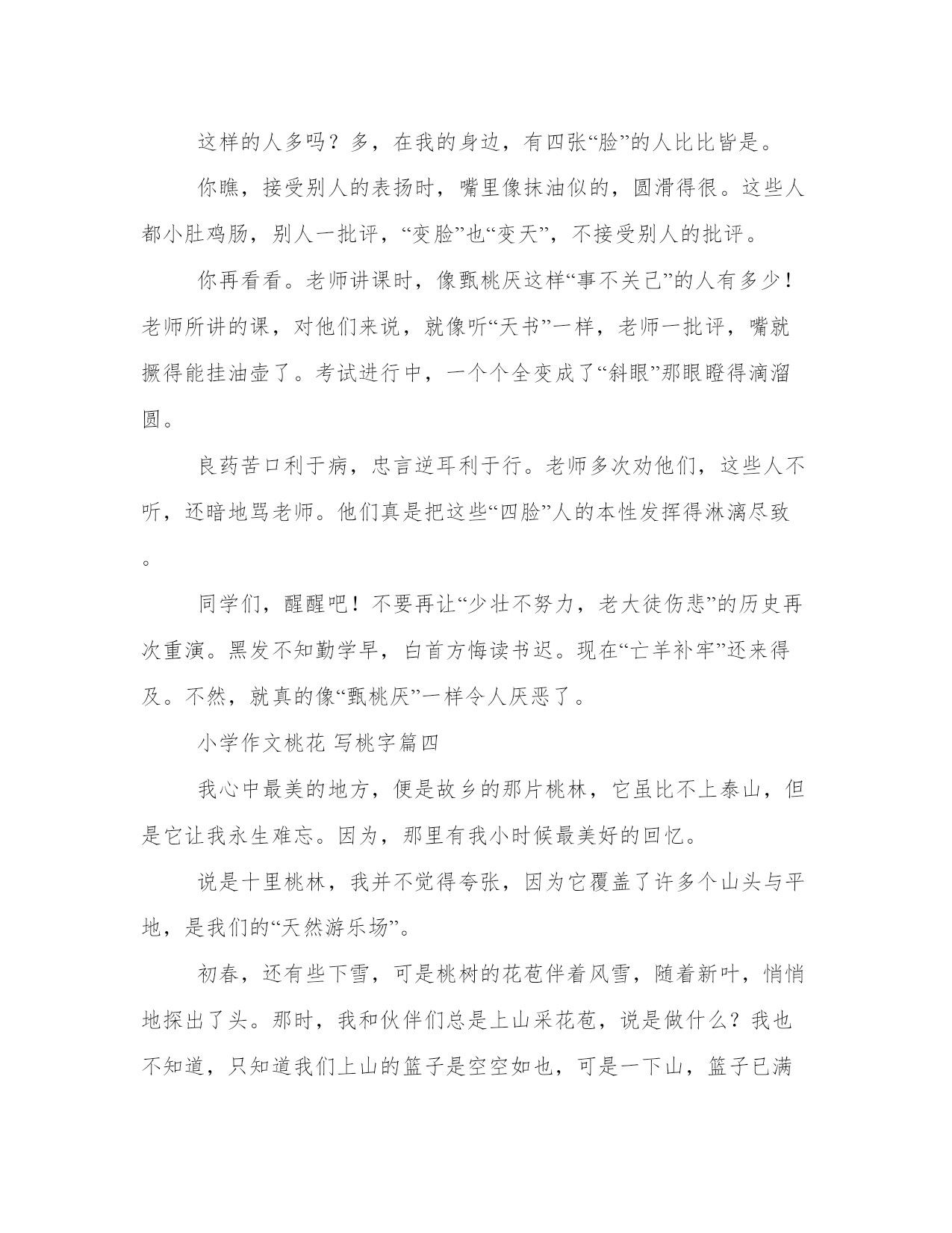 最新小学作文《桃花》写桃字七篇(大全)每个人都曾试图在平淡的学习、工作和生活中写一篇文章。写作是培养人的观察、联想、想象、思维和记忆的重要手段。相信许多人会觉得范文很难写?下面是小编帮大家整理的优质范文,仅供参考,大家一起来看看吧。小学作文桃花写桃字篇一暑假的时候,姑奶奶给我带来好多猕猴桃,好像是属于795品种的。只见这猕猴桃披着一件棕色外衣,还有一层细细的毛,一摸就掉了一大半。听姑奶奶说硬毛这种品种和其他品种不太一样,它的毛硬硬的不容易掉。猕猴桃有圆形的,椭圆的,还有奇形怪状的。可能你看猕猴桃的样子,会和难吃联系起来,但是你一剥开它的皮,露出了绿中带黄的果肉,让你口水直流。咬一口酸酸甜甜,好吃极了。里面还有一圈圈像芝麻一样的东西。包你吃了一个,还想再吃一个,夸都来不及夸。猕猴桃的作用也很多,营养学家介绍猕猴桃是一种营养价值丰富的水果,具有多重功效和作用,被人们称为果中之王。猕猴头含有亮氨酸、苯丙氨酸、异亮氨酸、酪氨酸、丙氨酸等10多种氨基酸,以及丰富的矿物质,包括丰富的钙、磷、铁,还含有胡萝卜素和多种维生素,对保持人体健康具有重要的作用。猕猴桃既可用于治疗内、外、妇科疾病,又可用于保健抗衰老,它就像一座奉献给人类的天然药库,我国著名学者费孝通教授曾呼吁大力开发猕猴桃资源,为人们的保健益寿做出贡献。猕猴桃还有很多名字,叫藤梨、阳桃、猕猴梨。我爱家乡的猕猴桃!小学作文桃花写桃字篇二窗外的桃花怒放,香气扑鼻,沁人心脾,可我却无心观赏,心里想着一件重要的大事。距离去年春天已经过了一年,但是我依然记忆犹新,我和舅舅、表弟一起去爬山,在山上我和表弟一起快乐的玩耍。从山上下来后,我们又在山下炭火烤肉,那一天,我们玩得不亦乐乎。不知今天我们去哪玩呀!爸爸还保密不告诉我。我无心在家,便出去在小区散步,一只只小鸟从我的头顶飞过,不知飞向何方。花丛中,一只只小蝴蝶正在翩翩起舞。盛开的桃花上,一只只小蜜蜂停留在花蕊上,正在快活地吸着蜜。突然,爸爸在叫我上楼准备出发,我不禁欢呼雀跃起来。我们的车离市区越来越远,眼尖的我发现,前面似乎有桃树。等下车后,我才发现,这不是一棵两棵桃树,而是一整片桃林。这里香气浓郁,可以传到十里之外呢!一棵棵桃树密密地挨着,桃花有淡粉色的,粉红的、深红的,有的才展开两三片花瓣,有的花瓣全展开了,有的还是花骨朵,看起来饱涨得马上要破裂似的,这些花朵连成一片,从高处俯视,就像是一片粉红色的花海,而人都淹没在了花海里。我不禁发出了感叹:“可真是世外桃源啊!”我和表弟在树林里玩起了捉迷藏,就连大人们最后也加入了进来,我有幸当了抓捕者,可是一个人也没找到,我们玩累了就坐在草地上吃点东西,休息一会,就这样我们度过了一个快乐的下午。夕阳西斜,到了该分别的时候了,我和表弟都不想回家,不想彼此分开,为此,表弟一直大哭大闹,我也动用了诗句“相见时难别亦难,东风无力百花残,”这可真是“兄弟相见别亦难,夕阳西下大哭闹”啊!小学作文桃花写桃字篇三甄桃厌是一个小学生,但她有四张“脸”。第一张脸:专门在受表扬时使用。瞧,满面春风,脸上乐得跟朵桃花似的,眯逢着眼睛,乐不可支。第二张脸:批评专用。你看看,这张脸上,她粉眼圆瞪,横眉怒眼,嘴撅得能拴头驴了。吓人呀!!!第三张脸:上课专用。只见这张脸神态平缓,不像前两张脸那样大起大落。只是面无表情,闭着眼睛,像是闭目养神。唉,这不是正在上课吗?怎么会这样啊?好像她不是学生一样。第四张脸:考试专用。咦?她怎么是个斜眼啊!嘴还张成“o”字型。噢,我明白,原来是“小偷”啊!这样一个眉清目秀的女孩怎么这样啊?!这样的人多吗?多,在我的身边,有四张“脸”的人比比皆是。你瞧,接受别人的表扬时,嘴里像抹油似的,圆滑得很。这些人都小肚鸡肠,别人一批评,“变脸”也“变天”,不接受别人的批评。你再看看。老师讲课时,像甄桃厌这样“事不关己”的人有多少!老师所讲的课,对他们来说,就像听“天书”一样,老师一批评,嘴就撅得能挂油壶了。考试进行中,一个个全变成了“斜眼”那眼瞪得滴溜圆。良药苦口利于病,忠言逆耳利于行。老师多次劝他们,这些人不听,还暗地骂老师。他们真是把这些“四脸”人的本性发挥得淋漓尽致。同学们,醒醒吧!不要再让“少壮不努力,老大徒伤悲”的历史再次重演。黑发不知勤学早,白首方悔读书迟。现在“亡羊补牢”还来得及。不然,就真的像“甄桃厌”一样令人厌恶了。小学作文桃花写桃字篇四我心中最美的地方,便是故乡的那片桃林,它虽比不上泰山,但是它让我永生难忘。因为,那里有我小时候最美好的回忆。说是十里桃林,我并不觉得夸张,因为它覆盖了许多个山头与平地,是我们的“天然游乐场”。初春,还有些下雪,可是桃树的花苞伴着风雪,随着新叶,悄悄地探出了头。那时,我和伙伴们总是上山采花苞,说是做什么?我也不知道,只知道我们上山的篮子是空空如也,可是一下山,篮子