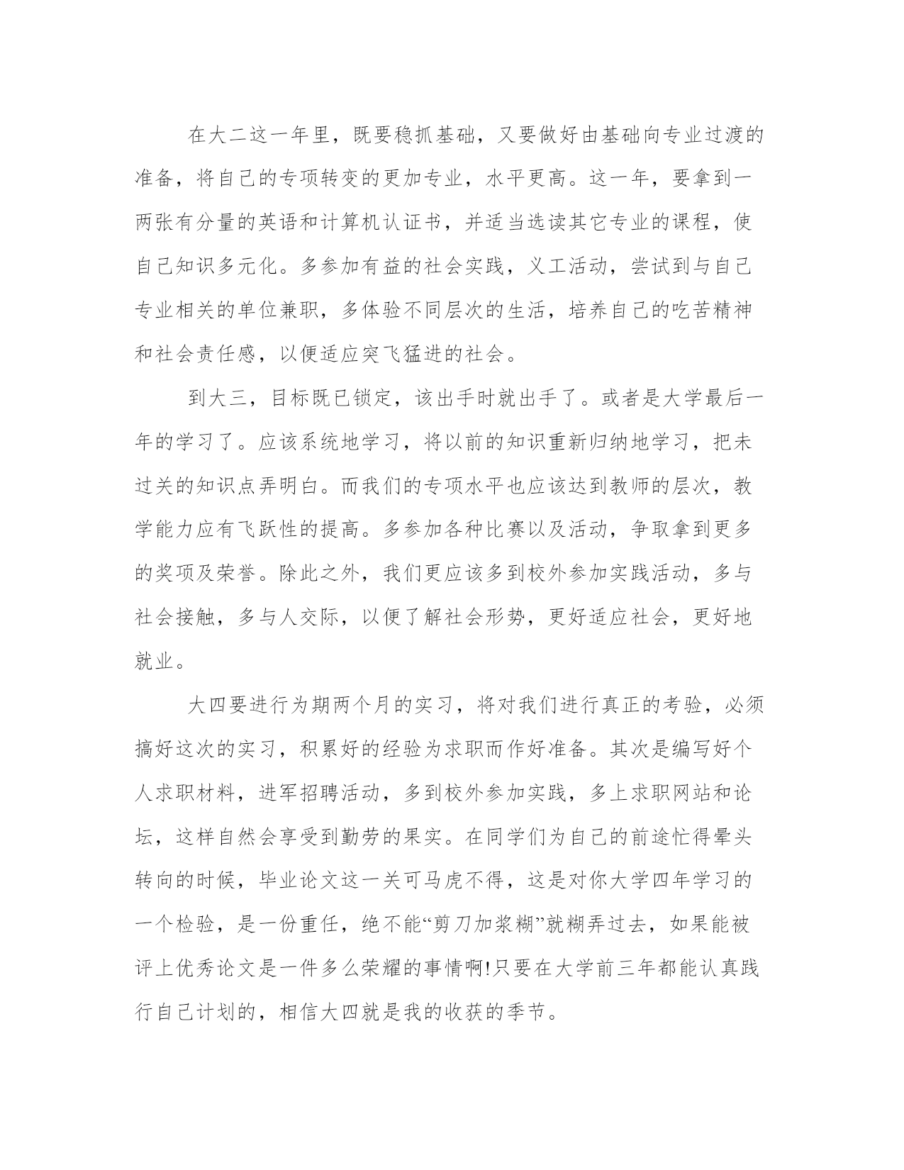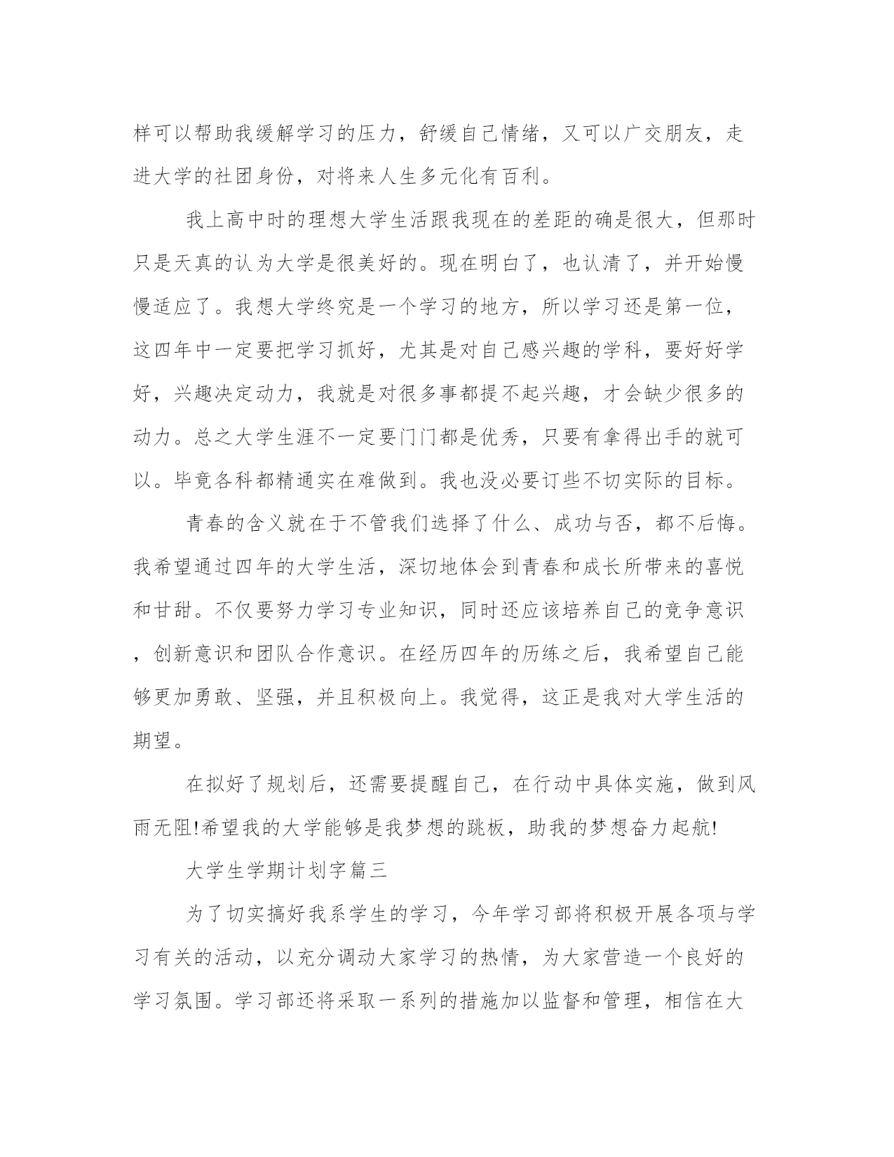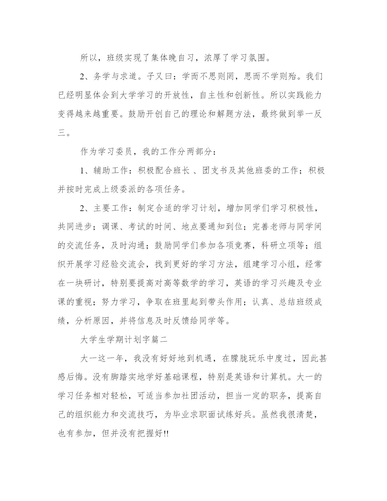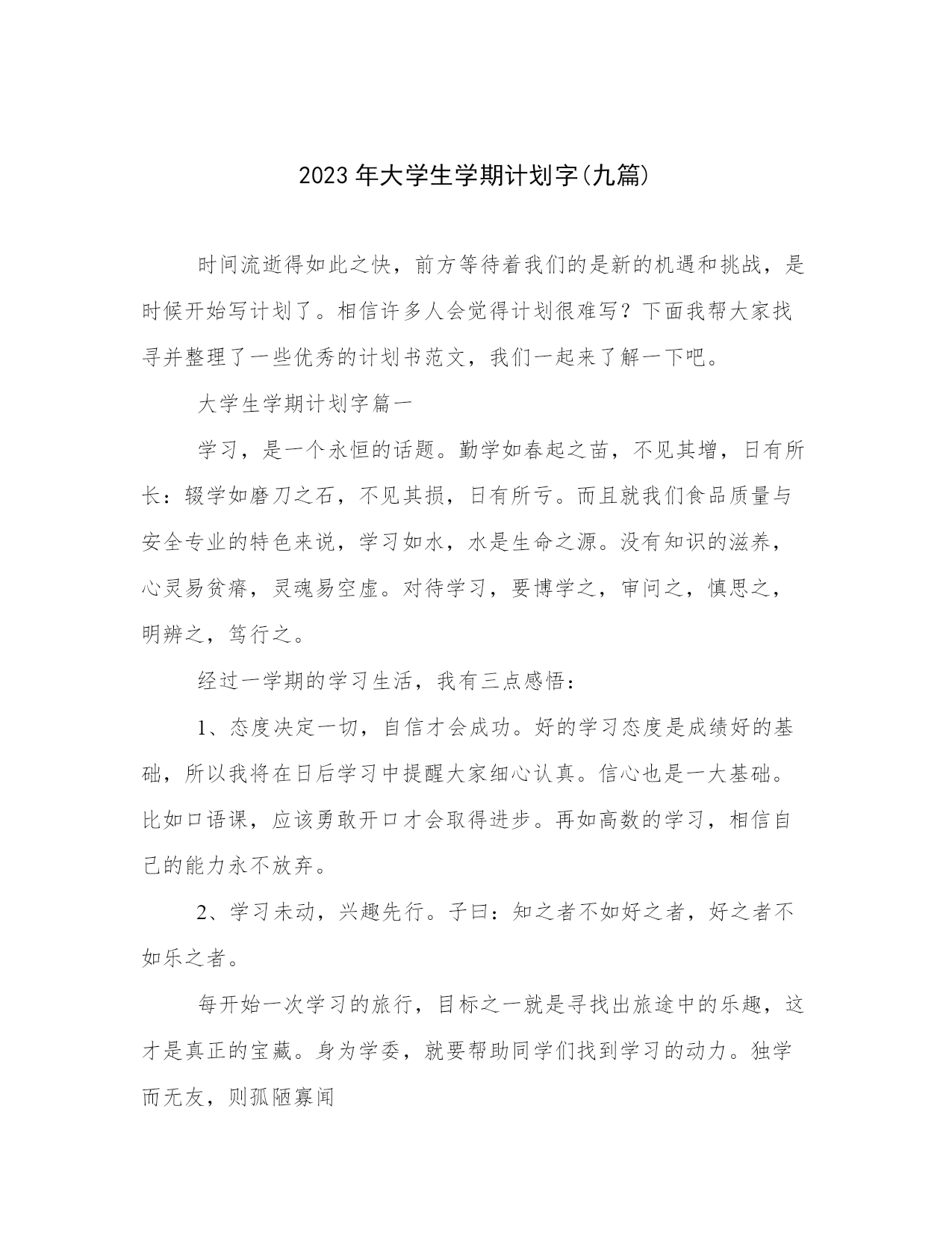 2023年大学生学期计划字(九篇)时间流逝得如此之快,前方等待着我们的是新的机遇和挑战,是时候开始写计划了。相信许多人会觉得计划很难写?下面我帮大家找寻并整理了一些优秀的计划书范文,我们一起来了解一下吧。大学生学期计划字篇一学习,是一个永恒的话题。勤学如春起之苗,不见其增,日有所长:辍学如磨刀之石,不见其损,日有所亏。而且就我们食品质量与安全专业的特色来说,学习如水,水是生命之源。没有知识的滋养,心灵易贫瘠,灵魂易空虚。对待学习,要博学之,审问之,慎思之,明辨之,笃行之。经过一学期的学习生活,我有三点感悟:1、态度决定一切,自信才会成功。好的学习态度是成绩好的基础,所以我将在日后学习中提醒大家细心认真。信心也是一大基础。比如口语课,应该勇敢开口才会取得进步。再如高数的学习,相信自己的能力永不放弃。2、学习未动,兴趣先行。子曰:知之者不如好之者,好之者不如乐之者。每开始一次学习的旅行,目标之一就是寻找出旅途中的乐趣,这才是真正的宝藏。身为学委,就要帮助同学们找到学习的动力。独学而无友,则孤陋寡闻所以,班级实现了集体晚自习,浓厚了学习氛围。2、务学与求道。子又曰:学而不思则罔,思而不学则殆。我们已经明显体会到大学学习的开放性,自主性和创新性。所以实践能力变得越来越重要。鼓励开创自己的理论和解题方法,最终做到举一反三。作为学习委员,我的工作分两部分:1、辅助工作:积极配合班长、团支书及其他班委的工作;积极并按时完成上级委派的各项任务。2、主要工作:制定合适的学习计划,增加同学们学习积极性,共同进步;调课、考试的时间、地点要通知到位;完善老师与同学间的交流任务,及时沟通;鼓励同学们参加各项竞赛,科研立项等;组织开展学习经验交流会,找到更好的学习方法,组建学习小组,经常在一块研讨,特别要提高对高等数学的学习,英语的学习兴趣及专业课的重视;努力学习,争取在班里起到带头作用;认真、总结班级成绩,分析原因,并将信息及时反馈给同学等。大学生学期计划字篇二大一这一年,我没有好好地到机遇,在朦胧玩乐中度过,因此甚感后悔。没有脚踏实地学好基础课程,特别是英语和计算机。大一的学习任务相对轻松,可适当参加社团活动,担当一定的职务,提高自己的组织能力和交流技巧,为毕业求职面试练好兵。虽然我很清楚,也有参加,但并没有把握好!!在大二这一年里,既要稳抓基础,又要做好由基础向专业过渡的准备,将自己的专项转变的更加专业,水平更高。这一年,要拿到一两张有分量的英语和计算机认证书,并适当选读其它专业的课程,使自己知识多元化。多参加有益的社会实践,义工活动,尝试到与自己专业相关的单位兼职,多体验不同层次的生活,培养自己的吃苦精神和社会责任感,以便适应突飞猛进的社会。到大三,目标既已锁定,该出手时就出手了。或者是大学最后一年的学习了。应该系统地学习,将以前的知识重新归纳地学习,把未过关的知识点弄明白。而我们的专项水平也应该达到教师的层次,教学能力应有飞跃性的提高。多参加各种比赛以及活动,争取拿到更多的奖项及荣誉。除此之外,我们更应该多到校外参加实践活动,多与社会接触,多与人交际,以便了解社会形势,更好适应社会,更好地就业。大四要进行为期两个月的实习,将对我们进行真正的考验,必须搞好这次的实习,积累好的经验为求职而作好准备。其次是编写好个人求职材料,进军招聘活动,多到校外参加实践,多上求职网站和论坛,这样自然会享受到勤劳的果实。在同学们为自己的前途忙得晕头转向的时候,毕业论文这一关可马虎不得,这是对你大学四年学习的一个检验,是一份重任,绝不能“剪刀加浆糊”就糊弄过去,如果能被评上优秀论文是一件多么荣耀的事情啊!只要在大学前三年都能认真践行自己计划的,相信大四就是我的收获的季节。生活上,在大学四年间应当养成良好的生活习惯,良好的生活习惯有利于我们的学习和生活,能使我们的学习起到事半功倍的作用。我要合理地安排作息时间,形成良好的作息制度;还要进行强度的体育锻炼和适当的文娱活动;要保证合理的营养供应,养成良好的饮食习惯;绝不会养成沉溺于电脑网络游戏等不良的习惯;并且在课堂上要认真听课和记录详细的笔记,最主要是学会如何自学,提高自己的学习能力。在大学期间,我并不指望能学到什么高深的专业知识,而是应该把重心放在学习能力的培养上和学习做人上。一个人贵在知道自己应该去干什么,明其志,方能知所赴!学校提供的平台是许多专家的共同认可的,适合大部分同学的需要,然我自己应该更清楚自己的实际需要,在学的课程上有所侧重,有所安排,另外选学一些对自己有价值、有益处的课程……这将更具个性化更能挖掘自己的潜力。大学同样是一个展现个性和施展才华的大舞台。我们要好好把握利用它!许多大一没有从事任何社会工作的同学,到了大二、大三就很难加入学生会、团委,等等,为什么呢?就是这个道理,我们应该把握大学里这个机会充分