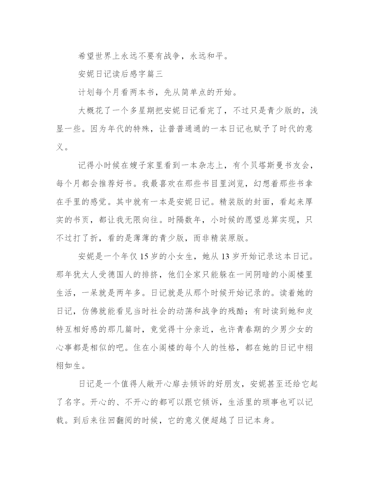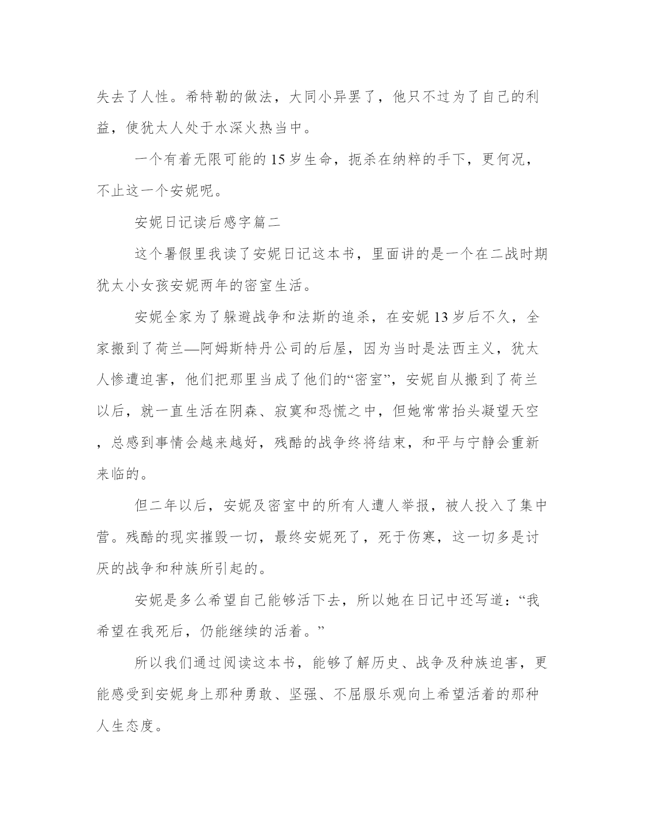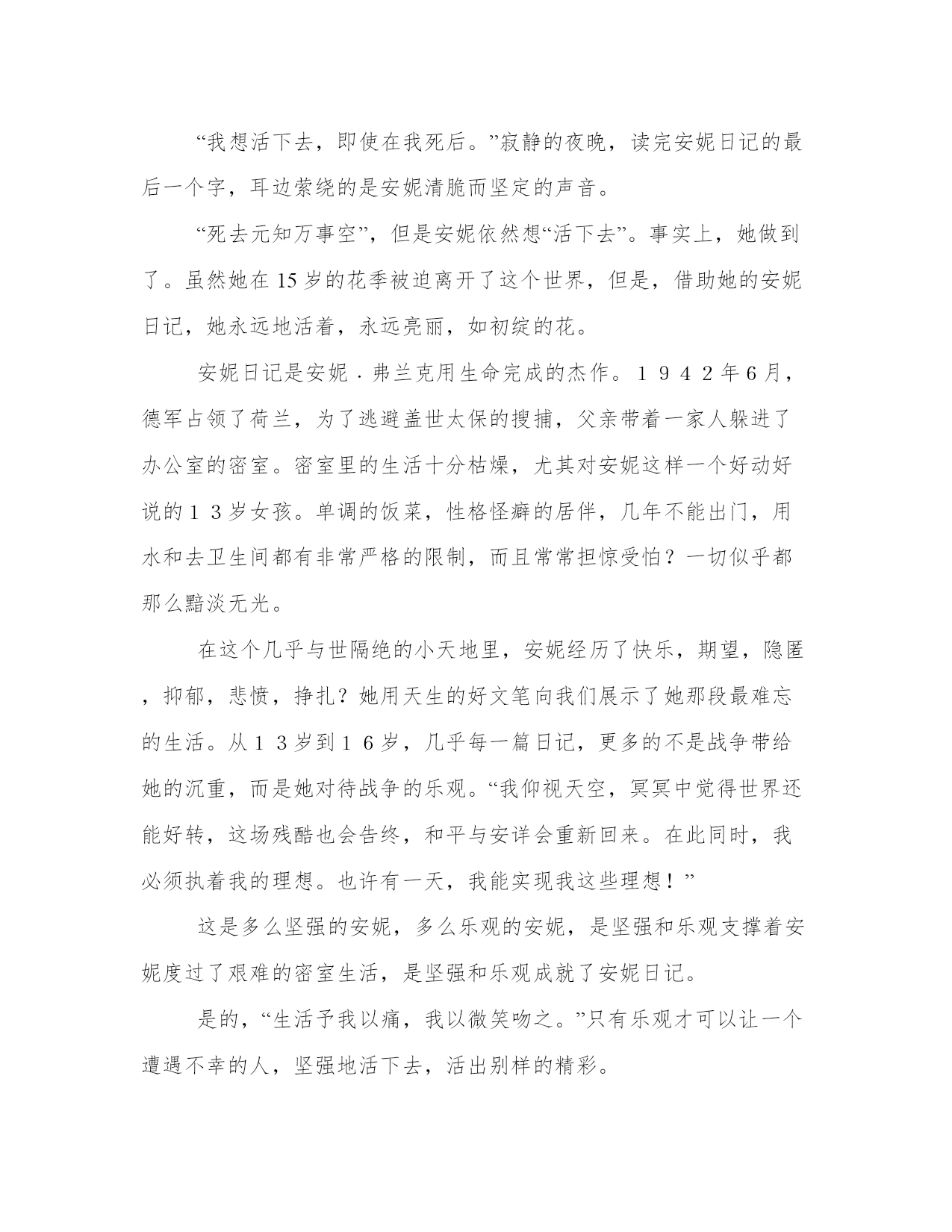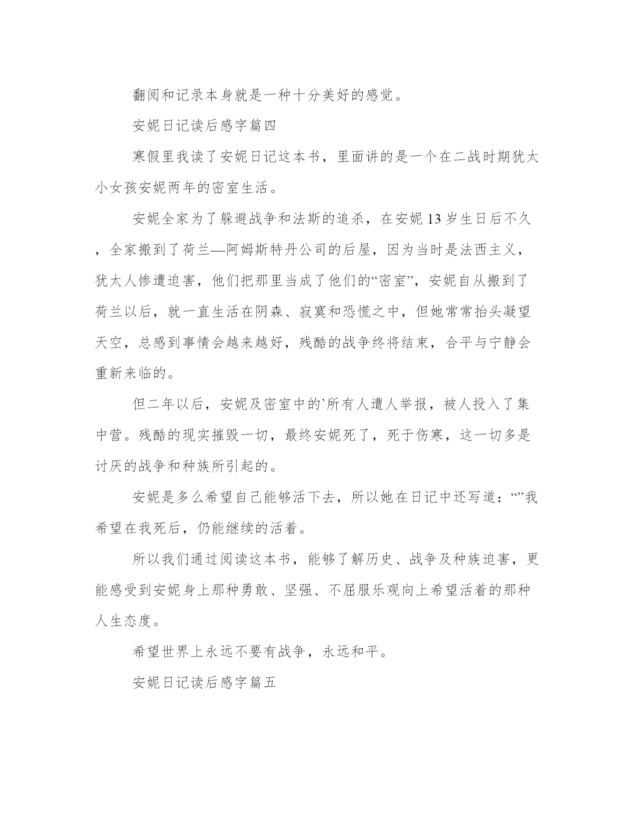 2023年安妮日记读后感字(五篇)在观看完一部作品以后,一定对生活有了新的感悟和看法吧,为此需要好好认真地写读后感。什么样的读后感才能对得起这个作品所表达的含义呢?以下是小编为大家收集的读后感的范文,仅供参考,大家一起来看看吧。安妮日记读后感字篇一故事的开始,或许不是在6月14日的那个星期天——安妮得到这本日记的时候。而是从她出生开始,作为一个犹太人的身份开始。当你——我亲爱的安妮,开始写这本日记时,你才13岁,这可能是一个不错的年纪,你开始变得成熟,却还有着小孩的童趣。在你的生活中,一切都那么轻松,生活中的小事也能让你格外惊喜。但好像有些人不想让你这么轻松地长大,他们抓捕同你一般的犹太人。一时间,犹太人四处逃窜。你现在大概有些不自在,不自在地生活在密室里。你在这必须小心翼翼,却好像被人忘记了,自己还是个孩子,你开始反抗父母,或自诩自己为“神经病”。但你还是没有忘记学习,创造着内心世界的财富。“拥有勇气和真诚信念的人,永远不会在不幸中消亡!”这是少女内心的独白,却又是不幸之人死守的坚强。我从来理解不了战争,它只会让我们拥有的东西越来越少。侵略战争的背后,是侵略者一方的贪婪,如果他真正拥有了什么的话,却失去了人性。希特勒的做法,大同小异罢了,他只不过为了自己的利益,使犹太人处于水深火热当中。一个有着无限可能的15岁生命,扼杀在纳粹的手下,更何况,不止这一个安妮呢。安妮日记读后感字篇二这个暑假里我读了安妮日记这本书,里面讲的是一个在二战时期犹太小女孩安妮两年的密室生活。安妮全家为了躲避战争和法斯的追杀,在安妮13岁后不久,全家搬到了荷兰—阿姆斯特丹公司的后屋,因为当时是法西主义,犹太人惨遭迫害,他们把那里当成了他们的“密室”,安妮自从搬到了荷兰以后,就一直生活在阴森、寂寞和恐慌之中,但她常常抬头凝望天空,总感到事情会越来越好,残酷的战争终将结束,和平与宁静会重新来临的。但二年以后,安妮及密室中的所有人遭人举报,被人投入了集中营。残酷的现实摧毁一切,最终安妮死了,死于伤寒,这一切多是讨厌的战争和种族所引起的。安妮是多么希望自己能够活下去,所以她在日记中还写道:“我希望在我死后,仍能继续的活着。”所以我们通过阅读这本书,能够了解历史、战争及种族迫害,更能感受到安妮身上那种勇敢、坚强、不屈服乐观向上希望活着的那种人生态度。希望世界上永远不要有战争,永远和平。安妮日记读后感字篇三计划每个月看两本书,先从简单点的开始。大概花了一个多星期把安妮日记看完了,不过只是青少版的,浅显一些。因为年代的特殊,让普普通通的一本日记也赋予了时代的意义。记得小时候在嫂子家里看到一本杂志上,有个贝塔斯曼书友会,每个月都会推荐好书。我最喜欢在那些书目里浏览,幻想着那些书拿在手里的感觉。其中就有一本是安妮日记。精装版的封面,看起来厚实的书页,都让我无限向往。时隔数年,小时候的愿望总算实现,只不过打了折,看的是薄薄的青少版,而非精装原版。安妮是一个年仅15岁的小女生,她从13岁开始记录这本日记。那年犹太人受德国人的排挤,他们全家只能躲在一间阴暗的小阁楼里生活,一呆就是两年多。日记就是从那个时候开始记录的。读着她的日记,仿佛就能看见当时社会的动荡和战争的残酷;有时读到她和皮特互相好感的那几篇时,竟觉得十分亲近,也许青春期的少男少女的心事都是相似的吧。住在小阁楼的每个人的性格,都在她的日记中栩栩如生。日记是一个值得人敞开心扉去倾诉的好朋友,安妮甚至还给它起了名字。开心的、不开心的都可以跟它倾诉,生活里的琐事也可以记载。到后来往回翻阅的时候,它的意义便超越了日记本身。翻阅和记录本身就是一种十分美好的感觉。安妮日记读后感字篇四寒假里我读了安妮日记这本书,里面讲的是一个在二战时期犹太小女孩安妮两年的密室生活。安妮全家为了躲避战争和法斯的追杀,在安妮13岁生日后不久,全家搬到了荷兰—阿姆斯特丹公司的后屋,因为当时是法西主义,犹太人惨遭迫害,他们把那里当成了他们的“密室”,安妮自从搬到了荷兰以后,就一直生活在阴森、寂寞和恐慌之中,但她常常抬头凝望天空,总感到事情会越来越好,残酷的战争终将结束,合平与宁静会重新来临的。但二年以后,安妮及密室中的`所有人遭人举报,被人投入了集中营。残酷的现实摧毁一切,最终安妮死了,死于伤寒,这一切多是讨厌的战争和种族所引起的。安妮是多么希望自己能够活下去,所以她在日记中还写道:“”我希望在我死后,仍能继续的活着。所以我们通过阅读这本书,能够了解历史、战争及种族迫害,更能感受到安妮身上那种勇敢、坚强、不屈服乐观向上希望活着的那种人生态度。希望世界上永远不要有战争,永远和平。安妮日记读后感字篇五“我想活下去,即使在我死后。”寂静的夜晚,读完安妮日记的最后一个字,耳边萦绕的是安妮清脆而坚定的声音。“死去元知万事空”,但是安妮依然想“活下去”。事实上,她做到