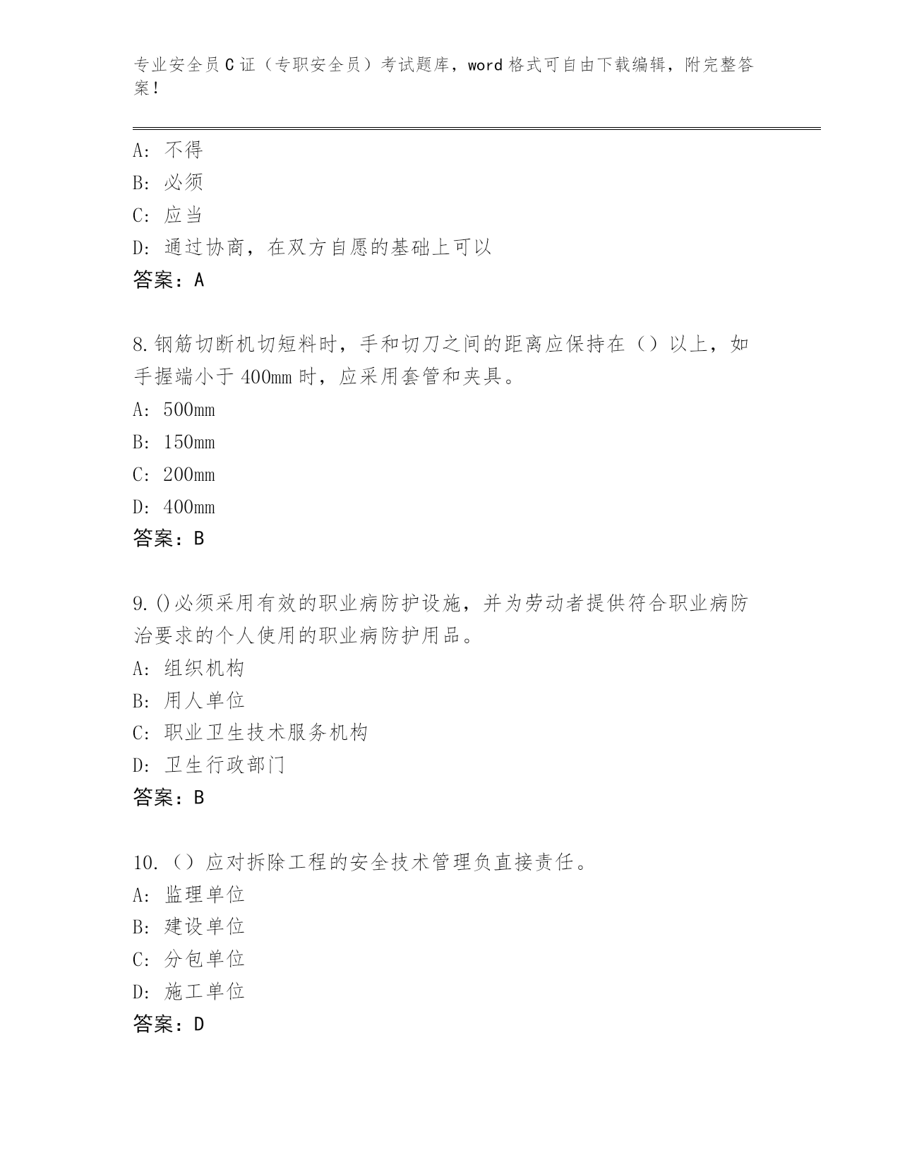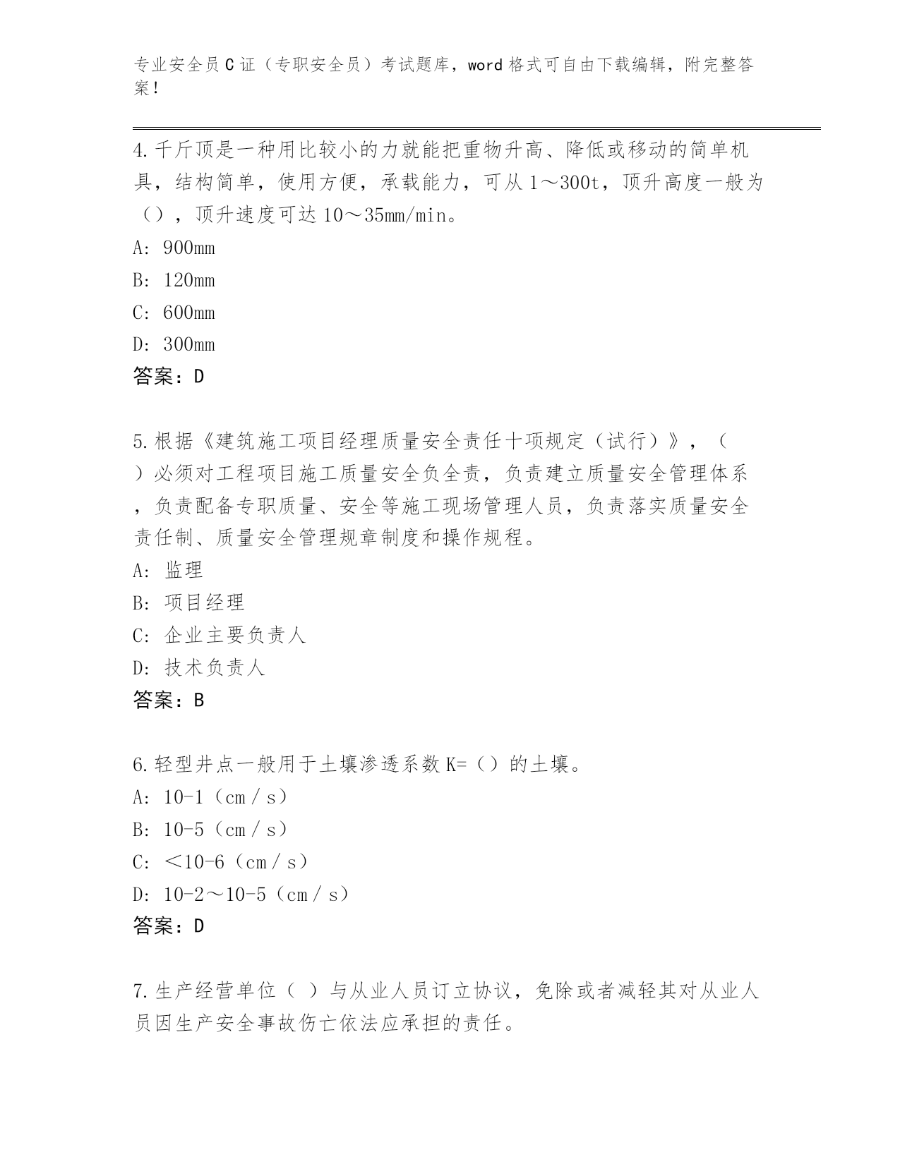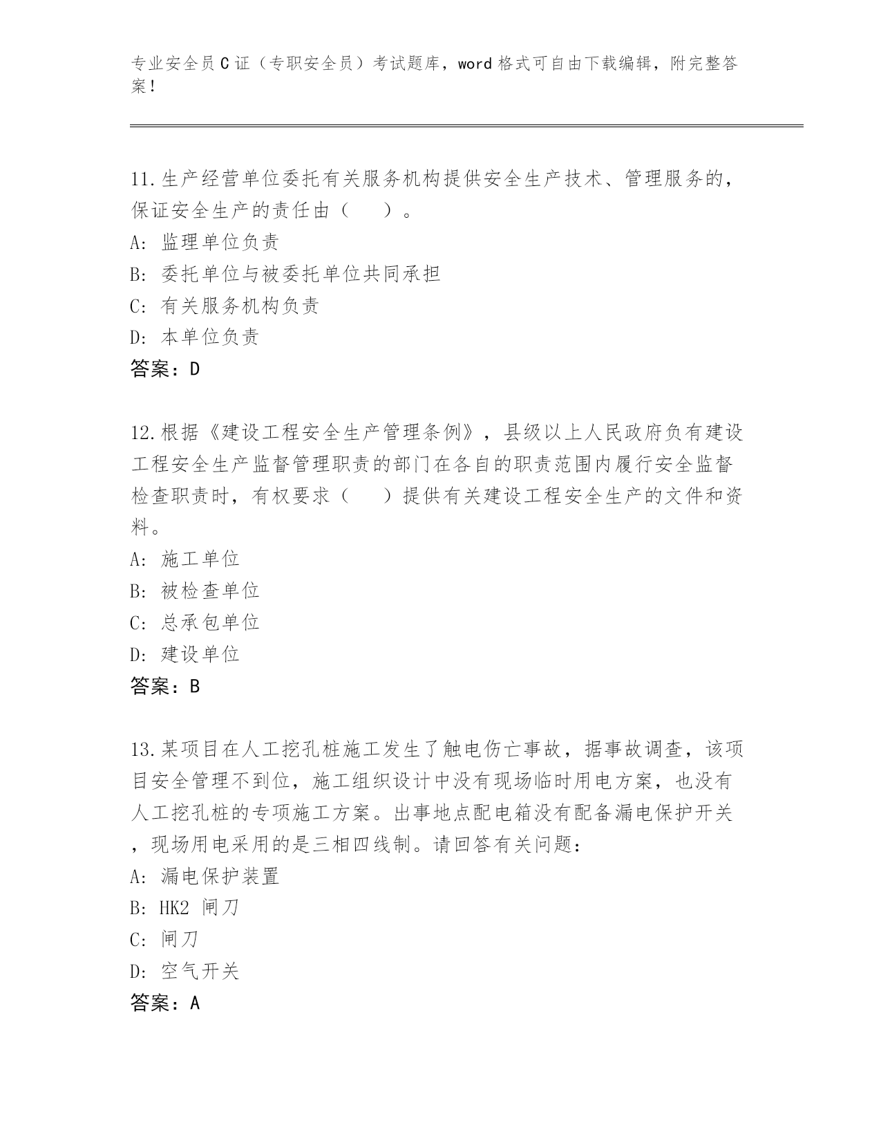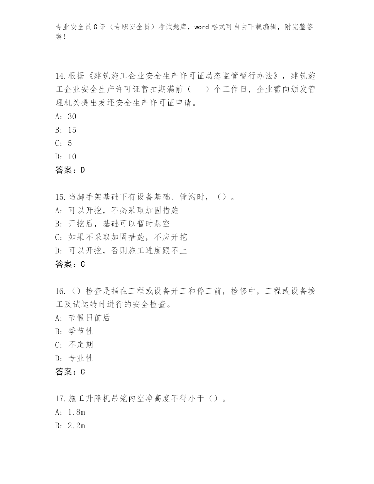 专业安全员C证(专职安全员)考试题库,word格式可自由下载编辑,附完整答案!整理江西省安全员C证(专职安全员)考试大全附答案【预热题】第I部分单选题(100题)1.物料提升机按结构形式分类,分为()。A:高架和低架B:上回转式和下回转式C:龙门架式和井架式D:行走式和固定式答案:C2.易燃物品露天仓库四周内应有不小于()m的平坦空地作为消防通道。A:2B:4C:6D:8答案:C3.下列哪一项不属于我国《侵权责任法》的立法目的()。A:促进社会和谐稳定B:保护民事主体的合法权益C:帮助被侵权者打击报复侵权人D:明确侵权责任答案:C4.千斤顶是一种用比较小的力就能把重物升高、降低或移动的简单机具,结构简单,使用方便,承载能力,可从1~300t,顶升高度一般为(),顶升速度可达10~35mm/min。A:900mmB:120mmC:600mmD:300mm答案:D5.根据《建筑施工项目经理质量安全责任十项规定(试行)》,()必须对工程项目施工质量安全负全责,负责建立质量安全管理体系,负责配备专职质量、安全等施工现场管理人员,负责落实质量安全责任制、质量安全管理规章制度和操作规程。A:监理B:项目经理C:企业主要负责人D:技术负责人答案:B6.轻型井点一般用于土壤渗透系数K=()的土壤。A:10-1(cm/s)B:10-5(cm/s)C:<10-6(cm/s)D:10-2~10-5(cm/s)答案:D7.生产经营单位()与从业人员订立协议,免除或者减轻其对从业人员因生产安全事故伤亡依法应承担的责任。A:不得B:必须C:应当D:通过协商,在双方自愿的基础上可以答案:A8.钢筋切断机切短料时,手和切刀之间的距离应保持在()以上,如手握端小于400mm时,应采用套管和夹具。A:500mmB:150mmC:200mmD:400mm答案:B9.()必须采用有效的职业病防护设施,并为劳动者提供符合职业病防治要求的个人使用的职业病防护用品。A:组织机构B:用人单位C:职业卫生技术服务机构D:卫生行政部门答案:B10.()应对拆除工程的安全技术管理负直接责任。A:监理单位B:建设单位C:分包单位D:施工单位答案:D11.生产经营单位委托有关服务机构提供安全生产技术、管理服务的,保证安全生产的责任由()。A:监理单位负责B:委托单位与被委托单位共同承担C:有关服务机构负责D:本单位负责答案:D12.根据《建设工程安全生产管理条例》,县级以上人民政府负有建设工程安全生产监督管理职责的部门在各自的职责范围内履行安全监督检查职责时,有权要求()提供有关建设工程安全生产的文件和资料。A:施工单位B:被检查单位C:总承包单位D:建设单位答案:B13.某项目在人工挖孔桩施工发生了触电伤亡事故,据事故调查,该项目安全管理不到位,施工组织设计中没有现场临时用电方案,也没有人工挖孔桩的专项施工方案。出事地点配电箱没有配备漏电保护开关,现场用电采用的是三相四线制。请回答有关问题:A:漏电保护装置B:HK2闸刀C:闸刀D:空气开关答案:A14.根据《建筑施工企业安全生产许可证动态监管暂行办法》,建筑施工企业安全生产许可证暂扣期满前()个工作日,企业需向颁发管理机关提出发还安全生产许可证申请。A:30B:15C:5D:10答案:D15.当脚手架基础下有设备基础、管沟时,()。A:可以开挖,不必采取加固措施B:开挖后,基础可以暂时悬空C:如果不采取加固措施,不应开挖D:可以开挖,否则施工进度跟不上答案:C16.()检查是指在工程或设备开工和停工前,检修中,工程或设备竣工及试运转时进行的安全检查。A:节假日前后B:季节性C:不定期D:专业性答案:C17.施工升降机吊笼内空净高度不得小于()。A:1.8mB:2.2mC:2mD:1.5m答案:C18.未提交预评价报告或者预评价报告未经()部门审核同意的,有关部门不得批准该建设项目。A:规划部门B:财政部门C:卫生行政部门D:建设行政部门答案:C19.《中华人民共和国建筑法》规定:施工现场对毗邻的建筑物、构筑物和特殊作业环境可能造成损害的,建筑施工企业应当采取()措施。A:安全防护B:安全警示C:安全保卫D:安全提示答案:A20.扣件式钢管脚手架所用的扣件应采用()。A:可锻铸铁制作的扣件B:材质符合《钢管脚手架扣件》规定的可锻铸铁制作的扣件C:钢板压制扣件D:其他形式扣件答案:B21.附着式升降脚手架安全技术综合验收时,应对扣件的扭力矩进行检查,合格率应达()对所有螺栓联接处进行全数检查。A:70%B:100%C:80%D:90%答案:B22.下列关于高处作业吊篮悬挂机构叙述正确的一项是()。A:应安装在砼混结构、型钢承重平台等上方B:宜采用柔性联接方式进行拉接固定C:可以安装在外架上,但不宜安装在钢管扣件搭设的架子上D:应安装在