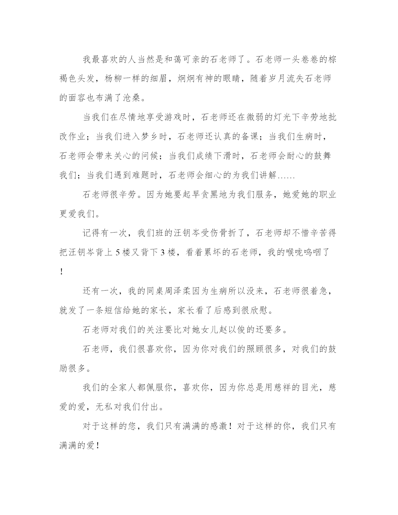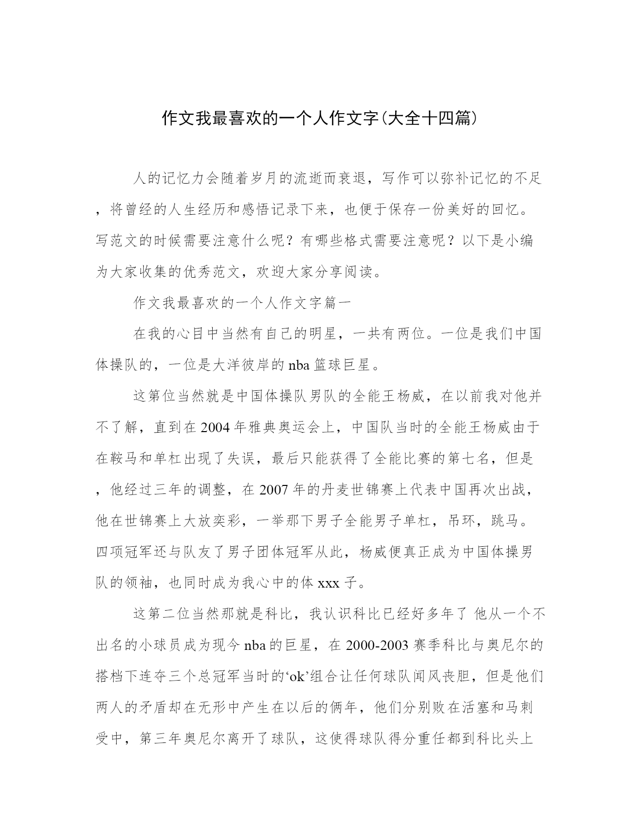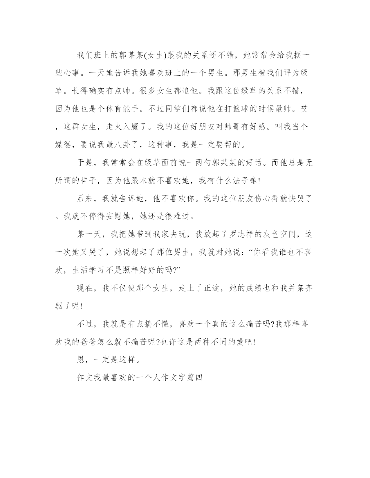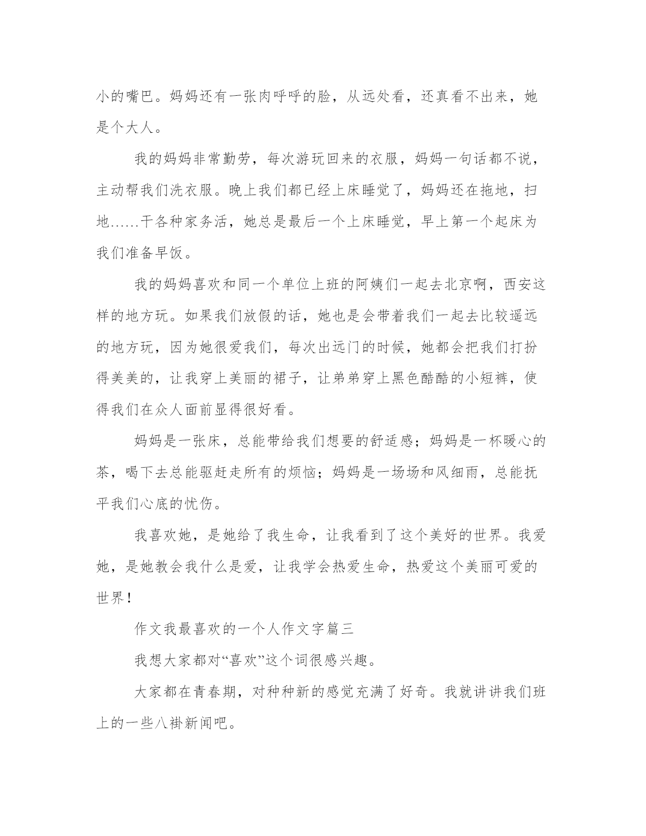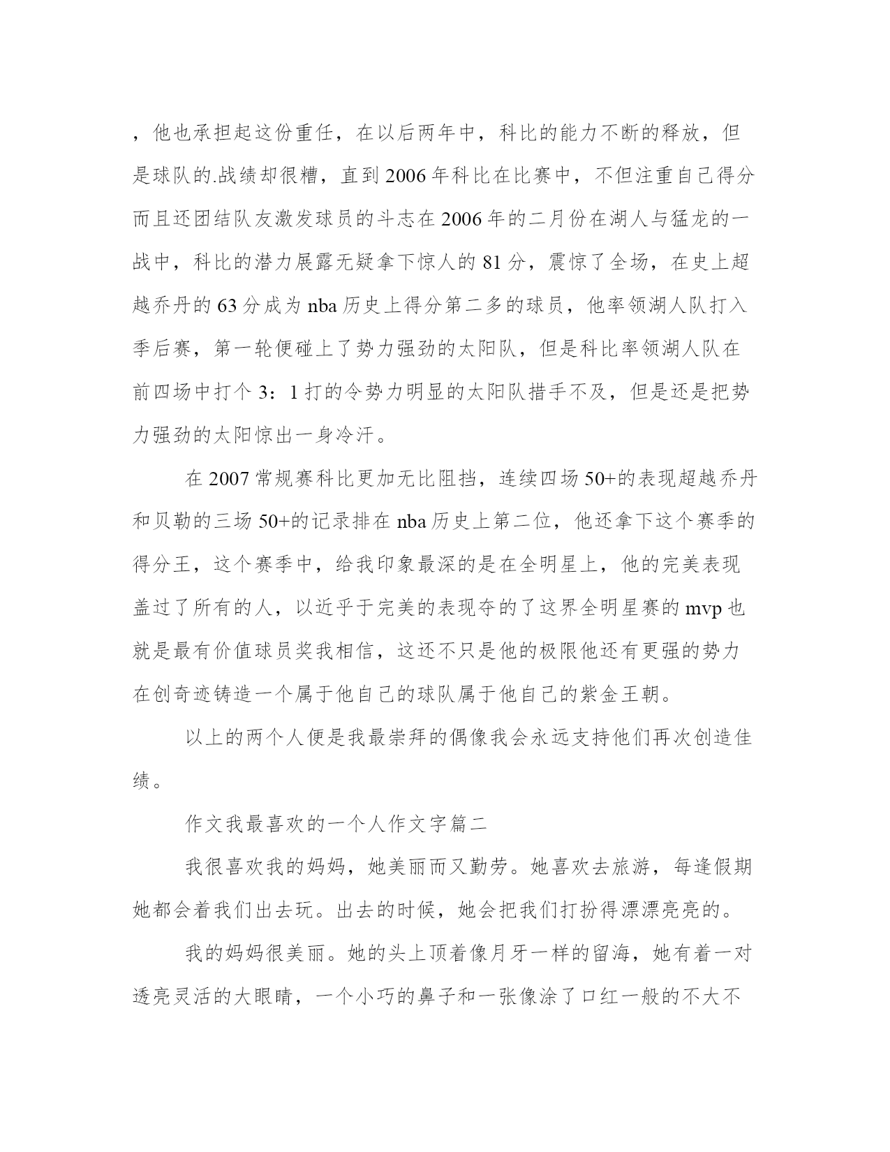作文我最喜欢的一个人作文字(大全十四篇)人的记忆力会随着岁月的流逝而衰退,写作可以弥补记忆的不足,将曾经的人生经历和感悟记录下来,也便于保存一份美好的回忆。写范文的时候需要注意什么呢?有哪些格式需要注意呢?以下是小编为大家收集的优秀范文,欢迎大家分享阅读。作文我最喜欢的一个人作文字篇一在我的心目中当然有自己的明星,一共有两位。一位是我们中国体操队的,一位是大洋彼岸的nba篮球巨星。这第位当然就是中国体操队男队的全能王杨威,在以前我对他并不了解,直到在2004年雅典奥运会上,中国队当时的全能王杨威由于在鞍马和单杠出现了失误,最后只能获得了全能比赛的第七名,但是,他经过三年的调整,在2007年的丹麦世锦赛上代表中国再次出战,他在世锦赛上大放奕彩,一举那下男子全能男子单杠,吊环,跳马。四项冠军还与队友了男子团体冠军从此,杨威便真正成为中国体操男队的领袖,也同时成为我心中的体xxx子。这第二位当然那就是科比,我认识科比已经好多年了他从一个不出名的小球员成为现今nba的巨星,在2000-2003赛季科比与奥尼尔的搭档下连夺三个总冠军当时的‘ok’组合让任何球队闻风丧胆,但是他们两人的矛盾却在无形中产生在以后的俩年,他们分别败在活塞和马刺受中,第三年奥尼尔离开了球队,这使得球队得分重任都到科比头上,他也承担起这份重任,在以后两年中,科比的能力不断的释放,但是球队的.战绩却很糟,直到2006年科比在比赛中,不但注重自己得分而且还团结队友激发球员的斗志在2006年的二月份在湖人与猛龙的一战中,科比的潜力展露无疑拿下惊人的81分,震惊了全场,在史上超越乔丹的63分成为nba历史上得分第二多的球员,他率领湖人队打入季后赛,第一轮便碰上了势力强劲的太阳队,但是科比率领湖人队在前四场中打个3:1打的令势力明显的太阳队措手不及,但是还是把势力强劲的太阳惊出一身冷汗。在2007常规赛科比更加无比阻挡,连续四场50+的表现超越乔丹和贝勒的三场50+的记录排在nba历史上第二位,他还拿下这个赛季的得分王,这个赛季中,给我印象最深的是在全明星上,他的完美表现盖过了所有的人,以近乎于完美的表现夺的了这界全明星赛的mvp也就是最有价值球员奖我相信,这还不只是他的极限他还有更强的势力在创奇迹铸造一个属于他自己的球队属于他自己的紫金王朝。以上的两个人便是我最崇拜的偶像我会永远支持他们再次创造佳绩。作文我最喜欢的一个人作文字篇二我很喜欢我的妈妈,她美丽而又勤劳。她喜欢去旅游,每逢假期她都会着我们出去玩。出去的时候,她会把我们打扮得漂漂亮亮的。我的妈妈很美丽。她的头上顶着像月牙一样的留海,她有着一对透亮灵活的大眼睛,一个小巧的鼻子和一张像涂了口红一般的不大不小的嘴巴。妈妈还有一张肉呼呼的脸,从远处看,还真看不出来,她是个大人。我的妈妈非常勤劳,每次游玩回来的衣服,妈妈一句话都不说,主动帮我们洗衣服。晚上我们都已经上床睡觉了,妈妈还在拖地,扫地……干各种家务活,她总是最后一个上床睡觉,早上第一个起床为我们准备早饭。我的妈妈喜欢和同一个单位上班的阿姨们一起去北京啊,西安这样的地方玩。如果我们放假的话,她也是会带着我们一起去比较遥远的地方玩,因为她很爱我们,每次出远门的时候,她都会把我们打扮得美美的,让我穿上美丽的裙子,让弟弟穿上黑色酷酷的小短裤,使得我们在众人面前显得很好看。妈妈是一张床,总能带给我们想要的舒适感;妈妈是一杯暖心的茶,喝下去总能驱赶走所有的烦恼;妈妈是一场场和风细雨,总能抚平我们心底的忧伤。我喜欢她,是她给了我生命,让我看到了这个美好的世界。我爱她,是她教会我什么是爱,让我学会热爱生命,热爱这个美丽可爱的世界!作文我最喜欢的一个人作文字篇三我想大家都对“喜欢”这个词很感兴趣。大家都在青春期,对种种新的感觉充满了好奇。我就讲讲我们班上的一些八褂新闻吧。我们班上的郭某某(女生)跟我的关系还不错,她常常会给我摆一些心事。一天她告诉我她喜欢班上的一个男生。那男生被我们评为级草。长得确实有点帅。很多女生都追他。我跟这位级草的关系不错,因为他也是个体育能手。不过同学们都说他在打篮球的时候最帅。哎,这群女生,走火入魔了。我的这位好朋友对帅哥有好感。叫我当个媒婆,要说我最八卦了,这种事,我是一定要帮的。于是,我常常会在级草面前说一两句郭某某的好话。而他总是无所谓的样子,因为他跟本就不喜欢她,我有什么法子嘛!后来,我就告诉她,他不喜欢你。我的这位朋友伤心得就快哭了。我就不停得安慰她,她还是很难过。某一天,我把她带到我家去玩,我放起了罗志祥的灰色空间,这一次她又哭了,她说想起了那位男生,我就对她说:“你看我谁也不喜欢,生活学习不是照样好好的吗?”现在,我不仅使那个女生,走上了正途,她的成绩也和我并架齐驱了呢!不过,我就是有点搞不懂,喜欢一个真的这么痛苦吗?我那样喜欢我的爸爸怎么就