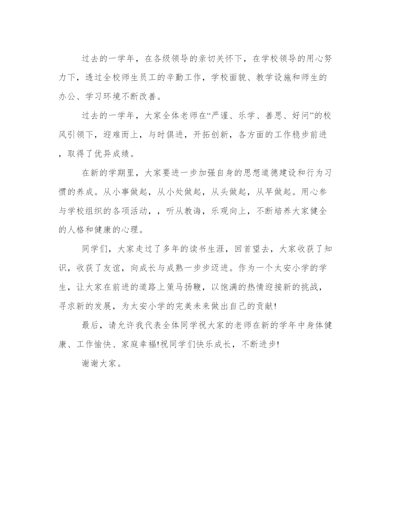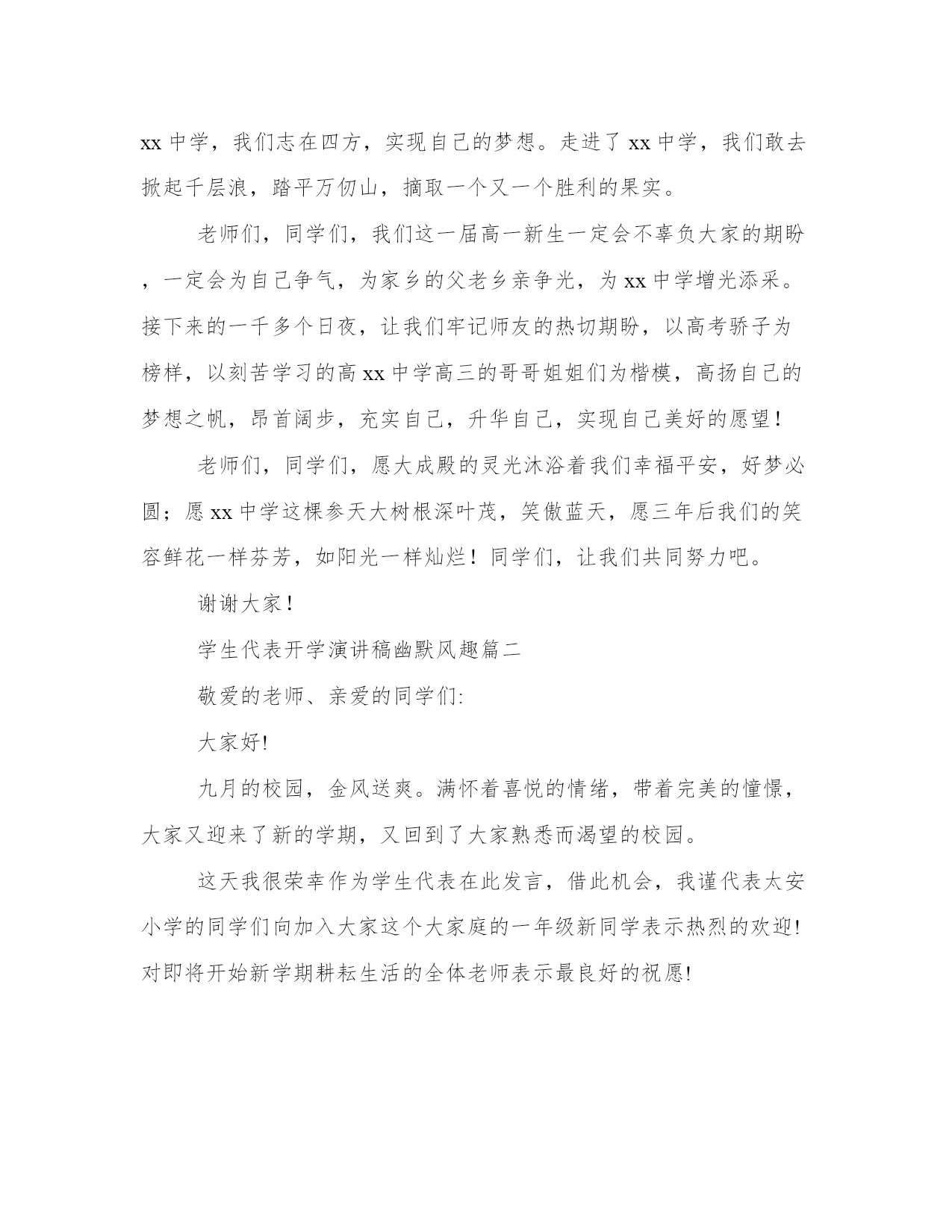 最新学生代表开学演讲稿幽默风趣通用演讲稿首先必须开头要开门见山,既要一下子抓住听众又要提出你的观点,中间要用各种方法和所准备的材料说明、支持你的论点,感染听众,然后在结尾加强说明论点或得出结论,结束演讲。优质的演讲稿该怎么样去写呢?下面小编给大家带来关于学习演讲稿模板范文,希望会对大家的工作与学习有所帮助。学生代表开学演讲稿幽默风趣篇一大家好!首先,请允许我代表xxx名高一新生向我们全校的老师表示深深的敬意,向高xx中学三的哥哥姐姐们表示亲切的问候!老师们,同学们,在父母的殷殷期盼下,在亲朋好友的声声叮咛中,我们进入了学习的圣殿――xx中学。它是一所重点高中,有整洁的校园,有一流的服务设施,有良好的校风校纪,有锐意进取的师资队伍,有历经风雨的巍巍大成殿。在大成灵光的照耀下,在全体教师的努力下,一届又一届的莘莘学子在这里腾飞。今天,我们为进入xx中学而骄傲!同时,我们也感到了身上背负的重担。xx中学辉煌的'延续和发扬光大是我们的责任,也是实现我们价值的体现。我们将用飞扬的青春、跳动的热情来续写xx中学的历史,用求知的艰辛和拼搏的快乐来填充我们生命的颜色!作为一名高中生,在学习过程中,在困难面前,应该继承和发扬长征精神,知难而进,树立必胜的信念,义无反顾,勇往直前。俗话说:“书山有路勤为径,学海无涯苦作舟。”学习是没有什么捷径可走的,我们要认真聆听老师的教诲,不断努力学习与探索,以取得优异的成绩。在刚结束的军训中,我们已学到了铁的纪律和顽强的意志,体会到了军队生活的团结、紧张、严肃、活泼,因此我们要把这严格的纪律、高昂的斗志连同不怕苦不怕难的长征精神投入到学习中去,艰苦奋斗,遇到难题决不放过,碰到困难决不低头,开拓知识面,争当排头兵。我们更要严格遵守学校的日常行为规范,自觉约束自己的行为,使一日常规中的各项要求逐渐变为自觉的行动;同时也要遵守社会秩序,培养高尚的社会公德,向全社会展示xx中学学生良好的风采。“自信人生二百年,会当水击三千里。”走进xx中学,我们敢于踏平坎坷,一路高歌;坚信风雨之后,彩虹依旧。困难并不可怕,因为有着亲切友善的师长帮我们渡过难关;迷茫也不畏惧,因为有着并肩携手的同学为彼此指明方向。其实天并不高,其实路也不远。心有多大,舞台就有多大,梦敢做就能圆!祖国大江南北的一所所名牌大学都在向我们招手!只要我们牢记老师的教诲,完善自我,追求卓越,就一定能实现自己的目标。四十岁的辉煌来自十七岁的拼搏,让我们为自己事业的丰收奠基!老师们,同学们,走进了xx中学,我们脚步铿锵,信心百倍。走进了xx中学,我们志在四方,实现自己的梦想。走进了xx中学,我们敢去掀起千层浪,踏平万仞山,摘取一个又一个胜利的果实。老师们,同学们,我们这一届高一新生一定会不辜负大家的期盼,一定会为自己争气,为家乡的父老乡亲争光,为xx中学增光添采。接下来的一千多个日夜,让我们牢记师友的热切期盼,以高考骄子为榜样,以刻苦学习的高xx中学高三的哥哥姐姐们为楷模,高扬自己的梦想之帆,昂首阔步,充实自己,升华自己,实现自己美好的愿望!老师们,同学们,愿大成殿的灵光沐浴着我们幸福平安,好梦必圆;愿xx中学这棵参天大树根深叶茂,笑傲蓝天,愿三年后我们的笑容鲜花一样芬芳,如阳光一样灿烂!同学们,让我们共同努力吧。谢谢大家!学生代表开学演讲稿幽默风趣篇二敬爱的老师、亲爱的同学们:大家好!九月的校园,金风送爽。满怀着喜悦的情绪,带着完美的憧憬,大家又迎来了新的学期,又回到了大家熟悉而渴望的校园。这天我很荣幸作为学生代表在此发言,借此机会,我谨代表太安小学的同学们向加入大家这个大家庭的一年级新同学表示热烈的欢迎!对即将开始新学期耕耘生活的全体老师表示最良好的祝愿!过去的一学年,在各级领导的亲切关怀下,在学校领导的用心努力下,透过全校师生员工的辛勤工作,学校面貌、教学设施和师生的办公、学习环境不断改善。过去的一学年,大家全体老师在“严谨、乐学、善思、好问”的校风引领下,迎难而上,与时俱进,开拓创新,各方面的工作稳步前进,取得了优异成绩。在新的学期里,大家要进一步加强自身的思想道德建设和行为习惯的养成。从小事做起,从小处做起,从头做起,从早做起。用心参与学校组织的各项活动,,听从教诲,乐观向上,不断培养大家健全的人格和健康的心理。同学们,大家走过了多年的读书生涯,回首望去,大家收获了知识,收获了友谊,向成长与成熟一步步迈进。作为一个太安小学的学生,让大家在前进的道路上策马扬鞭,以饱满的热情迎接新的挑战,寻求新的发展,为太安小学的完美未来做出自己的贡献!最后,请允许我代表全体同学祝大家的老师在新的学年中身体健康、工作愉快、家庭幸福!祝同学们快乐成长,不断进步!谢谢大家。