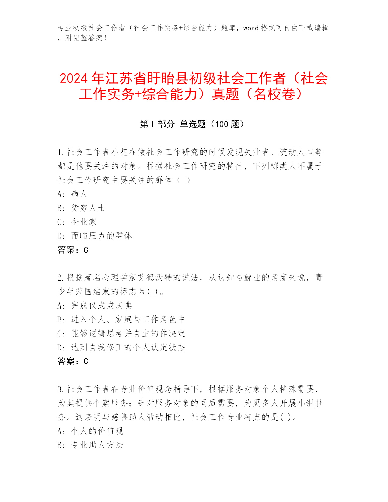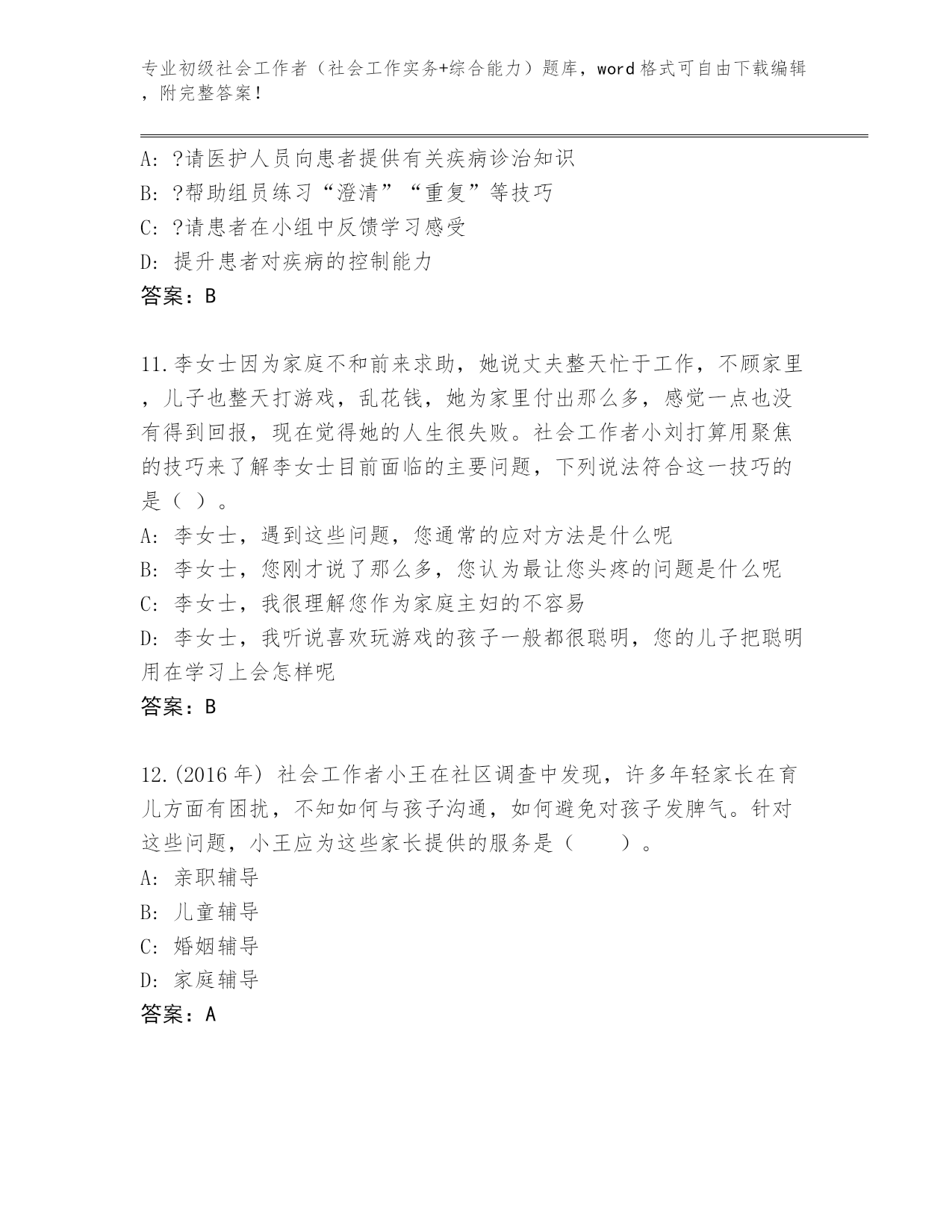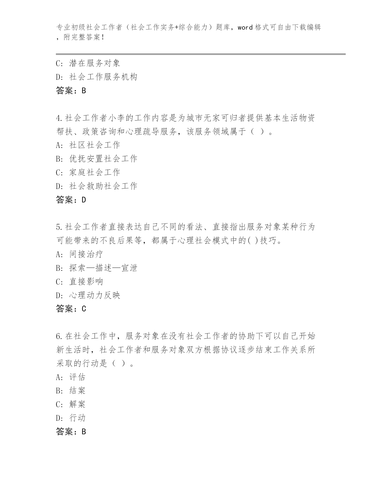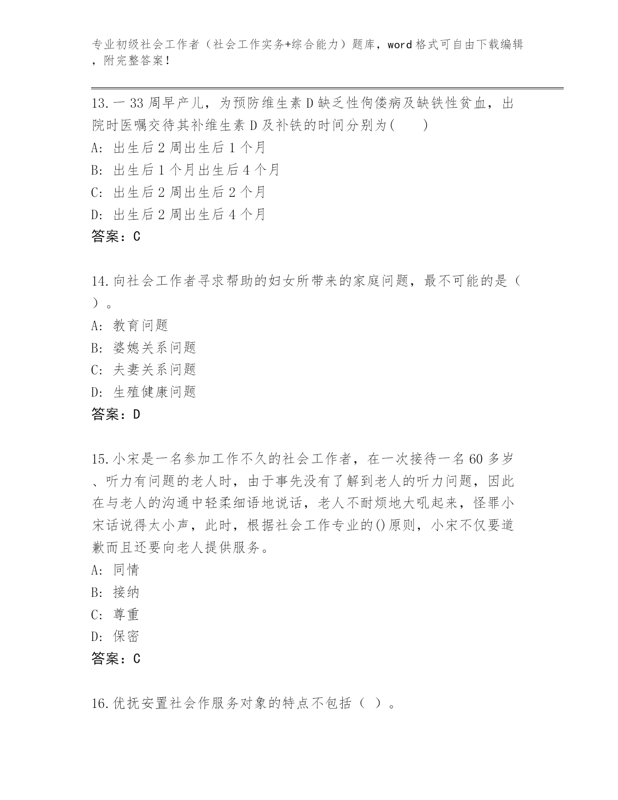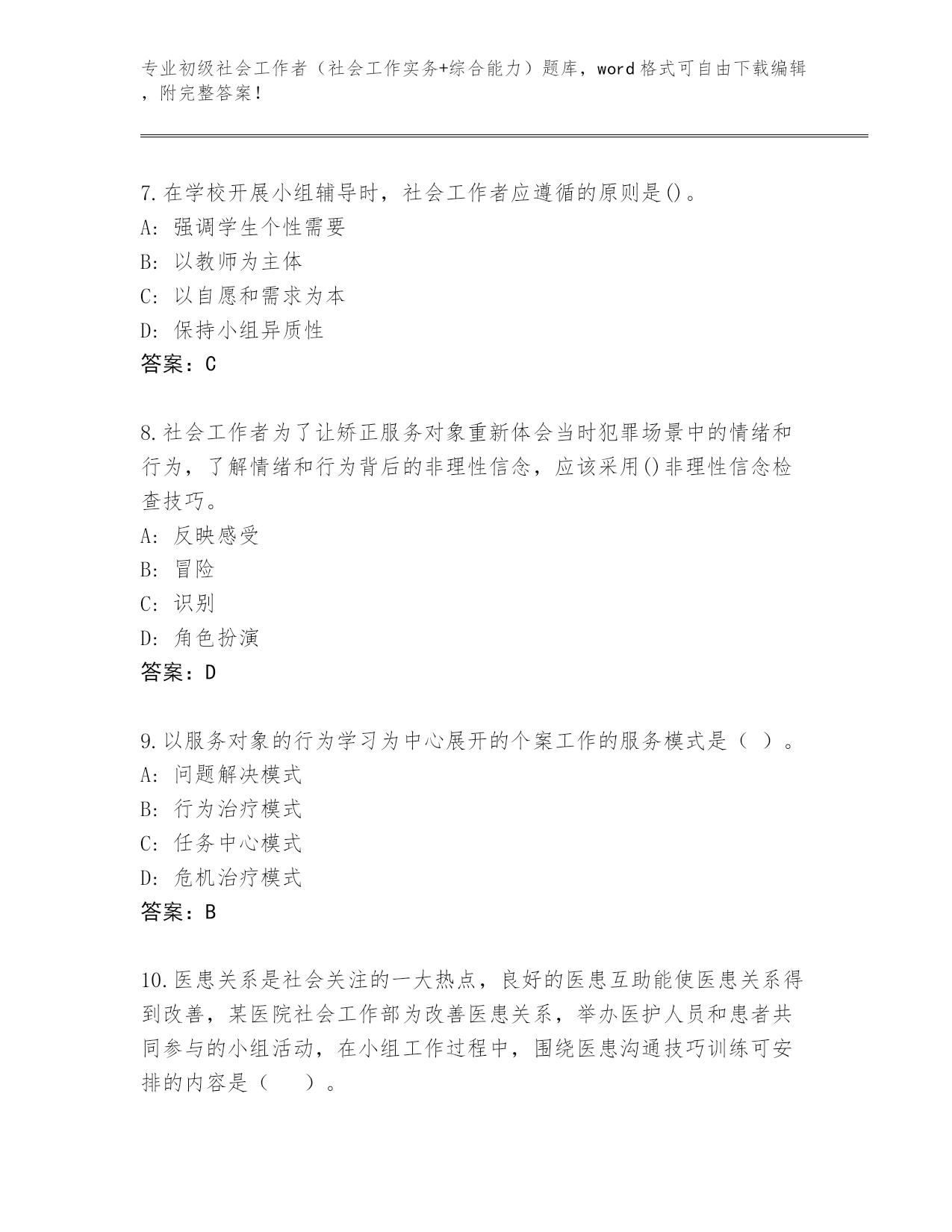 专业初级社会工作者(社会工作实务+综合能力)题库,word格式可自由下载编辑,附完整答案!2024年江苏省盱眙县初级社会工作者(社会工作实务+综合能力)真题(名校卷)第I部分单选题(100题)1.社会工作者小花在做社会工作研究的时候发现失业者、流动人口等都是他要关注的对象。根据社会工作研究的特性,下列哪类人不属于社会工作研究主要关注的群体()A:病人B:贫穷人士C:企业家D:面临压力的群体答案:C2.根据著名心理学家艾德沃特的说法,从认知与就业的角度来说,青少年范围结束的标志为()。A:完成仪式或庆典B:进入个人、家庭与工作角色中C:能够逻辑思考并自主的作决定D:达到自我修正的个人认定状态答案:C3.社会工作者在专业价值观念指导下,根据服务对象个人特殊需要,为其提供个案服务;针对服务对象的同质需要,为更多人开展小组服务。这表明与慈善助人活动相比,社会工作专业特点的是()。A:个人的价值观B:专业助人方法C:潜在服务对象D:社会工作服务机构答案:B4.社会工作者小李的工作内容是为城市无家可归者提供基本生活物资帮扶、政策咨询和心理疏导服务,该服务领域属于()。A:社区社会工作B:优抚安置社会工作C:家庭社会工作D:社会救助社会工作答案:D5.社会工作者直接表达自己不同的看法、直接指出服务对象某种行为可能带来的不良后果等,都属于心理社会模式中的()技巧。A:间接治疗B:探索—描述—宣泄C:直接影响D:心理动力反映答案:C6.在社会工作中,服务对象在没有社会工作者的协助下可以自己开始新生活时,社会工作者和服务对象双方根据协议逐步结束工作关系所采取的行动是()。A:评估B:结案C:解案D:行动答案:B7.在学校开展小组辅导时,社会工作者应遵循的原则是()。A:强调学生个性需要B:以教师为主体C:以自愿和需求为本D:保持小组异质性答案:C8.社会工作者为了让矫正服务对象重新体会当时犯罪场景中的情绪和行为,了解情绪和行为背后的非理性信念,应该采用()非理性信念检查技巧。A:反映感受B:冒险C:识别D:角色扮演答案:D9.以服务对象的行为学习为中心展开的个案工作的服务模式是()。A:问题解决模式B:行为治疗模式C:任务中心模式D:危机治疗模式答案:B10.医患关系是社会关注的一大热点,良好的医患互助能使医患关系得到改善,某医院社会工作部为改善医患关系,举办医护人员和患者共同参与的小组活动,在小组工作过程中,围绕医患沟通技巧训练可安排的内容是()。A:?请医护人员向患者提供有关疾病诊治知识B:?帮助组员练习“澄清”“重复”等技巧C:?请患者在小组中反馈学习感受D:提升患者对疾病的控制能力答案:B11.李女士因为家庭不和前来求助,她说丈夫整天忙于工作,不顾家里,儿子也整天打游戏,乱花钱,她为家里付出那么多,感觉一点也没有得到回报,现在觉得她的人生很失败。社会工作者小刘打算用聚焦的技巧来了解李女士目前面临的主要问题,下列说法符合这一技巧的是()。A:李女士,遇到这些问题,您通常的应对方法是什么呢B:李女士,您刚才说了那么多,您认为最让您头疼的问题是什么呢C:李女士,我很理解您作为家庭主妇的不容易D:李女士,我听说喜欢玩游戏的孩子一般都很聪明,您的儿子把聪明用在学习上会怎样呢答案:B12.(2016年)社会工作者小王在社区调查中发现,许多年轻家长在育儿方面有困扰,不知如何与孩子沟通,如何避免对孩子发脾气。针对这些问题,小王应为这些家长提供的服务是()。A:亲职辅导B:儿童辅导C:婚姻辅导D:家庭辅导答案:A13.一33周早产儿,为预防维生素D缺乏性佝偻病及缺铁性贫血,出院时医嘱交待其补维生素D及补铁的时间分别为()A:出生后2周出生后1个月B:出生后1个月出生后4个月C:出生后2周出生后2个月D:出生后2周出生后4个月答案:C14.向社会工作者寻求帮助的妇女所带来的家庭问题,最不可能的是()。A:教育问题B:婆媳关系问题C:夫妻关系问题D:生殖健康问题答案:D15.小宋是一名参加工作不久的社会工作者,在一次接待一名60多岁、听力有问题的老人时,由于事先没有了解到老人的听力问题,因此在与老人的沟通中轻柔细语地说话,老人不耐烦地大吼起来,怪罪小宋话说得太小声,此时,根据社会工作专业的()原则,小宋不仅要道歉而且还要向老人提供服务。A:同情B:接纳C:尊重D:保密答案:C16.优抚安置社会作服务对象的特点不包括()。A:需要层次多B:社会地位高C:覆盖范围广D:军队情结深答案:B17.针对社区中受艾滋病影响的儿童,社会工作者小彭为他们找到了一家护理中心,同时小彭希望这些儿童的家长能够协助护理中心帮助这些受艾滋病影响的儿童。社会工作者小彭扮演的是社区照顾模式中()的角色。A:顾问B:治疗者C:经纪人D:倡导者答案:C18.社会工作的实践强调服务对象的自我决定