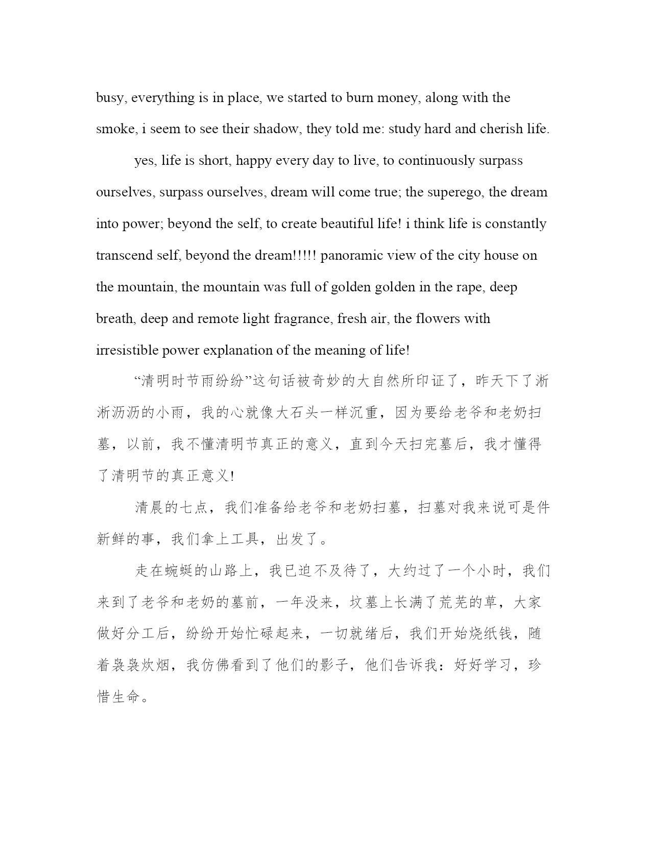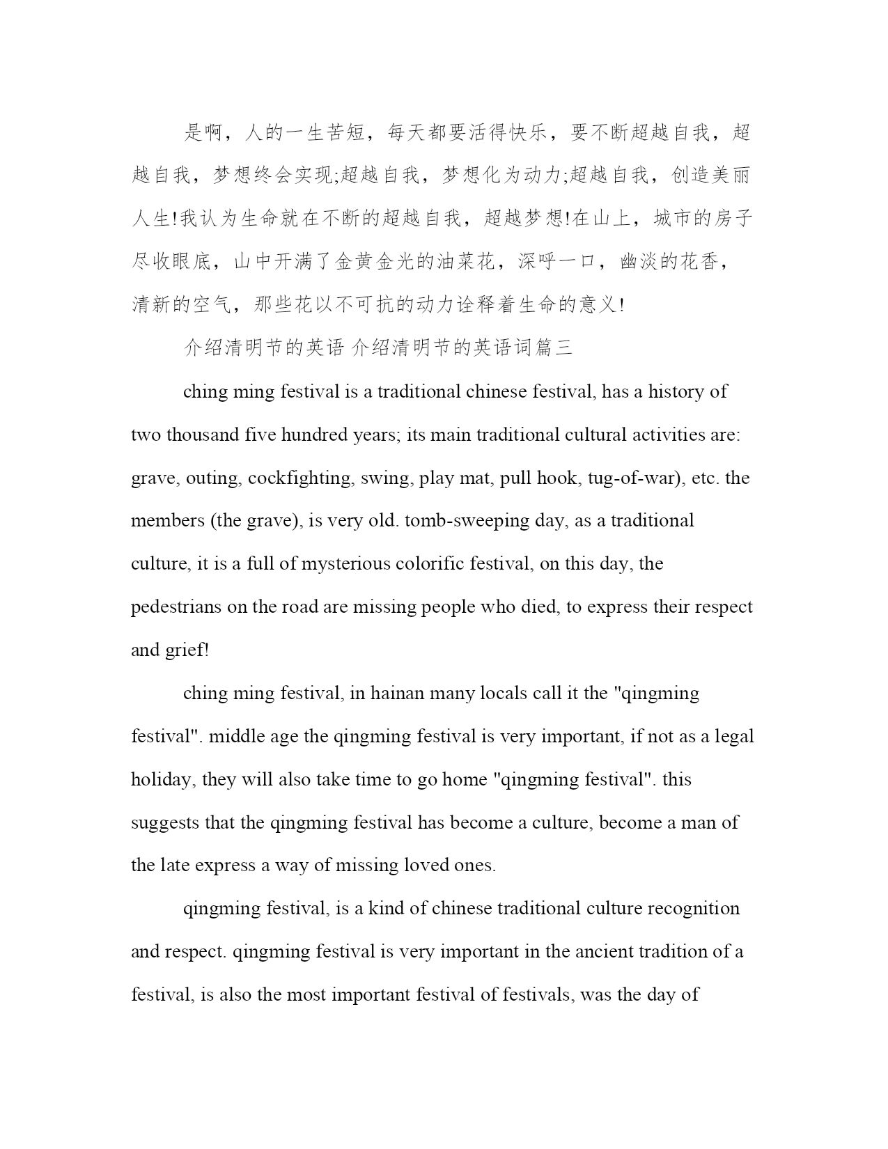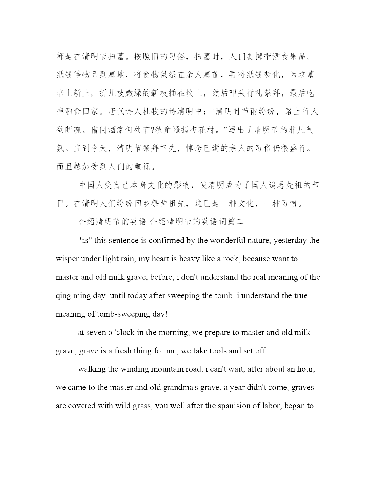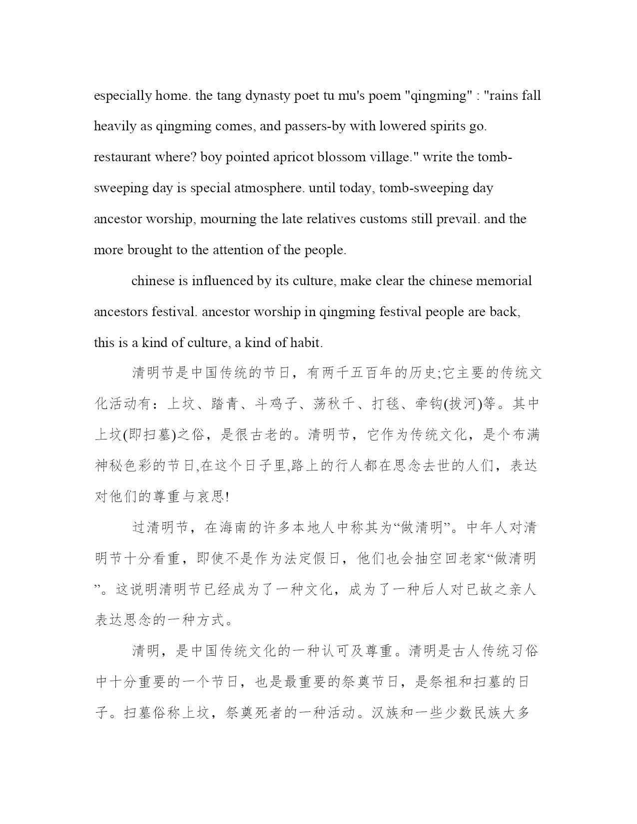 介绍清明节的英语介绍清明节的英语词(三篇)人的记忆力会随着岁月的流逝而衰退,写作可以弥补记忆的不足,将曾经的人生经历和感悟记录下来,也便于保存一份美好的回忆。大家想知道怎么样才能写一篇比较优质的范文吗?以下是我为大家搜集的优质范文,仅供参考,一起来看看吧介绍清明节的英语介绍清明节的英语词篇一chingmingfestival,inhainanmanylocalscallitthe"qingmingfestival".middleagetheqingmingfestivalisveryimportant,ifnotasalegalholiday,theywillalsotaketimetogohome"qingmingfestival".thissuggeststhattheqingmingfestivalhasbecomeaculture,becomeamanofthelateexpressawayofmissinglovedones.qingmingfestival,isakindofchinesetraditionalculturerecognitionandrespect.qingmingfestivalisveryimportantintheancienttraditionofafestival,isalsothemostimportantfestivaloffestivals,wasthedayofancestorworshipandthegrave.thisgrave,theshrineofthedeadanactivity.thehannationalityandsomeminorityaremostlyinthetombs.accordingtotheoldtradition,thegrave,peopletocarrygoodssuchasespeciallyfruit,papermoneytothegrave,willbefoodforofferinginthefamilytomb,thenpaperincineration,newsoiluptothegrave,foldafewbranchespalegreenbranchesedinthegrave,andthensalutekowtowworship,finallyeatespeciallyhome.thetangdynastypoettumu'spoem"qingming":"rainsfallheavilyasqingmingcomes,andpassers-bywithloweredspiritsgo.restaurantwhere?boypointedapricotblossomvillage."writethetomb-sweepingdayisspecialatmosphere.untiltoday,tomb-sweepingdayancestorworship,mourningthelaterelativescustomsstillprevail.andthemorebroughttotheattentionofthepeople.chineseisinfluencedbyitsculture,makeclearthechinesememorialancestorsfestival.ancestorworshipinqingmingfestivalpeopleareback,thisisakindofculture,akindofhabit.清明节是中国传统的节日,有两千五百年的历史;它主要的传统文化活动有:上坟、踏青、斗鸡子、荡秋千、打毯、牵钩(拔河)等。其中上坟(即扫墓)之俗,是很古老的。清明节,它作为传统文化,是个布满神秘色彩的节日,在这个日子里,路上的行人都在思念去世的人们,表达对他们的尊重与哀思!过清明节,在海南的许多本地人中称其为“做清明”。中年人对清明节十分看重,即使不是作为法定假日,他们也会抽空回老家“做清明”。这说明清明节已经成为了一种文化,成为了一种后人对已故之亲人表达思念的一种方式。清明,是中国传统文化的一种认可及尊重。清明是古人传统习俗中十分重要的一个节日,也是最重要的祭奠节日,是祭祖和扫墓的日子。扫墓俗称上坟,祭奠死者的一种活动。汉族和一些少数民族大多都是在清明节扫墓。按照旧的习俗,扫墓时,人们要携带酒食果品、纸钱等物品到墓地,将食物供祭在亲人墓前,再将纸钱焚化,为坟墓培上新土,折几枝嫩绿的新枝插在坟上,然后叩头行礼祭拜,最后吃掉酒食回家。唐代诗人杜牧的诗清明中:“清明时节雨纷纷,路上行人欲断魂。借问酒家何处有?牧童遥指杏花村。”写出了清明节的非凡气氛。直到今天,清明节祭拜祖先,悼念已逝的亲人的习俗仍很盛行。而