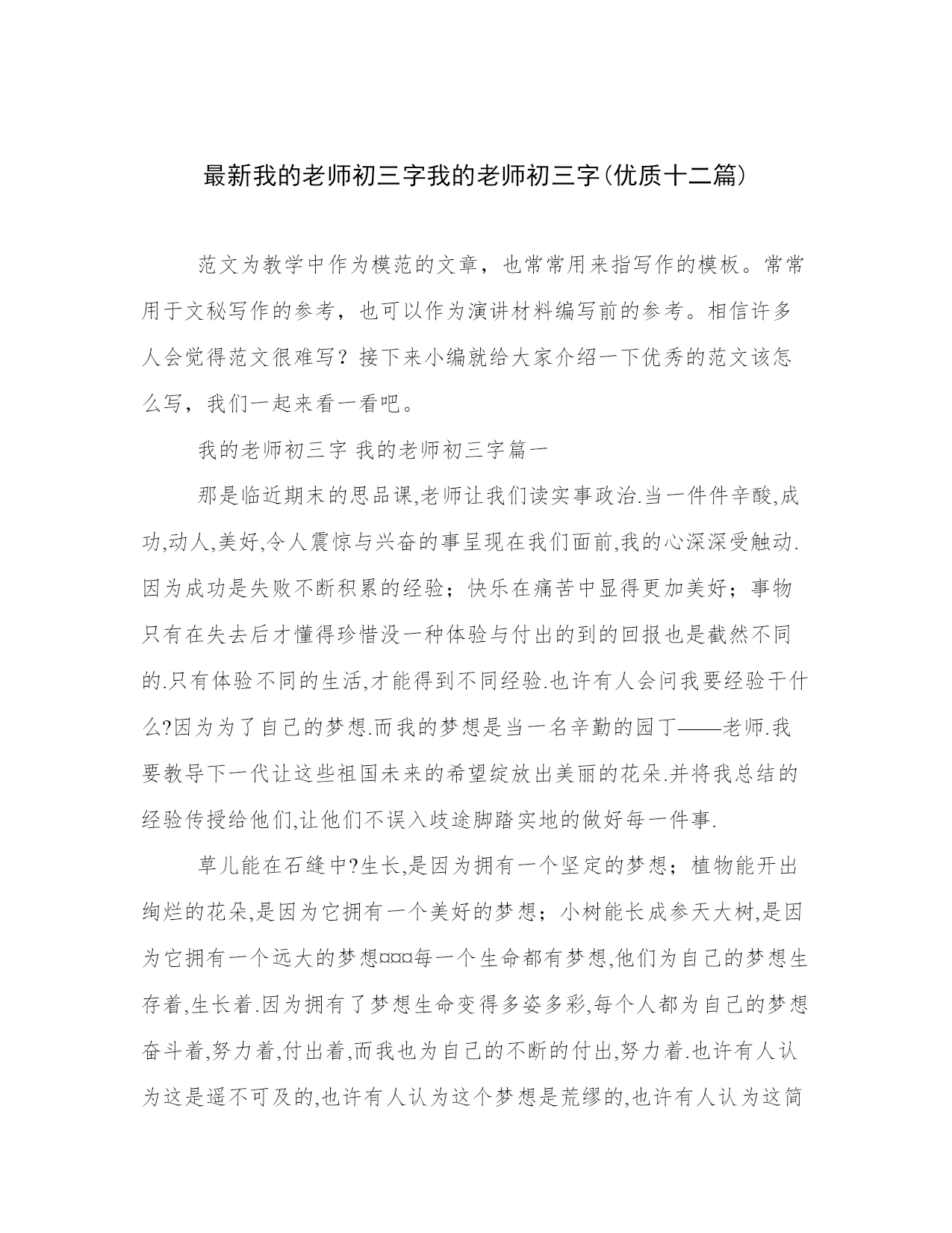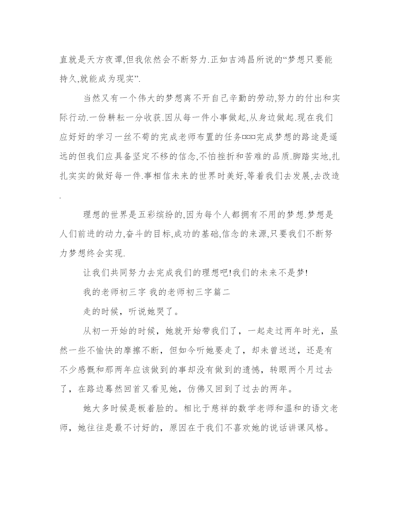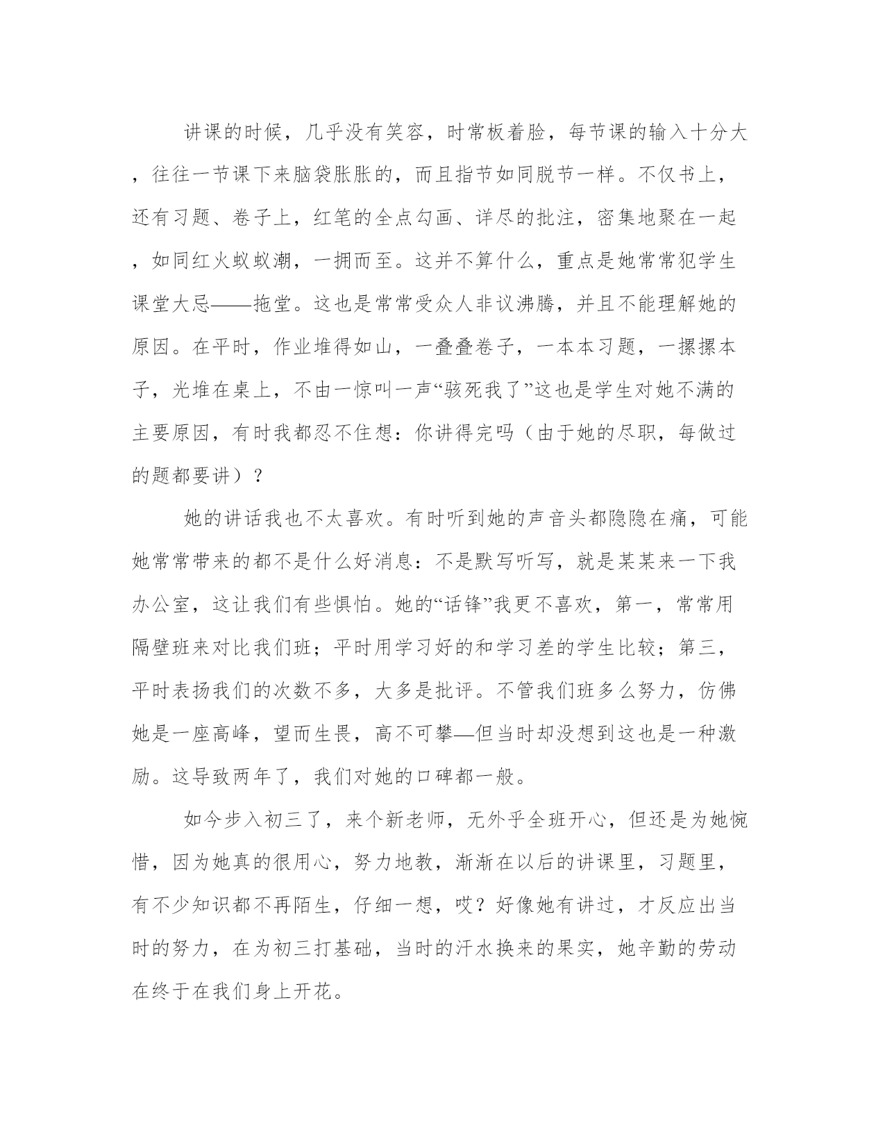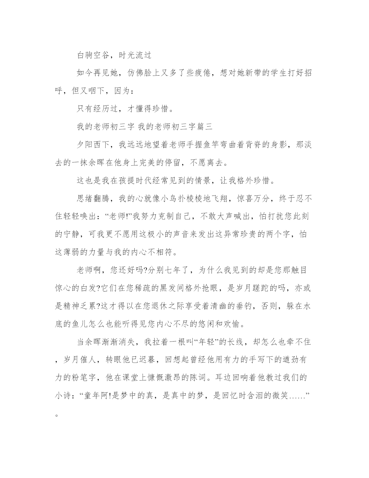 最新我的老师初三字我的老师初三字(优质十二篇)范文为教学中作为模范的文章,也常常用来指写作的模板。常常用于文秘写作的参考,也可以作为演讲材料编写前的参考。相信许多人会觉得范文很难写?接下来小编就给大家介绍一下优秀的范文该怎么写,我们一起来看一看吧。我的老师初三字我的老师初三字篇一那是临近期末的思品课,老师让我们读实事政治.当一件件辛酸,成功,动人,美好,令人震惊与兴奋的事呈现在我们面前,我的心深深受触动.因为成功是失败不断积累的经验;快乐在痛苦中显得更加美好;事物只有在失去后才懂得珍惜没一种体验与付出的到的回报也是截然不同的.只有体验不同的生活,才能得到不同经验.也许有人会问我要经验干什么?因为为了自己的梦想.而我的梦想是当一名辛勤的园丁——老师.我要教导下一代让这些祖国未来的希望绽放出美丽的花朵.并将我总结的经验传授给他们,让他们不误入歧途脚踏实地的做好每一件事.草儿能在石缝中?生长,是因为拥有一个坚定的梦想;植物能开出绚烂的花朵,是因为它拥有一个美好的梦想;小树能长成参天大树,是因为它拥有一个远大的梦想¤¤¤每一个生命都有梦想,他们为自己的梦想生存着,生长着.因为拥有了梦想生命变得多姿多彩,每个人都为自己的梦想奋斗着,努力着,付出着,而我也为自己的不断的付出,努力着.也许有人认为这是遥不可及的,也许有人认为这个梦想是荒缪的,也许有人认为这简直就是天方夜谭,但我依然会不断努力.正如吉鸿昌所说的“梦想只要能持久,就能成为现实”.当然又有一个伟大的梦想离不开自己辛勤的劳动,努力的付出和实际行动.一份耕耘一分收获.因从每一件小事做起,从身边做起.现在我们应好好的学习一丝不苟的完成老师布置的任务¤¤¤完成梦想的路途是遥远的但我们应具备坚定不移的信念,不怕挫折和苦难的品质.脚踏实地,扎扎实实的做好每一件.事相信未来的世界时美好,等着我们去发展,去改造.理想的世界是五彩缤纷的,因为每个人都拥有不用的梦想.梦想是人们前进的动力,奋斗的目标,成功的基础,信念的来源,只要我们不断努力梦想终会实现.让我们共同努力去完成我们的理想吧!我们的未来不是梦!我的老师初三字我的老师初三字篇二走的时候,听说她哭了。从初一开始的时候,她就开始带我们了,一起走过两年时光,虽然一些不愉快的摩擦不断,但如今听她要走了,却未曾送送,还是有不少感慨和那两年应该做到的事却没有做到的遗憾,转眼两个月过去了,在路边蓦然回首又看见她,仿佛又回到了过去的两年。她大多时候是板着脸的。相比于慈祥的数学老师和温和的语文老师,她往往是最不讨好的,原因在于我们不喜欢她的说话讲课风格。讲课的时候,几乎没有笑容,时常板着脸,每节课的输入十分大,往往一节课下来脑袋胀胀的,而且指节如同脱节一样。不仅书上,还有习题、卷子上,红笔的全点勾画、详尽的批注,密集地聚在一起,如同红火蚁蚁潮,一拥而至。这并不算什么,重点是她常常犯学生课堂大忌——拖堂。这也是常常受众人非议沸腾,并且不能理解她的原因。在平时,作业堆得如山,一叠叠卷子,一本本习题,一摞摞本子,光堆在桌上,不由一惊叫一声“骇死我了”这也是学生对她不满的主要原因,有时我都忍不住想:你讲得完吗(由于她的尽职,每做过的题都要讲)?她的讲话我也不太喜欢。有时听到她的声音头都隐隐在痛,可能她常常带来的都不是什么好消息:不是默写听写,就是某某来一下我办公室,这让我们有些惧怕。她的“话锋”我更不喜欢,第一,常常用隔壁班来对比我们班;平时用学习好的和学习差的学生比较;第三,平时表扬我们的次数不多,大多是批评。不管我们班多么努力,仿佛她是一座高峰,望而生畏,高不可攀—但当时却没想到这也是一种激励。这导致两年了,我们对她的口碑都一般。如今步入初三了,来个新老师,无外乎全班开心,但还是为她惋惜,因为她真的很用心,努力地教,渐渐在以后的讲课里,习题里,有不少知识都不再陌生,仔细一想,哎?好像她有讲过,才反应出当时的努力,在为初三打基础,当时的汗水换来的果实,她辛勤的劳动在终于在我们身上开花。白驹空谷,时光流过如今再见她,仿佛脸上又多了些疲倦,想对她新带的学生打好招呼,但又咽下,因为:只有经历过,才懂得珍惜。我的老师初三字我的老师初三字篇三夕阳西下,我远远地望着老师手握鱼竿弯曲着背脊的身影,那淡去的一抹余晖在他身上完美的停留,不愿离去。这也是我在孩提时代经常见到的情景,让我格外珍惜。思绪翻腾,我的心就像小鸟扑棱棱地飞翔,惊喜万分,终于忍不住轻轻唤出:“老师!”我努力克制自己,不敢大声喊出,怕打扰您此刻的宁静,可我更不愿用这极小的声音来发出这异常珍贵的两个字,怕这薄弱的力量与我的内心不相符。老师啊,您还好吗?分别七年了,为什么我见到的却是您那触目惊心的白发?它们在您稀疏的黑发间格外抢眼,是岁月蹉跎的吗,亦或是精神乏累?这才得以在您退休之际享受着清幽的垂钓,否则,躲在水底的鱼
