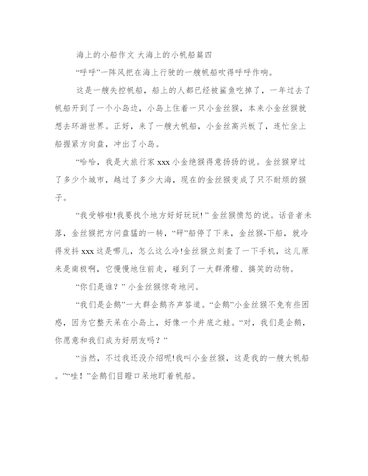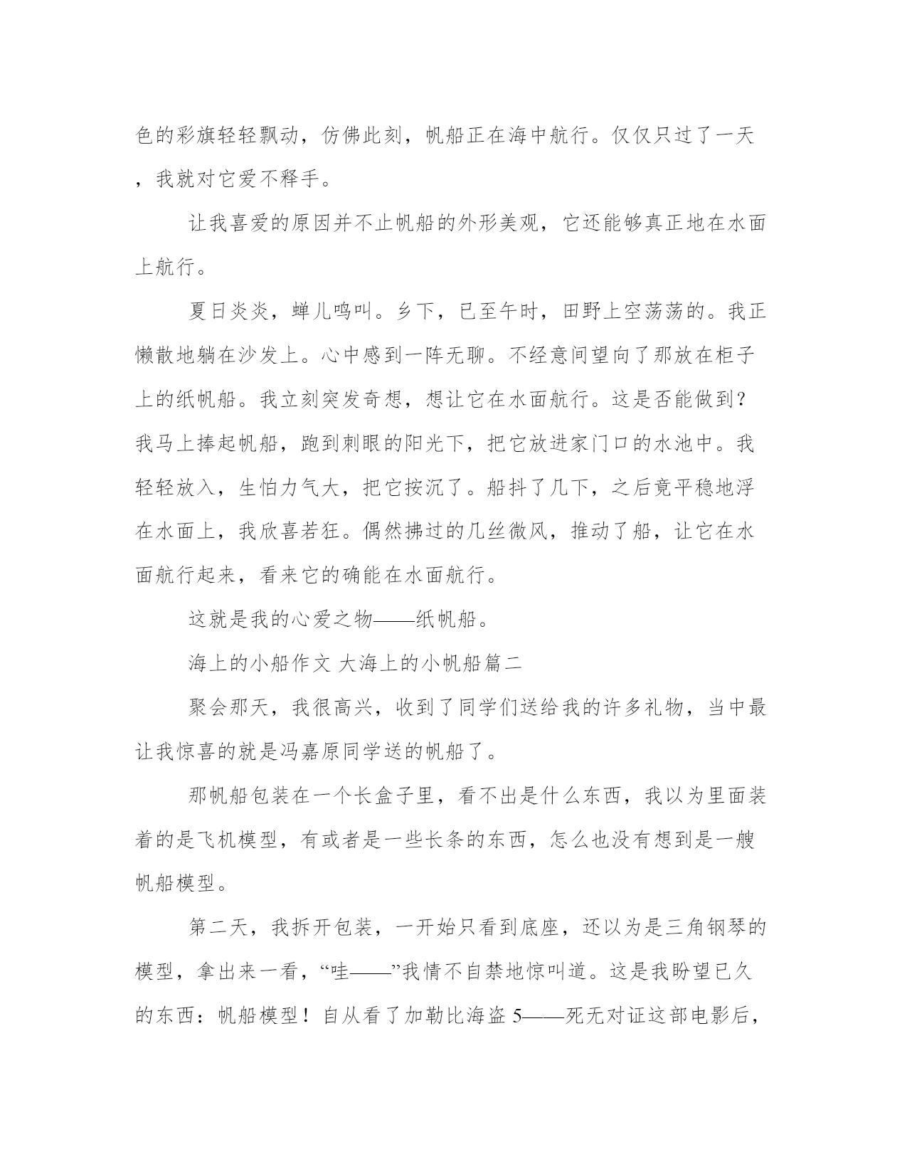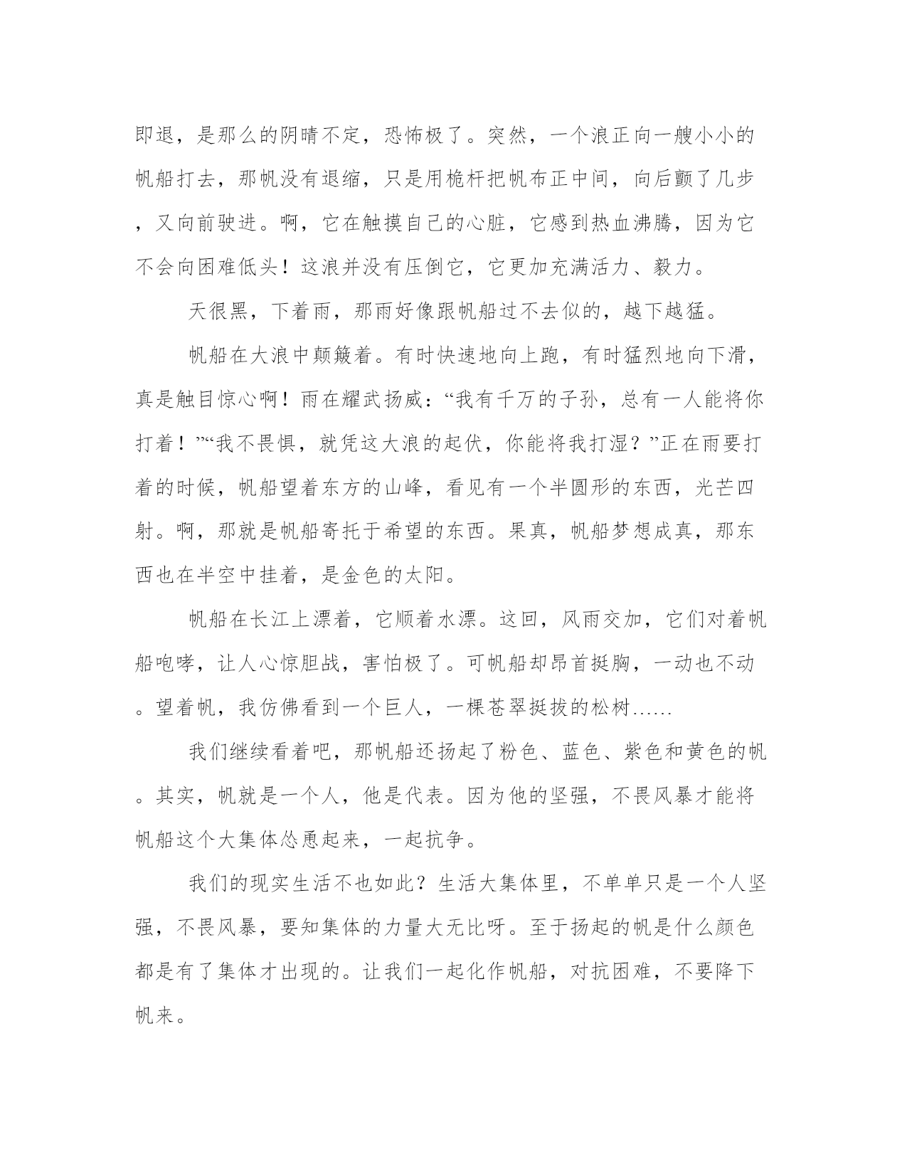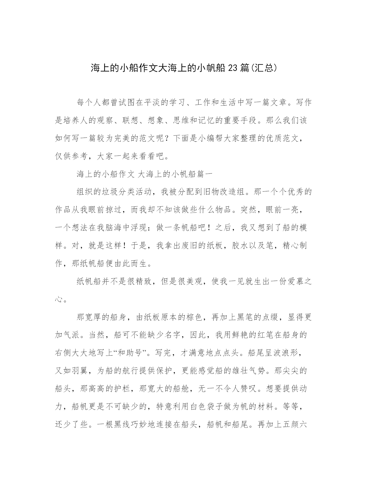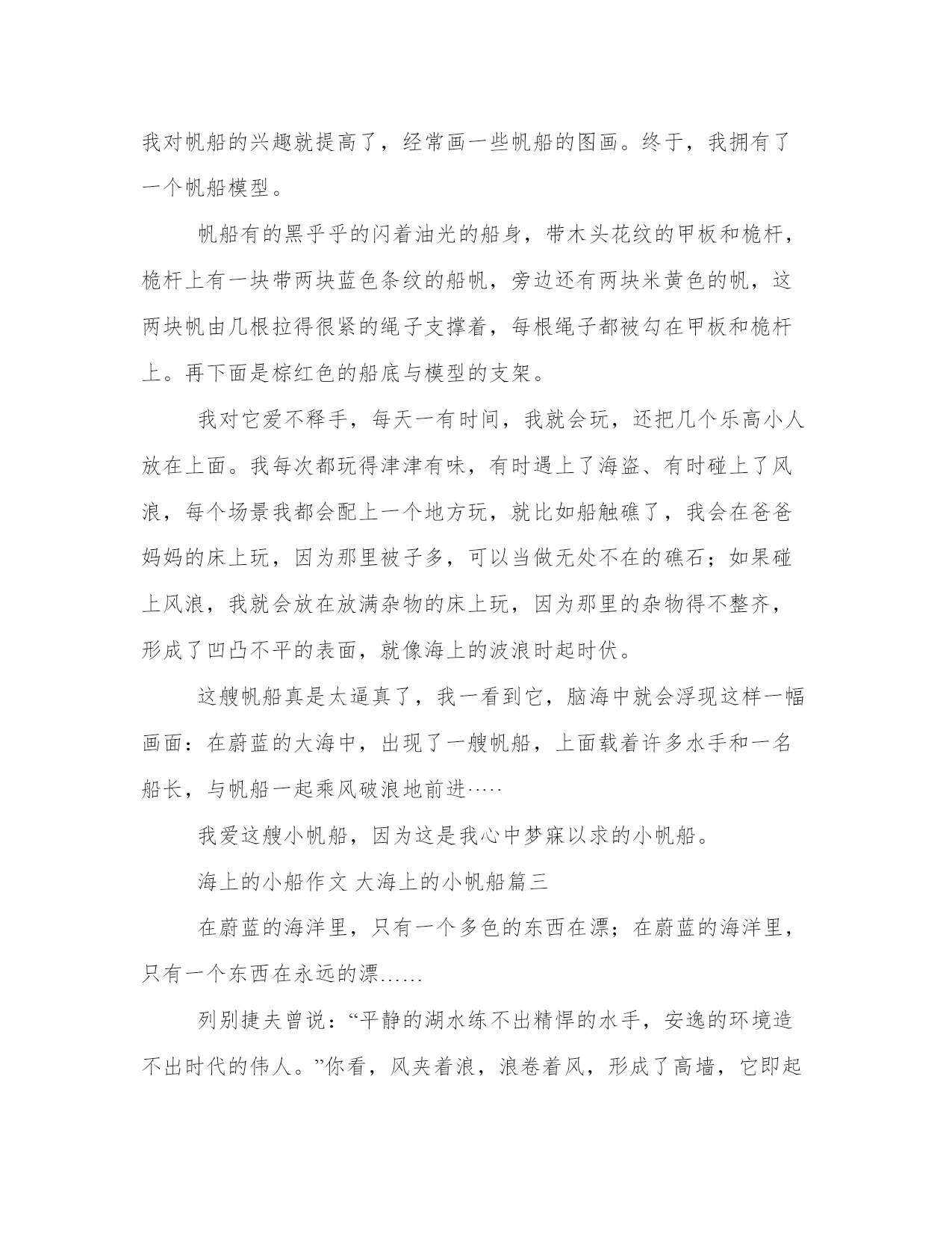 海上的小船作文大海上的小帆船23篇(汇总)每个人都曾试图在平淡的学习、工作和生活中写一篇文章。写作是培养人的观察、联想、想象、思维和记忆的重要手段。那么我们该如何写一篇较为完美的范文呢?下面是小编帮大家整理的优质范文,仅供参考,大家一起来看看吧。海上的小船作文大海上的小帆船篇一组织的垃圾分类活动,我被分配到旧物改造组。那一个个优秀的作品从我眼前掠过,而我却不知该做些什么物品。突然,眼前一亮,一个想法在我脑海中浮现:做一条帆船吧!之后,我又想到了船的模样。对,就是这样!于是,我拿出废旧的纸板,胶水以及笔,精心制作,那纸帆船便由此而生。纸帆船并不是很精致,但是很美观,使我一见就生出一份爱慕之心。那宽厚的船身,由纸板原本的棕色,再加上黑笔的点缀,显得更加气派。当然,船可不能缺少名字,因此,我用鲜艳的红笔在船身的右侧大大地写上“和助号”。写完,才满意地点点头。船尾呈波浪形,又如羽翼,为船的航行提供保护,更能感觉船的雄壮气势。那尖尖的船头,那高高的护栏,那宽大的船舱,无一不令人赞叹。想要提供动力,船帆更是不可缺少的,特意利用白色袋子做为帆的材料。等等,还少了些。一根黑线巧妙地连接在船头,船帆和船尾。再加上五颜六色的彩旗轻轻飘动,仿佛此刻,帆船正在海中航行。仅仅只过了一天,我就对它爱不释手。让我喜爱的原因并不止帆船的外形美观,它还能够真正地在水面上航行。夏日炎炎,蝉儿鸣叫。乡下,已至午时,田野上空荡荡的。我正懒散地躺在沙发上。心中感到一阵无聊。不经意间望向了那放在柜子上的纸帆船。我立刻突发奇想,想让它在水面航行。这是否能做到?我马上捧起帆船,跑到刺眼的阳光下,把它放进家门口的水池中。我轻轻放入,生怕力气大,把它按沉了。船抖了几下,之后竟平稳地浮在水面上,我欣喜若狂。偶然拂过的几丝微风,推动了船,让它在水面航行起来,看来它的确能在水面航行。这就是我的心爱之物——纸帆船。海上的小船作文大海上的小帆船篇二聚会那天,我很高兴,收到了同学们送给我的许多礼物,当中最让我惊喜的就是冯嘉原同学送的帆船了。那帆船包装在一个长盒子里,看不出是什么东西,我以为里面装着的是飞机模型,有或者是一些长条的东西,怎么也没有想到是一艘帆船模型。第二天,我拆开包装,一开始只看到底座,还以为是三角钢琴的模型,拿出来一看,“哇——”我情不自禁地惊叫道。这是我盼望已久的东西:帆船模型!自从看了加勒比海盗5——死无对证这部电影后,我对帆船的兴趣就提高了,经常画一些帆船的图画。终于,我拥有了一个帆船模型。帆船有的黑乎乎的闪着油光的船身,带木头花纹的甲板和桅杆,桅杆上有一块带两块蓝色条纹的船帆,旁边还有两块米黄色的帆,这两块帆由几根拉得很紧的绳子支撑着,每根绳子都被勾在甲板和桅杆上。再下面是棕红色的船底与模型的支架。我对它爱不释手,每天一有时间,我就会玩,还把几个乐高小人放在上面。我每次都玩得津津有味,有时遇上了海盗、有时碰上了风浪,每个场景我都会配上一个地方玩,就比如船触礁了,我会在爸爸妈妈的床上玩,因为那里被子多,可以当做无处不在的礁石;如果碰上风浪,我就会放在放满杂物的床上玩,因为那里的杂物得不整齐,形成了凹凸不平的表面,就像海上的波浪时起时伏。这艘帆船真是太逼真了,我一看到它,脑海中就会浮现这样一幅画面:在蔚蓝的大海中,出现了一艘帆船,上面载着许多水手和一名船长,与帆船一起乘风破浪地前进·····我爱这艘小帆船,因为这是我心中梦寐以求的小帆船。海上的小船作文大海上的小帆船篇三在蔚蓝的海洋里,只有一个多色的东西在漂;在蔚蓝的海洋里,只有一个东西在永远的漂……列别捷夫曾说:“平静的湖水练不出精悍的水手,安逸的环境造不出时代的伟人。”你看,风夹着浪,浪卷着风,形成了高墙,它即起即退,是那么的阴晴不定,恐怖极了。突然,一个浪正向一艘小小的帆船打去,那帆没有退缩,只是用桅杆把帆布正中间,向后颤了几步,又向前驶进。啊,它在触摸自己的心脏,它感到热血沸腾,因为它不会向困难低头!这浪并没有压倒它,它更加充满活力、毅力。天很黑,下着雨,那雨好像跟帆船过不去似的,越下越猛。帆船在大浪中颠簸着。有时快速地向上跑,有时猛烈地向下滑,真是触目惊心啊!雨在耀武扬威:“我有千万的子孙,总有一人能将你打着!”“我不畏惧,就凭这大浪的起伏,你能将我打湿?”正在雨要打着的时候,帆船望着东方的山峰,看见有一个半圆形的东西,光芒四射。啊,那就是帆船寄托于希望的东西。果真,帆船梦想成真,那东西也在半空中挂着,是金色的太阳。帆船在长江上漂着,它顺着水漂。这回,风雨交加,它们对着帆船咆哮,让人心惊胆战,害怕极了。可帆船却昂首挺胸,一动也不动。望着帆,我仿佛看到一个巨人,一棵苍翠挺拔的松树……我们继续看着吧,那帆船还扬起了粉色、蓝色、紫色和黄色的帆。其实,帆就是一个人,他是代表。因为他的坚强,不畏风暴才能将帆船这个大集体怂