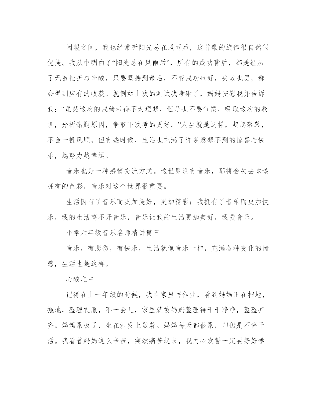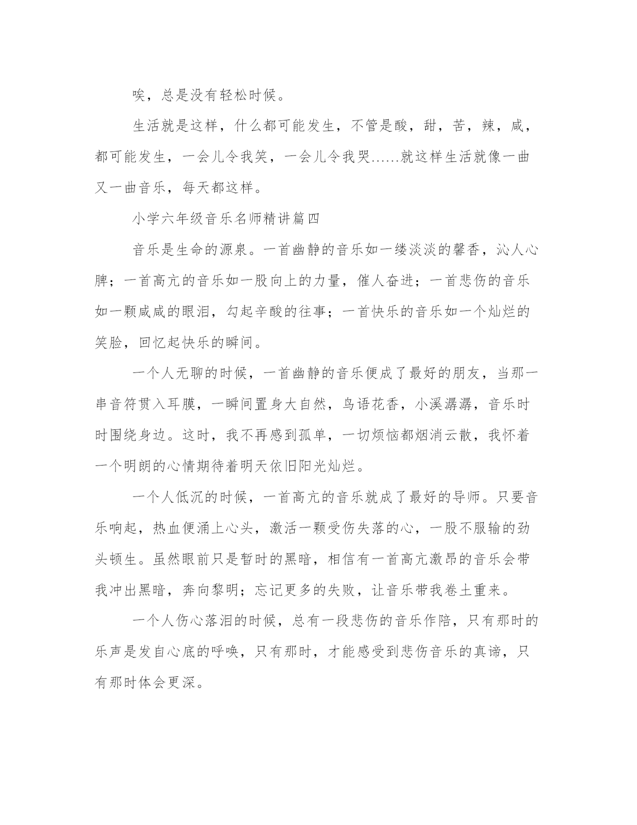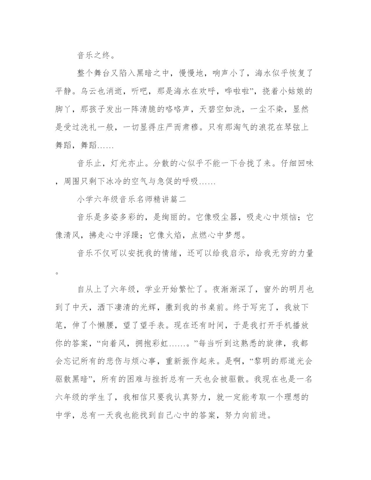 小学六年级音乐名师精讲(十四篇)在日常的学习、工作、生活中,肯定对各类范文都很熟悉吧。那么我们该如何写一篇较为完美的范文呢?以下是我为大家搜集的优质范文,仅供参考,一起来看看吧小学六年级音乐名师精讲篇一音乐之始。音乐紧随着节拍,开始舞蹈。时而高昂,是而低沉。大提琴在那儿唱歌,咣咣”,小提琴在那儿伴舞,刷刷”,钢琴的黑白键在那一刻似乎也活跃起来了,纤细的手指撞击着柔和的琴键,一高一矮,奏出一排悦耳的旋律。二胡则调动琴弦,一拨,当”,显然那其中蕴涵着哀痛之音,但却也与其他乐器配合得天衣无缝。小鼓在手中不停地展示。自己的歌喉,那声音震天地响,似乎在向天地呼喊,那一声沉闷的咚”,预示着暴风雨要来啦!音乐之中。灯光亮了,舞台立即由阴暗转为刷白。首先是大提琴登场,是大海的声音吗?是的,随着灯光的忽亮忽暗,那旋律也变得急促了,所有的乐器都加快了脚步,时间似乎静止了,人们的心也随之揪紧。听吧,大海在涛天的震吼,海水不断地咆哮,乌云吞没了最后一丝光明。音乐之终。整个舞台又陷入黑暗之中,慢慢地,响声小了,海水似乎恢复了平静。乌云也消逝,听吧,那是海水在欢呼,哗啦啦”,挠着小姑娘的脚丫,那孩子发出一阵清脆的咯咯声,天碧空如洗,一尘不染,显然是受过洗礼一般,一切显得庄严而肃穆。只有那淘气的浪花在琴弦上舞蹈,舞蹈……音乐止,灯光亦止。分散的心似乎不能一下合拢了来。仔细回味,周围只剩下冰冷的空气与急促的呼吸……小学六年级音乐名师精讲篇二音乐是多姿多彩的,是绚丽的。它像吸尘器,吸走心中烦恼;它像清风,拂走心中浮躁;它像火焰,点燃心中梦想。音乐不仅可以安抚我的情绪,还可以给我启示,给我无穷的力量。自从上了六年级,学业开始繁忙了。夜渐渐深了,窗外的明月也到了中天,洒下凄清的光辉,撒到我的书桌前。终于写完了,我放下笔,伸了个懒腰,望了望手表。现在还有时间,于是我打开手机播放你的答案,“向着风,拥抱彩虹……。”每当听到这熟悉的旋律,我都会忘记所有的悲伤与烦心事,重新振作起来。是啊,“黎明的那道光会驱散黑暗”,所有的困难与挫折总有一天也会被驱散。我现在也是一名六年级的学生了,我相信只要我认真努力,就一定能考取一个理想的中学,总有一天我也能找到自己心中的答案,努力向前进。闲暇之间,我也经常听阳光总在风雨后,这首歌的旋律很自然很优美。我从中明白了“阳光总在风雨后”,所有的成功背后,都是经历了无数挫折与辛酸,只要坚持到最后,不管成功也好,失败也罢,都会得到应有的收获。就例如上次的测试我考砸了,妈妈安慰我并告诉我:“虽然这次的成绩考得不太理想,但是也不要气馁,吸取这次的教训,分析错题原因,争取下次考的更好。”人生就是这样,起起落落,不会一帆风顺,但有些时候,生活也充满了许多意想不到的惊喜与快乐,越努力越幸运。音乐也是一种感情交流方式。这世界没有音乐,那将会失去本该拥有的色彩,音乐对这个世界很重要。生活因有了音乐而更加美好,更加精彩;我拥有了音乐而更加快乐,我的生活离不开音乐,音乐让我的生活更加美好,我爱音乐。小学六年级音乐名师精讲篇三音乐,有悲伤,有快乐,生活就像音乐一样,充满各种变化的情感,生活也是这样。心酸之中记得在上一年级的时候,我在家里写作业,看到妈妈正在扫地,拖地,整理衣服,不一会儿,家里就被妈妈整理得干干净净,整整齐齐。妈妈累极了,坐在沙发上歇着。妈妈每天都很累,却仍是不停干活。我看着妈妈这么辛苦,突然痛苦起来,我内心发誓一定要好好学习,争取不辜负妈妈对我的希望,我想到这里泪水流了下来,于是我跑回卧室痛哭了一场。甜甜蜜蜜的水果在一个阳光明媚的下午,我在院子里玩,忽然看到姥姥拿着一个苹果来给我,我不太喜欢吃苹果,我便拒绝了。可是看到姥姥这么远跑来给我送水果,我很感动,虽然这个苹果没有糖甜,但也包含着姥姥对我的爱,哎,姥姥都不舍得吃一口却给我吃。姥姥,我一定要好好读书,长大后报答您,我在心里暗暗想着。学习之苦哎!明明知道作业多,妈妈还给我报了这么多的课外班。唉,真累呀!从这个课外班结束了又赶到了那个课外班,真的是累得不能再累呀!哎!什么时候我就不用上课外班了,我边走着边悲伤地来到了课外班。一,二,三,四,五,耶!星期五终于来了,星期五的下午有我爱上的体育课,终于被我等来了。耶!体育课来了,我们终于可以玩了,我带着快乐的心情走进了教室,嘴里还唱着歌。等呀等!等呀等!不见老师来,我开始着急了,体育老师是不是有事请假了?我想啊想,突然体育老师走进了教室,我的心终于安分了。我们在准备出院子里上体育课,结果数学老师走过来说要占用这节课,结果还是让我空欢喜一场。唉,总是没有轻松时候。生活就是这样,什么都可能发生,不管是酸,甜,苦,辣,咸,都可能发生,一会儿令我笑,一会儿令我哭……就这样生活就像一曲又一曲音乐,每天都这样。小学六年级音乐名师精讲篇四音乐是生命的源泉。一首幽静的音乐