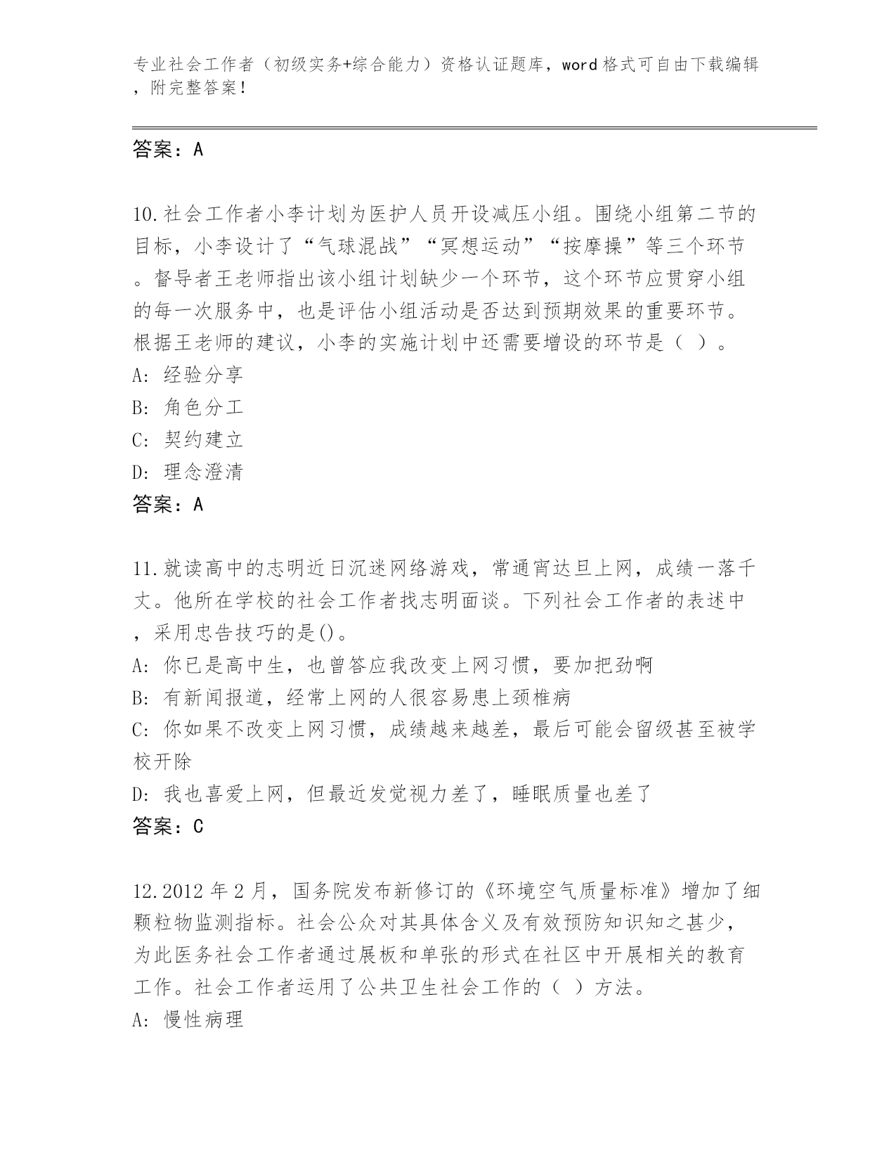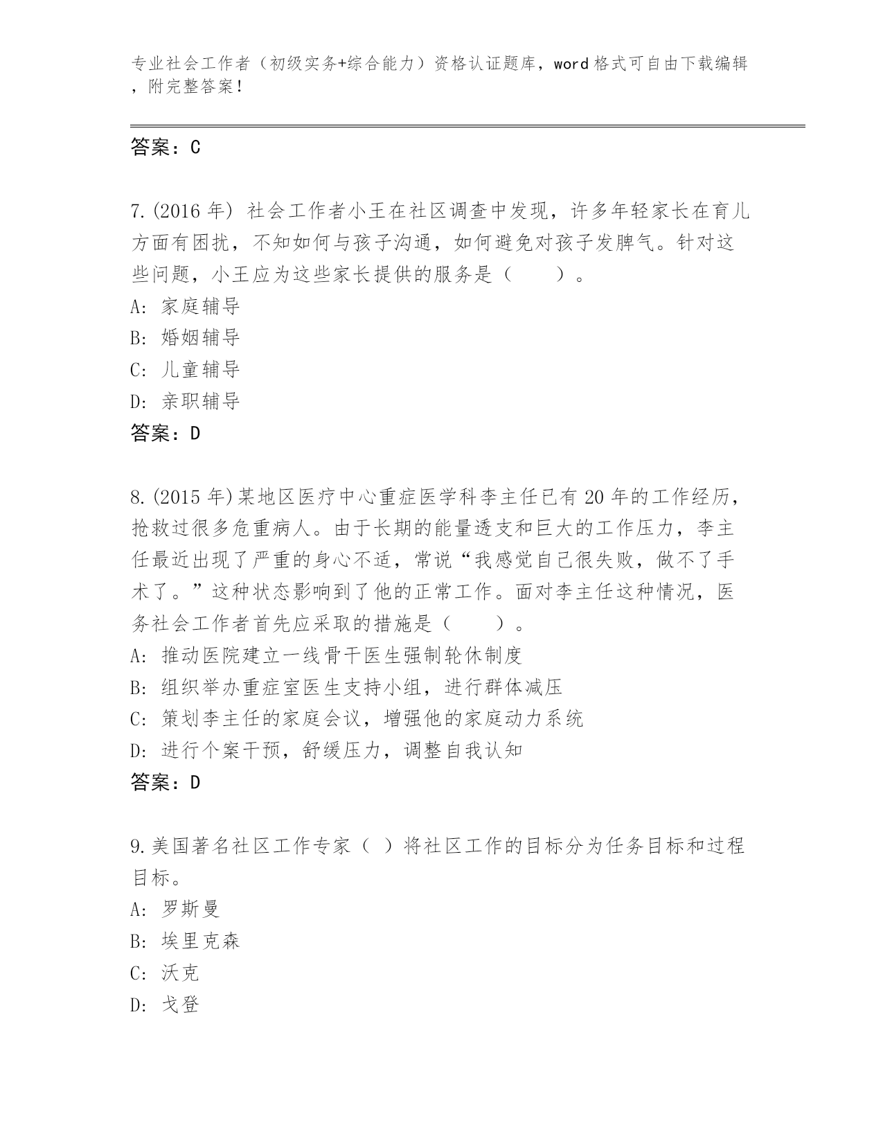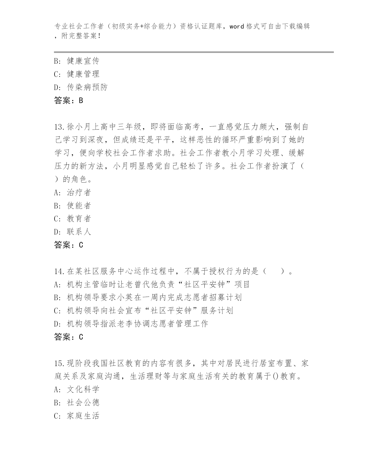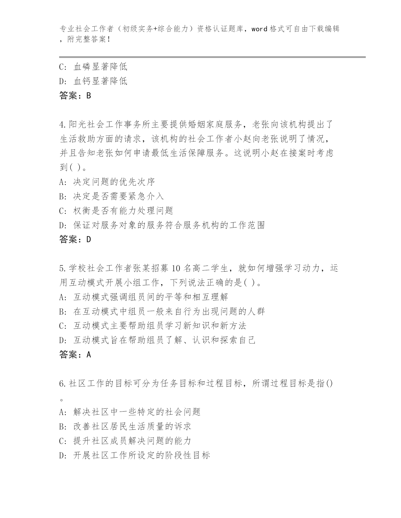 专业社会工作者(初级实务+综合能力)资格认证题库,word格式可自由下载编辑,附完整答案!2024年宁夏回族自治区同心县社会工作者(初级实务+综合能力)资格认证完整版含答案(考试直接用)第I部分单选题(100题)1.()适用于人格稳定和面临暂时困境或挫折的人,以及家庭、婚姻、儿童问题、蓄意自伤、自杀或意外伤害等情况。A:个案管理模式B:危机介入模式C:危机干预模式D:小组辅导模式答案:C2.小学三年级学生小婷学习数学比较困难,学校社会工作者联系志愿者为其辅导功课,但效果不明显。近来,社会工作者经常听到小婷说:“不是我不想学习,而是我学不会。”为更好地帮助小婷,社会工作者需要提升小婷的()。A:个人形象B:自我效能感C:自尊自信D:自我价值感答案:B3.维生素D依赖性佝偻病与维生素D缺乏性佝偻病的区别是A:血碱性磷酸酶明显增高B:血25-(OH)DC:血磷显著降低D:血钙显著降低答案:B4.阳光社会工作事务所主要提供婚姻家庭服务,老张向该机构提出了生活救助方面的请求,该机构的社会工作者小赵向老张说明了情况,并且告知老张如何申请最低生活保障服务。这说明小赵在接案时考虑到()。A:决定问题的优先次序B:决定是否需要紧急介入C:权衡是否有能力处理问题D:保证对服务对象的服务符合服务机构的工作范围答案:D5.学校社会工作者张某招募10名高二学生,就如何增强学习动力,运用互动模式开展小组工作,下列说法正确的是()。A:互动模式强调组员间的平等和相互理解B:在互动模式中组员一般来自行为出现问题的人群C:互动模式主要帮助组员学习新知识和新方法D:互动模式旨在帮助组员了解、认识和探索自己答案:A6.社区工作的目标可分为任务目标和过程目标,所谓过程目标是指()。A:解决社区中一些特定的社会问题B:改善社区居民生活质量的诉求C:提升社区成员解决问题的能力D:开展社区工作所设定的阶段性目标答案:C7.(2016年)社会工作者小王在社区调查中发现,许多年轻家长在育儿方面有困扰,不知如何与孩子沟通,如何避免对孩子发脾气。针对这些问题,小王应为这些家长提供的服务是()。A:家庭辅导B:婚姻辅导C:儿童辅导D:亲职辅导答案:D8.(2015年)某地区医疗中心重症医学科李主任已有20年的工作经历,抢救过很多危重病人。由于长期的能量透支和巨大的工作压力,李主任最近出现了严重的身心不适,常说“我感觉自己很失败,做不了手术了。”这种状态影响到了他的正常工作。面对李主任这种情况,医务社会工作者首先应采取的措施是()。A:推动医院建立一线骨干医生强制轮休制度B:组织举办重症室医生支持小组,进行群体减压C:策划李主任的家庭会议,增强他的家庭动力系统D:进行个案干预,舒缓压力,调整自我认知答案:D9.美国著名社区工作专家()将社区工作的目标分为任务目标和过程目标。A:罗斯曼B:埃里克森C:沃克D:戈登答案:A10.社会工作者小李计划为医护人员开设减压小组。围绕小组第二节的目标,小李设计了“气球混战”“冥想运动”“按摩操”等三个环节。督导者王老师指出该小组计划缺少一个环节,这个环节应贯穿小组的每一次服务中,也是评估小组活动是否达到预期效果的重要环节。根据王老师的建议,小李的实施计划中还需要增设的环节是()。A:经验分享B:角色分工C:契约建立D:理念澄清答案:A11.就读高中的志明近日沉迷网络游戏,常通宵达旦上网,成绩一落千丈。他所在学校的社会工作者找志明面谈。下列社会工作者的表述中,采用忠告技巧的是()。A:你已是高中生,也曾答应我改变上网习惯,要加把劲啊B:有新闻报道,经常上网的人很容易患上颈椎病C:你如果不改变上网习惯,成绩越来越差,最后可能会留级甚至被学校开除D:我也喜爱上网,但最近发觉视力差了,睡眠质量也差了答案:C12.2012年2月,国务院发布新修订的《环境空气质量标准》增加了细颗粒物监测指标。社会公众对其具体含义及有效预防知识知之甚少,为此医务社会工作者通过展板和单张的形式在社区中开展相关的教育工作。社会工作者运用了公共卫生社会工作的()方法。A:慢性病理B:健康宣传C:健康管理D:传染病预防答案:B13.徐小月上高中三年级,即将面临高考,一直感觉压力颇大,强制自己学习到深夜,但成绩还是平平,这样恶性的循环严重影响到了她的学习,便向学校社会工作者求助。社会工作者教小月学习处理、缓解压力的新方法,小月明显感觉自己轻松了许多。社会工作者扮演了()的角色。A:治疗者B:使能者C:教育者D:联系人答案:C14.在某社区服务中心运作过程中,不属于授权行为的是()。A:机构主管临时让老曾代他负责“社区平安钟”项目B:机构领导要求小英在一周内完成志愿者招募计划C:机构领导向社会宣布“社区平安钟”服务计划D:机构领导指派老李协调志愿者管理工作答案:C15.现阶段我国社区教育的