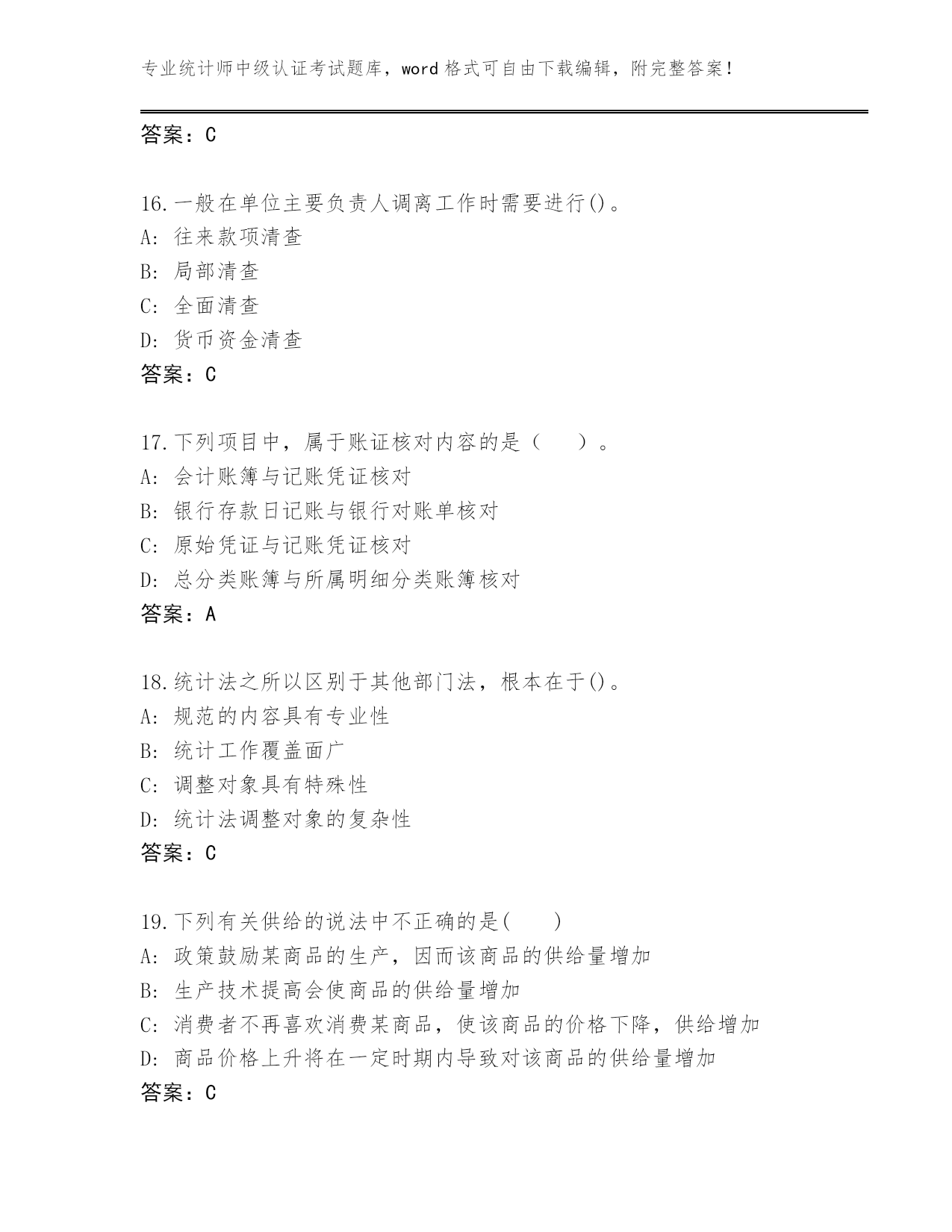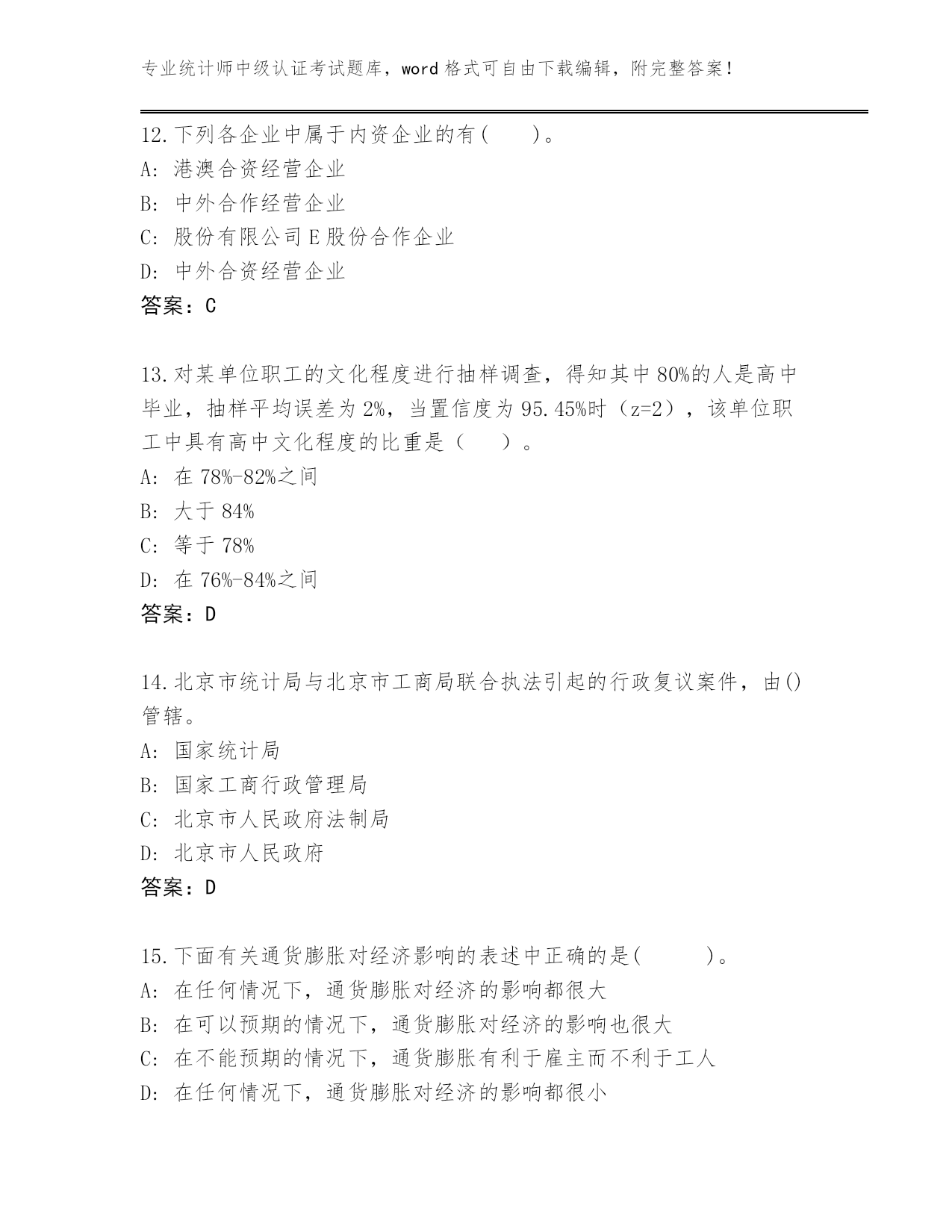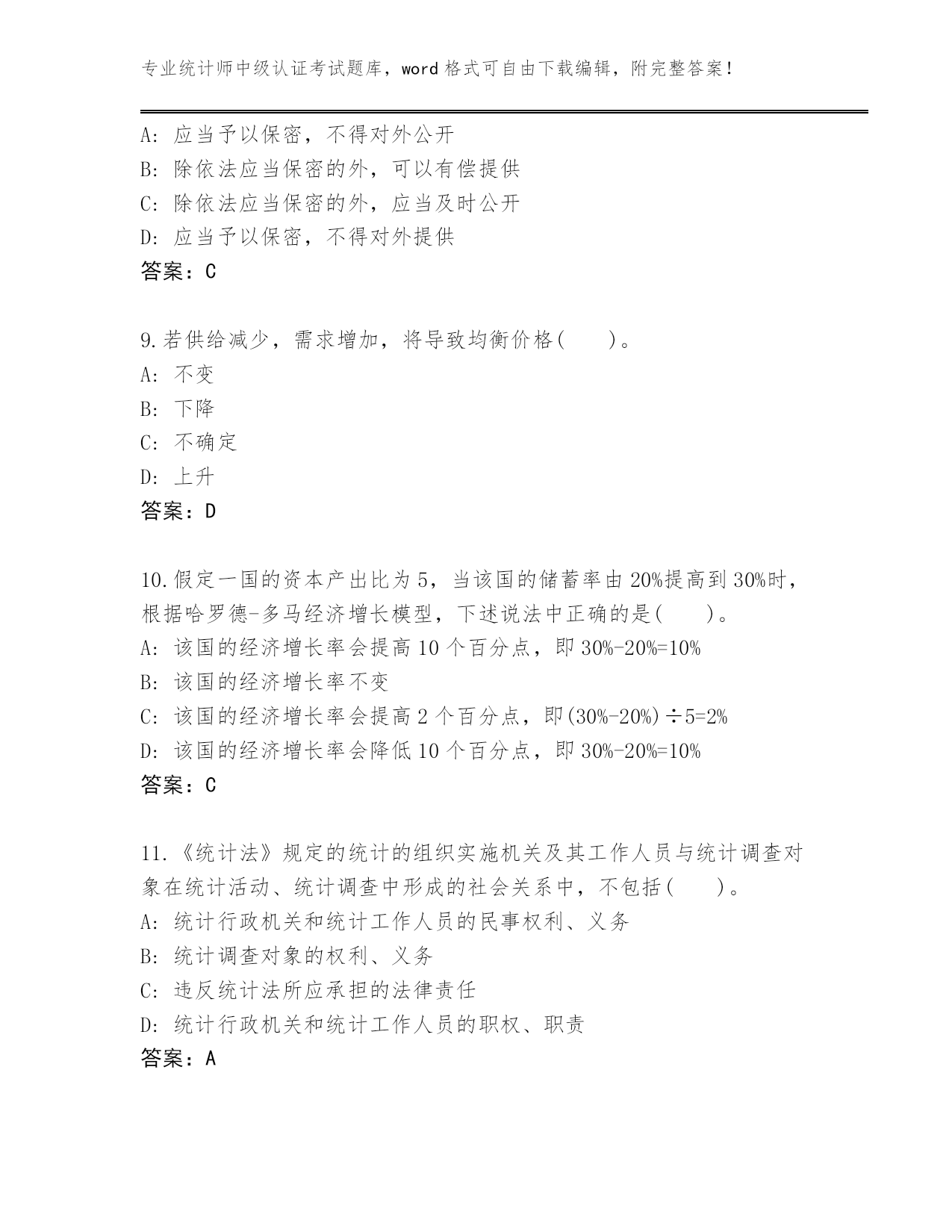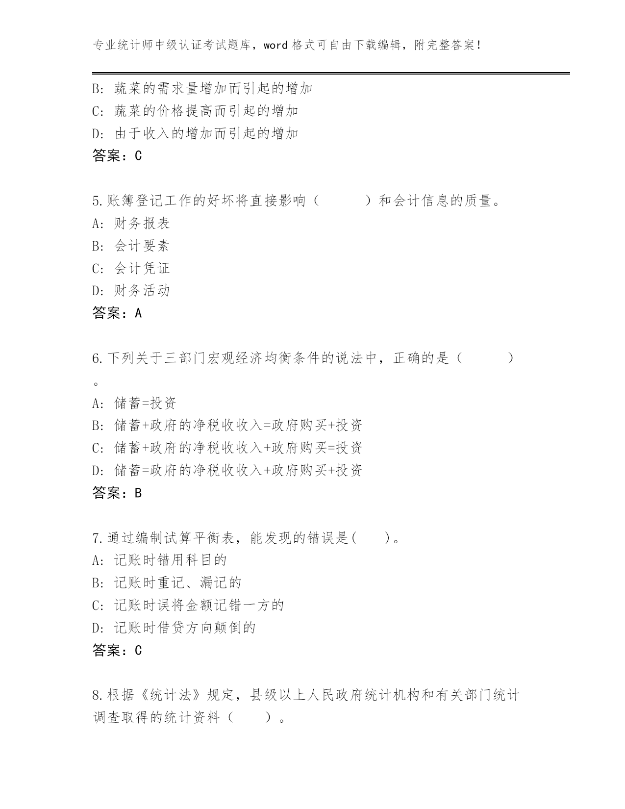 专业统计师中级认证考试题库,word格式可自由下载编辑,附完整答案!广东省潮南区2024年统计师中级认证考试题库(历年真题)第I部分单选题(100题)1.典型的现代会计是()。A:工业会计B:农业会计C:商业会计D:企业会计答案:D2.当供求法则发生作用时,粮食减产将引起()。A:粮食价格下降B:粮食交易量增加C:粮食价格上升D:政府规定个人购买粮食的数量答案:C3.统计人员进行统计调查时,应当出示()颁发的工作证件。A:国家统计局B:县级以上人民政府统计机构或者有关部门C:县级以上地方各级人民政府统计机构D:县级以上人民政府统计机构答案:B4.下列有关蔬菜的供给量增加的原因的叙述中,正确的是()A:人们对蔬菜偏好的增加B:蔬菜的需求量增加而引起的增加C:蔬菜的价格提高而引起的增加D:由于收入的增加而引起的增加答案:C5.账簿登记工作的好坏将直接影响()和会计信息的质量。A:财务报表B:会计要素C:会计凭证D:财务活动答案:A6.下列关于三部门宏观经济均衡条件的说法中,正确的是()。A:储蓄=投资B:储蓄+政府的净税收收入=政府购买+投资C:储蓄+政府的净税收收入+政府购买=投资D:储蓄=政府的净税收收入+政府购买+投资答案:B7.通过编制试算平衡表,能发现的错误是()。A:记账时错用科目的B:记账时重记、漏记的C:记账时误将金额记错一方的D:记账时借贷方向颠倒的答案:C8.根据《统计法》规定,县级以上人民政府统计机构和有关部门统计调查取得的统计资料()。A:应当予以保密,不得对外公开B:除依法应当保密的外,可以有偿提供C:除依法应当保密的外,应当及时公开D:应当予以保密,不得对外提供答案:C9.若供给减少,需求增加,将导致均衡价格()。A:不变B:下降C:不确定D:上升答案:D10.假定一国的资本产出比为5,当该国的储蓄率由20%提高到30%时,根据哈罗德-多马经济增长模型,下述说法中正确的是()。A:该国的经济增长率会提高10个百分点,即30%-20%=10%B:该国的经济增长率不变C:该国的经济增长率会提高2个百分点,即(30%-20%)÷5=2%D:该国的经济增长率会降低10个百分点,即30%-20%=10%答案:C11.《统计法》规定的统计的组织实施机关及其工作人员与统计调查对象在统计活动、统计调查中形成的社会关系中,不包括()。A:统计行政机关和统计工作人员的民事权利、义务B:统计调查对象的权利、义务C:违反统计法所应承担的法律责任D:统计行政机关和统计工作人员的职权、职责答案:A12.下列各企业中属于内资企业的有()。A:港澳合资经营企业B:中外合作经营企业C:股份有限公司E股份合作企业D:中外合资经营企业答案:C13.对某单位职工的文化程度进行抽样调查,得知其中80%的人是高中毕业,抽样平均误差为2%,当置信度为95.45%时(z=2),该单位职工中具有高中文化程度的比重是()。A:在78%-82%之间B:大于84%C:等于78%D:在76%-84%之间答案:D14.北京市统计局与北京市工商局联合执法引起的行政复议案件,由()管辖。A:国家统计局B:国家工商行政管理局C:北京市人民政府法制局D:北京市人民政府答案:D15.下面有关通货膨胀对经济影响的表述中正确的是()。A:在任何情况下,通货膨胀对经济的影响都很大B:在可以预期的情况下,通货膨胀对经济的影响也很大C:在不能预期的情况下,通货膨胀有利于雇主而不利于工人D:在任何情况下,通货膨胀对经济的影响都很小答案:C16.一般在单位主要负责人调离工作时需要进行()。A:往来款项清查B:局部清查C:全面清查D:货币资金清查答案:C17.下列项目中,属于账证核对内容的是()。A:会计账簿与记账凭证核对B:银行存款日记账与银行对账单核对C:原始凭证与记账凭证核对D:总分类账簿与所属明细分类账簿核对答案:A18.统计法之所以区别于其他部门法,根本在于()。A:规范的内容具有专业性B:统计工作覆盖面广C:调整对象具有特殊性D:统计法调整对象的复杂性答案:C19.下列有关供给的说法中不正确的是()A:政策鼓励某商品的生产,因而该商品的供给量增加B:生产技术提高会使商品的供给量增加C:消费者不再喜欢消费某商品,使该商品的价格下降,供给增加D:商品价格上升将在一定时期内导致对该商品的供给量增加答案:C20.从储蓄函数可知,引起储蓄增加的因素是()。A:人们预期未来的价格水平要上升B:政府支出增加C:收入增加D:利率提高答案:C21.市场失灵是指()A:收入分配不平等B:不能产生任何有用成果的市场过程C:以市场为基础的对资源的低效率配置D:在私人部门和公共部门之间资源配哥不均答案:C22.下列各项中不属于制造业范围的是()。A:对农副产品的加工和再加工B:建筑物中的各种制成品零部