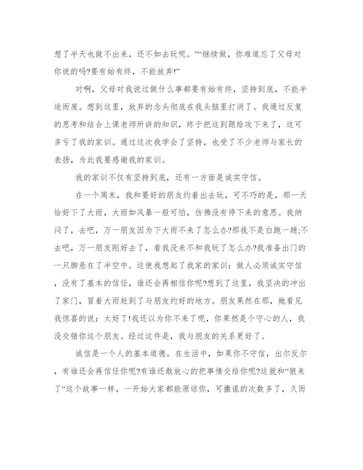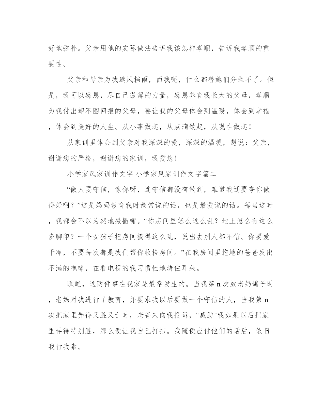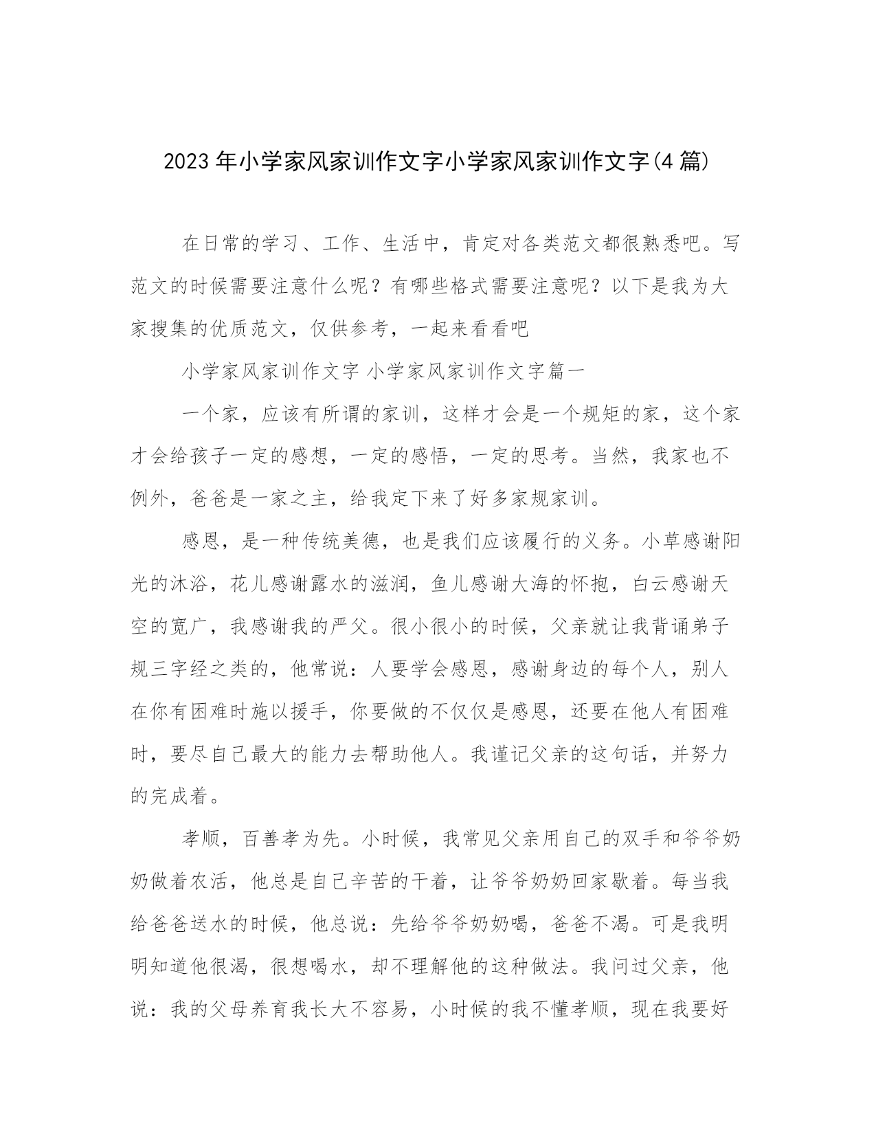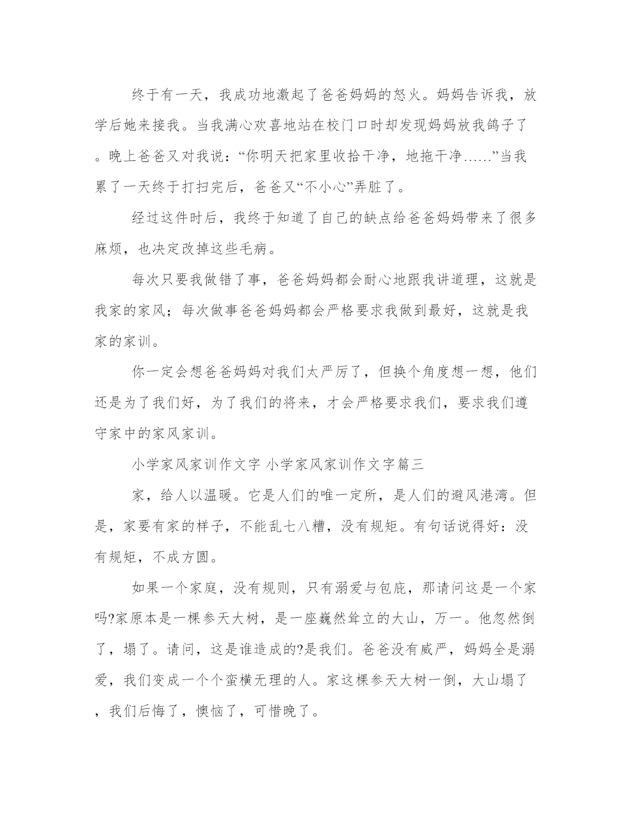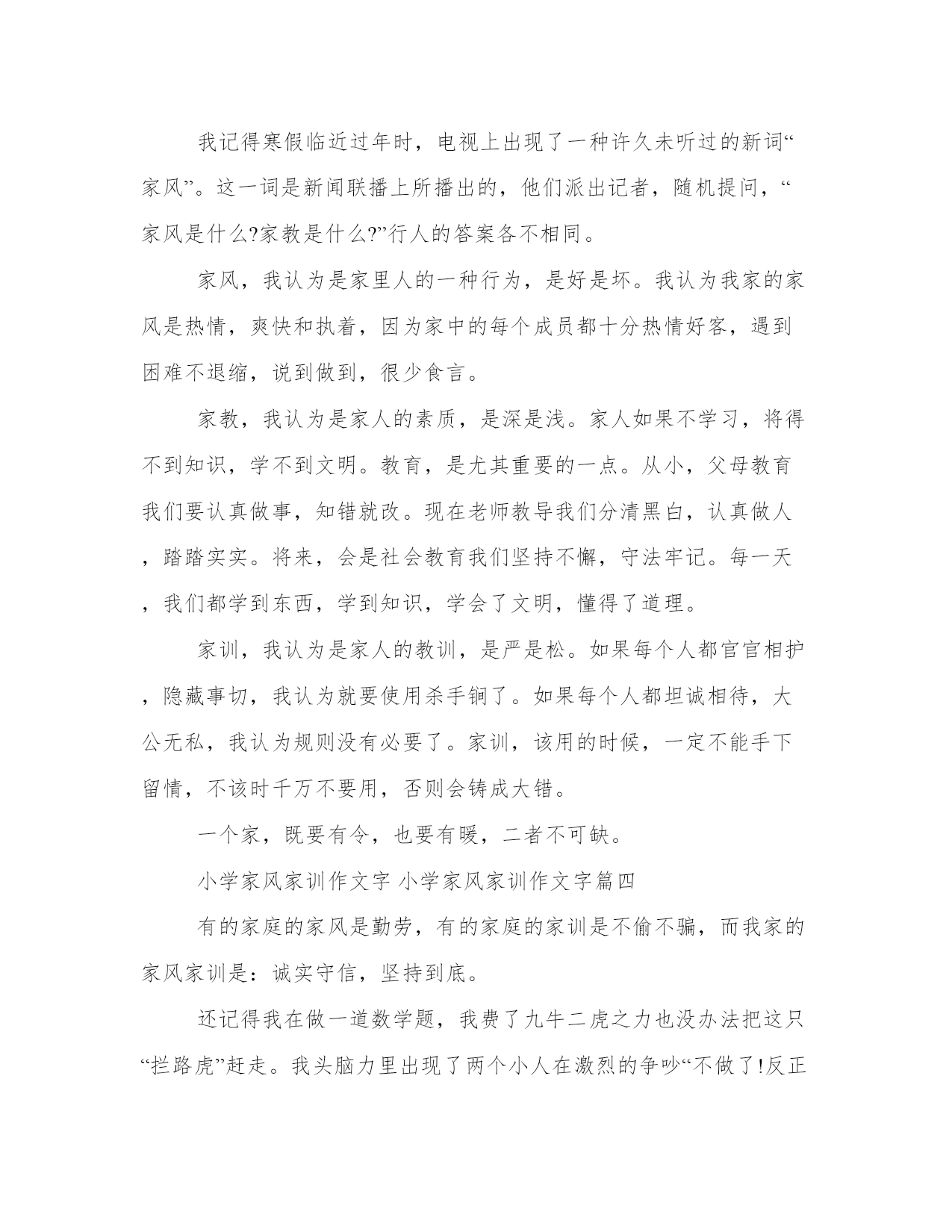 2023年小学家风家训作文字小学家风家训作文字(4篇)在日常的学习、工作、生活中,肯定对各类范文都很熟悉吧。写范文的时候需要注意什么呢?有哪些格式需要注意呢?以下是我为大家搜集的优质范文,仅供参考,一起来看看吧小学家风家训作文字小学家风家训作文字篇一一个家,应该有所谓的家训,这样才会是一个规矩的家,这个家才会给孩子一定的感想,一定的感悟,一定的思考。当然,我家也不例外,爸爸是一家之主,给我定下来了好多家规家训。感恩,是一种传统美德,也是我们应该履行的义务。小草感谢阳光的沐浴,花儿感谢露水的滋润,鱼儿感谢大海的怀抱,白云感谢天空的宽广,我感谢我的严父。很小很小的时候,父亲就让我背诵弟子规三字经之类的,他常说:人要学会感恩,感谢身边的每个人,别人在你有困难时施以援手,你要做的不仅仅是感恩,还要在他人有困难时,要尽自己最大的能力去帮助他人。我谨记父亲的这句话,并努力的完成着。孝顺,百善孝为先。小时候,我常见父亲用自己的双手和爷爷奶奶做着农活,他总是自己辛苦的干着,让爷爷奶奶回家歇着。每当我给爸爸送水的时候,他总说:先给爷爷奶奶喝,爸爸不渴。可是我明明知道他很渴,很想喝水,却不理解他的这种做法。我问过父亲,他说:我的父母养育我长大不容易,小时候的我不懂孝顺,现在我要好好地弥补。父亲用他的实际做法告诉我该怎样孝顺,告诉我孝顺的重要性。父亲和母亲为我遮风挡雨,而我呢,什么都替她们分担不了。但是,我可以感恩,尽自己微薄的力量,感恩养育我长大的父母,孝顺为我付出却不图回报的父母,要让我的父母体会到温暖,体会到幸福,体会到美好的人生。从小事做起,从点滴做起,从现在做起!从家训里体会到父亲对我深深的爱,深深的温暖,想说:父亲,谢谢您的严格,谢谢您的家训,我爱您!小学家风家训作文字小学家风家训作文字篇二“做人要守信,像你呀,连守信都没有做到,难道我还要夸你做得好啊?”这是妈妈教育我时最常说的话,也是最爱说的话。每当这时,我都会不以为然地撇撇嘴。“你房间里怎么这么乱?地上怎么有这么多脚印?一个女孩子把房间搞得这么乱,说出去别人都不信。你要爱干净,不要每次都是我们帮你收拾房间。”在我房间里拖地的爸爸发出不满的咆哮,在看电视的我习惯性地堵住耳朵。瞧瞧,这两件事在我家是最常发生的。当我第n次放老妈鸽子时,老妈对我进行了教育,并要求我以后要做一个守信的人,当我第n次把家里弄得又脏又乱时,老爸来向我投诉,“威胁”我如果以后把家里弄得特别脏,那么便让我自己打扫。我随便应付他们的话后,依旧我行我素。终于有一天,我成功地激起了爸爸妈妈的怒火。妈妈告诉我,放学后她来接我。当我满心欢喜地站在校门口时却发现妈妈放我鸽子了。晚上爸爸又对我说:“你明天把家里收拾干净,地拖干净……”当我累了一天终于打扫完后,爸爸又“不小心”弄脏了。经过这件时后,我终于知道了自己的缺点给爸爸妈妈带来了很多麻烦,也决定改掉这些毛病。每次只要我做错了事,爸爸妈妈都会耐心地跟我讲道理,这就是我家的家风;每次做事爸爸妈妈都会严格要求我做到最好,这就是我家的家训。你一定会想爸爸妈妈对我们太严厉了,但换个角度想一想,他们还是为了我们好,为了我们的将来,才会严格要求我们,要求我们遵守家中的家风家训。小学家风家训作文字小学家风家训作文字篇三家,给人以温暖。它是人们的唯一定所,是人们的避风港湾。但是,家要有家的样子,不能乱七八糟,没有规矩。有句话说得好:没有规矩,不成方圆。如果一个家庭,没有规则,只有溺爱与包庇,那请问这是一个家吗?家原本是一棵参天大树,是一座巍然耸立的大山,万一。他忽然倒了,塌了。请问,这是谁造成的?是我们。爸爸没有威严,妈妈全是溺爱,我们变成一个个蛮横无理的人。家这棵参天大树一倒,大山塌了,我们后悔了,懊恼了,可惜晚了。我记得寒假临近过年时,电视上出现了一种许久未听过的新词“家风”。这一词是新闻联播上所播出的,他们派出记者,随机提问,“家风是什么?家教是什么?”行人的答案各不相同。家风,我认为是家里人的一种行为,是好是坏。我认为我家的家风是热情,爽快和执着,因为家中的每个成员都十分热情好客,遇到困难不退缩,说到做到,很少食言。家教,我认为是家人的素质,是深是浅。家人如果不学习,将得不到知识,学不到文明。教育,是尤其重要的一点。从小,父母教育我们要认真做事,知错就改。现在老师教导我们分清黑白,认真做人,踏踏实实。将来,会是社会教育我们坚持不懈,守法牢记。每一天,我们都学到东西,学到知识,学会了文明,懂得了道理。家训,我认为是家人的教训,是严是松。如果每个人都官官相护,隐藏事切,我认为就要使用杀手锏了。如果每个人都坦诚相待,大公无私,我认为规则没有必要了。家训,该用的时候,一定不能手下留情,不该时千万不要用,否则会铸成大错。一个家,既要有令,也要有暖,二者不可缺。小学家风家训作文字小学家风家训作文