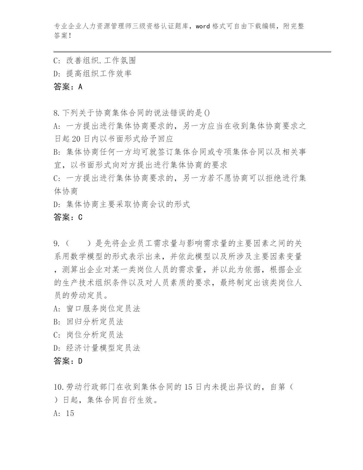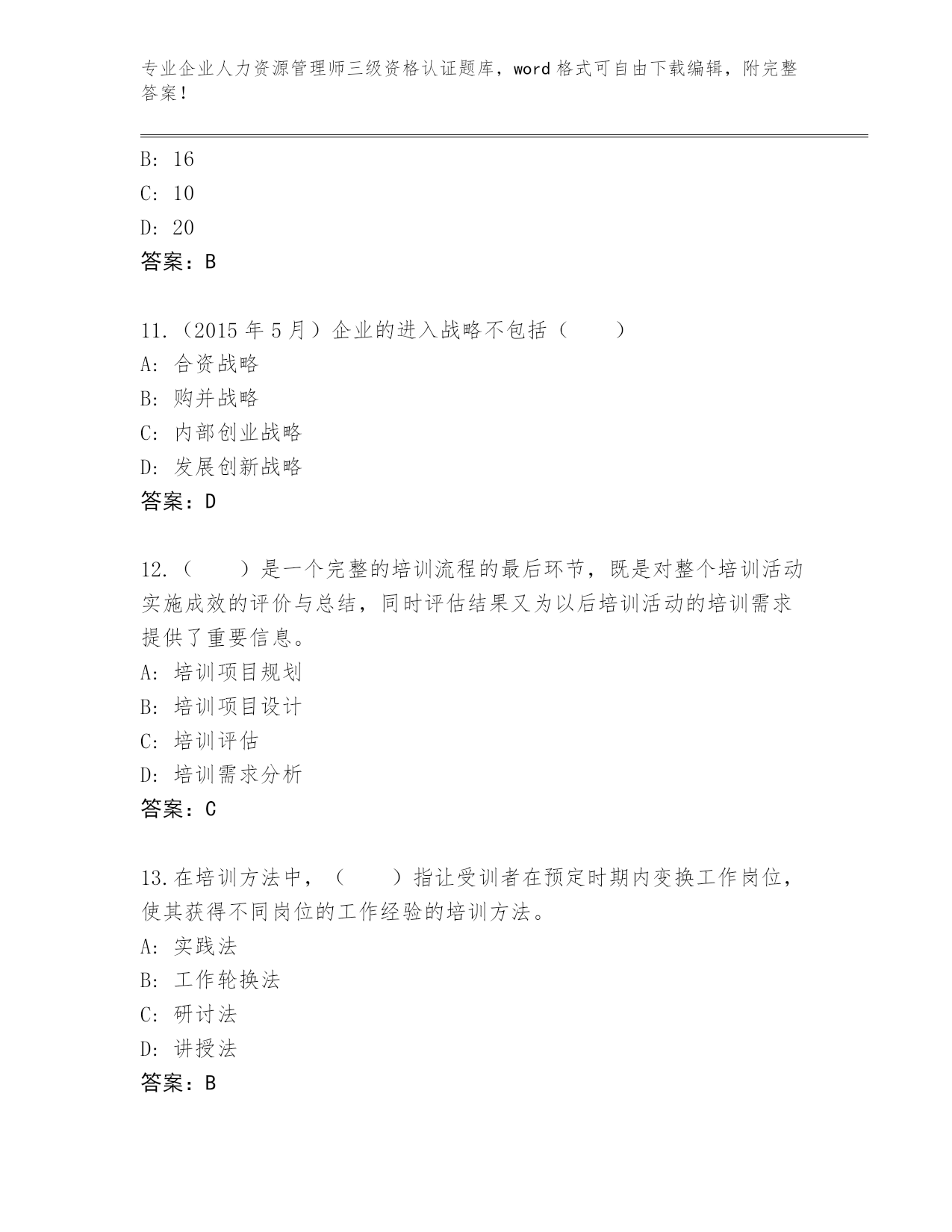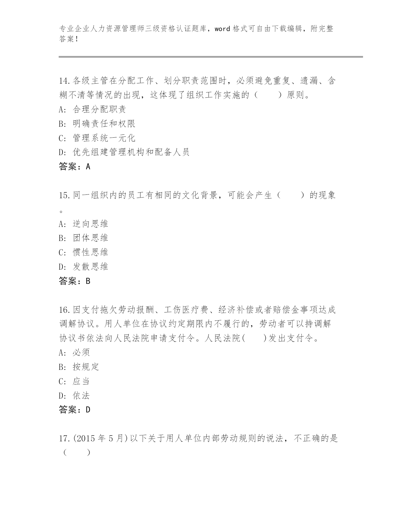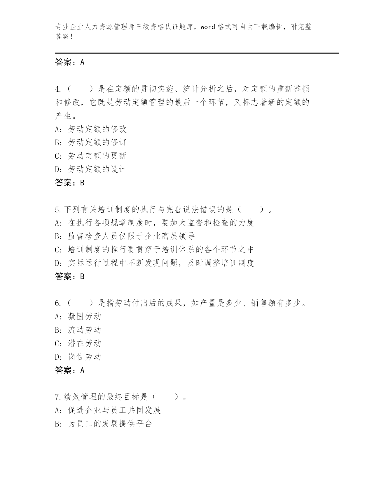 专业企业人力资源管理师三级资格认证题库,word格式可自由下载编辑,附完整答案!历年四川省邻水县企业人力资源管理师三级资格认证王牌题库附答案(B卷)第I部分单选题(100题)1.(2016年5月)通行的薪酬体系类型不包括()。A:绩效薪酬体系B:岗位薪酬体系C:技能薪酬体系D:结构薪酬体系答案:D2.(2017年11月)()是指在绩效管理活动中,根据下属不同阶段的实际表现,主管与下属围绕思想认识、工作程序等方面的问题所进行的面谈。A:绩效总结面谈B:绩效指导面谈C:绩效计划面谈D:绩效考评面谈答案:B3.用人单位在法定标准工作时间以外延长工作时间的,按照不低于劳动合同规定的劳动者本人小时工资标准的()支付劳动报酬。A:150%B:100%C:300%D:200%答案:A4.()是在定额的贯彻实施、统计分析之后,对定额的重新整顿和修改,它既是劳动定额管理的最后一个环节,又标志着新的定额的产生。A:劳动定额的修改B:劳动定额的修订C:劳动定额的更新D:劳动定额的设计答案:B5.下列有关培训制度的执行与完善说法错误的是()。A:在执行各项规章制度时,要加大监督和检查的力度B:监督检查人员仅限于企业高层领导C:培训制度的推行要贯穿于培训体系的各个环节之中D:实际运行过程中不断发现问题,及时调整培训制度答案:B6.()是指劳动付出后的成果,如产量是多少、销售额有多少。A:凝固劳动B:流动劳动C:潜在劳动D:岗位劳动答案:A7.绩效管理的最终目标是()。A:促进企业与员工共同发展B:为员工的发展提供平台C:改善组织.工作氛围D:提高组织工作效率答案:A8.下列关于协商集体合同的说法错误的是()A:一方提出进行集体协商要求的,另一方应当在收到集体协商要求之日起20日内以书面形式给予回应B:集体协商任何一方均可就签订集体合同或专项集体合同以及相关事宜,以书面形式向对方提出进行集体协商的要求C:一方提出进行集体协商要求的,另一方若不愿协商可以拒绝进行集体协商D:集体协商主要采取协商会议的形式答案:C9.()是先将企业员工需求量与影响需求量的主要因素之间的关系用数学模型的形式表示出来,并依此模型以及所涉及主要因素变量,测算出企业对某一类岗位人员的需求量,并以此为依据,根据企业的生产技术组织条件以及对人员素质的要求,最终制定出该类岗位人员的劳动定员。A:窗口服务岗位定员法B:回归分析定员法C:岗位分析定员法D:经济计量模型定员法答案:D10.劳动行政部门在收到集体合同的15日内未提出异议的,自第()日起,集体合同自行生效。A:15B:16C:10D:20答案:B11.(2015年5月)企业的进入战略不包括()A:合资战略B:购并战略C:内部创业战略D:发展创新战略答案:D12.()是一个完整的培训流程的最后环节,既是对整个培训活动实施成效的评价与总结,同时评估结果又为以后培训活动的培训需求提供了重要信息。A:培训项目规划B:培训项目设计C:培训评估D:培训需求分析答案:C13.在培训方法中,()指让受训者在预定时期内变换工作岗位,使其获得不同岗位的工作经验的培训方法。A:实践法B:工作轮换法C:研讨法D:讲授法答案:B14.各级主管在分配工作、划分职责范围时,必须避免重复、遗漏、含糊不清等情况的出现,这体现了组织工作实施的()原则。A:合理分配职责B:明确责任和权限C:管理系统一元化D:优先组建管理机构和配备人员答案:A15.同一组织内的员工有相同的文化背景,可能会产生()的现象。A:逆向思维B:团体思维C:惯性思维D:发散思维答案:B16.因支付拖欠劳动报酬、工伤医疗费、经济补偿或者赔偿金事项达成调解协议。用人单位在协议约定期限内不履行的,劳动者可以持调解协议书依法向人民法院申请支付令。人民法院()发出支付令。A:必须B:按规定C:应当D:依法答案:D17.(2015年5月)以下关于用人单位内部劳动规则的说法,不正确的是()A:是劳动者单方的行为规范B:是以用人单位为主体制定的C:是企业劳动关系调节的重要形式D:是企业规章制度的组成部分答案:A18.头脑风暴法的缺点不包括()。A:对培训顾问要求高B:学员参与性较强C:培训顾问讲授的机会少D:主题的挑选难度大答案:B19.在培训过程中(),是使培训工作取得成功的关键之举。A:讲求授课效果B:调动学员参与的积极性C:做好充分准备D:实现培训课程目标答案:B20.对于当年经济效益严重下降或亏损的企业。在支付员工工资不低于当年本地区最低工资标准的前提下,工资应控制在()不予增加。A:下线B:基准线C:上线D:中位线答案:A21.“经济人”假设的主要内容不包括()。A:人天生懒惰B:人以自我为中心C:人需要精神激励D:人缺乏理性答案:C22.(?)是在一定的生产技术组织条件下,行业或企业规定的劳动定额在数