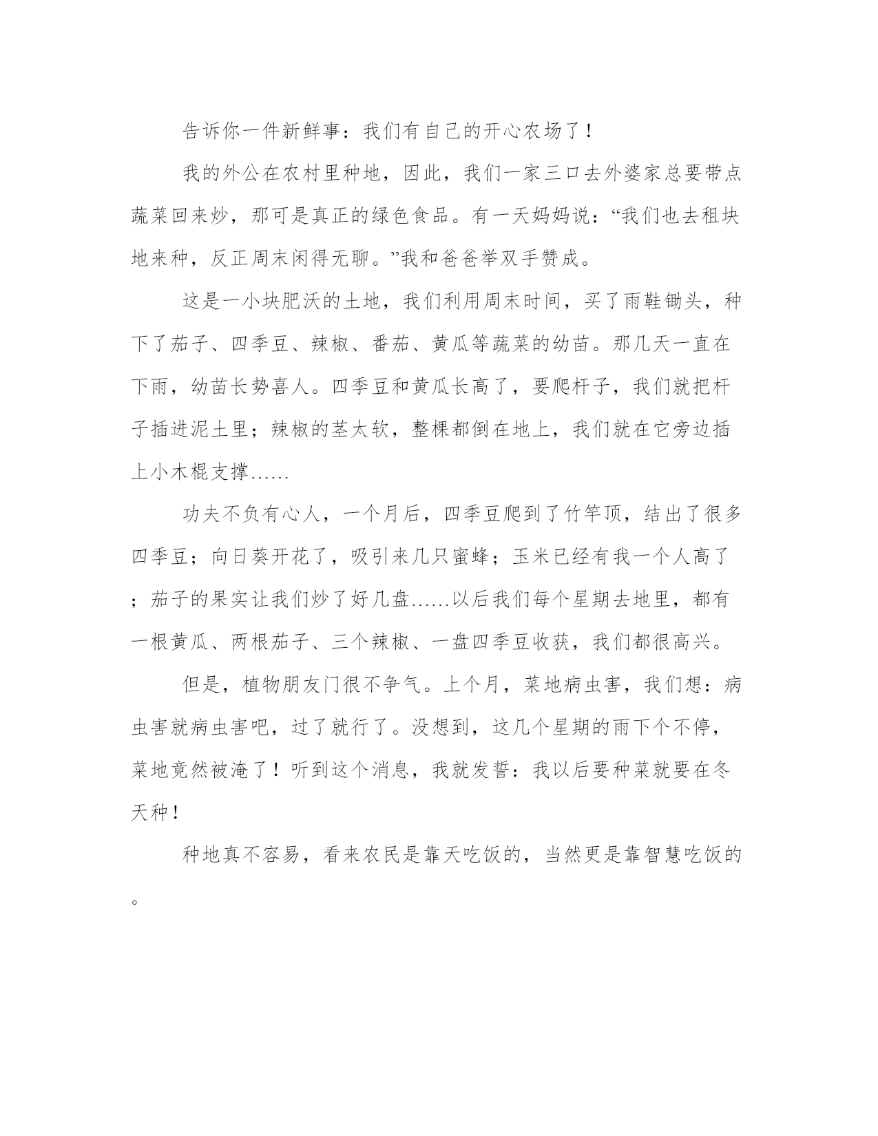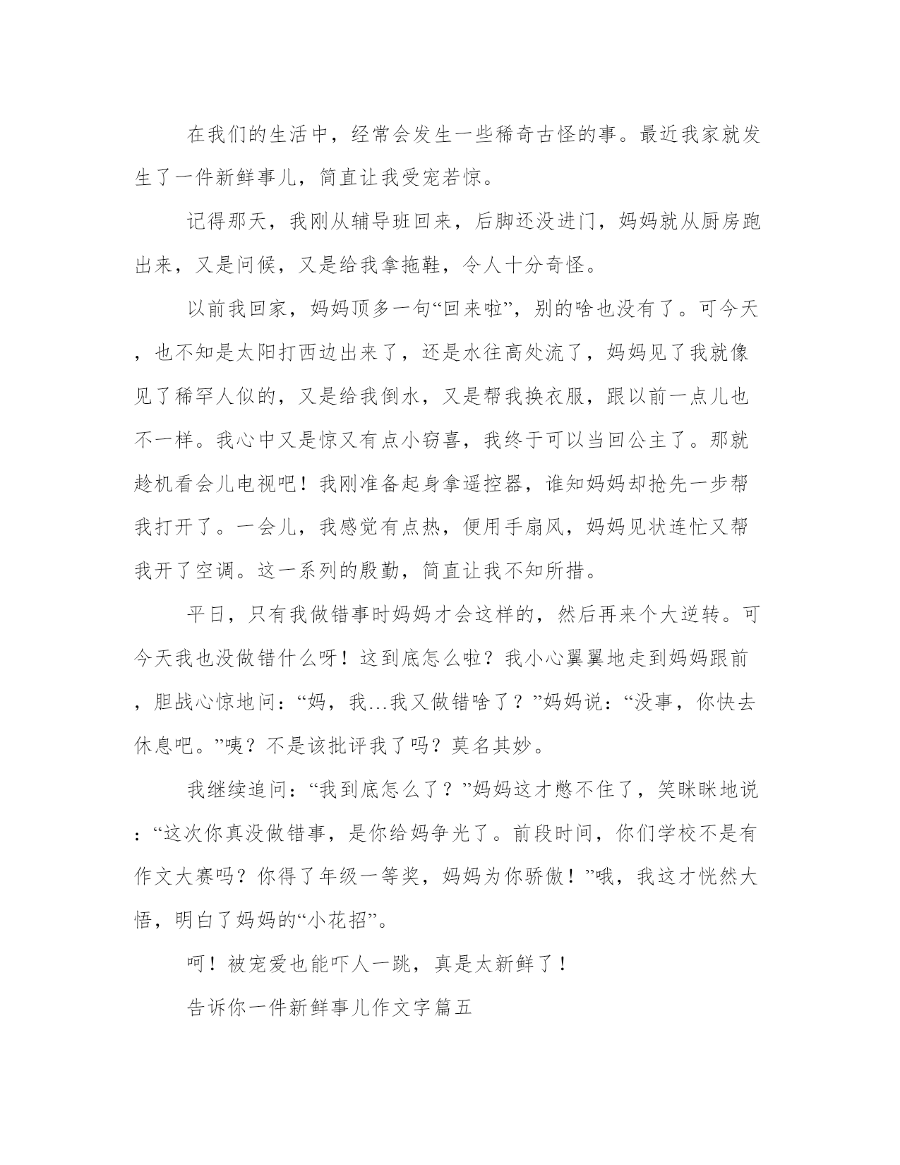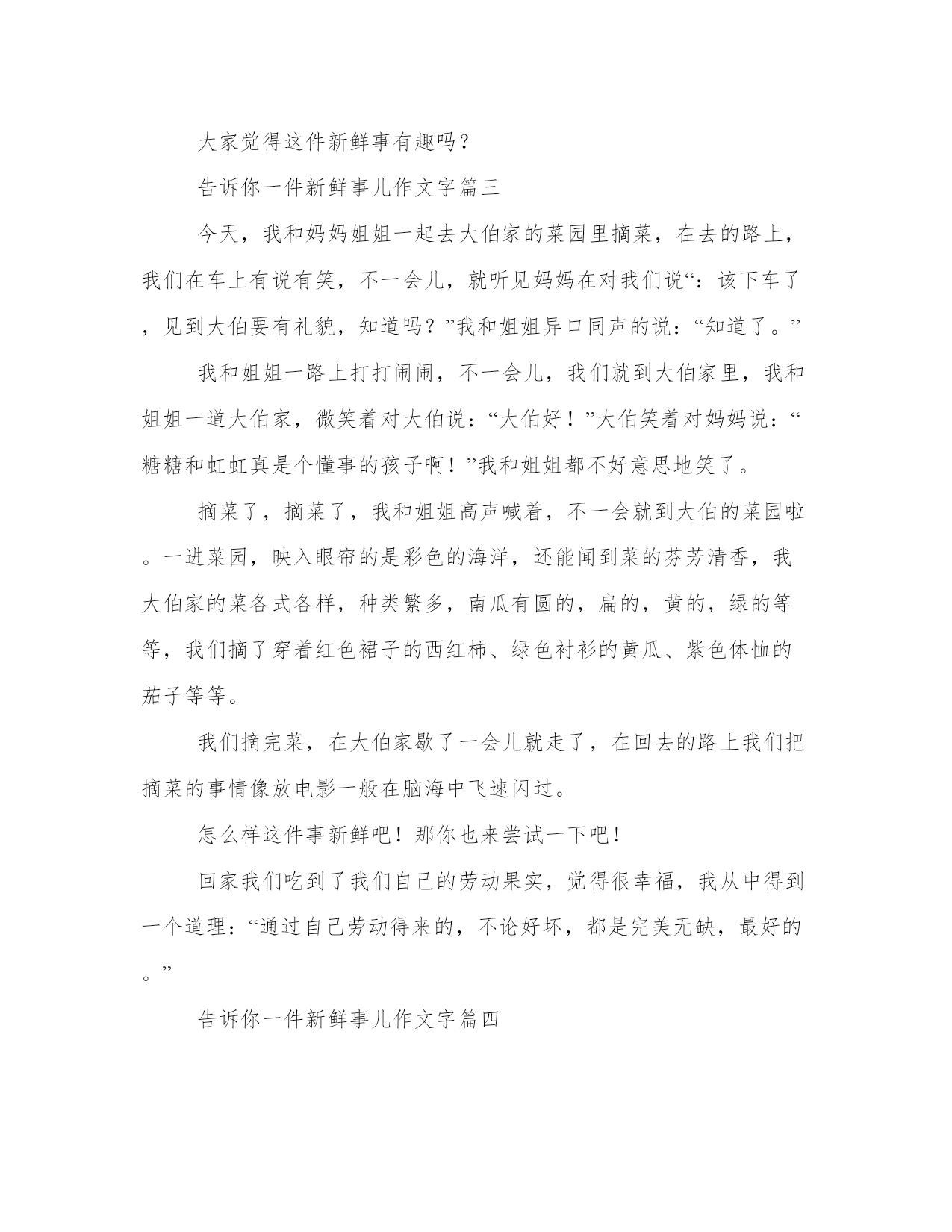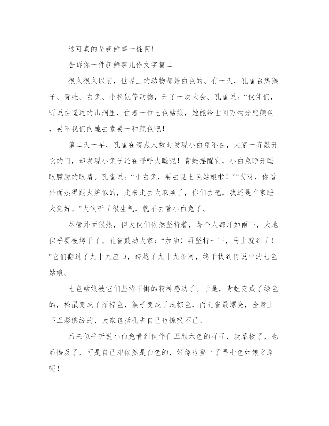 告诉你一件新鲜事儿作文字(精选五篇)在日常的学习、工作、生活中,肯定对各类范文都很熟悉吧。写范文的时候需要注意什么呢?有哪些格式需要注意呢?以下是我为大家搜集的优质范文,仅供参考,一起来看看吧告诉你一件新鲜事儿作文字篇一我和妈妈信步来到了一家面皮店,分别点了一个米线,一个手抓饼。正在这时,一个黄头发的大高个子进来了,我与妈妈都听见了一声熟悉而又生硬的原平话:“来上一‘外’(份)面皮,两‘外’(份)米线哇!”我扭头一看,简直惊呆了:一个黄头发,蓝眼睛,白皮肤的老外!一个外国人竟然会说原平话?我想,他,一定很小就来了,或者他也可能是一个混血儿吧。这个外国人的到来,吸引了所有正在吃饭的人的目光。有的掏出了手机留下照片,有的窃窃私语议论纷纷,人们像看外星人一样直直地盯着眼前这个“奇葩”。倒是“老外”神态自若,坦然如常地继续说着自己标准的“原平话”,偶尔不解地看看大家,好像人们的注视也并没有影响自己的好心情。我想,这个老外是不是早已经习惯了被他身边的“老外”们好奇了呢!这可真的是新鲜事一桩啊!告诉你一件新鲜事儿作文字篇二很久很久以前,世界上的动物都是白色的。有一天,孔雀召集猴子、青蛙、白兔、小松鼠等动物,开了一次大会。孔雀说:“伙伴们,听说在遥远的山洞里,住着一位七色姑娘,她能给世间万物分配颜色,要不我们向她去索要一种颜色吧!第二天一早,孔雀在清点人数时发现小白兔不在,大家一齐敲开它的门,却发现小兔子还在呼呼大睡呢!青蛙摇醒它,小白兔睁开睡眼朦胧的眼睛。孔雀说:“小白兔,要去见七色姑娘啦!”“哎呀,你看外面热得跟火炉似的,走来走去太麻烦了,你们去吧,我还是在家睡大觉好。”大伙听了很生气,就不去管小白兔了。尽管外面很热,但大伙们依然坚持着,每个人都汗如雨下,大地似乎要被烤干了。孔雀鼓励大家:“加油!再坚持一下,马上就到了!”它们翻过了九十九座山,跨越了九十九条河,终于找到传说中的七色姑娘。七色姑娘被它们坚持不懈的精神感动了。于是,青蛙变成了绿色的,松鼠变成了深棕色,猴子变成了浅棕色,而孔雀最漂亮,全身上下五彩缤纷的,大家包括孔雀自己也惊叹不已。后来似乎听说小白兔看到伙伴们五颜六色的样子,羡慕极了,也后悔及了,可是自己却依然是白色的,好像也登上了寻七色姑娘之路呢!大家觉得这件新鲜事有趣吗?告诉你一件新鲜事儿作文字篇三今天,我和妈妈姐姐一起去大伯家的菜园里摘菜,在去的路上,我们在车上有说有笑,不一会儿,就听见妈妈在对我们说“:该下车了,见到大伯要有礼貌,知道吗?”我和姐姐异口同声的说:“知道了。”我和姐姐一路上打打闹闹,不一会儿,我们就到大伯家里,我和姐姐一道大伯家,微笑着对大伯说:“大伯好!”大伯笑着对妈妈说:“糖糖和虹虹真是个懂事的孩子啊!”我和姐姐都不好意思地笑了。摘菜了,摘菜了,我和姐姐高声喊着,不一会就到大伯的菜园啦。一进菜园,映入眼帘的是彩色的海洋,还能闻到菜的芬芳清香,我大伯家的菜各式各样,种类繁多,南瓜有圆的,扁的,黄的,绿的等等,我们摘了穿着红色裙子的西红柿、绿色衬衫的黄瓜、紫色体恤的茄子等等。我们摘完菜,在大伯家歇了一会儿就走了,在回去的路上我们把摘菜的事情像放电影一般在脑海中飞速闪过。怎么样这件事新鲜吧!那你也来尝试一下吧!回家我们吃到了我们自己的劳动果实,觉得很幸福,我从中得到一个道理:“通过自己劳动得来的,不论好坏,都是完美无缺,最好的。”告诉你一件新鲜事儿作文字篇四在我们的生活中,经常会发生一些稀奇古怪的事。最近我家就发生了一件新鲜事儿,简直让我受宠若惊。记得那天,我刚从辅导班回来,后脚还没进门,妈妈就从厨房跑出来,又是问候,又是给我拿拖鞋,令人十分奇怪。以前我回家,妈妈顶多一句“回来啦”,别的啥也没有了。可今天,也不知是太阳打西边出来了,还是水往高处流了,妈妈见了我就像见了稀罕人似的,又是给我倒水,又是帮我换衣服,跟以前一点儿也不一样。我心中又是惊又有点小窃喜,我终于可以当回公主了。那就趁机看会儿电视吧!我刚准备起身拿遥控器,谁知妈妈却抢先一步帮我打开了。一会儿,我感觉有点热,便用手扇风,妈妈见状连忙又帮我开了空调。这一系列的殷勤,简直让我不知所措。平日,只有我做错事时妈妈才会这样的,然后再来个大逆转。可今天我也没做错什么呀!这到底怎么啦?我小心翼翼地走到妈妈跟前,胆战心惊地问:“妈,我…我又做错啥了?”妈妈说:“没事,你快去休息吧。”咦?不是该批评我了吗?莫名其妙。我继续追问:“我到底怎么了?”妈妈这才憋不住了,笑眯眯地说:“这次你真没做错事,是你给妈争光了。前段时间,你们学校不是有作文大赛吗?你得了年级一等奖,妈妈为你骄傲!”哦,我这才恍然大悟,明白了妈妈的“小花招”。呵!被宠爱也能吓人一跳,真是太新鲜了!告诉你一件新鲜事儿作文字篇五告诉你一件新鲜事:我们有自己的开心农场了!我的外公在农村里种地,因此,我们一