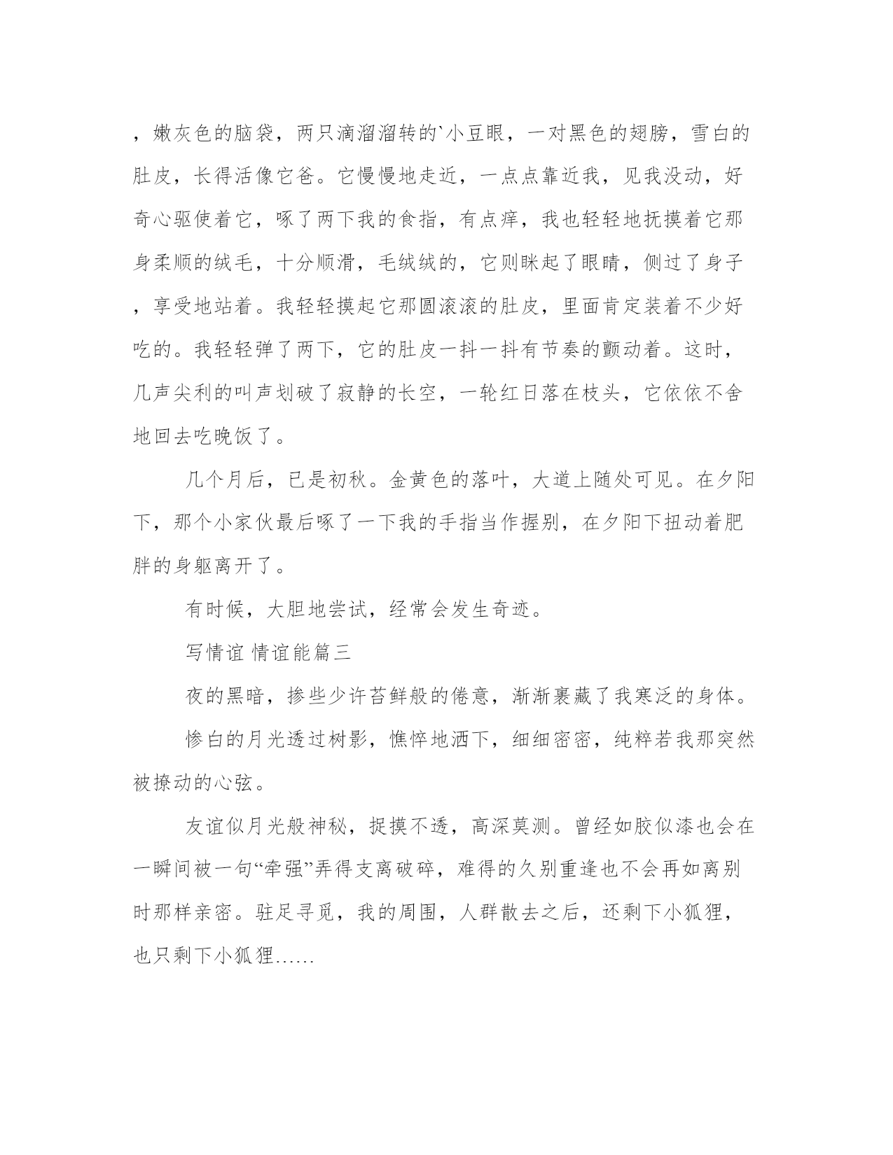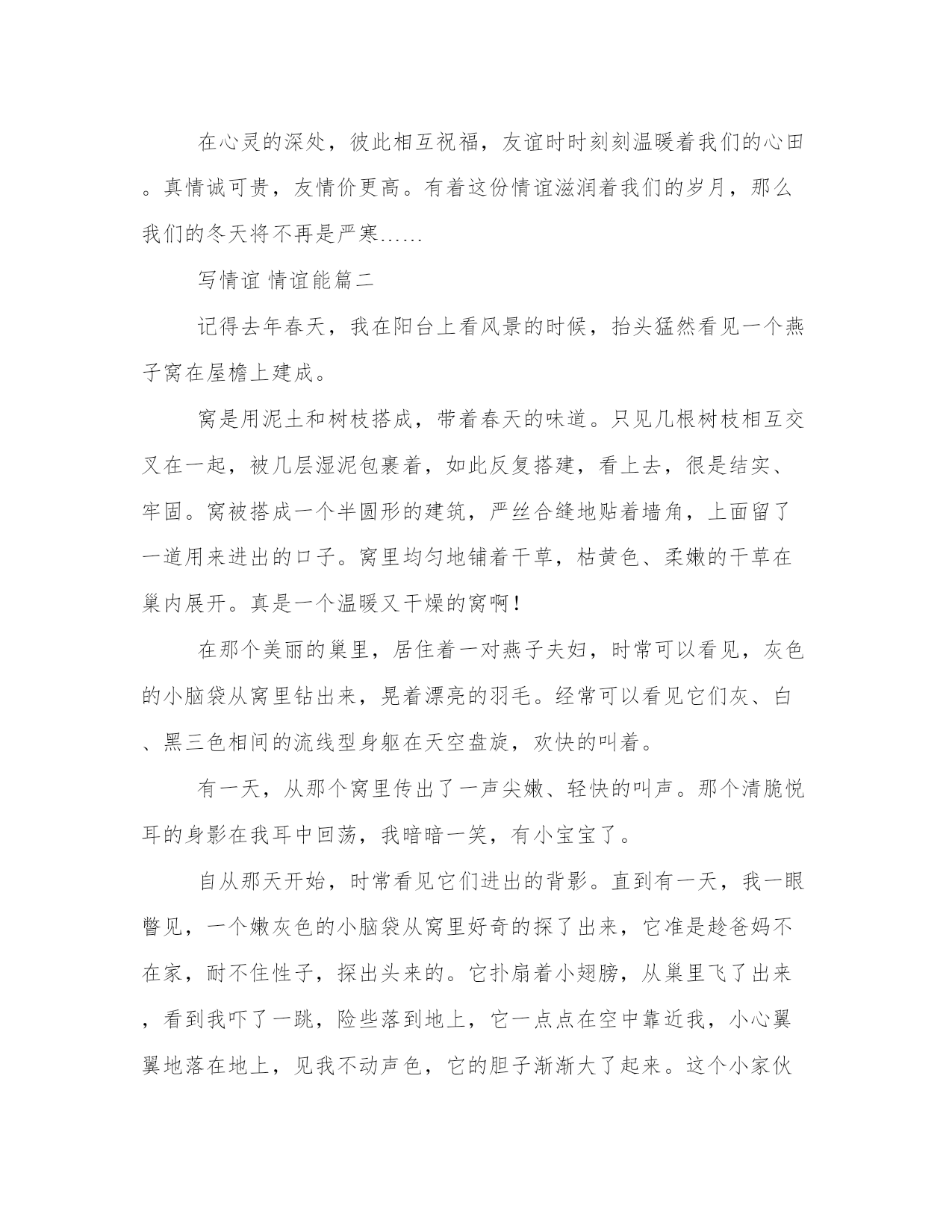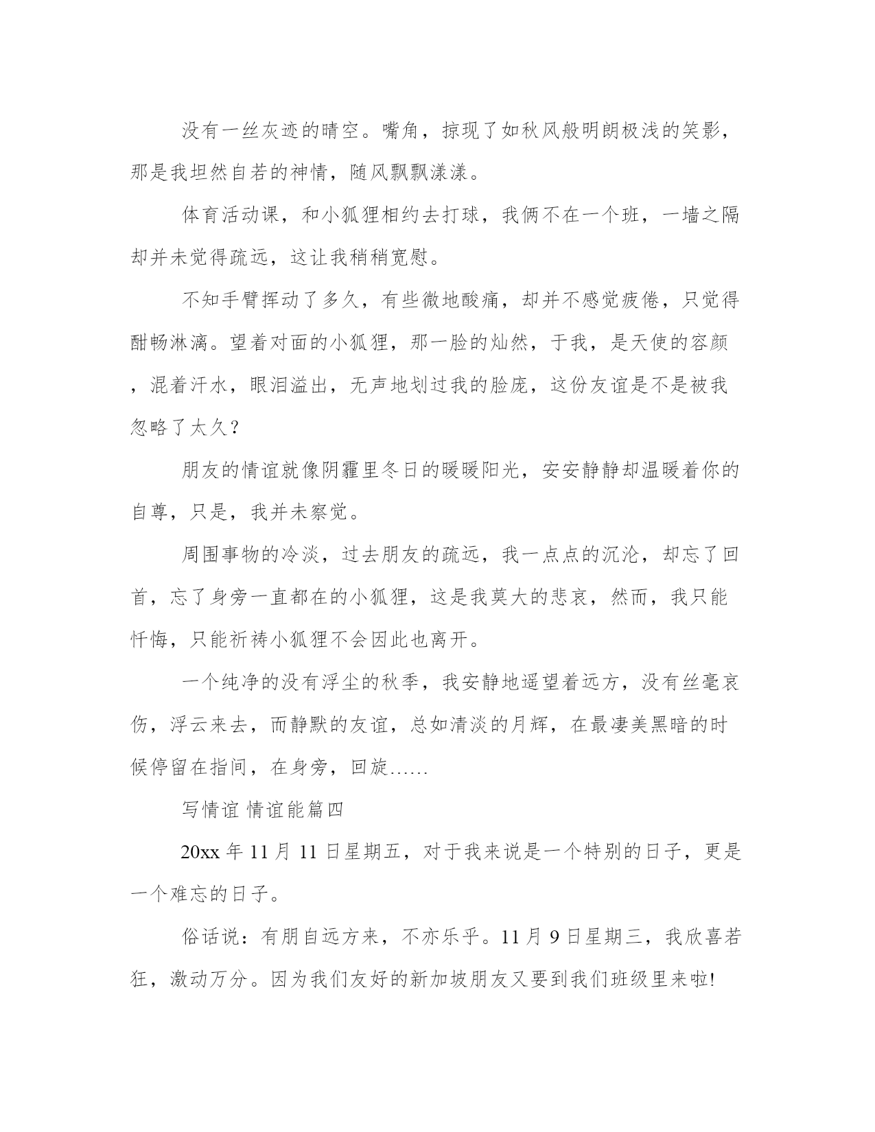 2023年写情谊情谊能汇总(36篇)人的记忆力会随着岁月的流逝而衰退,写作可以弥补记忆的不足,将曾经的人生经历和感悟记录下来,也便于保存一份美好的回忆。那么我们该如何写一篇较为完美的范文呢?接下来小编就给大家介绍一下优秀的范文该怎么写,我们一起来看一看吧。写情谊情谊能篇一它是一座架起情感的桥梁,使你我勾通,心心相映,成为挚友。它是什么?它是我生命中的一部分。炎炎夏日,友谊便似一杯清新透凉的冰红茶,滋润着你我干渴的喉咙。秋风瑟瑟,友谊就如随风而落的佳叶,构成了金秋时节的一道亮丽的风景线。寒冬腊月,友谊就是一朵朵迎雪而立的梅花,绽放开来,温暖着你我的心田。友谊是心中深深的眷恋,友谊是跟友人相连的一根心弦,缠绵不断,渊源流长,谱写出一首首幽长而又耐人寻味的高歌。相离,带来的是无尽的思念,然而它却是友情的升华。深深的眷恋、日日的思念化作一句句真诚的祝福带到了远方,带给了远处的你。在心灵的深处,彼此相互祝福,友谊时时刻刻温暖着我们的心田。真情诚可贵,友情价更高。有着这份情谊滋润着我们的岁月,那么我们的冬天将不再是严寒……写情谊情谊能篇二记得去年春天,我在阳台上看风景的时候,抬头猛然看见一个燕子窝在屋檐上建成。窝是用泥土和树枝搭成,带着春天的味道。只见几根树枝相互交叉在一起,被几层湿泥包裹着,如此反复搭建,看上去,很是结实、牢固。窝被搭成一个半圆形的建筑,严丝合缝地贴着墙角,上面留了一道用来进出的口子。窝里均匀地铺着干草,枯黄色、柔嫩的干草在巢内展开。真是一个温暖又干燥的窝啊!在那个美丽的巢里,居住着一对燕子夫妇,时常可以看见,灰色的小脑袋从窝里钻出来,晃着漂亮的羽毛。经常可以看见它们灰、白、黑三色相间的流线型身躯在天空盘旋,欢快的叫着。有一天,从那个窝里传出了一声尖嫩、轻快的叫声。那个清脆悦耳的身影在我耳中回荡,我暗暗一笑,有小宝宝了。自从那天开始,时常看见它们进出的背影。直到有一天,我一眼瞥见,一个嫩灰色的小脑袋从窝里好奇的探了出来,它准是趁爸妈不在家,耐不住性子,探出头来的。它扑扇着小翅膀,从巢里飞了出来,看到我吓了一跳,险些落到地上,它一点点在空中靠近我,小心翼翼地落在地上,见我不动声色,它的胆子渐渐大了起来。这个小家伙,嫩灰色的脑袋,两只滴溜溜转的`小豆眼,一对黑色的翅膀,雪白的肚皮,长得活像它爸。它慢慢地走近,一点点靠近我,见我没动,好奇心驱使着它,啄了两下我的食指,有点痒,我也轻轻地抚摸着它那身柔顺的绒毛,十分顺滑,毛绒绒的,它则眯起了眼睛,侧过了身子,享受地站着。我轻轻摸起它那圆滚滚的肚皮,里面肯定装着不少好吃的。我轻轻弹了两下,它的肚皮一抖一抖有节奏的颤动着。这时,几声尖利的叫声划破了寂静的长空,一轮红日落在枝头,它依依不舍地回去吃晚饭了。几个月后,已是初秋。金黄色的落叶,大道上随处可见。在夕阳下,那个小家伙最后啄了一下我的手指当作握别,在夕阳下扭动着肥胖的身躯离开了。有时候,大胆地尝试,经常会发生奇迹。写情谊情谊能篇三夜的黑暗,掺些少许苔鲜般的倦意,渐渐裹藏了我寒泛的身体。惨白的月光透过树影,憔悴地洒下,细细密密,纯粹若我那突然被撩动的心弦。友谊似月光般神秘,捉摸不透,高深莫测。曾经如胶似漆也会在一瞬间被一句“牵强”弄得支离破碎,难得的久别重逢也不会再如离别时那样亲密。驻足寻觅,我的周围,人群散去之后,还剩下小狐狸,也只剩下小狐狸……没有一丝灰迹的晴空。嘴角,掠现了如秋风般明朗极浅的笑影,那是我坦然自若的神情,随风飘飘漾漾。体育活动课,和小狐狸相约去打球,我俩不在一个班,一墙之隔却并未觉得疏远,这让我稍稍宽慰。不知手臂挥动了多久,有些微地酸痛,却并不感觉疲倦,只觉得酣畅淋漓。望着对面的小狐狸,那一脸的灿然,于我,是天使的容颜,混着汗水,眼泪溢出,无声地划过我的脸庞,这份友谊是不是被我忽略了太久?朋友的情谊就像阴霾里冬日的暖暖阳光,安安静静却温暖着你的自尊,只是,我并未察觉。周围事物的冷淡,过去朋友的疏远,我一点点的沉沦,却忘了回首,忘了身旁一直都在的小狐狸,这是我莫大的悲哀,然而,我只能忏悔,只能祈祷小狐狸不会因此也离开。一个纯净的没有浮尘的秋季,我安静地遥望着远方,没有丝毫哀伤,浮云来去,而静默的友谊,总如清淡的月辉,在最凄美黑暗的时候停留在指间,在身旁,回旋……写情谊情谊能篇四20xx年11月11日星期五,对于我来说是一个特别的日子,更是一个难忘的日子。俗话说:有朋自远方来,不亦乐乎。11月9日星期三,我欣喜若狂,激动万分。因为我们友好的新加坡朋友又要到我们班级里来啦!还记得上一次,新加坡好友来时,我们上四年级,跟朋友交谈时总有些害羞。这次我想,我们再也不会害羞了,因为我们已经有了宝贵的经验了。11月9日也就是第一天,我们分别拥有了自己的新加坡朋友。我的好友和我差不多高,比我稍稍胖一些,她带了一副黑色的眼睛,背了一