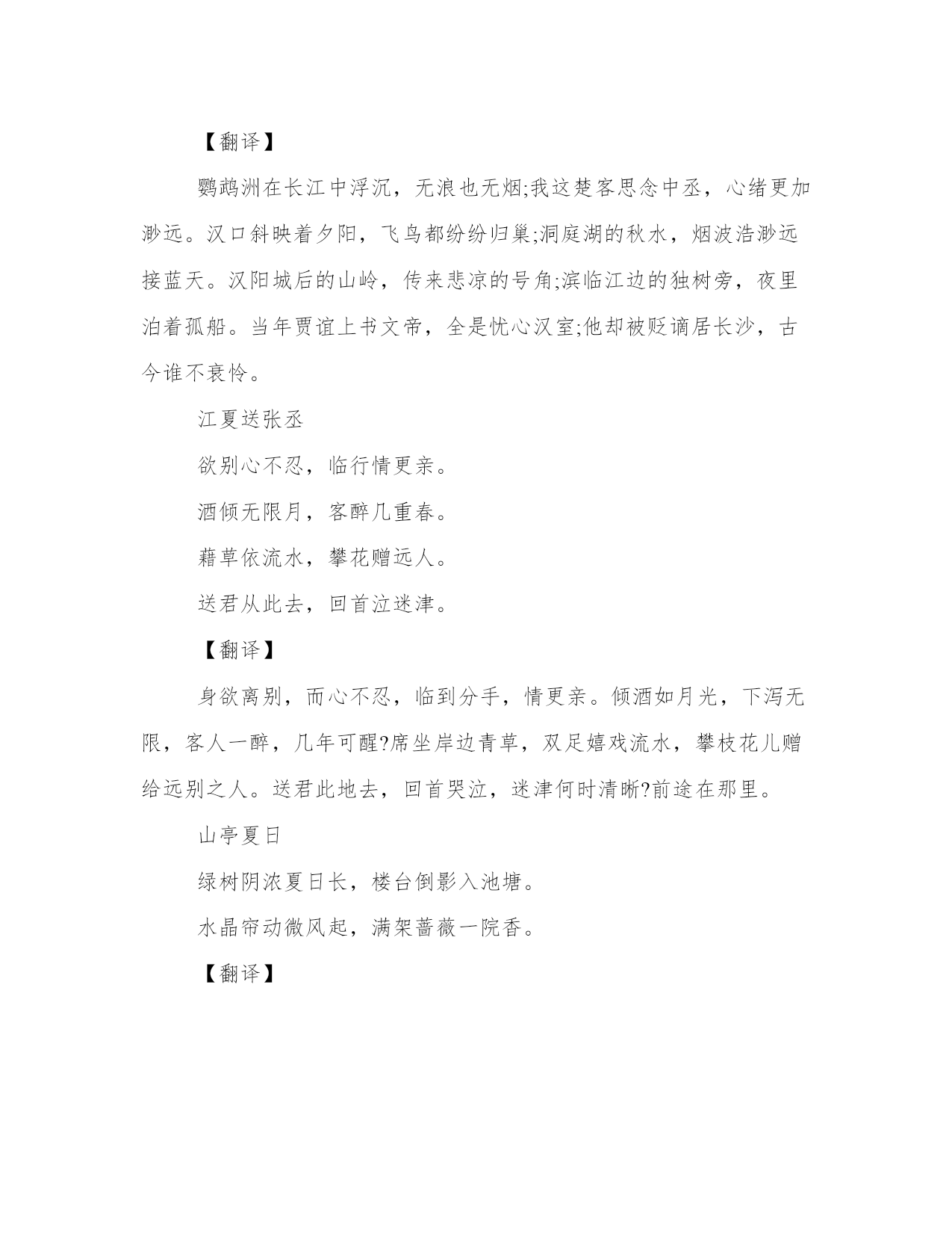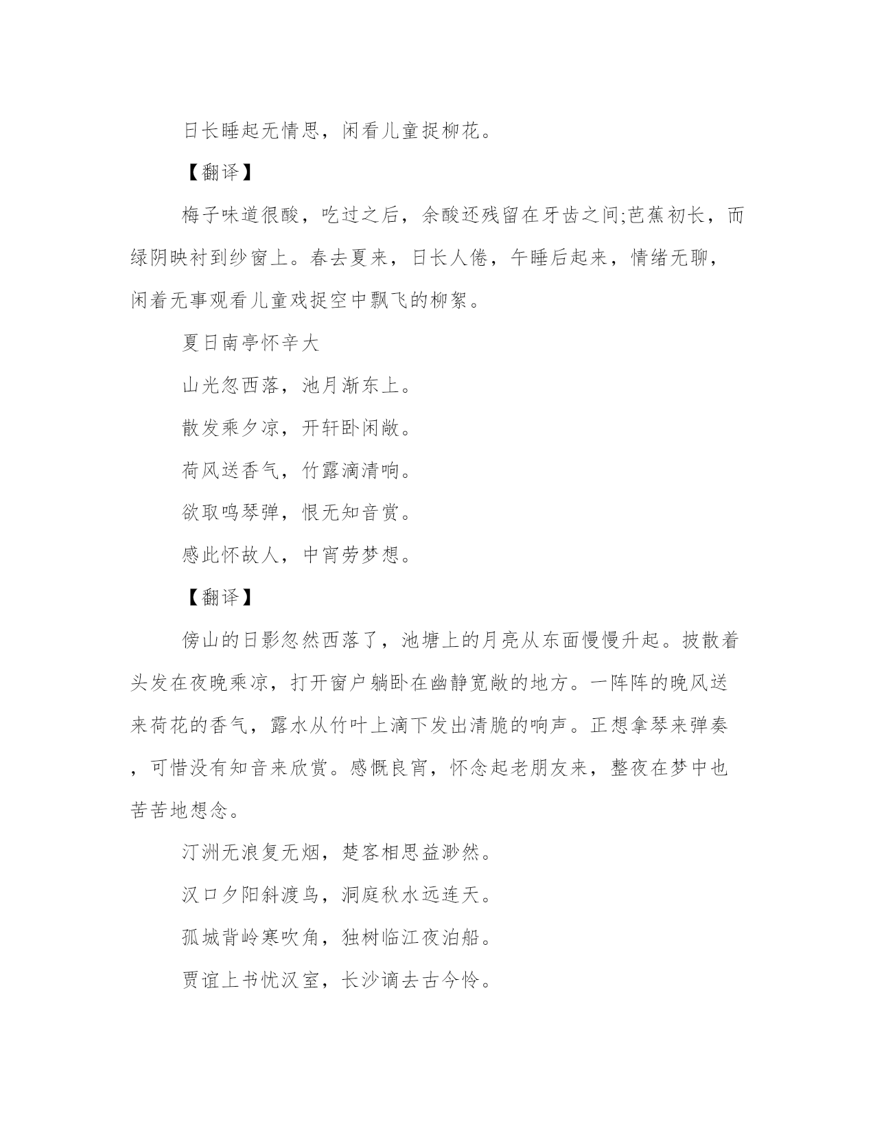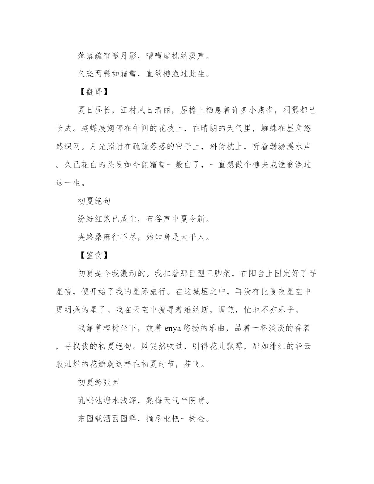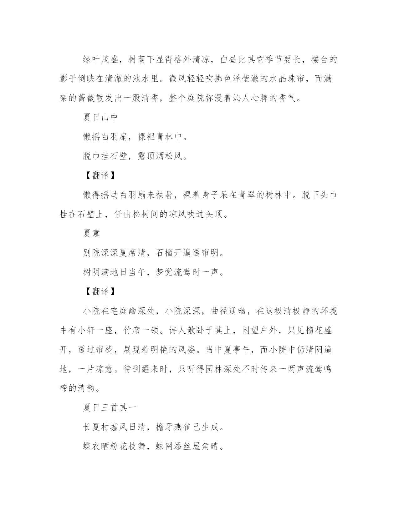 夏作文字夏作文(六篇)在日常学习、工作或生活中,大家总少不了接触作文或者范文吧,通过文章可以把我们那些零零散散的思想,聚集在一块。相信许多人会觉得范文很难写?这里我整理了一些优秀的范文,希望对大家有所帮助,下面我们就来了解一下吧。夏字篇一夏日的绿,在天地间挥毫泼墨,在蓝天白云下,描绘着一幅幅多彩多姿的画卷。夏日绝句生当作人杰,死亦为鬼雄。至今思项羽,不肯过江东。【翻译】人活在这个世界上,就应该做人中的豪杰!即使是已经死了,也应该成为鬼中的英雄!我至今还在怀念楚汉争雄时的项羽,即便是自刎于乌江,也不逃离江东的场景。夏日绝句不但春妍夏亦佳,随缘花草是生涯。鹿葱解插纤长柄,金凤仍开最小花。闲居初夏午睡起梅子留酸软齿牙,芭蕉分绿与窗纱。日长睡起无情思,闲看儿童捉柳花。【翻译】梅子味道很酸,吃过之后,余酸还残留在牙齿之间;芭蕉初长,而绿阴映衬到纱窗上。春去夏来,日长人倦,午睡后起来,情绪无聊,闲着无事观看儿童戏捉空中飘飞的柳絮。夏日南亭怀辛大山光忽西落,池月渐东上。散发乘夕凉,开轩卧闲敞。荷风送香气,竹露滴清响。欲取鸣琴弹,恨无知音赏。感此怀故人,中宵劳梦想。【翻译】傍山的日影忽然西落了,池塘上的月亮从东面慢慢升起。披散着头发在夜晚乘凉,打开窗户躺卧在幽静宽敞的地方。一阵阵的晚风送来荷花的香气,露水从竹叶上滴下发出清脆的响声。正想拿琴来弹奏,可惜没有知音来欣赏。感慨良宵,怀念起老朋友来,整夜在梦中也苦苦地想念。汀洲无浪复无烟,楚客相思益渺然。汉口夕阳斜渡鸟,洞庭秋水远连天。孤城背岭寒吹角,独树临江夜泊船。贾谊上书忧汉室,长沙谪去古今怜。【翻译】鹦鹉洲在长江中浮沉,无浪也无烟;我这楚客思念中丞,心绪更加渺远。汉口斜映着夕阳,飞鸟都纷纷归巢;洞庭湖的秋水,烟波浩渺远接蓝天。汉阳城后的山岭,传来悲凉的号角;滨临江边的独树旁,夜里泊着孤船。当年贾谊上书文帝,全是忧心汉室;他却被贬谪居长沙,古今谁不衰怜。江夏送张丞欲别心不忍,临行情更亲。酒倾无限月,客醉几重春。藉草依流水,攀花赠远人。送君从此去,回首泣迷津。【翻译】身欲离别,而心不忍,临到分手,情更亲。倾酒如月光,下泻无限,客人一醉,几年可醒?席坐岸边青草,双足嬉戏流水,攀枝花儿赠给远别之人。送君此地去,回首哭泣,迷津何时清晰?前途在那里。山亭夏日绿树阴浓夏日长,楼台倒影入池塘。水晶帘动微风起,满架蔷薇一院香。【翻译】绿叶茂盛,树荫下显得格外清凉,白昼比其它季节要长,楼台的影子倒映在清澈的池水里。微风轻轻吹拂色泽莹澈的水晶珠帘,而满架的蔷薇散发出一股清香,整个庭院弥漫着沁人心脾的香气。夏日山中懒摇白羽扇,裸袒青林中。脱巾挂石壁,露顶洒松风。【翻译】懒得摇动白羽扇来祛暑,裸着身子呆在青翠的树林中。脱下头巾挂在石壁上,任由松树间的凉风吹过头顶。夏意别院深深夏席清,石榴开遍透帘明。树阴满地日当午,梦觉流莺时一声。【翻译】小院在宅庭幽深处,小院深深,曲径通幽,在这极清极静的环境中有小轩一座,竹席一领。诗人欹卧于其上,闲望户外,只见榴花盛开,透过帘栊,展现着明艳的风姿。当中夏亭午,而小院中仍清阴遍地,一片凉意。待到醒来时,只听得园林深处不时传来一两声流莺鸣啼的清韵。夏日三首其一长夏村墟风日清,檐牙燕雀已生成。蝶衣晒粉花枝舞,蛛网添丝屋角晴。落落疏帘邀月影,嘈嘈虚枕纳溪声。久斑两鬓如霜雪,直欲樵渔过此生。【翻译】夏日昼长,江村风日清丽,屋檐上栖息着许多小燕雀,羽翼都已长成。蝴蝶展翅停在午间的花枝上,在晴朗的天气里,蜘蛛在屋角悠然织网。月光照射在疏疏落落的帘子上,斜倚枕上,听着潺潺溪水声。久已花白的头发如今像霜雪一般白了,一直想做个樵夫或渔翁混过这一生。初夏绝句纷纷红紫已成尘,布谷声中夏令新。夹路桑麻行不尽,始知身是太平人。【鉴赏】初夏是令我激动的。我扛着那巨型三脚架,在阳台上固定好了寻星镜,便开始了我的星际旅行。在这城垣之中,再没有比夏夜星空中更明亮的星了。我在天空中搜寻着维纳斯,调焦,忙地不亦乐乎。我靠着榕树坐下,放着enya悠扬的乐曲,品着一杯淡淡的香茗,寻找我的初夏绝句。风促然吹过,引得花儿飘零,那如绯红的轻云般灿烂的花瓣就这样在初夏时节,芬飞。初夏游张园乳鸭池塘水浅深,熟梅天气半阴晴。东园载酒西园醉,摘尽枇杷一树金。【翻译】小鸭在池塘中或浅或深的水里嬉戏,梅子已经成熟了,天气半晴半阴。在这宜人的天气里,邀约一些朋友,载酒宴游了东园又游西园。风景如画,心情格外舒畅,尽情豪饮,有人已经醉醺醺了。园子里的枇杷果实累累,像金子一样垂挂在树上,正好都摘下来供酒后品尝。夏夜叹永日不可暮,炎蒸毒我肠。安得万里风,飘飖吹我裳。昊天出华月,茂林延疏光。仲夏苦夜短,开轩纳微凉。虚明见纤毫,羽虫亦飞扬。物情无巨细,自适固其常。念彼荷戈士,穷年守边疆。何由一洗濯,执热互相望。竟夕击刁斗,喧声连万方。青紫虽被体,不如早还乡。