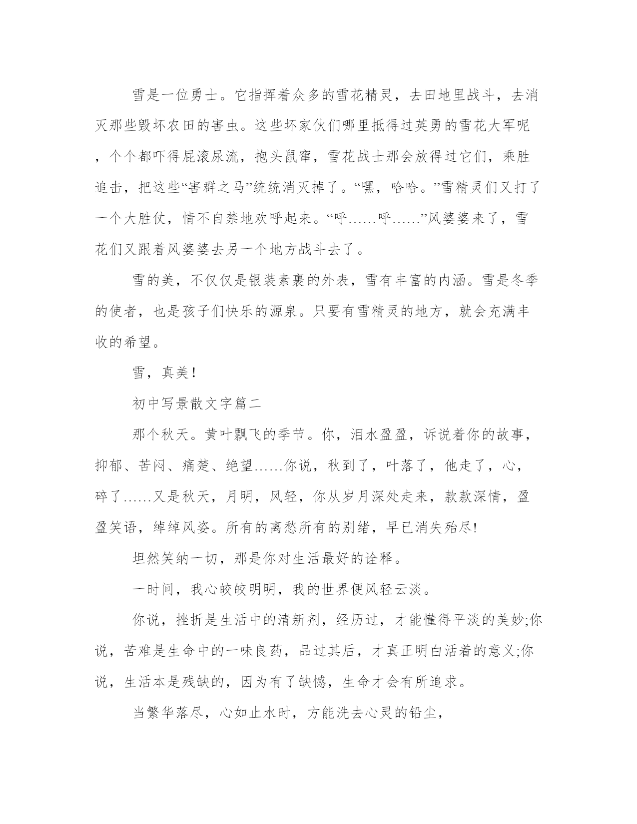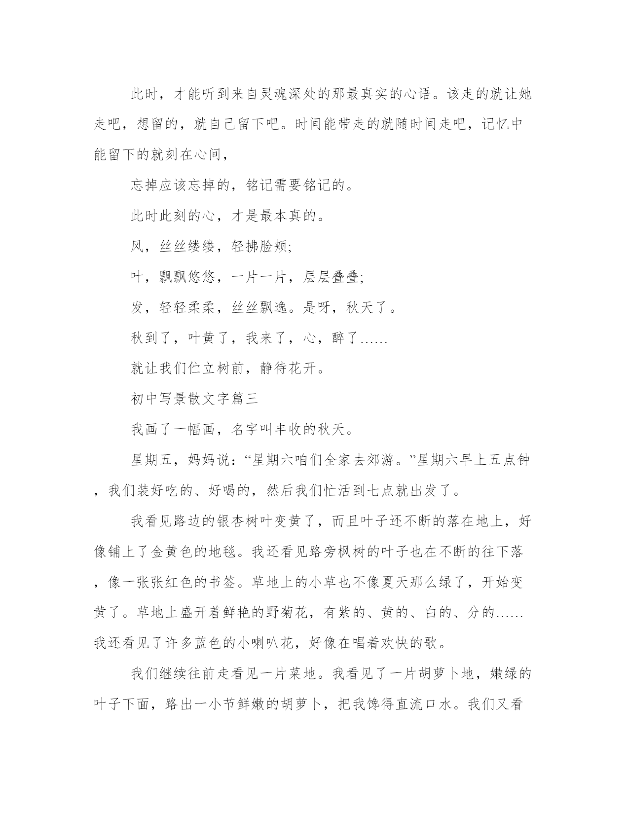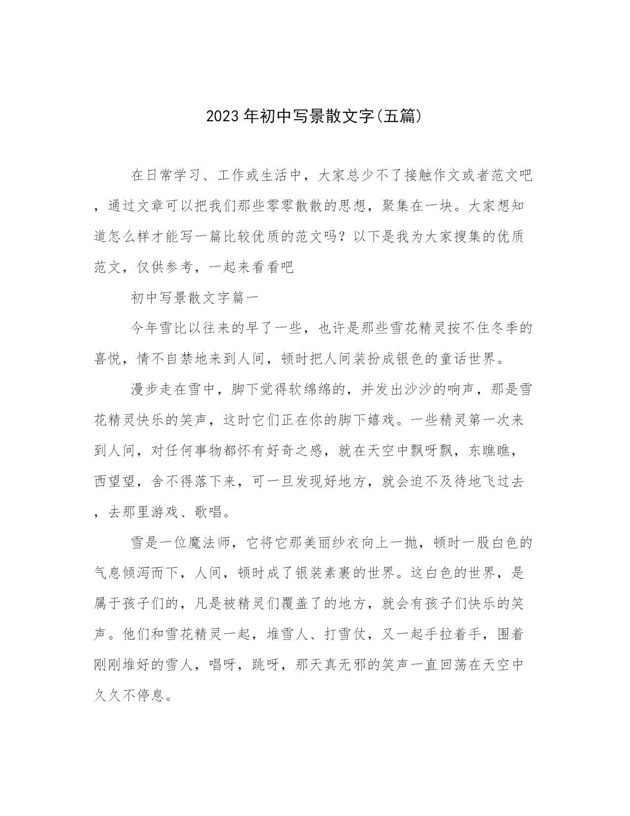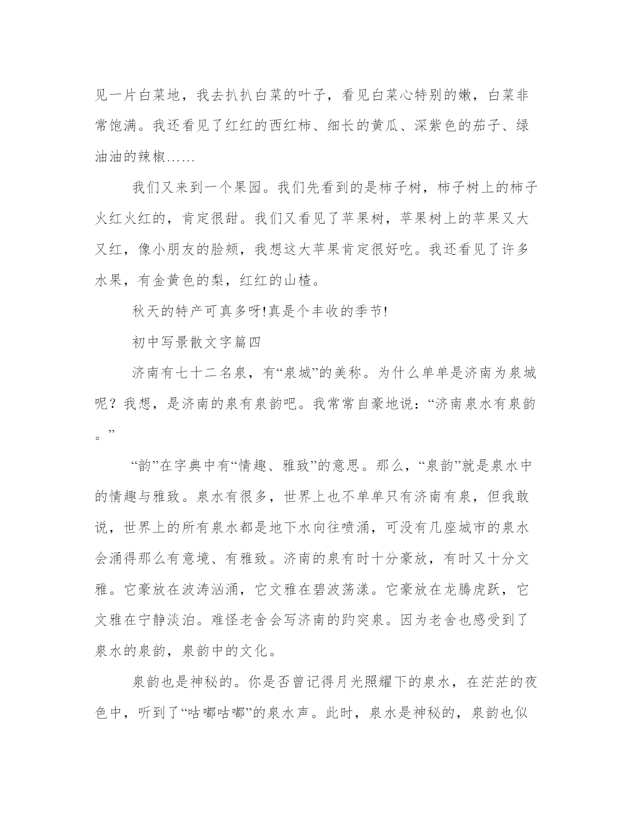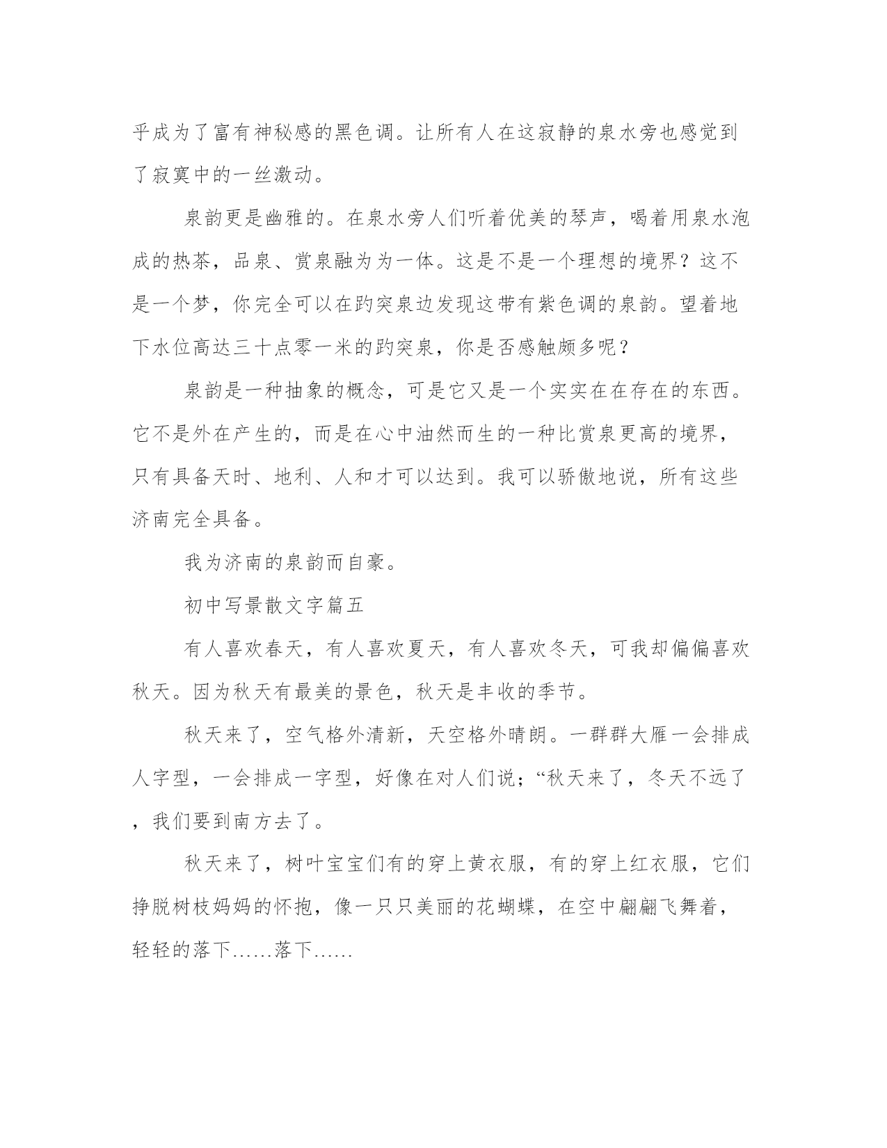 2023年初中写景散文字(五篇)在日常学习、工作或生活中,大家总少不了接触作文或者范文吧,通过文章可以把我们那些零零散散的思想,聚集在一块。大家想知道怎么样才能写一篇比较优质的范文吗?以下是我为大家搜集的优质范文,仅供参考,一起来看看吧初中写景散文字篇一今年雪比以往来的早了一些,也许是那些雪花精灵按不住冬季的喜悦,情不自禁地来到人间,顿时把人间装扮成银色的童话世界。漫步走在雪中,脚下觉得软绵绵的,并发出沙沙的响声,那是雪花精灵快乐的笑声,这时它们正在你的脚下嬉戏。一些精灵第一次来到人间,对任何事物都怀有好奇之感,就在天空中飘呀飘,东瞧瞧,西望望,舍不得落下来,可一旦发现好地方,就会迫不及待地飞过去,去那里游戏、歌唱。雪是一位魔法师,它将它那美丽纱衣向上一抛,顿时一股白色的气息倾泻而下,人间,顿时成了银装素裹的世界。这白色的世界,是属于孩子们的,凡是被精灵们覆盖了的地方,就会有孩子们快乐的笑声。他们和雪花精灵一起,堆雪人、打雪仗,又一起手拉着手,围着刚刚堆好的雪人,唱呀,跳呀,那天真无邪的笑声一直回荡在天空中久久不停息。雪是一位勇士。它指挥着众多的雪花精灵,去田地里战斗,去消灭那些毁坏农田的害虫。这些坏家伙们哪里抵得过英勇的雪花大军呢,个个都吓得屁滚尿流,抱头鼠窜,雪花战士那会放得过它们,乘胜追击,把这些“害群之马”统统消灭掉了。“嘿,哈哈。”雪精灵们又打了一个大胜仗,情不自禁地欢呼起来。“呼……呼……”风婆婆来了,雪花们又跟着风婆婆去另一个地方战斗去了。雪的美,不仅仅是银装素裹的外表,雪有丰富的内涵。雪是冬季的使者,也是孩子们快乐的源泉。只要有雪精灵的地方,就会充满丰收的希望。雪,真美!初中写景散文字篇二那个秋天。黄叶飘飞的季节。你,泪水盈盈,诉说着你的故事,抑郁、苦闷、痛楚、绝望……你说,秋到了,叶落了,他走了,心,碎了……又是秋天,月明,风轻,你从岁月深处走来,款款深情,盈盈笑语,绰绰风姿。所有的离愁所有的别绪,早已消失殆尽!坦然笑纳一切,那是你对生活最好的诠释。一时间,我心皎皎明明,我的世界便风轻云淡。你说,挫折是生活中的清新剂,经历过,才能懂得平淡的美妙;你说,苦难是生命中的一味良药,品过其后,才真正明白活着的意义;你说,生活本是残缺的,因为有了缺憾,生命才会有所追求。当繁华落尽,心如止水时,方能洗去心灵的铅尘,此时,才能听到来自灵魂深处的那最真实的心语。该走的就让她走吧,想留的,就自己留下吧。时间能带走的就随时间走吧,记忆中能留下的就刻在心间,忘掉应该忘掉的,铭记需要铭记的。此时此刻的心,才是最本真的。风,丝丝缕缕,轻拂脸颊;叶,飘飘悠悠,一片一片,层层叠叠;发,轻轻柔柔,丝丝飘逸。是呀,秋天了。秋到了,叶黄了,我来了,心,醉了……就让我们伫立树前,静待花开。初中写景散文字篇三我画了一幅画,名字叫丰收的秋天。星期五,妈妈说:“星期六咱们全家去郊游。”星期六早上五点钟,我们装好吃的、好喝的,然后我们忙活到七点就出发了。我看见路边的银杏树叶变黄了,而且叶子还不断的落在地上,好像铺上了金黄色的地毯。我还看见路旁枫树的叶子也在不断的往下落,像一张张红色的书签。草地上的小草也不像夏天那么绿了,开始变黄了。草地上盛开着鲜艳的野菊花,有紫的、黄的、白的、分的……我还看见了许多蓝色的小喇叭花,好像在唱着欢快的歌。我们继续往前走看见一片菜地。我看见了一片胡萝卜地,嫩绿的叶子下面,路出一小节鲜嫩的胡萝卜,把我馋得直流口水。我们又看见一片白菜地,我去扒扒白菜的叶子,看见白菜心特别的嫩,白菜非常饱满。我还看见了红红的西红柿、细长的黄瓜、深紫色的茄子、绿油油的辣椒……我们又来到一个果园。我们先看到的是柿子树,柿子树上的柿子火红火红的,肯定很甜。我们又看见了苹果树,苹果树上的苹果又大又红,像小朋友的脸颊,我想这大苹果肯定很好吃。我还看见了许多水果,有金黄色的梨,红红的山楂。秋天的特产可真多呀!真是个丰收的季节!初中写景散文字篇四济南有七十二名泉,有“泉城”的美称。为什么单单是济南为泉城呢?我想,是济南的泉有泉韵吧。我常常自豪地说:“济南泉水有泉韵。”“韵”在字典中有“情趣、雅致”的意思。那么,“泉韵”就是泉水中的情趣与雅致。泉水有很多,世界上也不单单只有济南有泉,但我敢说,世界上的所有泉水都是地下水向往喷涌,可没有几座城市的泉水会涌得那么有意境、有雅致。济南的泉有时十分豪放,有时又十分文雅。它豪放在波涛汹涌,它文雅在碧波荡漾。它豪放在龙腾虎跃,它文雅在宁静淡泊。难怪老舍会写济南的趵突泉。因为老舍也感受到了泉水的泉韵,泉韵中的文化。泉韵也是神秘的。你是否曾记得月光照耀下的泉水,在茫茫的夜色中,听到了“咕嘟咕嘟”的泉水声。此时,泉水是神秘的,泉韵也似乎成为了富有神秘感的黑色调。让所有人在这寂静的泉水旁也感觉到了寂寞中的一丝激动。泉韵更是幽雅的。在泉