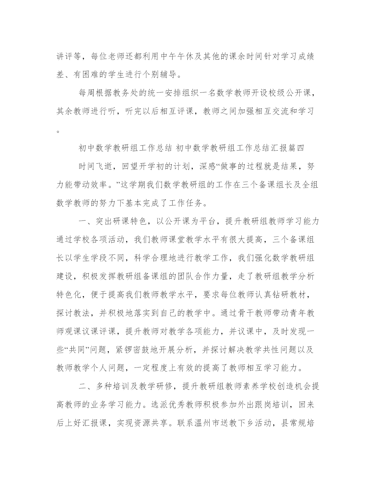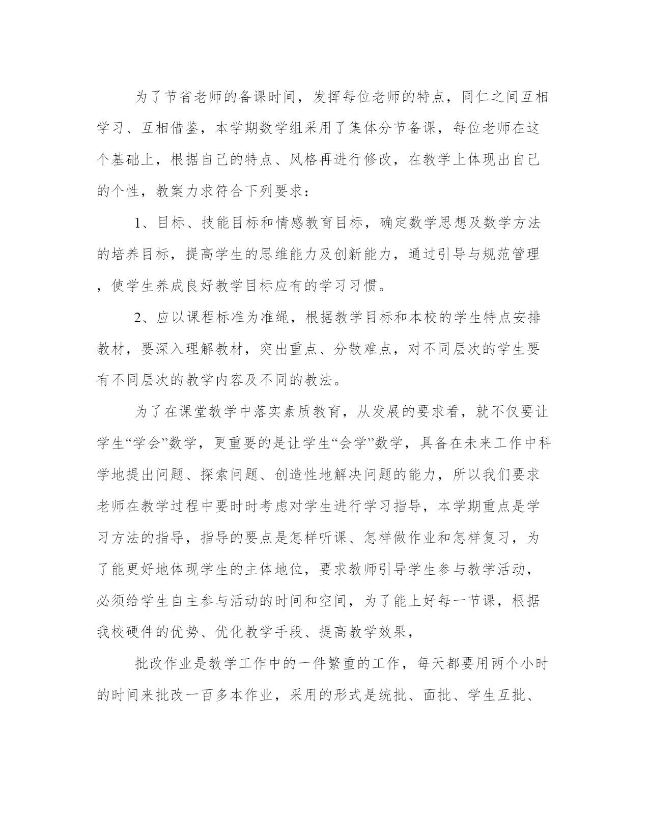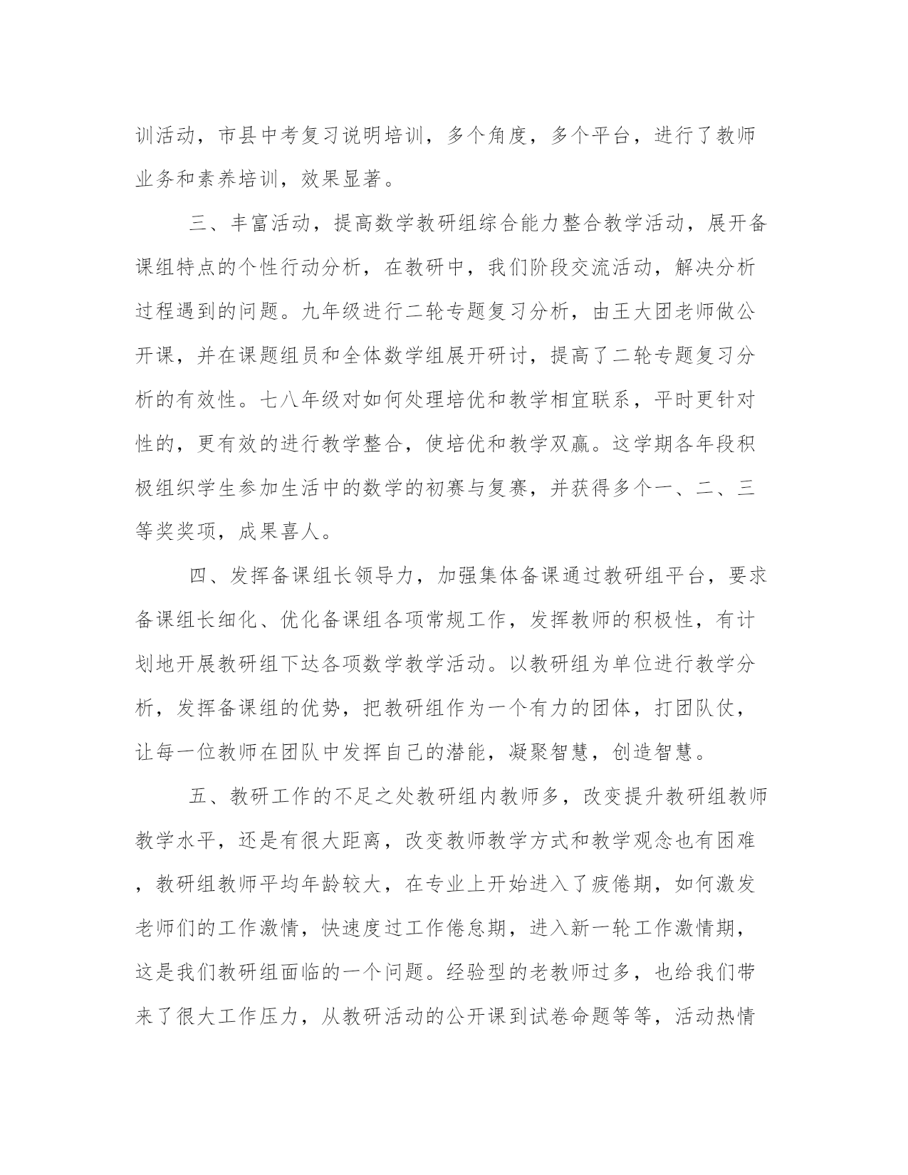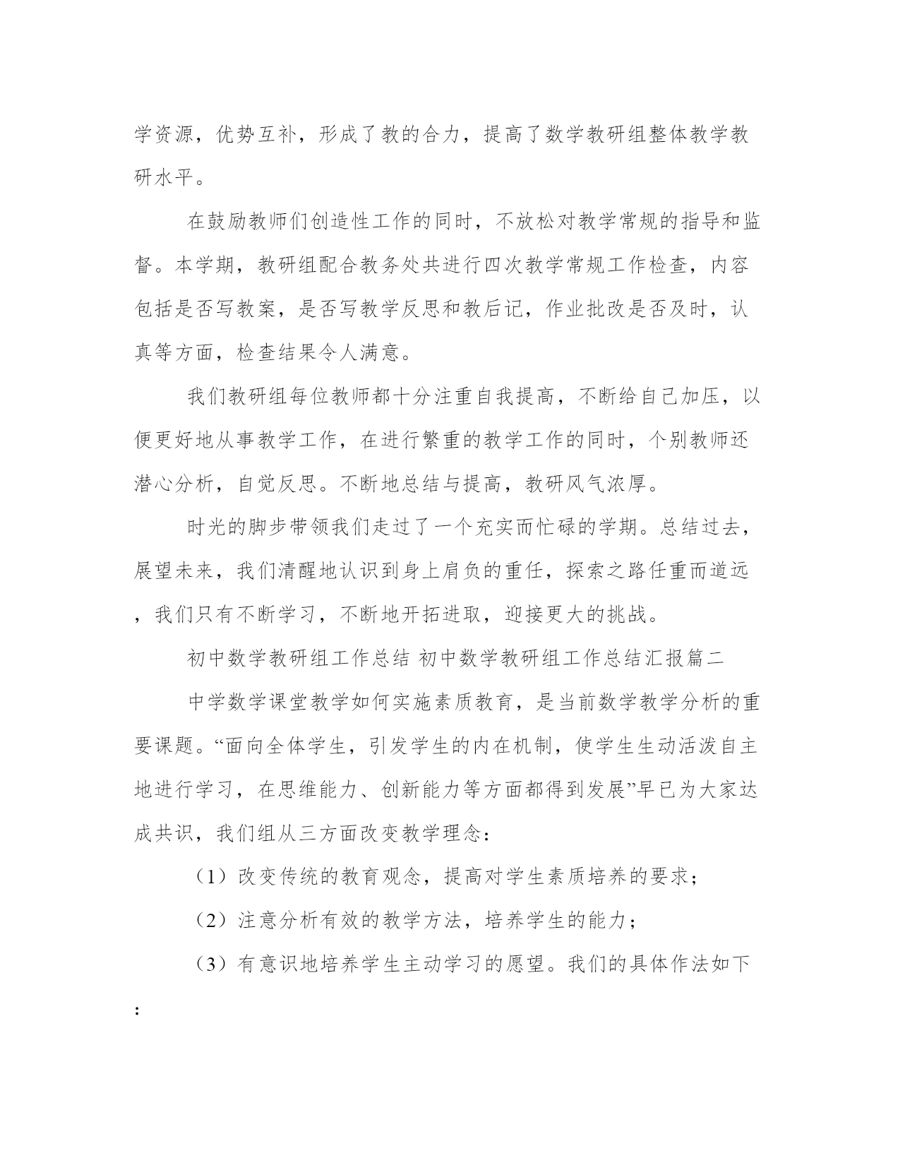 最新初中数学教研组工作总结初中数学教研组工作总结汇报(实用6篇)总结是写给人看的,条理不清,人们就看不下去,即使看了也不知其所以然,这样就达不到总结的目的。优秀的总结都具备一些什么特点呢?又该怎么写呢?下面是小编为大家带来的总结书优秀范文,希望大家可以喜欢。初中数学教研组工作总结初中数学教研组工作总结汇报篇一本学期,教研组利用隔周二上午教研活动,组织全体数学老师再次学习数学新课程标准及最新的教育理念,正确把握数学教育的特点,积极倡导自主,合作、探究的学习方式。充分利用网络资源,及时了解课改动态,多渠道多方位获取信息,提高理论水平。1、加强课堂教学,提高课堂效率。本学期共开校公开课2节,家长开放日1节,执教者认真备课、上课、反思,听课教师认真听课,集体评议,相互研讨,共同促进,形成良好的教研氛围。2、进一步完善集体备课制度。三个年级,以备课组为单位,倡导分内容、分章节、分头备课,力求备精品课;倡导利用网络资源寻找资料,以达到资源共享之目的。目前,各备课组都积累了一定的教学资料,有的是老师们自己拟定的,有的是多方搜集的,不但本年级使用,还传给下一年级使用,做到资源共享。集体备课结合了各类教学资源,优势互补,形成了教的合力,提高了数学教研组整体教学教研水平。在鼓励教师们创造性工作的同时,不放松对教学常规的指导和监督。本学期,教研组配合教务处共进行四次教学常规工作检查,内容包括是否写教案,是否写教学反思和教后记,作业批改是否及时,认真等方面,检查结果令人满意。我们教研组每位教师都十分注重自我提高,不断给自己加压,以便更好地从事教学工作,在进行繁重的教学工作的同时,个别教师还潜心分析,自觉反思。不断地总结与提高,教研风气浓厚。时光的脚步带领我们走过了一个充实而忙碌的学期。总结过去,展望未来,我们清醒地认识到身上肩负的重任,探索之路任重而道远,我们只有不断学习,不断地开拓进取,迎接更大的挑战。初中数学教研组工作总结初中数学教研组工作总结汇报篇二中学数学课堂教学如何实施素质教育,是当前数学教学分析的重要课题。“面向全体学生,引发学生的内在机制,使学生生动活泼自主地进行学习,在思维能力、创新能力等方面都得到发展”早已为大家达成共识,我们组从三方面改变教学理念:(1)改变传统的教育观念,提高对学生素质培养的要求;(2)注意分析有效的教学方法,培养学生的能力;(3)有意识地培养学生主动学习的愿望。我们的具体作法如下:为了节省老师的备课时间,发挥每位老师的特点,同仁之间互相学习、互相借鉴,本学期数学组采用了集体分节备课,每位老师在这个基础上,根据自己的特点、风格再进行修改,在教学上体现出自己的个性,教案力求符合下列要求:1、目标、技能目标和情感教育目标,确定数学思想及数学方法的培养目标,提高学生的思维能力及创新能力,通过引导与规范管理,使学生养成良好教学目标应有的学习习惯。2、应以课程标准为准绳,根据教学目标和本校的学生特点安排教材,要深入理解教材,突出重点、分散难点,对不同层次的学生要有不同层次的教学内容及不同的教法。为了在课堂教学中落实素质教育,从发展的要求看,就不仅要让学生“学会”数学,更重要的是让学生“会学”数学,具备在未来工作中科学地提出问题、探索问题、创造性地解决问题的能力,所以我们要求老师在教学过程中要时时考虑对学生进行学习指导,本学期重点是学习方法的指导,指导的要点是怎样听课、怎样做作业和怎样复习,为了能更好地体现学生的主体地位,要求教师引导学生参与教学活动,必须给学生自主参与活动的时间和空间,为了能上好每一节课,根据我校硬件的优势、优化教学手段、提高教学效果,批改作业是教学工作中的一件繁重的工作,每天都要用两个小时的时间来批改一百多本作业,采用的形式是统批、面批、学生互批、讲评等,每位老师还都利用中午午休及其他的课余时间针对学习成绩差、有困难的学生进行个别辅导。每周根据教务处的统一安排组织一名数学教师开设校级公开课,其余教师进行听,听完以后相互评课,教师之间加强相互交流和学习。初中数学教研组工作总结初中数学教研组工作总结汇报篇四时间飞逝,回望开学初的计划,深感“做事的过程就是结果,努力能带动效率。”这学期我们数学教研组的工作在三个备课组长及全组数学教师的努力下基本完成了工作任务。一、突出研课特色,以公开课为平台,提升教研组教师学习能力通过学校各项活动,我们教师课堂教学水平有很大提高,三个备课组长以学生学段不同,科学合理地进行教学工作,我们强化数学教研组建设,积极发挥教研组备课组的团队合作力量,走了教研组教学分析特色化,便于提高我们教师教学水平,要求每位教师认真钻研教材,探讨教法,并积极地落实到自己的教学中。通过骨干教师带动青年教师观课议课评课,提升教师对教学各项能力,并议课中,及时发现一些“共同”问题,紧锣密鼓地开展分析,并探讨解