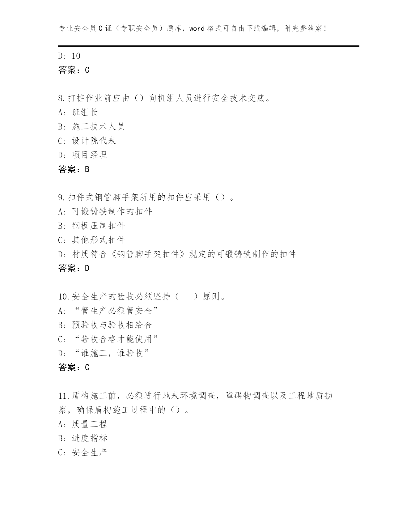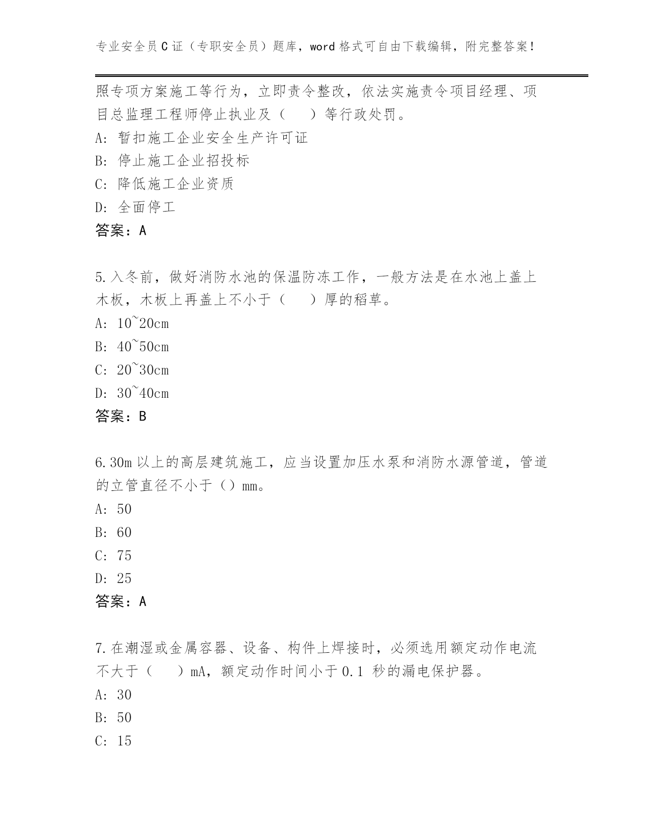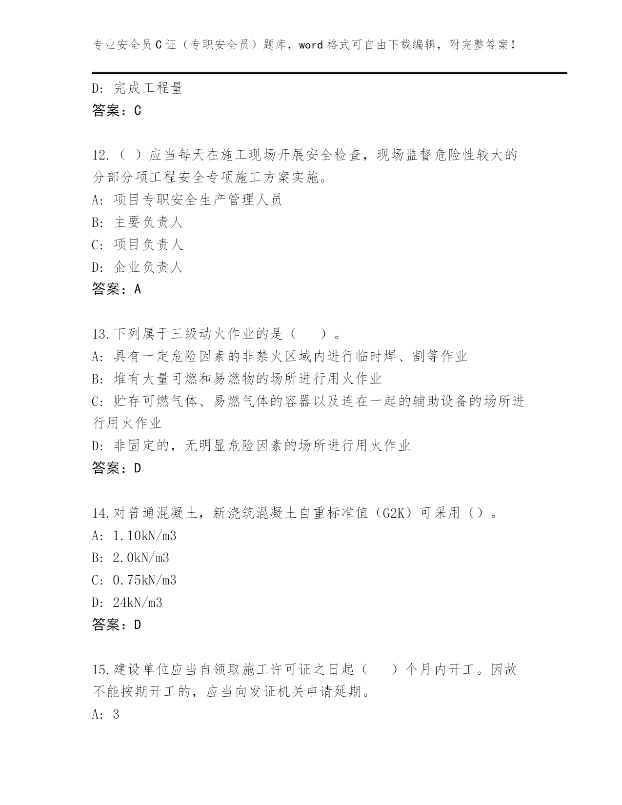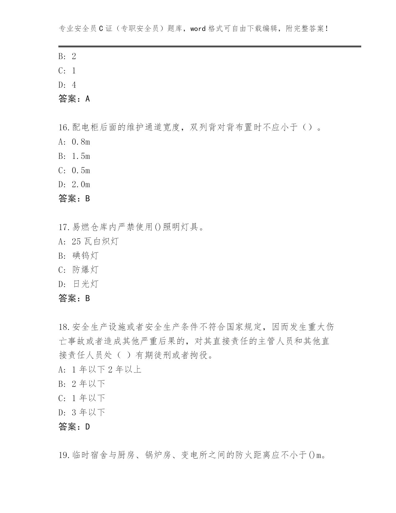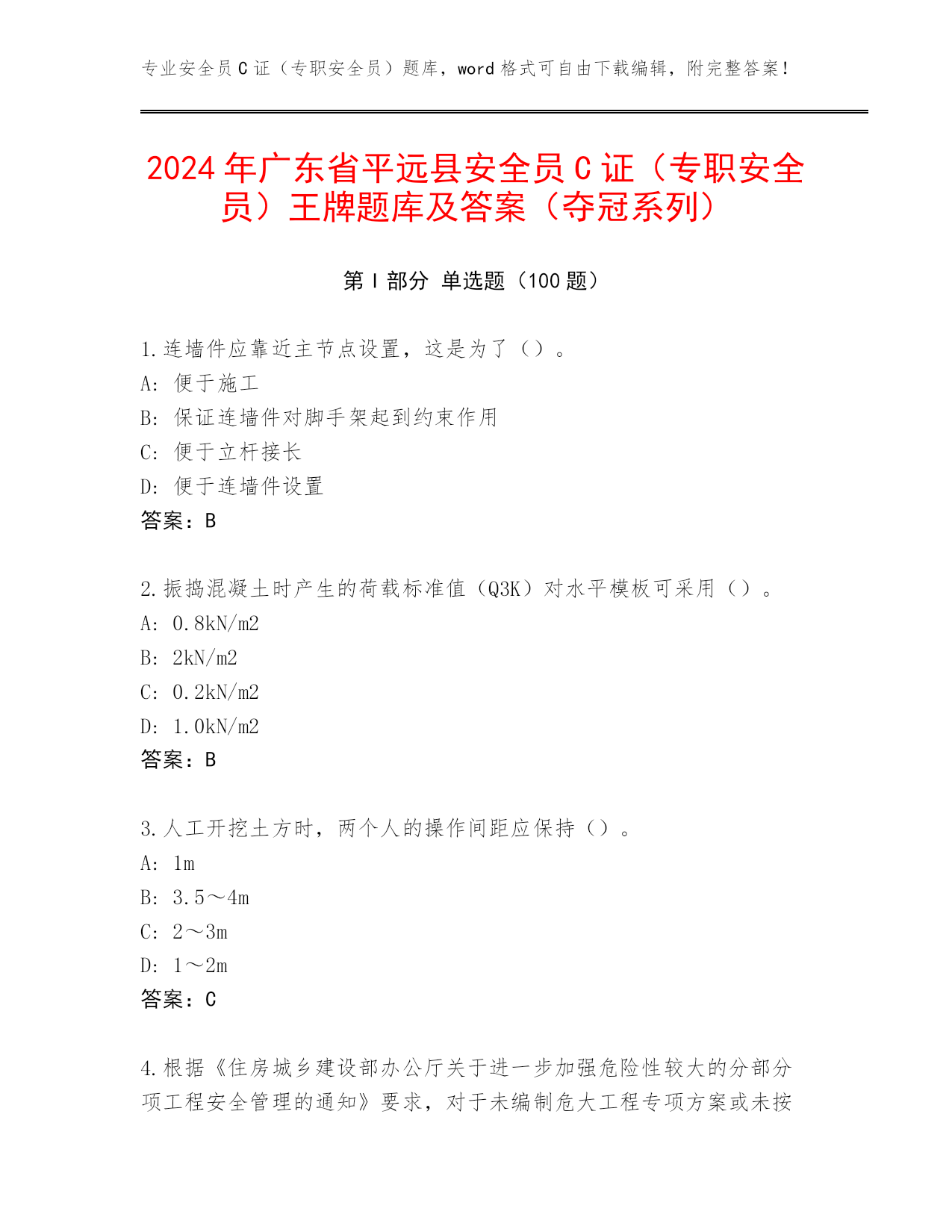 专业安全员C证(专职安全员)题库,word格式可自由下载编辑,附完整答案!2024年广东省平远县安全员C证(专职安全员)王牌题库及答案(夺冠系列)第I部分单选题(100题)1.连墙件应靠近主节点设置,这是为了()。A:便于施工B:保证连墙件对脚手架起到约束作用C:便于立杆接长D:便于连墙件设置答案:B2.振捣混凝土时产生的荷载标准值(Q3K)对水平模板可采用()。A:0.8kN/m2B:2kN/m2C:0.2kN/m2D:1.0kN/m2答案:B3.人工开挖土方时,两个人的操作间距应保持()。A:1mB:3.5~4mC:2~3mD:1~2m答案:C4.根据《住房城乡建设部办公厅关于进一步加强危险性较大的分部分项工程安全管理的通知》要求,对于未编制危大工程专项方案或未按照专项方案施工等行为,立即责令整改,依法实施责令项目经理、项目总监理工程师停止执业及()等行政处罚。A:暂扣施工企业安全生产许可证B:停止施工企业招投标C:降低施工企业资质D:全面停工答案:A5.入冬前,做好消防水池的保温防冻工作,一般方法是在水池上盖上木板,木板上再盖上不小于()厚的稻草。A:10~20cmB:40~50cmC:20~30cmD:30~40cm答案:B6.30m以上的高层建筑施工,应当设置加压水泵和消防水源管道,管道的立管直径不小于()mm。A:50B:60C:75D:25答案:A7.在潮湿或金属容器、设备、构件上焊接时,必须选用额定动作电流不大于()mA,额定动作时间小于0.1秒的漏电保护器。A:30B:50C:15D:10答案:C8.打桩作业前应由()向机组人员进行安全技术交底。A:班组长B:施工技术人员C:设计院代表D:项目经理答案:B9.扣件式钢管脚手架所用的扣件应采用()。A:可锻铸铁制作的扣件B:钢板压制扣件C:其他形式扣件D:材质符合《钢管脚手架扣件》规定的可锻铸铁制作的扣件答案:D10.安全生产的验收必须坚持()原则。A:“管生产必须管安全”B:预验收与验收相给合C:“验收合格才能使用”D:“谁施工,谁验收”答案:C11.盾构施工前,必须进行地表环境调查,障碍物调查以及工程地质勘察,确保盾构施工过程中的()。A:质量工程B:进度指标C:安全生产D:完成工程量答案:C12.()应当每天在施工现场开展安全检查,现场监督危险性较大的分部分项工程安全专项施工方案实施。A:项目专职安全生产管理人员B:主要负责人C:项目负责人D:企业负责人答案:A13.下列属于三级动火作业的是()。A:具有一定危险因素的非禁火区域内进行临时焊、割等作业B:堆有大量可燃和易燃物的场所进行用火作业C:贮存可燃气体、易燃气体的容器以及连在一起的辅助设备的场所进行用火作业D:非固定的,无明显危险因素的场所进行用火作业答案:D14.对普通混凝土,新浇筑混凝土自重标准值(G2K)可采用()。A:1.10kN/m3B:2.0kN/m3C:0.75kN/m3D:24kN/m3答案:D15.建设单位应当自领取施工许可证之日起()个月内开工。因故不能按期开工的,应当向发证机关申请延期。A:3B:2C:1D:4答案:A16.配电柜后面的维护通道宽度,双列背对背布置时不应小于()。A:0.8mB:1.5mC:0.5mD:2.0m答案:B17.易燃仓库内严禁使用()照明灯具。A:25瓦白炽灯B:碘钨灯C:防爆灯D:日光灯答案:B18.安全生产设施或者安全生产条件不符合国家规定,因而发生重大伤亡事故或者造成其他严重后果的,对其直接责任的主管人员和其他直接责任人员处()有期徒刑或者拘役。A:1年以下2年以上B:2年以下C:1年以下D:3年以下答案:D19.临时宿舍与厨房、锅炉房、变电所之间的防火距离应不小于()m。A:15B:10C:5D:20答案:A20.破坏后果为支护结构失效、土体过大变形对基坑周边环境或主体结构施工安全的影响不严重,属于()基坑侧壁。A:三级B:一级C:二级D:四级答案:A21.模板安装作业必须搭设操作平台的最小高度是()。A:1.5mB:2.0mC:2.5mD:1.8m答案:B22.在工作时间和工作岗位,突发疾病死亡或者在()之内经抢救无效死亡的,视同工伤。A:36小时B:12小时C:48小时D:24小时答案:C23.在板结构中,钢支架立往及衍架杆件的受压构件长细比不应大于()。A:80B:170C:150D:160答案:C24.计算纵向或横向水平杆与立杆的连接扣件抗滑承载力时,应采用扣件抗滑承载力的设计值,其值为()。A:3.2KNB:8KNC:10KND:40KN答案:B25.滑移法在滑行中发现异常情况,()A:必须立即停滑静止一段时间后继续滑移B:可以不加理会,继续滑移C:必须立即停滑,找出原因方可继续滑整D:可以边滑移,边找原因答案:C26.剪刀撑斜杆用旋