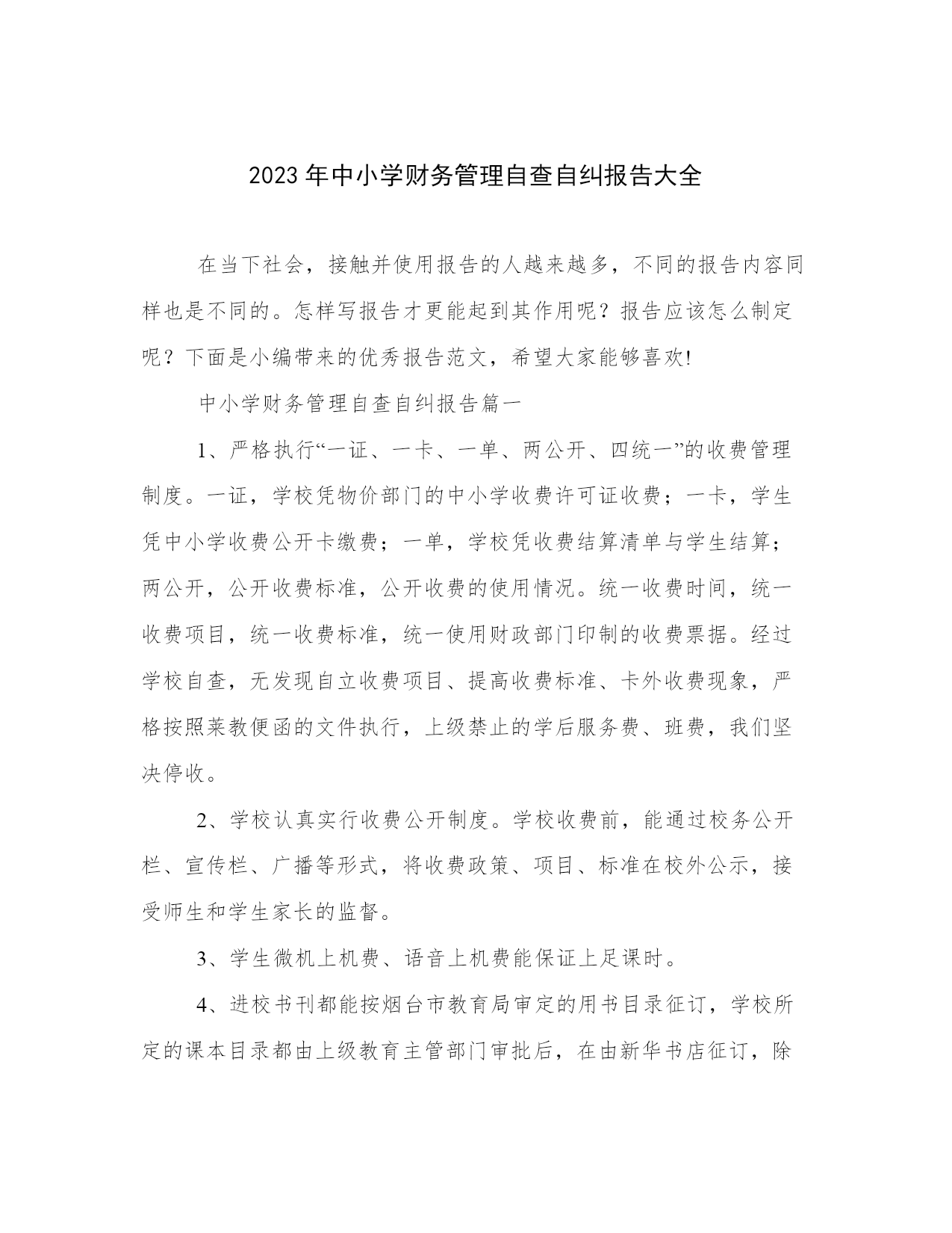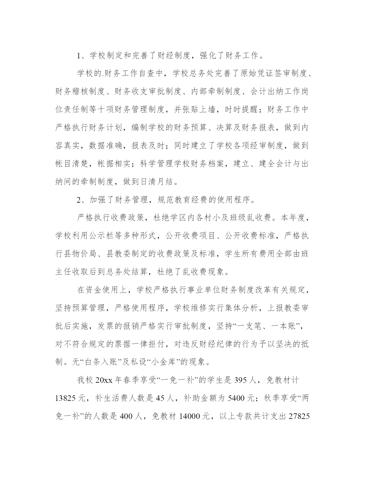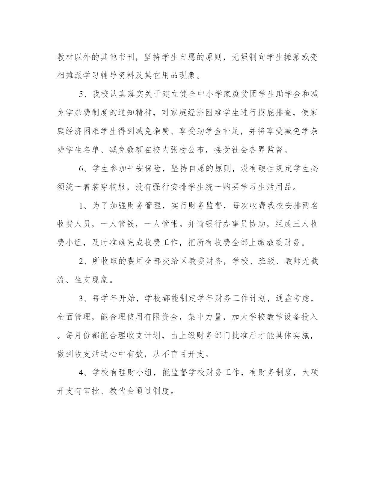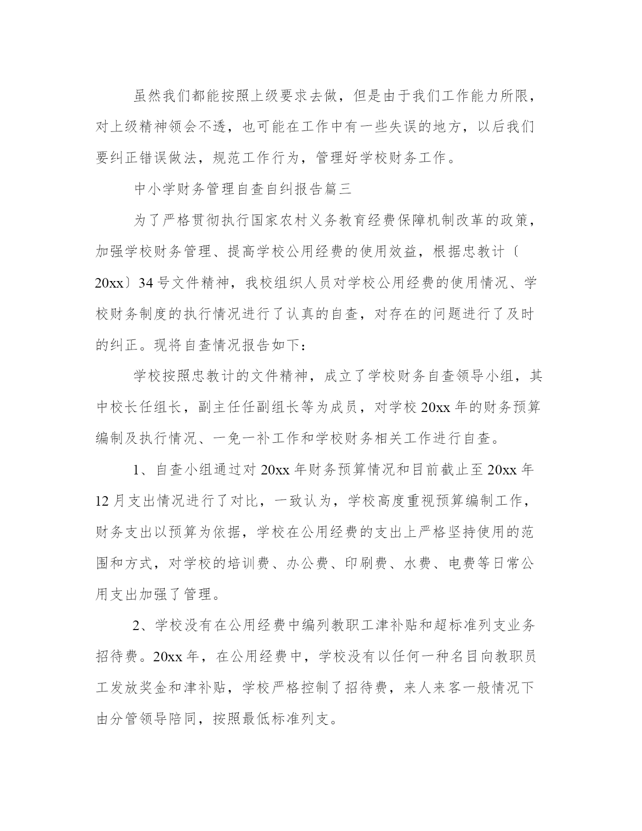 2023年中小学财务管理自查自纠报告大全在当下社会,接触并使用报告的人越来越多,不同的报告内容同样也是不同的。怎样写报告才更能起到其作用呢?报告应该怎么制定呢?下面是小编带来的优秀报告范文,希望大家能够喜欢!中小学财务管理自查自纠报告篇一1、严格执行“一证、一卡、一单、两公开、四统一”的收费管理制度。一证,学校凭物价部门的中小学收费许可证收费;一卡,学生凭中小学收费公开卡缴费;一单,学校凭收费结算清单与学生结算;两公开,公开收费标准,公开收费的使用情况。统一收费时间,统一收费项目,统一收费标准,统一使用财政部门印制的收费票据。经过学校自查,无发现自立收费项目、提高收费标准、卡外收费现象,严格按照莱教便函的文件执行,上级禁止的学后服务费、班费,我们坚决停收。2、学校认真实行收费公开制度。学校收费前,能通过校务公开栏、宣传栏、广播等形式,将收费政策、项目、标准在校外公示,接受师生和学生家长的监督。3、学生微机上机费、语音上机费能保证上足课时。4、进校书刊都能按烟台市教育局审定的用书目录征订,学校所定的课本目录都由上级教育主管部门审批后,在由新华书店征订,除教材以外的其他书刊,坚持学生自愿的原则,无强制向学生摊派或变相摊派学习辅导资料及其它用品现象。5、我校认真落实关于建立健全中小学家庭贫困学生助学金和减免学杂费制度的通知精神,对家庭经济困难学生进行摸底排查,使家庭经济困难学生得到减免杂费、享受助学金补足,并将享受减免学杂费学生名单、减免数额在校内张榜公布,接受社会各界监督。6、学生参加平安保险,坚持自愿的原则,没有硬性规定学生必须统一着装穿校服,没有强行安排学生统一购买学习生活用品。1、为了加强财务管理,实行财务监督,每次收费我校安排两名收费人员,一人管钱,一人管帐。并请银行办事员协助,组成三人收费小组,及时准确完成收费工作,把所有收费全部上缴教委财务。2、所收取的费用全部交给区教委财务,学校、班级、教师无截流、坐支现象。3、每学年开始,学校都能制定学年财务工作计划,通盘考虑,全面管理,能合理使用有限资金,集中力量,加大学校教学设备投入。每月份都能合理收支计划,由上级财务部门批准后才能具体实施,做到收支活动心中有数,从不盲目开支。4、学校有理财小组,能监督学校财务工作,有财务制度,大项开支有审批、教代会通过制度。虽然我们都能按照上级要求去做,但是由于我们工作能力所限,对上级精神领会不透,也可能在工作中有一些失误的地方,以后我们要纠正错误做法,规范工作行为,管理好学校财务工作。中小学财务管理自查自纠报告篇三为了严格贯彻执行国家农村义务教育经费保障机制改革的政策,加强学校财务管理、提高学校公用经费的使用效益,根据忠教计〔20xx〕34号文件精神,我校组织人员对学校公用经费的使用情况、学校财务制度的执行情况进行了认真的自查,对存在的问题进行了及时的纠正。现将自查情况报告如下:学校按照忠教计的文件精神,成立了学校财务自查领导小组,其中校长任组长,副主任任副组长等为成员,对学校20xx年的财务预算编制及执行情况、一免一补工作和学校财务相关工作进行自查。1、自查小组通过对20xx年财务预算情况和目前截止至20xx年12月支出情况进行了对比,一致认为,学校高度重视预算编制工作,财务支出以预算为依据,学校在公用经费的支出上严格坚持使用的范围和方式,对学校的培训费、办公费、印刷费、水费、电费等日常公用支出加强了管理。2、学校没有在公用经费中编列教职工津补贴和超标准列支业务招待费。20xx年,在公用经费中,学校没有以任何一种名目向教职员工发放奖金和津补贴,学校严格控制了招待费,来人来客一般情况下由分管领导陪同,按照最低标准列支。1、学校制定和完善了财经制度,强化了财务工作。学校的.财务工作自查中,学校总务处完善了原始凭证签审制度、财务稽核制度、财务收支审批制度、内部牵制制度、会计出纳工作岗位责任制等十项财务管理制度,并张贴上墙,时时提醒;财务工作中严格执行财务计划,编制学校的财务预算、决算及财务报表,做到内容真实,数据准确,报表及时;同时建立了学校各项经审制度,做到帐目清楚,帐据相实;科学管理学校财务档案,建立、建全会计与出纳间的牵制制度,做到日清月结。2、加强了财务管理,规范教育经费的使用程序。严格执行收费政策,杜绝学区内各村小及班级乱收费。本年度,学校利用公示栏等多种形式,公开收费项目、公开收费标准,严格执行县物价局、县教委制定的收费政策及标准,学生所有费用全部由班主任收取后到总务处结算,杜绝了乱收费现象。在资金使用上,学校严格执行事业单位财务制度改革有关规定,坚持预算管理,严格使用程序,学校维修实行集体分析,上报教委审批后实施,发票的报销严格实行审批制度,坚持“一支笔、一本账”,对不符合规定的票据一律拒付,对违反财经纪律的行为予以坚决的抵制。无