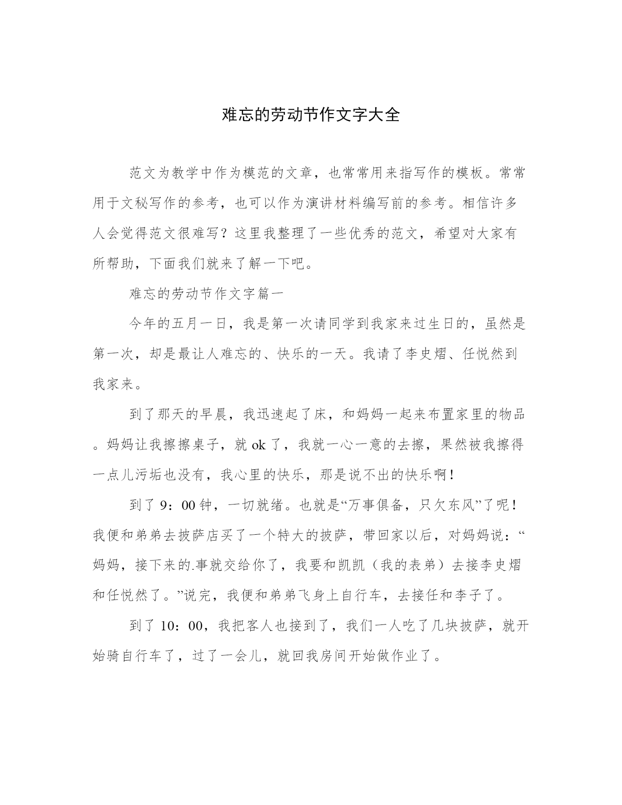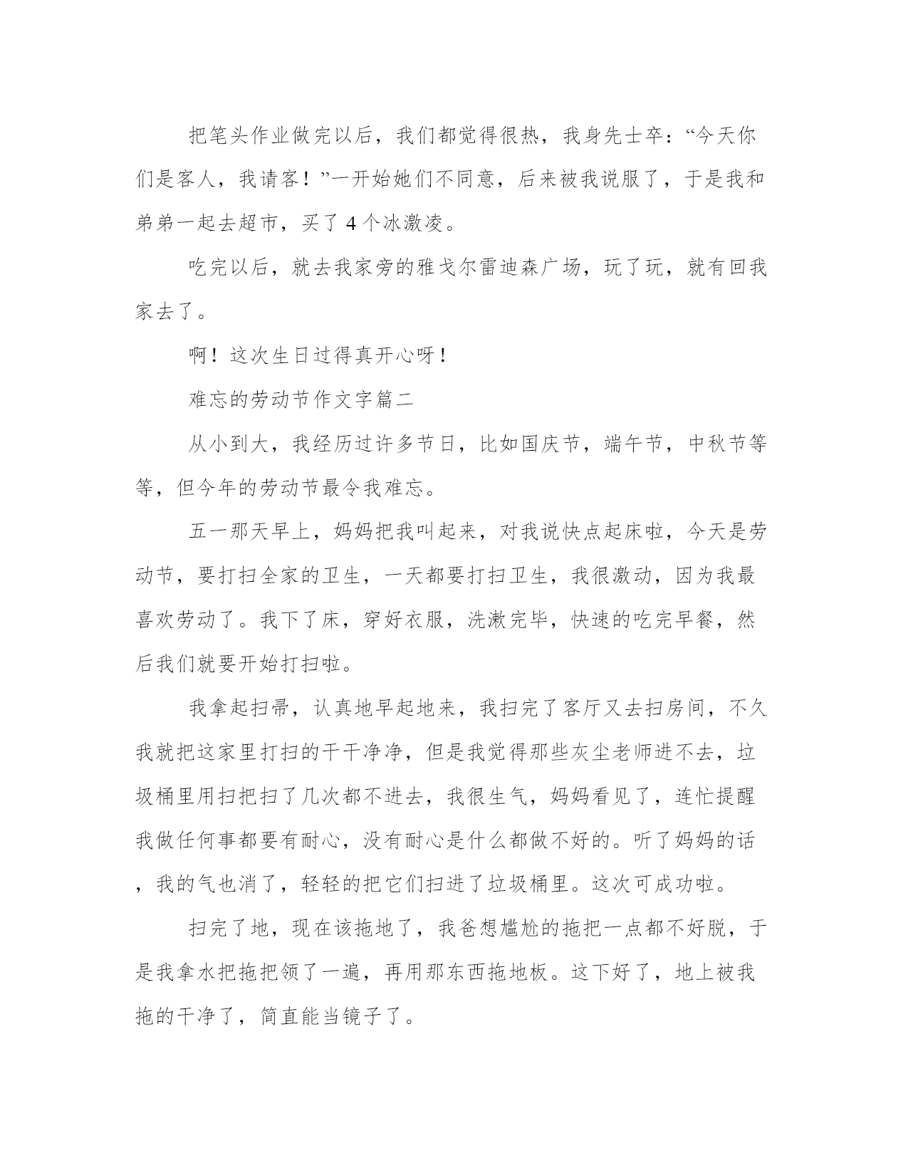 难忘的劳动节作文字大全范文为教学中作为模范的文章,也常常用来指写作的模板。常常用于文秘写作的参考,也可以作为演讲材料编写前的参考。相信许多人会觉得范文很难写?这里我整理了一些优秀的范文,希望对大家有所帮助,下面我们就来了解一下吧。难忘的劳动节作文字篇一今年的五月一日,我是第一次请同学到我家来过生日的,虽然是第一次,却是最让人难忘的、快乐的一天。我请了李史熠、任悦然到我家来。到了那天的早晨,我迅速起了床,和妈妈一起来布置家里的物品。妈妈让我擦擦桌子,就ok了,我就一心一意的去擦,果然被我擦得一点儿污垢也没有,我心里的快乐,那是说不出的快乐啊!到了9:00钟,一切就绪。也就是“万事俱备,只欠东风”了呢!我便和弟弟去披萨店买了一个特大的披萨,带回家以后,对妈妈说:“妈妈,接下来的.事就交给你了,我要和凯凯(我的表弟)去接李史熠和任悦然了。”说完,我便和弟弟飞身上自行车,去接任和李子了。到了10:00,我把客人也接到了,我们一人吃了几块披萨,就开始骑自行车了,过了一会儿,就回我房间开始做作业了。把笔头作业做完以后,我们都觉得很热,我身先士卒:“今天你们是客人,我请客!”一开始她们不同意,后来被我说服了,于是我和弟弟一起去超市,买了4个冰激凌。吃完以后,就去我家旁的雅戈尔雷迪森广场,玩了玩,就有回我家去了。啊!这次生日过得真开心呀!难忘的劳动节作文字篇二从小到大,我经历过许多节日,比如国庆节,端午节,中秋节等等,但今年的劳动节最令我难忘。五一那天早上,妈妈把我叫起来,对我说快点起床啦,今天是劳动节,要打扫全家的卫生,一天都要打扫卫生,我很激动,因为我最喜欢劳动了。我下了床,穿好衣服,洗漱完毕,快速的吃完早餐,然后我们就要开始打扫啦。我拿起扫帚,认真地早起地来,我扫完了客厅又去扫房间,不久我就把这家里打扫的干干净净,但是我觉得那些灰尘老师进不去,垃圾桶里用扫把扫了几次都不进去,我很生气,妈妈看见了,连忙提醒我做任何事都要有耐心,没有耐心是什么都做不好的。听了妈妈的话,我的气也消了,轻轻的把它们扫进了垃圾桶里。这次可成功啦。扫完了地,现在该拖地了,我爸想尴尬的拖把一点都不好脱,于是我拿水把拖把领了一遍,再用那东西拖地板。这下好了,地上被我拖的干净了,简直能当镜子了。现在就该把垃圾分类了。把没用的废垃圾丢掉在垃圾池。把客厅里的废纸拖出去卖钱。忙了一个上午,我坐在沙发上,虽然感觉很累,但我看着一尘不染的家,心里很开心。