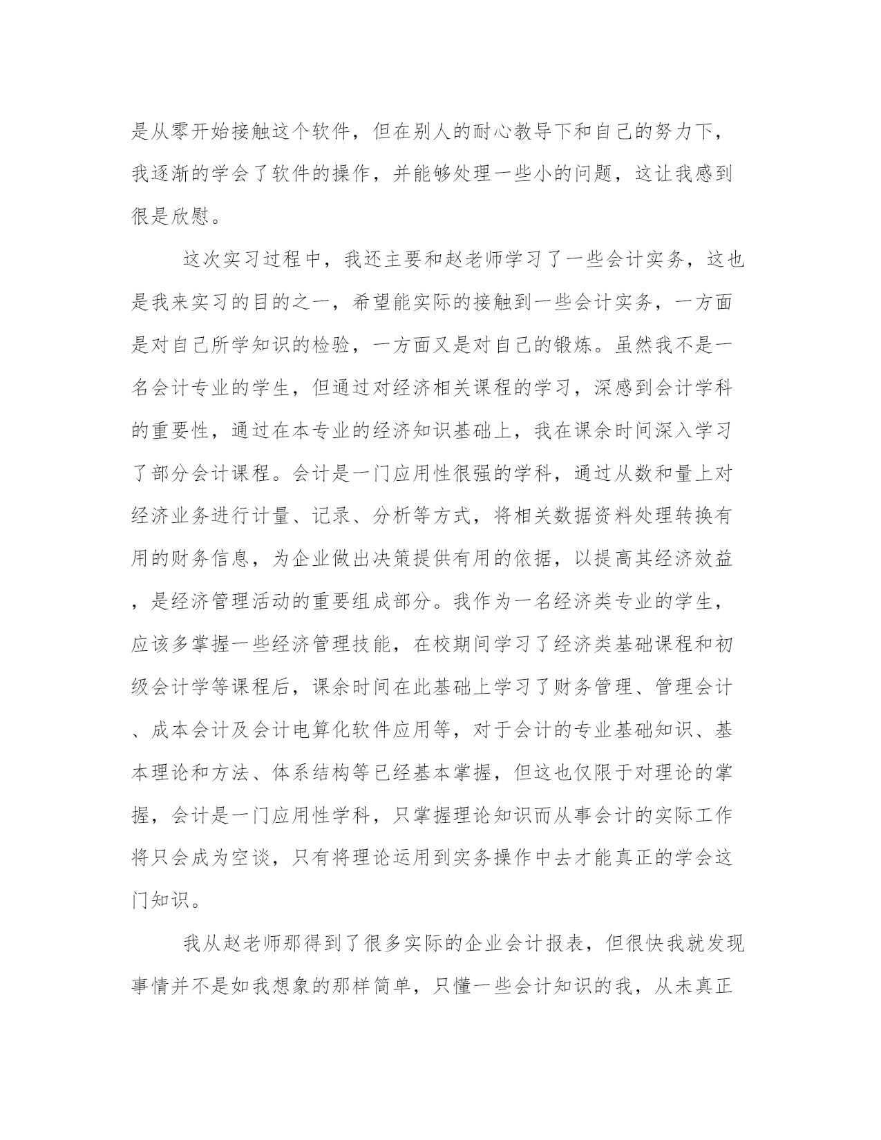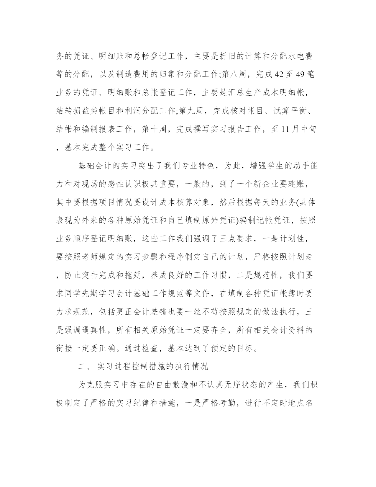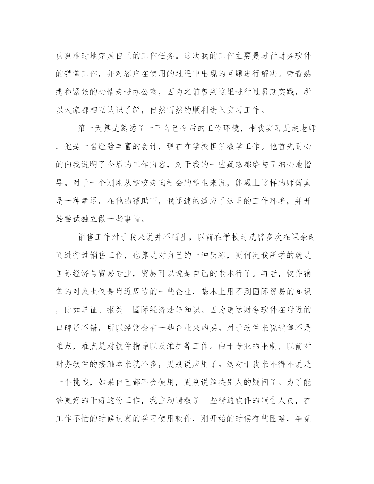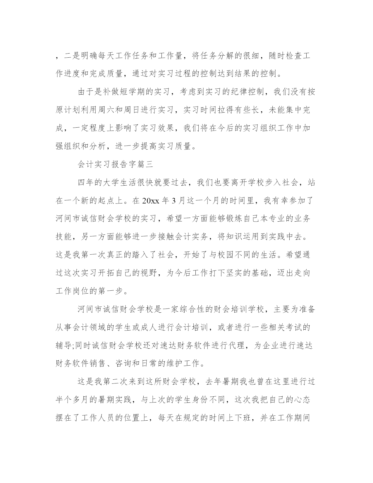 最新会计实习报告字精选(十篇)报告材料主要是向上级汇报工作,其表达方式以叙述、说明为主,在语言运用上要突出陈述性,把事情交代清楚,充分显示内容的真实和材料的客观。那么我们该如何写一篇较为完美的报告呢?下面是小编给大家带来的报告的范文模板,希望能够帮到你哟!会计实习报告字篇一根据计划,实习工作从20xx年9月8日正式开始,主要是利用周三下午和周五下午在2教集中实习,其中,主要工作和时间完成情况如下:第一周,完成建账和资料学习,熟悉会计基础工作规范的要求,复习借贷记账法,认识真实的凭证和账的填写规则和实例,第二周,完成1至7笔业务的凭证、明细账和总帐登记工作(包括相关原始凭证的填制和审核,贴附,下同),主要内容是相关采购、结算和报销的日常业务的处理;第三周,完成8至12笔业务的凭证、明细账和总帐登记工作,主要内容是工资发放、借款以及销售业务的处理;第四周,完成13至21笔业务的凭证、明细账和总帐登记工作,主要是固定资产购置、材料销售以及结算的处理;第五周,完成22至31笔业务的凭证、明细账和总帐登记工作,主要是各种费用的发生和报销业务的处理;第六周,完成32至34笔业务的凭证、明细账和总帐登记工作,主要是材料费用的汇总和分配以及工资费用的分配,是工作的难点和重点;第七周,完成35至40笔业务的凭证、明细账和总帐登记工作,主要是折旧的计算和分配水电费等的分配,以及制造费用的归集和分配工作;第八周,完成42至49笔业务的凭证、明细账和总帐登记工作,主要是汇总生产成本明细帐,结转损益类帐目和利润分配工作;第九周,完成核对帐目、试算平衡、结帐和编制报表工作,第十周,完成撰写实习报告工作,至11月中旬,基本完成整个实习工作。基础会计的实习突出了我们专业特色,为此,增强学生的动手能力和对现场的感性认识极其重要,一般的,到了一个新企业要建账,其中要根据项目情况要设计成本核算对象,然后根据每天的业务(具体表现为外来的各种原始凭证和自己填制原始凭证)编制记帐凭证,按照业务顺序登记明细账,这些工作我们强调了三点要求,一是计划性,要按照老师规定的实习步骤和程序制定自己的计划,严格按照计划走,防止突击完成和拖延,养成良好的工作习惯,二是规范性,我们要求同学先期学习会计基础工作规范等文件,在填制各种凭证帐簿时要力求规范,包括更正会计差错也要一丝不苟按照规定的做法执行,三是强调逼真性,所有相关原始凭证一定要齐全,所有相关会计资料的衔接一定要正确。通过检查,基本达到了预定的目标。二、实习过程控制措施的执行情况为克服实习中存在的自由散漫和不认真无序状态的产生,我们积极制定了严格的实习纪律和措施,一是严格考勤,进行不定时地点名,二是明确每天工作任务和工作量,将任务分解的很细,随时检查工作进度和完成质量,通过对实习过程的控制达到结果的控制。由于是补做短学期的实习,考虑到实习的纪律控制,我们没有按原计划利用周六和周日进行实习,实习时间拉得有些长,未能集中完成,一定程度上影响了实习效果,我们将在今后的实习组织工作中加强组织和分析,进一步提高实习质量。会计实习报告字篇三四年的大学生活很快就要过去,我们也要离开学校步入社会,站在一个新的起点上。在20xx年3月这一个月的时间里,我有幸参加了河间市诚信财会学校的实习,希望一方面能够锻炼自己本专业的业务技能,另一方面能够进一步接触会计实务,将知识运用到实践中去。这是我第一次真正的踏入了社会,开始了与校园不同的生活。希望通过这次实习开拓自己的视野,为今后工作打下坚实的基础,迈出走向工作岗位的第一步。河间市诚信财会学校是一家综合性的财会培训学校,主要为准备从事会计领域的学生或成人进行会计培训,或者进行一些相关考试的辅导;同时诚信财会学校还对速达财务软件进行代理,为企业进行速达财务软件销售、咨询和日常的维护工作。这是我第二次来到这所财会学校,去年暑期我也曾在这里进行过半个多月的暑期实践,与上次的学生身份不同,这次我把自己的心态摆在了工作人员的位置上,每天在规定的时间上下班,并在工作期间认真准时地完成自己的工作任务。这次我的工作主要是进行财务软件的销售工作,并对客户在使用的过程中出现的问题进行解决。带着熟悉和紧张的心情走进办公室,因为之前曾到这里进行过暑期实践,所以大家都相互认识了解,自然而然的顺利进入实习工作。第一天算是熟悉了一下自己今后的工作环境,带我实习是赵老师,他是一名经验丰富的会计,现在在学校担任教学工作。他首先耐心的向我说明了今后的工作内容,对于我的一些疑惑都给与了细心地指导。对于一个刚刚从学校走向社会的学生来说,能遇上这样的师傅真是一种幸运,在他的帮助下,我迅速的适应了这里的工作环境,并开始尝试独立做一些事情。销售工作对于我来说并不陌生,以前在学校时就曾多次在课余时间进行过销售工作,也算是对自己的一种历练,更何况我所学的就