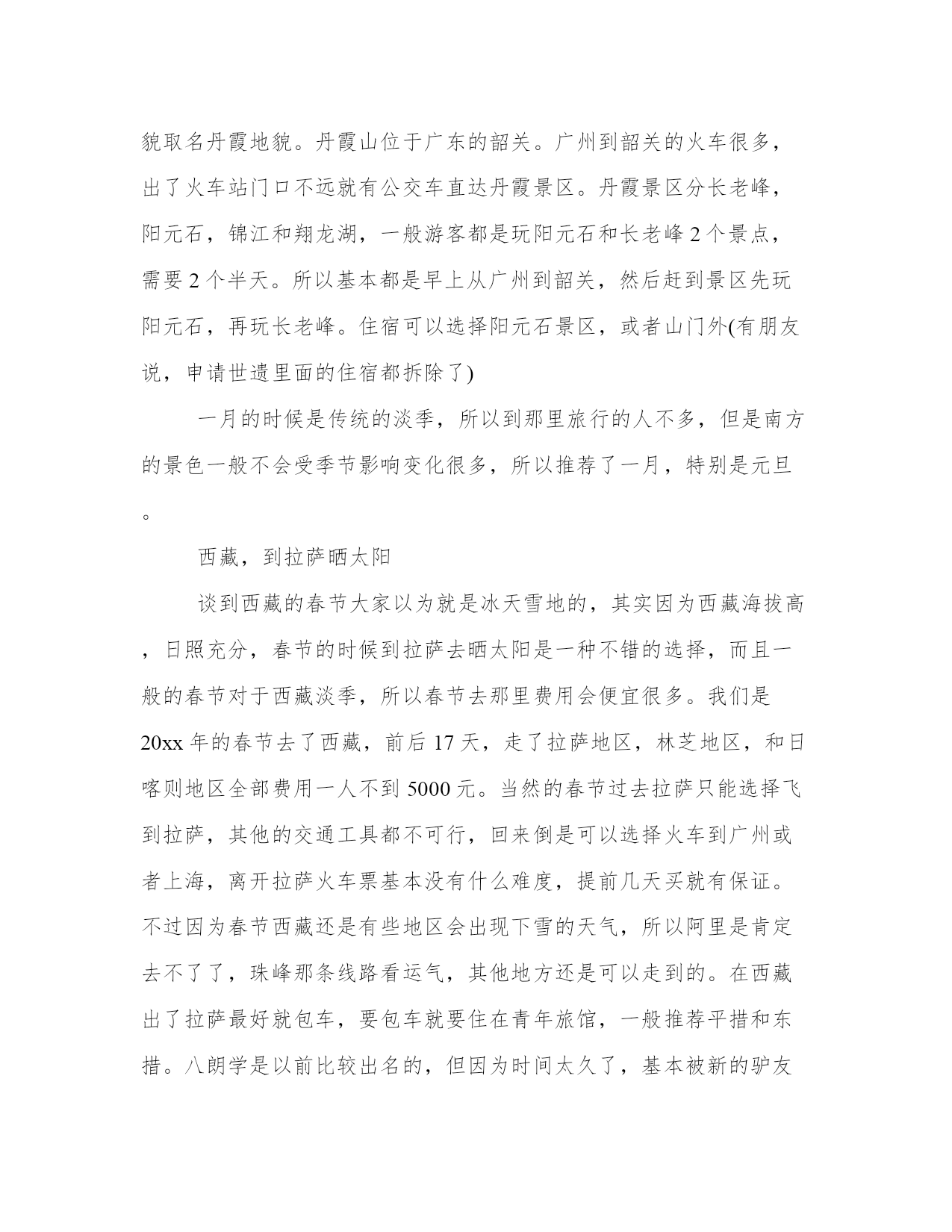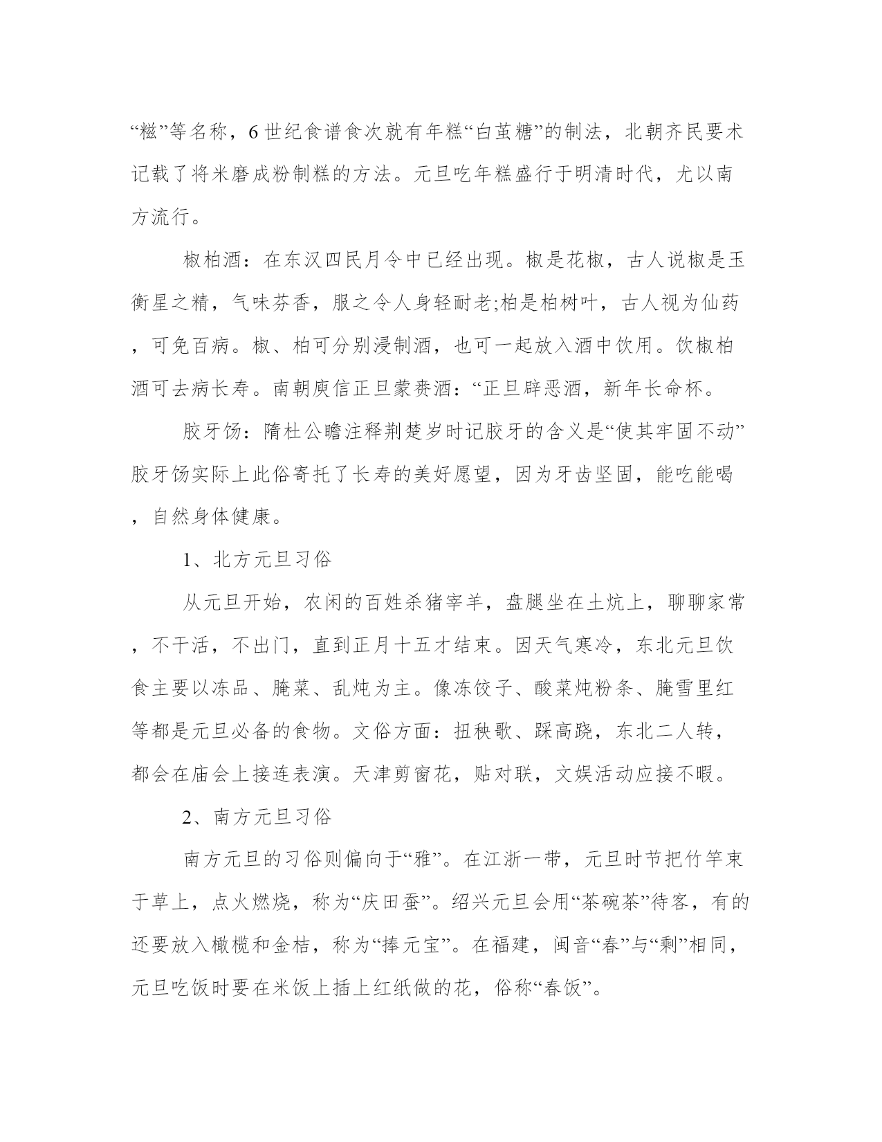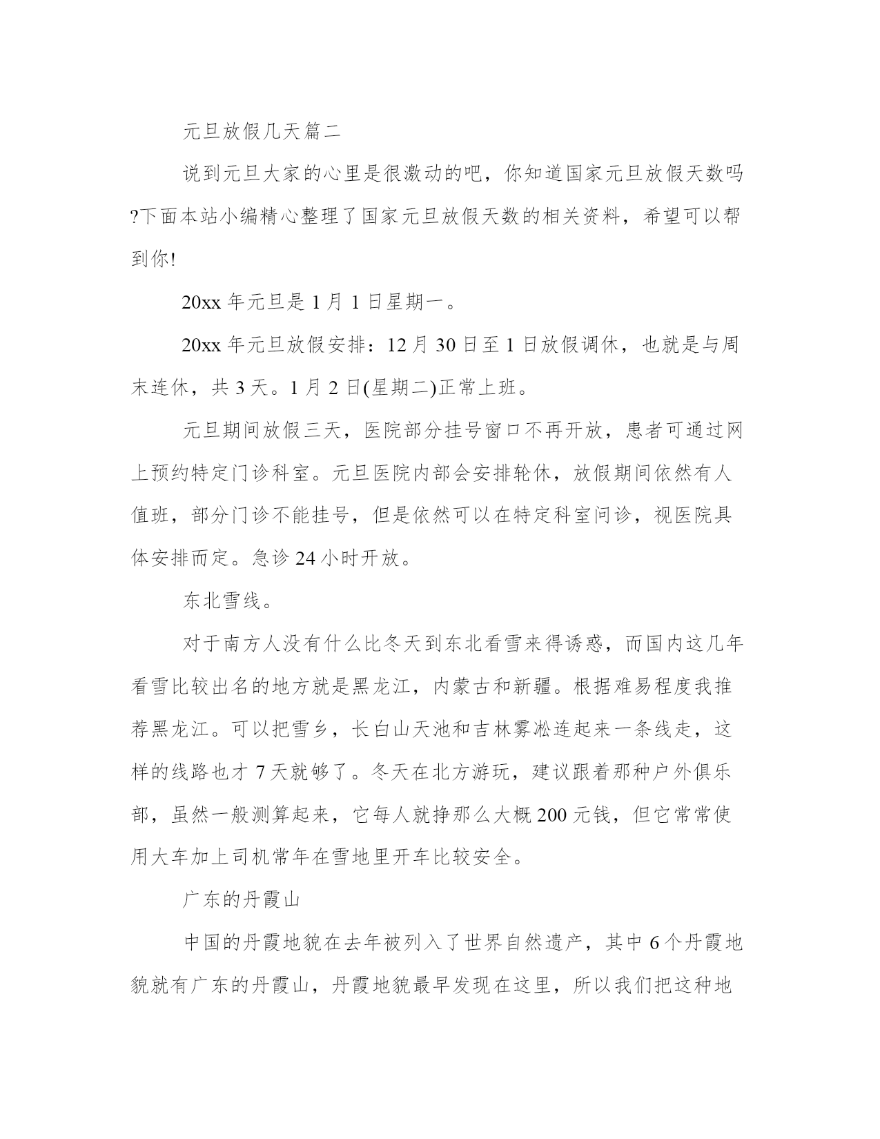 2023年元旦放假几天(5篇)无论是身处学校还是步入社会,大家都尝试过写作吧,借助写作也可以提高我们的语言组织能力。那么我们该如何写一篇较为完美的范文呢?以下是我为大家搜集的优质范文,仅供参考,一起来看看吧元旦放假几天篇一中国最早称农历正月初一为“元旦”,元是“初”、“始”的意思,旦指“日子”,元旦合称即是“初始的日子”,也就是一年的第一天。下面是小编为大家整理的2023元旦节放假几天,希望对你们有帮助。元旦因为是国家法定假日,因而每每该节日来历你的时候大家都会迎来1天假期,由于有的年份元旦与周末相连所以在这种情况下我们会有三天的假期,虽然现在有点冷,但也应出去走走看看,别浪费了这美好的时光。那这三天假期,不长不短,远的地方去不了,就选去周边几百公里范围内的景点玩玩好了。吃鸡蛋:各人吃一个鸡蛋的习俗,在吴晋间的风土记中已出现。风土记说“正旦,当生吞鸡子一枚,谓之练形”。练形是道家用语,指修炼形体,认为可以成仙。生吃鸡蛋是为了长生。五辛盘:作为元日食品最早见于吴晋间周处的风土记,说元日早晨吃五辛菜.“以助发五藏气”(玉烛宝典卷一引)。年糕:又称粘粘糕,取年年高之意。在南方用糯米制成,年糕北方则为黏黍。年糕的历史悠久,汉朝的米糕已有“稻饼”、“糕”、“饵”、“糍”等名称,6世纪食谱食次就有年糕“白茧糖”的制法,北朝齐民要术记载了将米磨成粉制糕的方法。元旦吃年糕盛行于明清时代,尤以南方流行。椒柏酒:在东汉四民月令中已经出现。椒是花椒,古人说椒是玉衡星之精,气味芬香,服之令人身轻耐老;柏是柏树叶,古人视为仙药,可免百病。椒、柏可分别浸制酒,也可一起放入酒中饮用。饮椒柏酒可去病长寿。南朝庾信正旦蒙赉酒:“正旦辟恶酒,新年长命杯。胶牙饧:隋杜公瞻注释荆楚岁时记胶牙的含义是“使其牢固不动”胶牙饧实际上此俗寄托了长寿的美好愿望,因为牙齿坚固,能吃能喝,自然身体健康。1、北方元旦习俗从元旦开始,农闲的百姓杀猪宰羊,盘腿坐在土炕上,聊聊家常,不干活,不出门,直到正月十五才结束。因天气寒冷,东北元旦饮食主要以冻品、腌菜、乱炖为主。像冻饺子、酸菜炖粉条、腌雪里红等都是元旦必备的食物。文俗方面:扭秧歌、踩高跷,东北二人转,都会在庙会上接连表演。天津剪窗花,贴对联,文娱活动应接不暇。2、南方元旦习俗南方元旦的习俗则偏向于“雅”。在江浙一带,元旦时节把竹竿束于草上,点火燃烧,称为“庆田蚕”。绍兴元旦会用“茶碗茶”待客,有的还要放入橄榄和金桔,称为“捧元宝”。在福建,闽音“春”与“剩”相同,元旦吃饭时要在米饭上插上红纸做的花,俗称“春饭”。元旦放假几天篇二说到元旦大家的心里是很激动的吧,你知道国家元旦放假天数吗?下面本站小编精心整理了国家元旦放假天数的相关资料,希望可以帮到你!20xx年元旦是1月1日星期一。20xx年元旦放假安排:12月30日至1日放假调休,也就是与周末连休,共3天。1月2日(星期二)正常上班。元旦期间放假三天,医院部分挂号窗口不再开放,患者可通过网上预约特定门诊科室。元旦医院内部会安排轮休,放假期间依然有人值班,部分门诊不能挂号,但是依然可以在特定科室问诊,视医院具体安排而定。急诊24小时开放。东北雪线。对于南方人没有什么比冬天到东北看雪来得诱惑,而国内这几年看雪比较出名的地方就是黑龙江,内蒙古和新疆。根据难易程度我推荐黑龙江。可以把雪乡,长白山天池和吉林雾凇连起来一条线走,这样的线路也才7天就够了。冬天在北方游玩,建议跟着那种户外俱乐部,虽然一般测算起来,它每人就挣那么大概200元钱,但它常常使用大车加上司机常年在雪地里开车比较安全。广东的丹霞山中国的丹霞地貌在去年被列入了世界自然遗产,其中6个丹霞地貌就有广东的丹霞山,丹霞地貌最早发现在这里,所以我们把这种地貌取名丹霞地貌。丹霞山位于广东的韶关。广州到韶关的火车很多,出了火车站门口不远就有公交车直达丹霞景区。丹霞景区分长老峰,阳元石,锦江和翔龙湖,一般游客都是玩阳元石和长老峰2个景点,需要2个半天。所以基本都是早上从广州到韶关,然后赶到景区先玩阳元石,再玩长老峰。住宿可以选择阳元石景区,或者山门外(有朋友说,申请世遗里面的住宿都拆除了)一月的时候是传统的淡季,所以到那里旅行的人不多,但是南方的景色一般不会受季节影响变化很多,所以推荐了一月,特别是元旦。西藏,到拉萨晒太阳谈到西藏的春节大家以为就是冰天雪地的,其实因为西藏海拔高,日照充分,春节的时候到拉萨去晒太阳是一种不错的选择,而且一般的春节对于西藏淡季,所以春节去那里费用会便宜很多。我们是20xx年的春节去了西藏,前后17天,走了拉萨地区,林芝地区,和日喀则地区全部费用一人不到5000元。当然的春节过去拉萨只能选择飞到拉萨,其他的交通工具都不可行,回来倒是可以选择火车到广州或者上海,离开拉萨火车票基本没有什么难度,提前几天买就有保证。