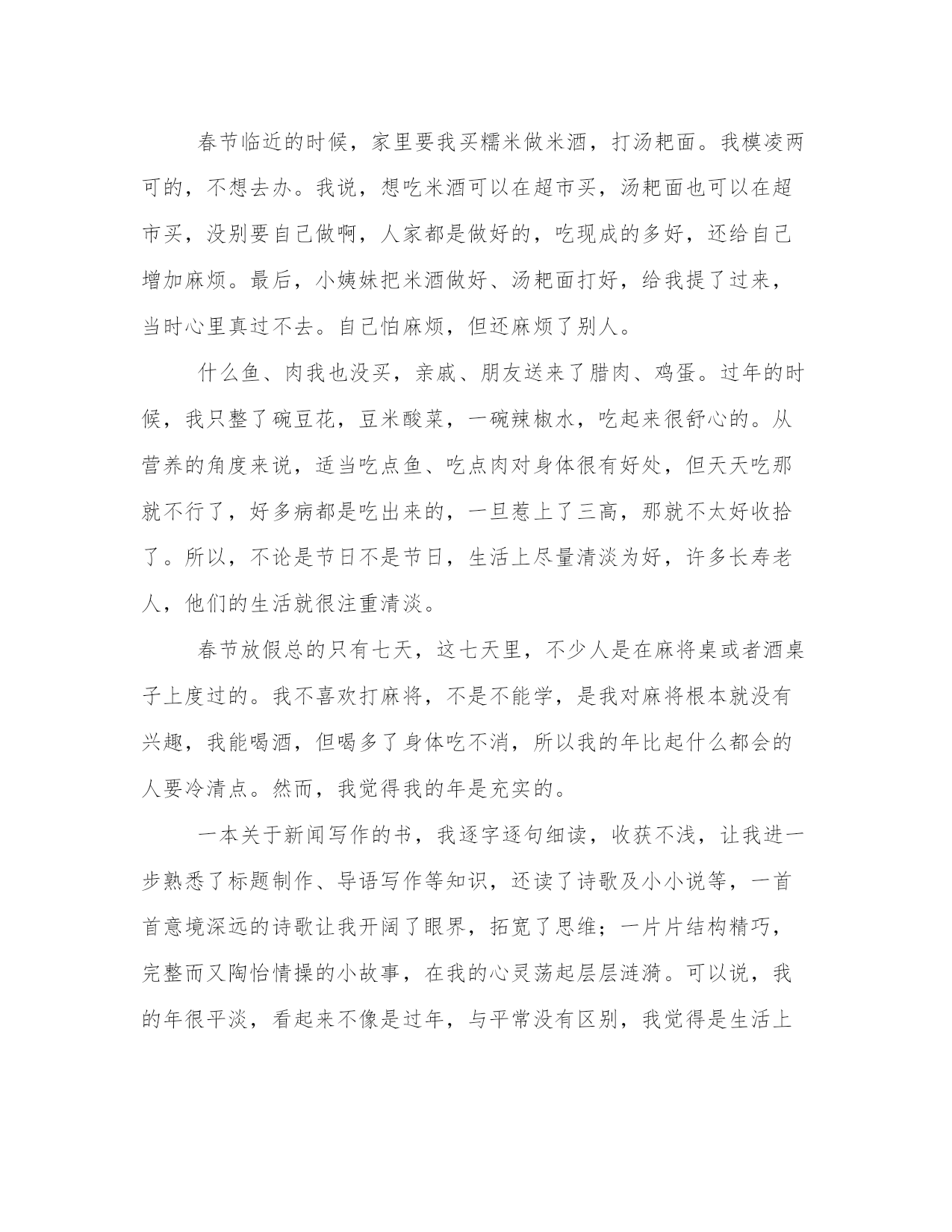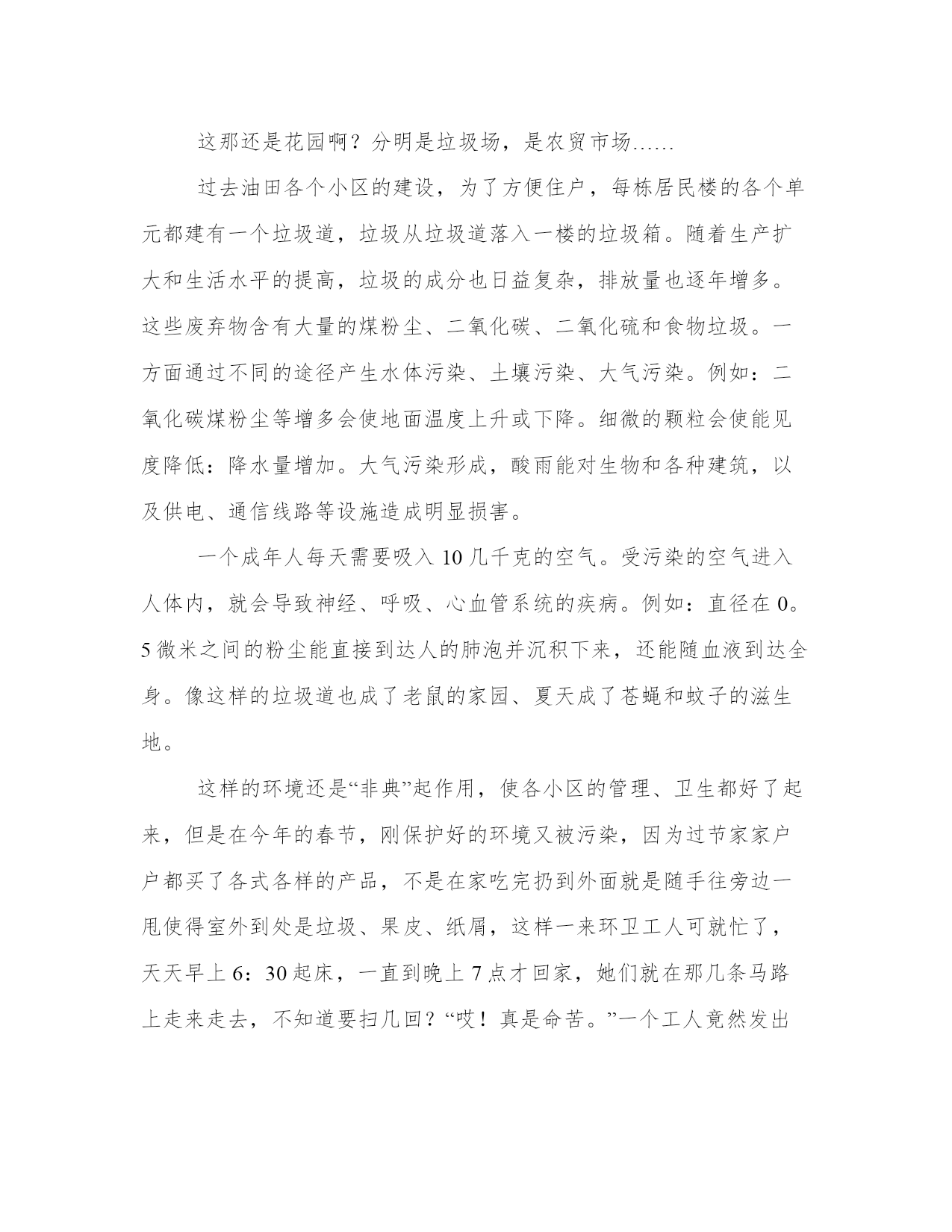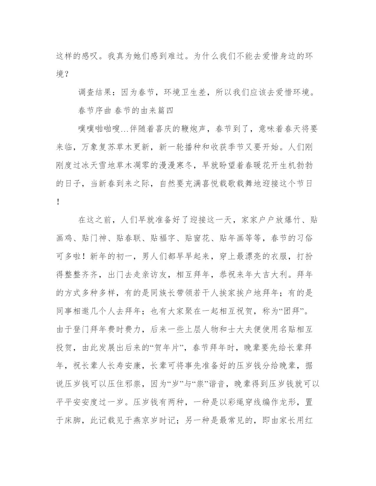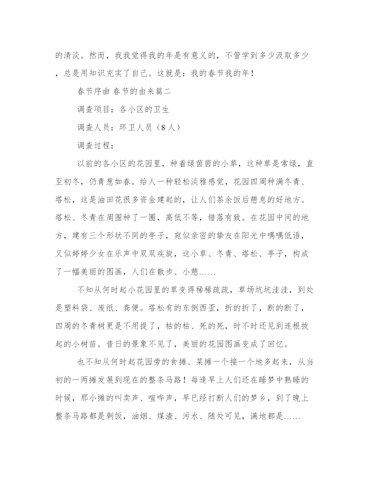 最新春节序曲春节的由来(优质四篇)在日常的学习、工作、生活中,肯定对各类范文都很熟悉吧。写范文的时候需要注意什么呢?有哪些格式需要注意呢?以下是小编为大家收集的优秀范文,欢迎大家分享阅读。春节序曲春节的由来篇一记得小时候,那时的节日气氛真的很浓,我们就盼着过年。平时,基本没有肉,没有米,许多好吃的、好玩的都得等到过春节。不像现在,猪、牛、马、羊、鸡、鸭、鹅、鱼等等,想吃什么就吃什么。那时文化娱乐就更缺乏了,到过年的时候,我们得自己上山砍青岗棒棒制作磨磨秋,用毛腾挂在树上荡秋千,自制陀螺,特别是燃放鞭炮兴趣最浓,但那时家里没什么钱,只能买少量的鞭炮,弟兄姊妹每人分一小串,要不时放两个。过完春节,开始读书了,心里会有重重的失落感,巴不得天天都过春节。现在,吃的,娱乐的都很丰富。到了春节,从远方回来的亲戚朋友,聚在一起要么划拳打马喝烧酒,边喝边叙旧,谈谈在外面的感受和村子里的变化,回忆小时候的顽皮,谈谈长大后的出息;要么在麻将桌子上砌长城,每人嘴里含这一支烟,麻将哗哗的声响,与蒙蒙烟雾交织在一起,让人觉得像走进了雾海深处的小瀑布;想看春晚的,在电视机前专心致志,不时发出开心的笑声。总之,想做什么都可以,都能实现你的想法。春节临近的时候,家里要我买糯米做米酒,打汤耙面。我模凌两可的,不想去办。我说,想吃米酒可以在超市买,汤耙面也可以在超市买,没别要自己做啊,人家都是做好的,吃现成的多好,还给自己增加麻烦。最后,小姨妹把米酒做好、汤耙面打好,给我提了过来,当时心里真过不去。自己怕麻烦,但还麻烦了别人。什么鱼、肉我也没买,亲戚、朋友送来了腊肉、鸡蛋。过年的时候,我只整了碗豆花,豆米酸菜,一碗辣椒水,吃起来很舒心的。从营养的角度来说,适当吃点鱼、吃点肉对身体很有好处,但天天吃那就不行了,好多病都是吃出来的,一旦惹上了三高,那就不太好收拾了。所以,不论是节日不是节日,生活上尽量清淡为好,许多长寿老人,他们的生活就很注重清淡。春节放假总的只有七天,这七天里,不少人是在麻将桌或者酒桌子上度过的。我不喜欢打麻将,不是不能学,是我对麻将根本就没有兴趣,我能喝酒,但喝多了身体吃不消,所以我的年比起什么都会的人要冷清点。然而,我觉得我的年是充实的。一本关于新闻写作的书,我逐字逐句细读,收获不浅,让我进一步熟悉了标题制作、导语写作等知识,还读了诗歌及小小说等,一首首意境深远的诗歌让我开阔了眼界,拓宽了思维;一片片结构精巧,完整而又陶怡情操的小故事,在我的心灵荡起层层涟漪。可以说,我的年很平淡,看起来不像是过年,与平常没有区别,我觉得是生活上的清淡。然而,我我觉得我的年是有意义的,不管学到多少汲取多少,总是用知识充实了自己。这就是:我的春节我的年!春节序曲春节的由来篇二调查项目:各小区的卫生调查人员:环卫人员(8人)调查过程:以前的各小区的花园里,种着绿茵茵的小草,这种草是常绿,直至初冬,仍青葱如春。给人一种轻松淡雅感觉,花园四周种满冬青、塔松,这是油田花很多资金建起的,让人们茶余饭后憩息的好地方。塔松、冬青在周围种了一圈,高低不等,错落有致。在花园中间的地方,建有三个形状不同的亭子,宛似亲密的挚友在阳光中喁喁低语,又似婷婷少女在乐声中双双疾旋,这小草、冬青、塔松、亭子,构成了一幅美丽的图画,人们在散步、小憩……不知从何时起小花园里的草变得稀稀疏疏,草场坑坑洼洼,到处是塑料袋、废纸、粪便。塔松有的东倒西歪,折的折了,断的断了,四周的冬青树更是不用提了,枯的枯、死的死,时不时还见到连根拔起的小树苗。昔日的景象不见了,美丽的花园图画变成了回忆。也不知从何时起花园旁的食摊、菜摊一个接一个地多起来,从当初的一两摊发展到现在的整条马路!每逢早上人们还在睡梦中熟睡的时候,那小摊的叫卖声、喧哗声,早已经打断人们的梦乡,到了晚上整条马路都是剩饭,油烟、煤渣、污水、随处可见,满地都是……这那还是花园啊?分明是垃圾场,是农贸市场……过去油田各个小区的建设,为了方便住户,每栋居民楼的各个单元都建有一个垃圾道,垃圾从垃圾道落入一楼的垃圾箱。随着生产扩大和生活水平的提高,垃圾的成分也日益复杂,排放量也逐年增多。这些废弃物含有大量的煤粉尘、二氧化碳、二氧化硫和食物垃圾。一方面通过不同的途径产生水体污染、土壤污染、大气污染。例如:二氧化碳煤粉尘等增多会使地面温度上升或下降。细微的颗粒会使能见度降低:降水量增加。大气污染形成,酸雨能对生物和各种建筑,以及供电、通信线路等设施造成明显损害。一个成年人每天需要吸入10几千克的空气。受污染的空气进入人体内,就会导致神经、呼吸、心血管系统的疾病。例如:直径在0。5微米之间的粉尘能直接到达人的肺泡并沉积下来,还能随血液到达全身。像这样的垃圾道也成了老鼠的家园、夏天成了苍蝇和蚊子的滋生地。这样的环境还是“非典”起作用,使各小区的管理、卫生都好了起来,但