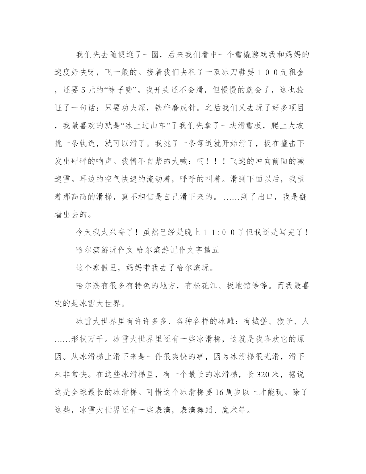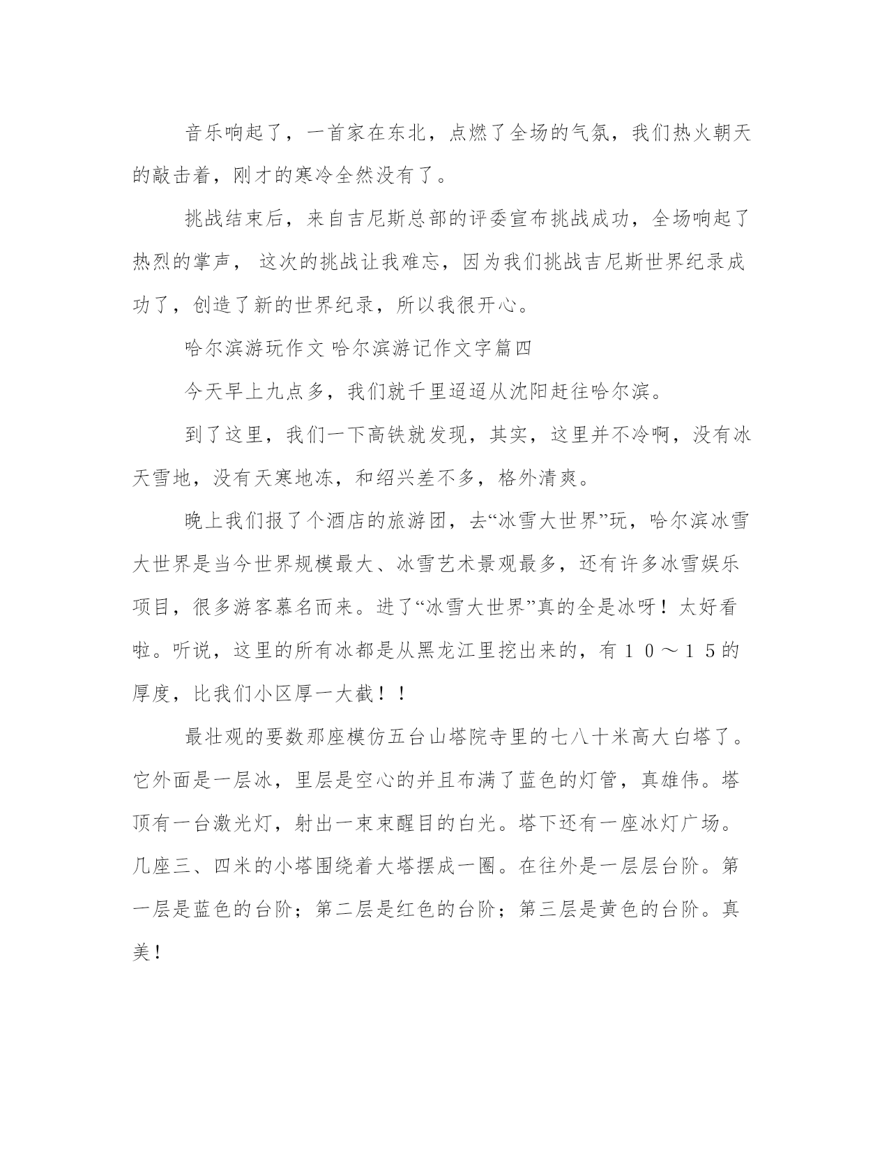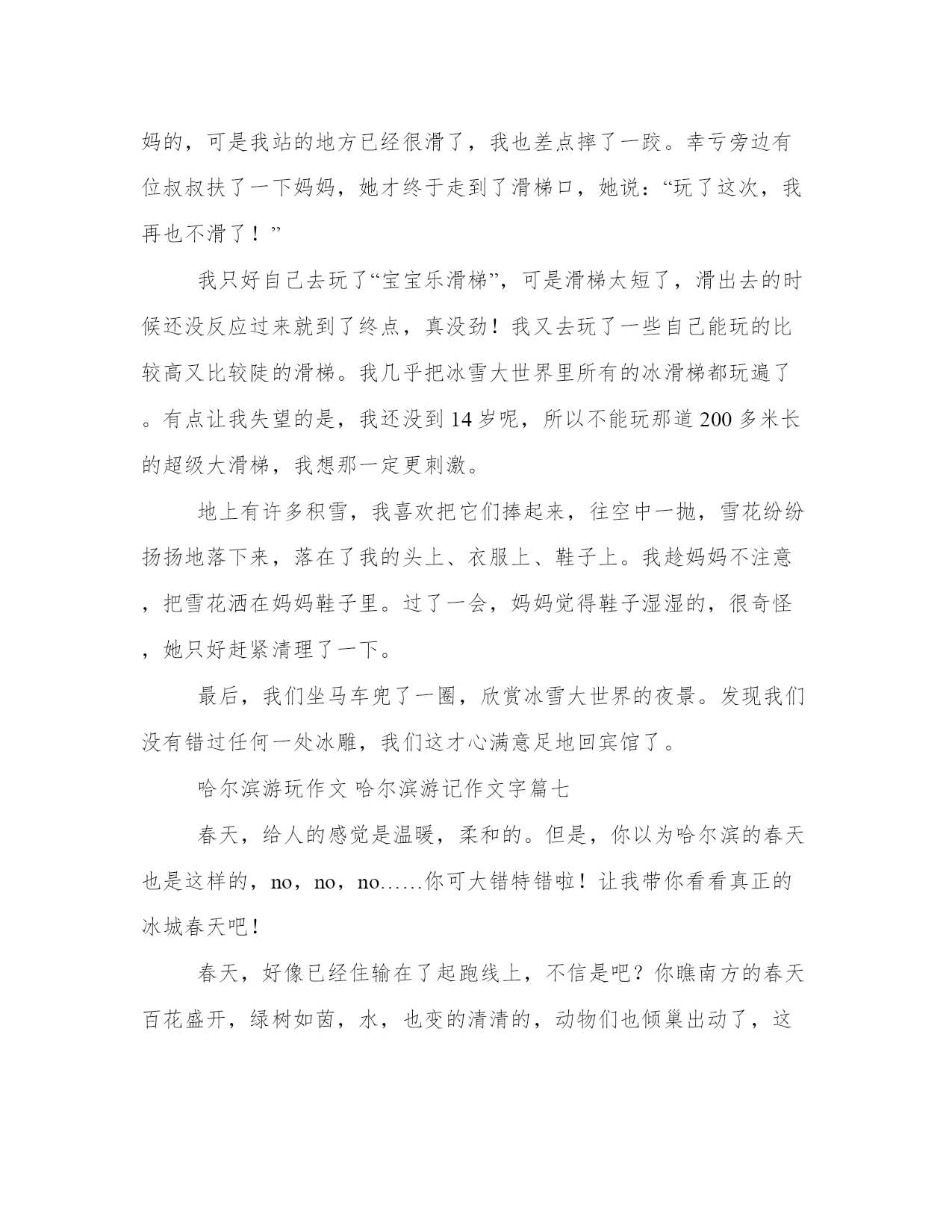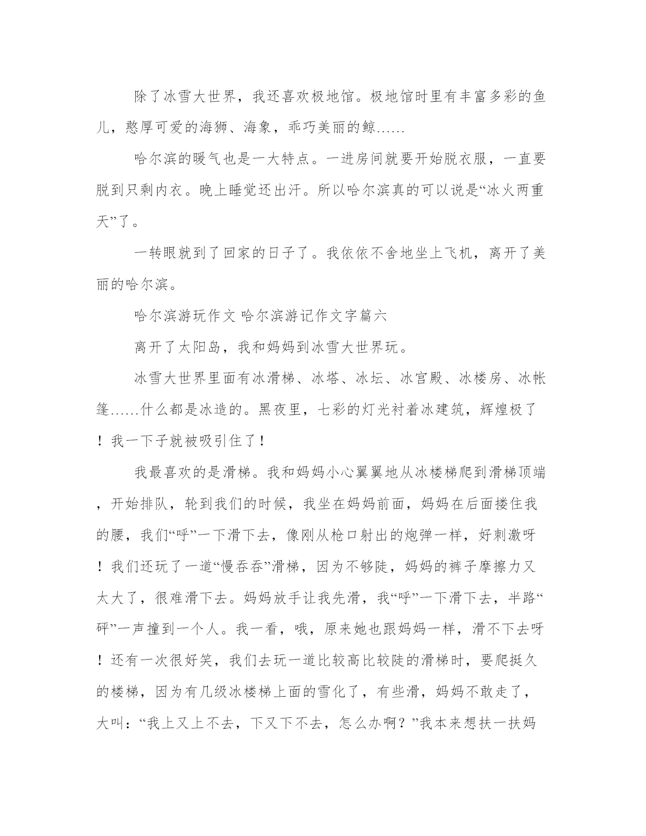 2023年哈尔滨游玩作文哈尔滨游记作文字模板(九篇)无论是身处学校还是步入社会,大家都尝试过写作吧,借助写作也可以提高我们的语言组织能力。大家想知道怎么样才能写一篇比较优质的范文吗?以下是我为大家搜集的优质范文,仅供参考,一起来看看吧哈尔滨游玩作文哈尔滨游记作文字篇二1月26日上午,我们一家三口来到哈尔滨参加冰雪打击乐四人挑战赛,这是一项挑战吉尼斯世界纪录的比赛,我们既要挑战风雪严寒,又要挑战能否冲击吉尼斯世界纪录成功。比赛地点在松花江北冰雪大世界里,到达集合地点后,我看到来自省内省外的许多支代表队,省内的有大庆,齐齐哈尔代表队,省外的有北京大连代表队。我是佳木斯代表队的比赛的选手,比赛达到千人,集合完毕后,我们按顺序来到了比赛场地,场地是用冰雕的。在天坛下面,摆放着一排排整齐的架子鼓。下午一点,正赛正式开始大会由著名主持人姜鹏主持,由省内著名的音乐家当评委,还邀请了吉尼斯总部代表,大会由黑龙江省电视台全程录制直播。我们一千多名选手坐在各自的位置上,我打的是架子鼓,虽然外面天气很冷,冻的脸通红,手脚已经有些麻木了,但是我依然等待主持人宣布比赛开始。音乐响起了,一首家在东北,点燃了全场的气氛,我们热火朝天的敲击着,刚才的寒冷全然没有了。挑战结束后,来自吉尼斯总部的评委宣布挑战成功,全场响起了热烈的掌声,这次的挑战让我难忘,因为我们挑战吉尼斯世界纪录成功了,创造了新的世界纪录,所以我很开心。哈尔滨游玩作文哈尔滨游记作文字篇四今天早上九点多,我们就千里迢迢从沈阳赶往哈尔滨。到了这里,我们一下高铁就发现,其实,这里并不冷啊,没有冰天雪地,没有天寒地冻,和绍兴差不多,格外清爽。晚上我们报了个酒店的旅游团,去“冰雪大世界”玩,哈尔滨冰雪大世界是当今世界规模最大、冰雪艺术景观最多,还有许多冰雪娱乐项目,很多游客慕名而来。进了“冰雪大世界”真的全是冰呀!太好看啦。听说,这里的所有冰都是从黑龙江里挖出来的,有10~15的厚度,比我们小区厚一大截!!最壮观的要数那座模仿五台山塔院寺里的七八十米高大白塔了。它外面是一层冰,里层是空心的并且布满了蓝色的灯管,真雄伟。塔顶有一台激光灯,射出一束束醒目的白光。塔下还有一座冰灯广场。几座三、四米的小塔围绕着大塔摆成一圈。在往外是一层层台阶。第一层是蓝色的台阶;第二层是红色的台阶;第三层是黄色的台阶。真美!我们先去随便逛了一圈,后来我们看中一个雪橇游戏我和妈妈的速度好快呀,飞一般的。接着我们去租了一双冰刀鞋要100元租金,还要5元的“袜子费”。我开头还不会滑,但慢慢的就会了,这也验证了一句话:只要功夫深,铁杵磨成针。之后我们又去玩了好多项目,我最喜欢的就是“冰上过山车”了我们先拿了一块滑雪板,爬上大坡挑一条轨道,就可以滑了。我挑了一条弯道就开始滑了,板在撞击下发出砰砰的响声。我情不自禁的大喊:啊!!!飞速的冲向前面的减速雪。耳边的空气快速的流动着,呼呼的叫着。滑到下面以后,我望着那高高的滑梯,真不相信是自己滑下来的。……到了出口,我是翻墙出去的。今天我太兴奋了!虽然已经是晚上11:00了但我还是写完了!哈尔滨游玩作文哈尔滨游记作文字篇五这个寒假里,妈妈带我去了哈尔滨玩。哈尔滨有很多有特色的地方,有松花江、极地馆等等。而我最喜欢的是冰雪大世界。冰雪大世界里有许许多多、各种各样的冰雕:有城堡、猴子、人……形状万千。冰雪大世界里还有一些冰滑梯,这就是我喜欢它的原因。从冰滑梯上滑下来是一件很爽快的事,因为冰滑梯很光滑,滑下来非常快。在这些冰滑梯里,有一个最长的冰滑梯,长320米,据说这是全球最长的冰滑梯。可惜这个冰滑梯要16周岁以上才能玩。除了这些,冰雪大世界还有一些表演,表演舞蹈、魔术等。除了冰雪大世界,我还喜欢极地馆。极地馆时里有丰富多彩的鱼儿,憨厚可爱的海狮、海象,乖巧美丽的鲸……哈尔滨的暖气也是一大特点。一进房间就要开始脱衣服,一直要脱到只剩内衣。晚上睡觉还出汗。所以哈尔滨真的可以说是“冰火两重天”了。一转眼就到了回家的日子了。我依依不舍地坐上飞机,离开了美丽的哈尔滨。哈尔滨游玩作文哈尔滨游记作文字篇六离开了太阳岛,我和妈妈到冰雪大世界玩。冰雪大世界里面有冰滑梯、冰塔、冰坛、冰宫殿、冰楼房、冰帐篷……什么都是冰造的。黑夜里,七彩的灯光衬着冰建筑,辉煌极了!我一下子就被吸引住了!我最喜欢的是滑梯。我和妈妈小心翼翼地从冰楼梯爬到滑梯顶端,开始排队,轮到我们的时候,我坐在妈妈前面,妈妈在后面搂住我的腰,我们“呼”一下滑下去,像刚从枪口射出的炮弹一样,好刺激呀!我们还玩了一道“慢吞吞”滑梯,因为不够陡,妈妈的裤子摩擦力又太大了,很难滑下去。妈妈放手让我先滑,我“呼”一下滑下去,半路“砰”一声撞到一个人。我一看,哦,原来她也跟妈妈一样,滑不下去呀!还有一次很好笑,我们去玩一道比较高比较陡的滑梯时,要爬挺久的楼梯,因为有
