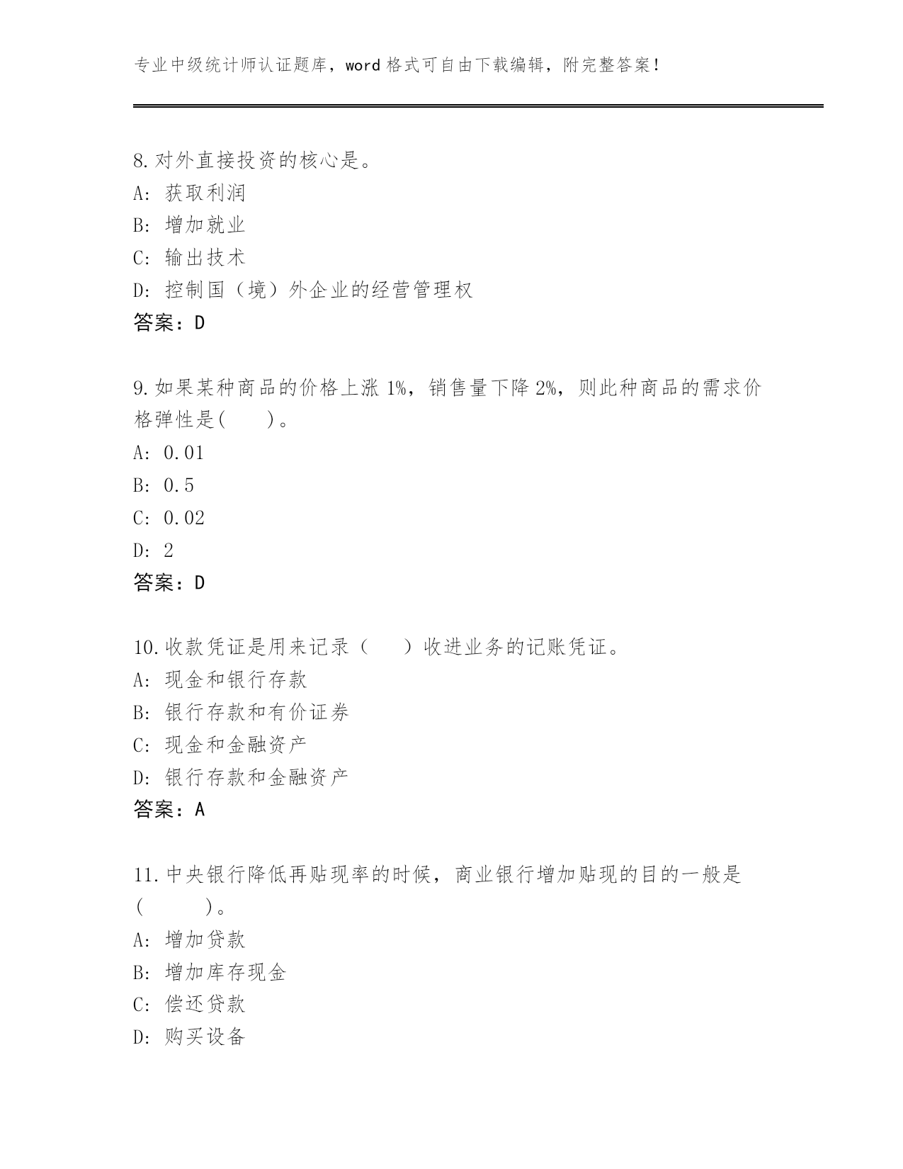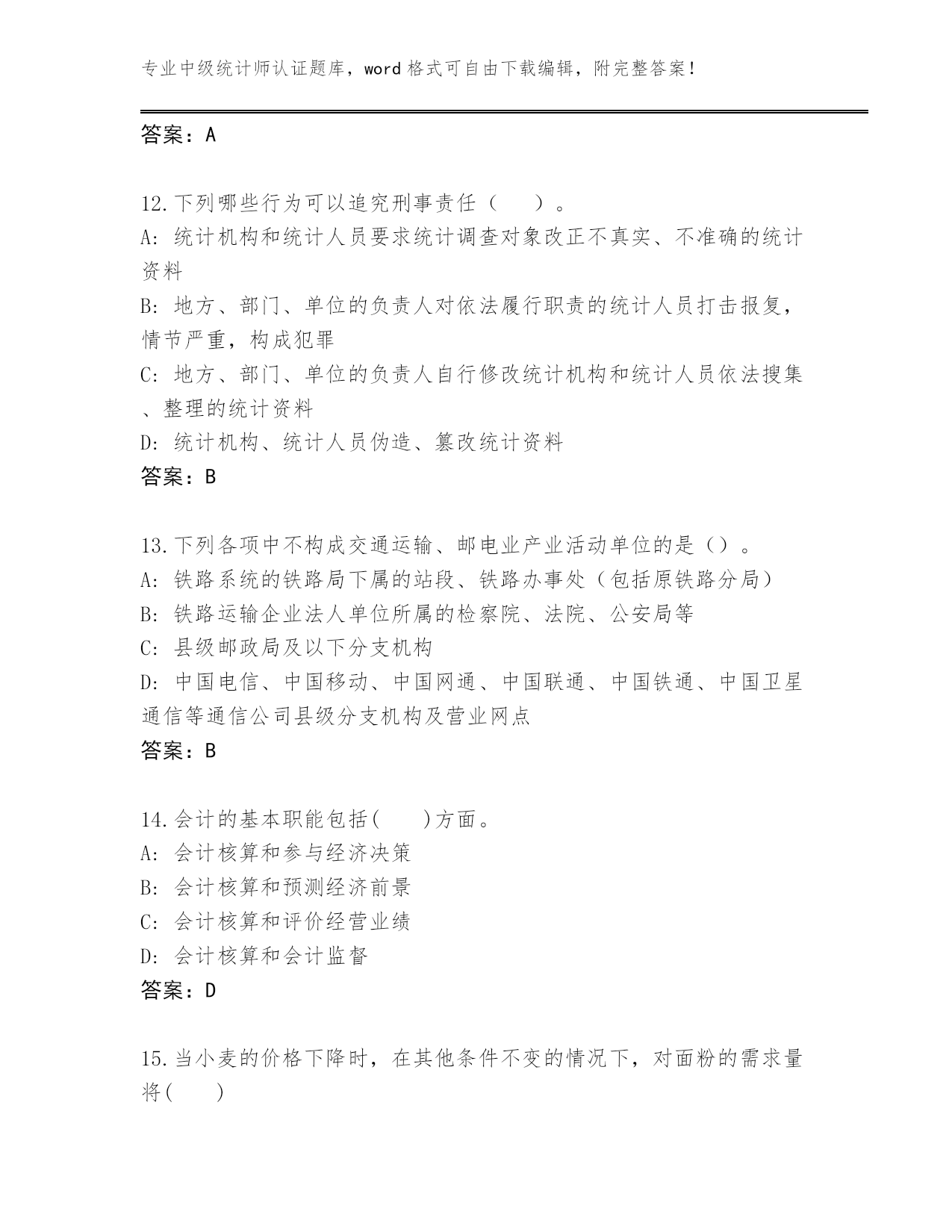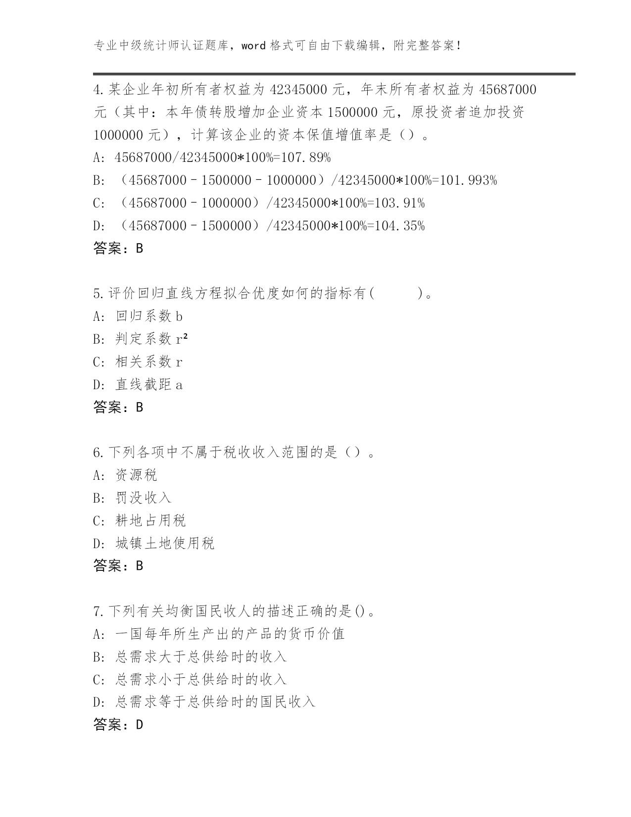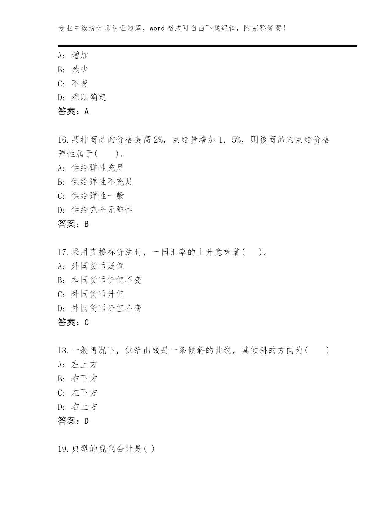 专业中级统计师认证题库,word格式可自由下载编辑,附完整答案!整理黑龙江省绥棱县中级统计师认证(B卷)第I部分单选题(100题)1.货币的交易需求可由()函数关系表达。A:L=f(r)B:L=f(p)C:L=f(y)D:L=f(y,r)答案:C2.下列单位中属于外国常住单位的是()。A:驻华美国大使馆B:在中国经营的沃尔玛C:中国人春节在国外度假D:中国驻英国大使馆答案:A3.记消费为c,投资为l,政府购买为G,税收为T,政府转移支付为Tr,则三部门国民收入的均衡公式为()A:Y=B:Y=C:#NAME?D:Y=答案:C4.某企业年初所有者权益为42345000元,年末所有者权益为45687000元(其中:本年债转股增加企业资本1500000元,原投资者追加投资1000000元),计算该企业的资本保值增值率是()。A:45687000/42345000*100%=107.89%B:(45687000–1500000–1000000)/42345000*100%=101.993%C:(45687000–1000000)/42345000*100%=103.91%D:(45687000–1500000)/42345000*100%=104.35%答案:B5.评价回归直线方程拟合优度如何的指标有()。A:回归系数bB:判定系数r²C:相关系数rD:直线截距a答案:B6.下列各项中不属于税收收入范围的是()。A:资源税B:罚没收入C:耕地占用税D:城镇土地使用税答案:B7.下列有关均衡国民收人的描述正确的是()。A:一国每年所生产出的产品的货币价值B:总需求大于总供给时的收入C:总需求小于总供给时的收入D:总需求等于总供给时的国民收入答案:D8.对外直接投资的核心是。A:获取利润B:增加就业C:输出技术D:控制国(境)外企业的经营管理权答案:D9.如果某种商品的价格上涨1%,销售量下降2%,则此种商品的需求价格弹性是()。A:0.01B:0.5C:0.02D:2答案:D10.收款凭证是用来记录()收进业务的记账凭证。A:现金和银行存款B:银行存款和有价证券C:现金和金融资产D:银行存款和金融资产答案:A11.中央银行降低再贴现率的时候,商业银行增加贴现的目的一般是()。A:增加贷款B:增加库存现金C:偿还贷款D:购买设备答案:A12.下列哪些行为可以追究刑事责任()。A:统计机构和统计人员要求统计调查对象改正不真实、不准确的统计资料B:地方、部门、单位的负责人对依法履行职责的统计人员打击报复,情节严重,构成犯罪C:地方、部门、单位的负责人自行修改统计机构和统计人员依法搜集、整理的统计资料D:统计机构、统计人员伪造、篡改统计资料答案:B13.下列各项中不构成交通运输、邮电业产业活动单位的是()。A:铁路系统的铁路局下属的站段、铁路办事处(包括原铁路分局)B:铁路运输企业法人单位所属的检察院、法院、公安局等C:县级邮政局及以下分支机构D:中国电信、中国移动、中国网通、中国联通、中国铁通、中国卫星通信等通信公司县级分支机构及营业网点答案:B14.会计的基本职能包括()方面。A:会计核算和参与经济决策B:会计核算和预测经济前景C:会计核算和评价经营业绩D:会计核算和会计监督答案:D15.当小麦的价格下降时,在其他条件不变的情况下,对面粉的需求量将()A:增加B:减少C:不变D:难以确定答案:A16.某种商品的价格提高2%,供给量增加1.5%,则该商品的供给价格弹性属于()。A:供给弹性充足B:供给弹性不充足C:供给弹性一般D:供给完全无弹性答案:B17.采用直接标价法时,一国汇率的上升意味着()。A:外国货币贬值B:本国货币价值不变C:外国货币升值D:外国货币价值不变答案:C18.一般情况下,供给曲线是一条倾斜的曲线,其倾斜的方向为()A:左上方B:右下方C:左下方D:右上方答案:D19.典型的现代会计是()A:商业会计B:工业会计C:企业会计D:农业会计答案:C20.甲公司2013年年末结账后部分科目余额如下:“在途物资”为2万元,“原材料”为10万元,“周转材料”为1万元,“库存商品”为20万元,“生产成本”为10万元,“存货跌价准备”为1万元,“工程物资”为15万元。该企业2013年12月31日资产负债表中的“存货”项目金额为()万元。A:41B:43C:42D:40答案:C21.在回归分析中,自变量同因变量的地位不同,两变量x和y中,y对x回归和x对y回归()。A:是同一问题B:完全不同C:不一定相同D:有联系但不是一个问题答案:D22.企业购人不需要安装的生产设备一台,取得的专用发票上注明的价款为23400元,发生运费1000元,则计入固定资产的金额为()元。A:22400B:23400C:24400D:21000答案:C23.财