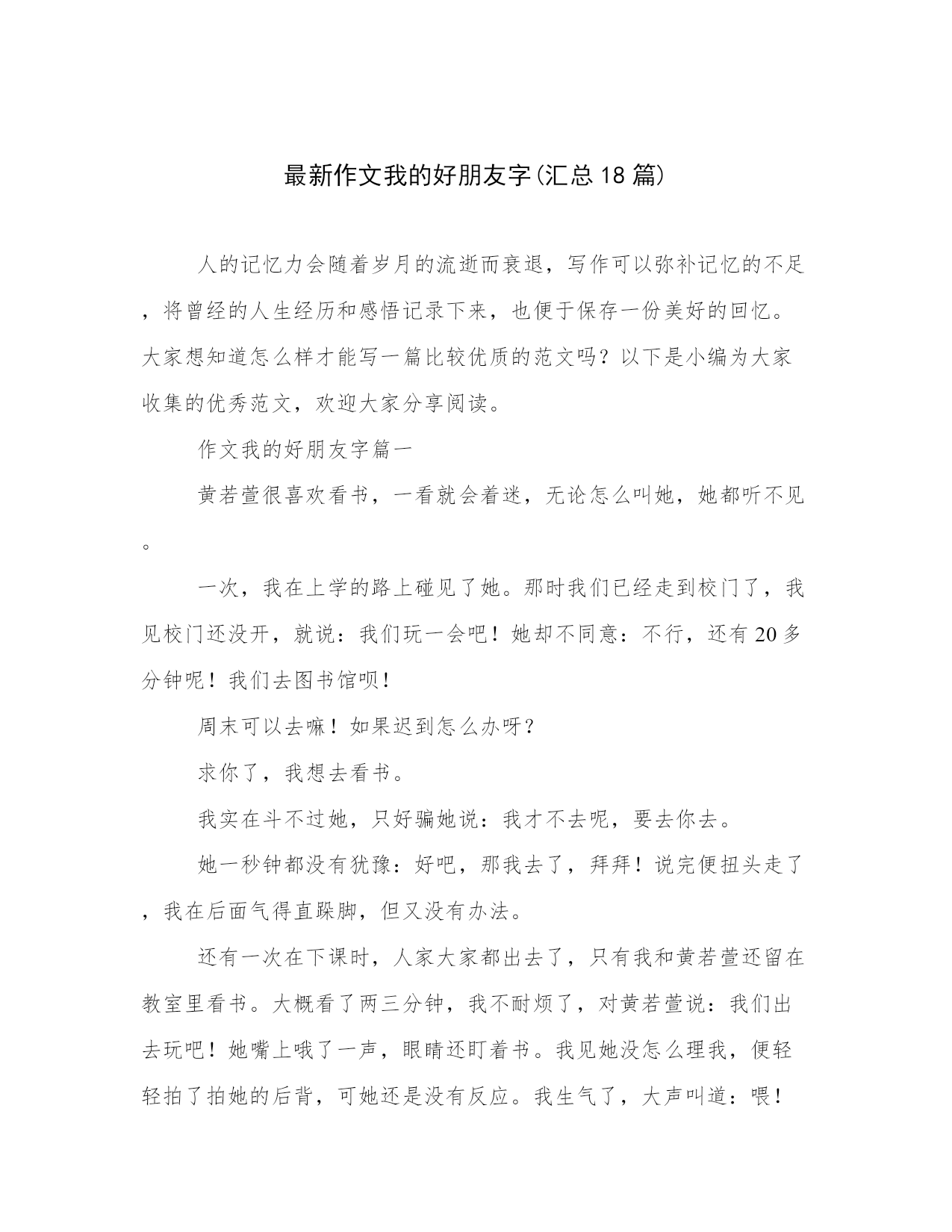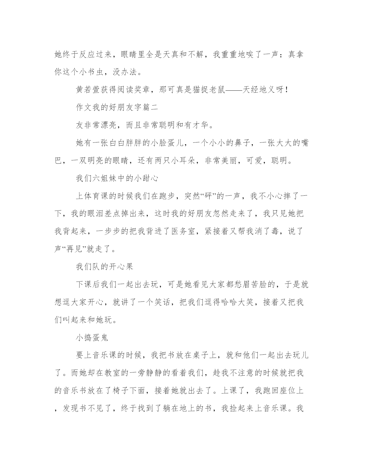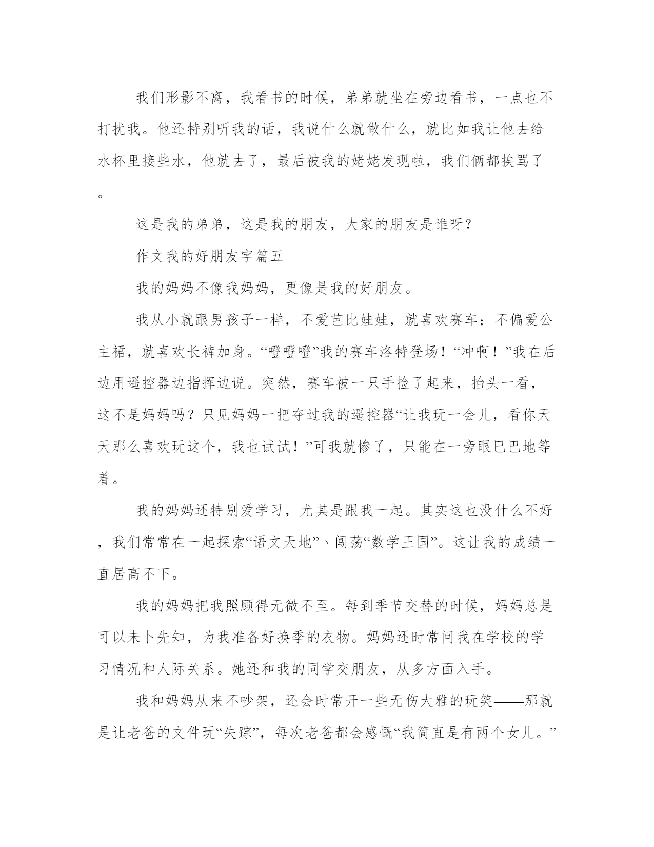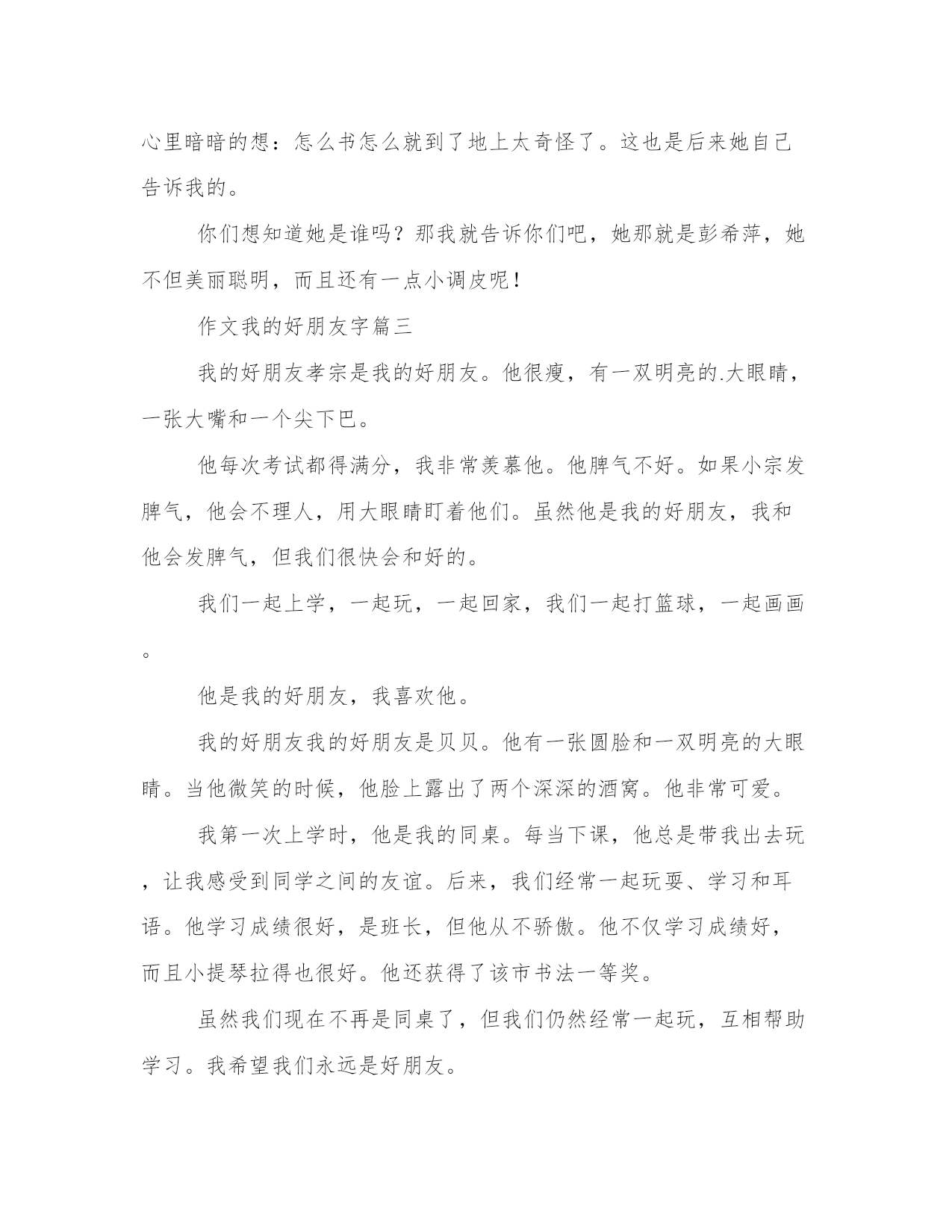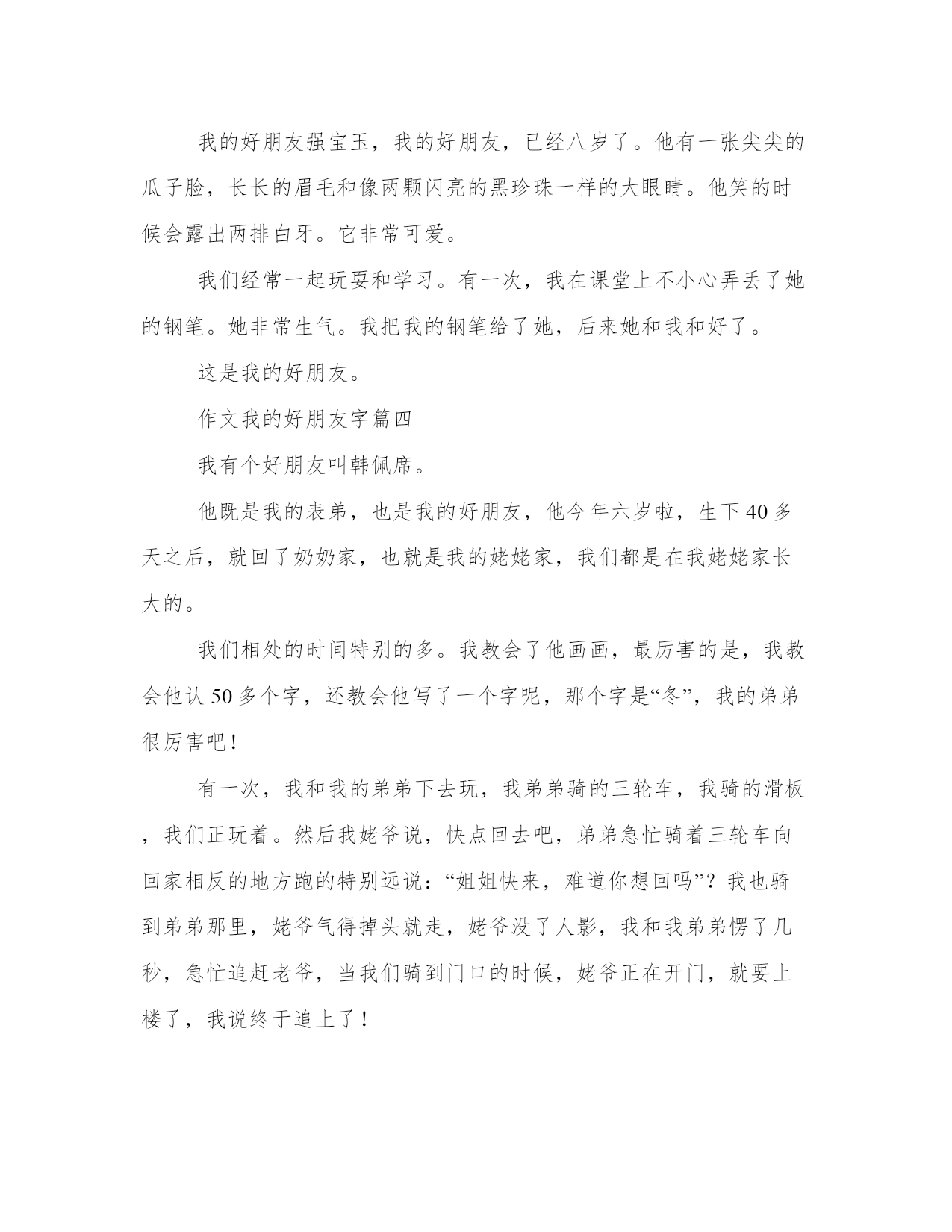 最新作文我的好朋友字(汇总18篇)人的记忆力会随着岁月的流逝而衰退,写作可以弥补记忆的不足,将曾经的人生经历和感悟记录下来,也便于保存一份美好的回忆。大家想知道怎么样才能写一篇比较优质的范文吗?以下是小编为大家收集的优秀范文,欢迎大家分享阅读。作文我的好朋友字篇一黄若萱很喜欢看书,一看就会着迷,无论怎么叫她,她都听不见。一次,我在上学的路上碰见了她。那时我们已经走到校门了,我见校门还没开,就说:我们玩一会吧!她却不同意:不行,还有20多分钟呢!我们去图书馆呗!周末可以去嘛!如果迟到怎么办呀?求你了,我想去看书。我实在斗不过她,只好骗她说:我才不去呢,要去你去。她一秒钟都没有犹豫:好吧,那我去了,拜拜!说完便扭头走了,我在后面气得直跺脚,但又没有办法。还有一次在下课时,人家大家都出去了,只有我和黄若萱还留在教室里看书。大概看了两三分钟,我不耐烦了,对黄若萱说:我们出去玩吧!她嘴上哦了一声,眼睛还盯着书。我见她没怎么理我,便轻轻拍了拍她的后背,可她还是没有反应。我生气了,大声叫道:喂!她终于反应过来,眼睛里全是天真和不解,我重重地唉了一声:真拿你这个小书虫,没办法。黄若萱获得阅读奖章,那可真是猫捉老鼠——天经地义呀!作文我的好朋友字篇二友非常漂亮,而且非常聪明和有才华。她有一张白白胖胖的小脸蛋儿,一个小小的鼻子,一张大大的嘴巴,一双明亮的眼睛,还有两只小耳朵,非常美丽,可爱,聪明。我们六姐妹中的小甜心上体育课的时候我们在跑步,突然“砰”的一声,我不小心摔了一下,我的眼泪差点掉出来,这时我的好朋友忽然走来了,我只见她把我背起来,一步步的把我背进了医务室,紧接着又帮我消了毒,说了声“再见”就走了。我们队的开心果下课后我们一起出去玩,可是她看见大家都愁眉苦脸的,于是就想逗大家开心,就讲了一个笑话,把我们逗得哈哈大笑,接着又把我们叫起来和她玩。小捣蛋鬼要上音乐课的时候,我把书放在桌子上,就和他们一起出去玩儿了。而她却在教室的一旁静静的看着我们,趁我不注意的时候就把我的音乐书放在了椅子下面,接着她就出去了。上课了,我跑回座位上,发现书不见了,终于找到了躺在地上的书,我捡起来上音乐课。我心里暗暗的想:怎么书怎么就到了地上太奇怪了。这也是后来她自己告诉我的。你们想知道她是谁吗?那我就告诉你们吧,她那就是彭希萍,她不但美丽聪明,而且还有一点小调皮呢!作文我的好朋友字篇三我的好朋友孝宗是我的好朋友。他很瘦,有一双明亮的.大眼睛,一张大嘴和一个尖下巴。他每次考试都得满分,我非常羡慕他。他脾气不好。如果小宗发脾气,他会不理人,用大眼睛盯着他们。虽然他是我的好朋友,我和他会发脾气,但我们很快会和好的。我们一起上学,一起玩,一起回家,我们一起打篮球,一起画画。他是我的好朋友,我喜欢他。我的好朋友我的好朋友是贝贝。他有一张圆脸和一双明亮的大眼睛。当他微笑的时候,他脸上露出了两个深深的酒窝。他非常可爱。我第一次上学时,他是我的同桌。每当下课,他总是带我出去玩,让我感受到同学之间的友谊。后来,我们经常一起玩耍、学习和耳语。他学习成绩很好,是班长,但他从不骄傲。他不仅学习成绩好,而且小提琴拉得也很好。他还获得了该市书法一等奖。虽然我们现在不再是同桌了,但我们仍然经常一起玩,互相帮助学习。我希望我们永远是好朋友。我的好朋友强宝玉,我的好朋友,已经八岁了。他有一张尖尖的瓜子脸,长长的眉毛和像两颗闪亮的黑珍珠一样的大眼睛。他笑的时候会露出两排白牙。它非常可爱。我们经常一起玩耍和学习。有一次,我在课堂上不小心弄丢了她的钢笔。她非常生气。我把我的钢笔给了她,后来她和我和好了。这是我的好朋友。作文我的好朋友字篇四我有个好朋友叫韩佩席。他既是我的表弟,也是我的好朋友,他今年六岁啦,生下40多天之后,就回了奶奶家,也就是我的姥姥家,我们都是在我姥姥家长大的。我们相处的时间特别的多。我教会了他画画,最厉害的是,我教会他认50多个字,还教会他写了一个字呢,那个字是“冬”,我的弟弟很厉害吧!有一次,我和我的弟弟下去玩,我弟弟骑的三轮车,我骑的滑板,我们正玩着。然后我姥爷说,快点回去吧,弟弟急忙骑着三轮车向回家相反的地方跑的特别远说:“姐姐快来,难道你想回吗”?我也骑到弟弟那里,姥爷气得掉头就走,姥爷没了人影,我和我弟弟愣了几秒,急忙追赶老爷,当我们骑到门口的时候,姥爷正在开门,就要上楼了,我说终于追上了!我们形影不离,我看书的时候,弟弟就坐在旁边看书,一点也不打扰我。他还特别听我的话,我说什么就做什么,就比如我让他去给水杯里接些水,他就去了,最后被我的姥姥发现啦,我们俩都挨骂了。这是我的弟弟,这是我的朋友,大家的朋友是谁呀?作文我的好朋友字篇五我的妈妈不像我妈妈,更像是我的好朋友。我从小就跟男孩子一样,不爱芭比娃娃,就喜欢赛车;不偏爱公主裙,就喜欢长裤加身。“噔噔噔”我的赛车洛特登场!