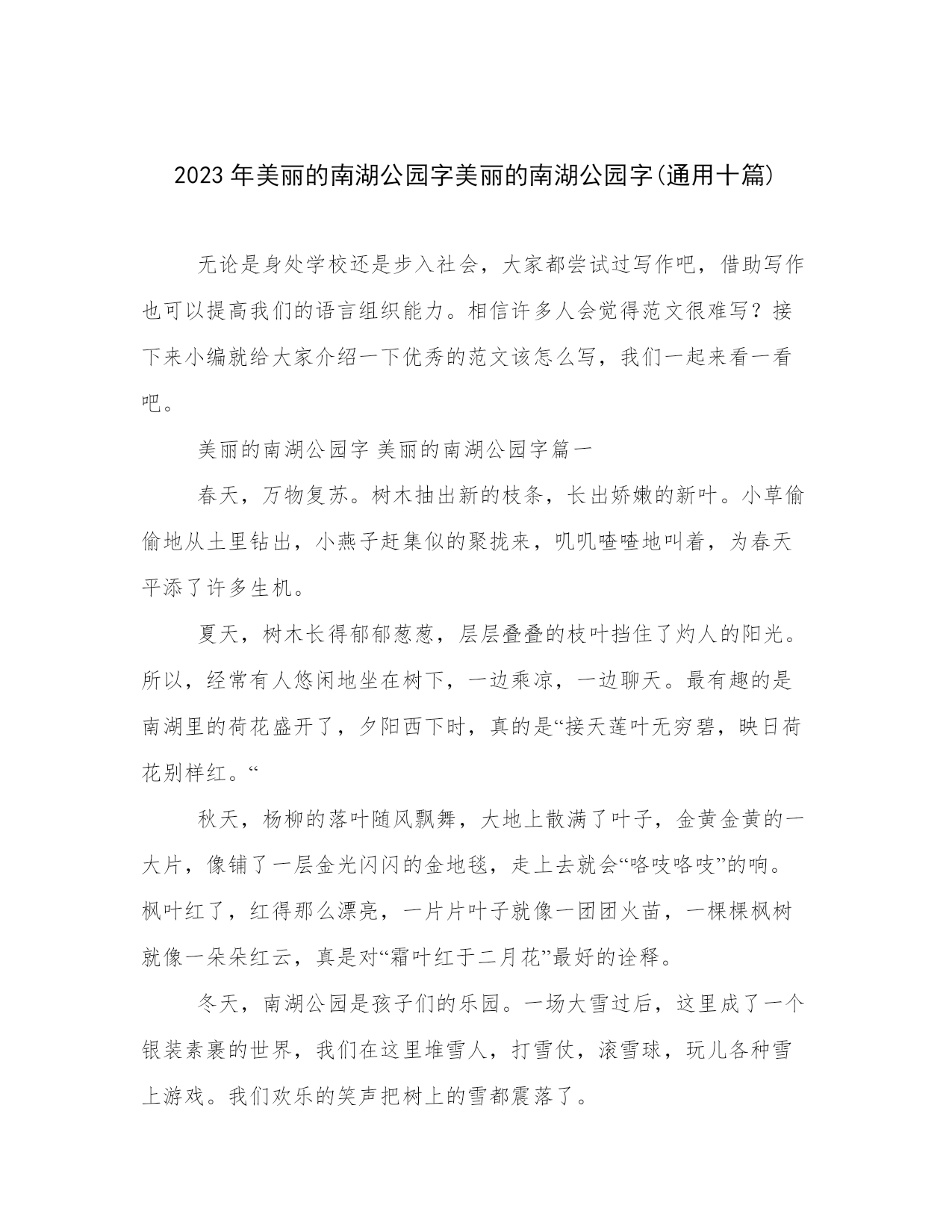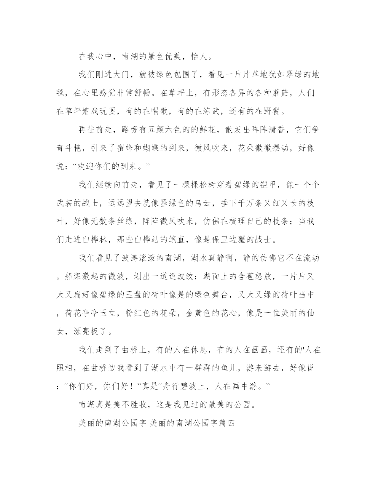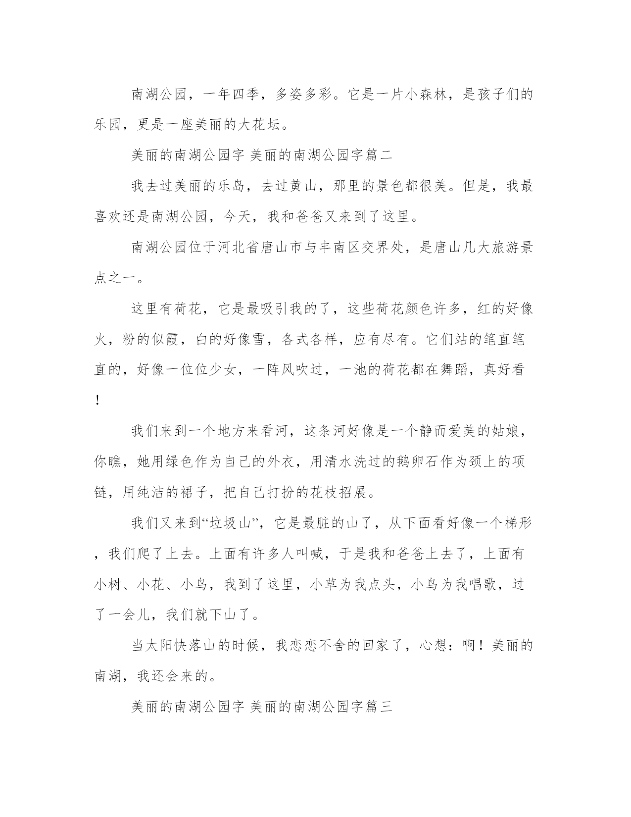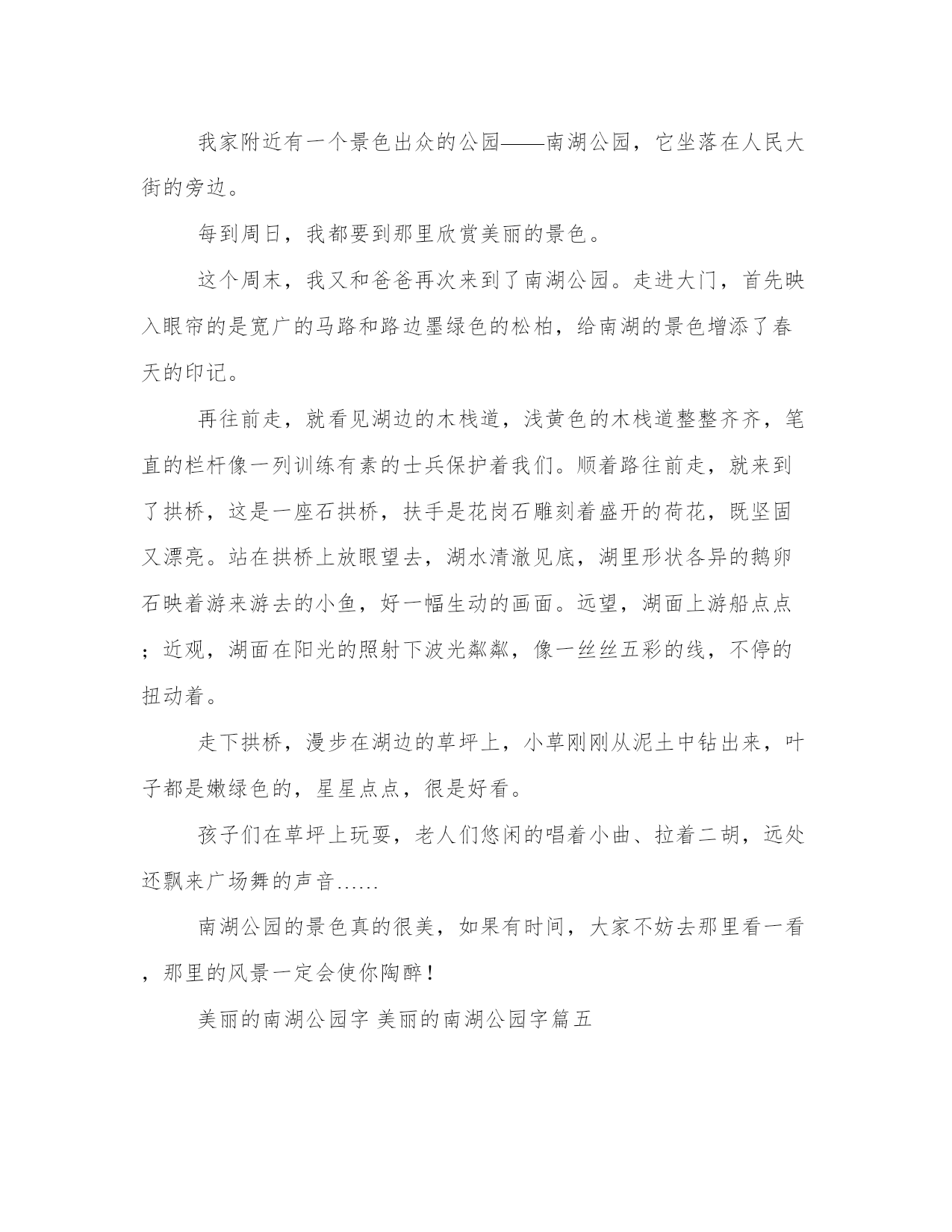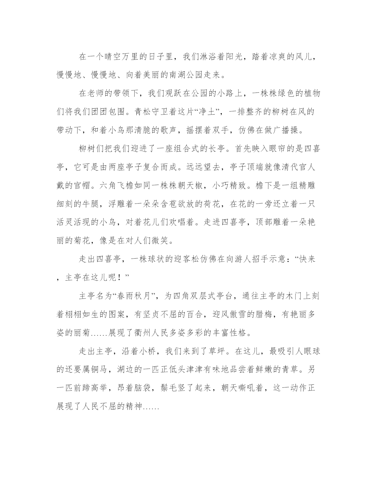 2023年美丽的南湖公园字美丽的南湖公园字(通用十篇)无论是身处学校还是步入社会,大家都尝试过写作吧,借助写作也可以提高我们的语言组织能力。相信许多人会觉得范文很难写?接下来小编就给大家介绍一下优秀的范文该怎么写,我们一起来看一看吧。美丽的南湖公园字美丽的南湖公园字篇一春天,万物复苏。树木抽出新的枝条,长出娇嫩的新叶。小草偷偷地从土里钻出,小燕子赶集似的聚拢来,叽叽喳喳地叫着,为春天平添了许多生机。夏天,树木长得郁郁葱葱,层层叠叠的枝叶挡住了灼人的阳光。所以,经常有人悠闲地坐在树下,一边乘凉,一边聊天。最有趣的是南湖里的荷花盛开了,夕阳西下时,真的是“接天莲叶无穷碧,映日荷花别样红。“秋天,杨柳的落叶随风飘舞,大地上散满了叶子,金黄金黄的一大片,像铺了一层金光闪闪的金地毯,走上去就会“咯吱咯吱”的响。枫叶红了,红得那么漂亮,一片片叶子就像一团团火苗,一棵棵枫树就像一朵朵红云,真是对“霜叶红于二月花”最好的诠释。冬天,南湖公园是孩子们的乐园。一场大雪过后,这里成了一个银装素裹的世界,我们在这里堆雪人,打雪仗,滚雪球,玩儿各种雪上游戏。我们欢乐的笑声把树上的雪都震落了。南湖公园,一年四季,多姿多彩。它是一片小森林,是孩子们的乐园,更是一座美丽的大花坛。美丽的南湖公园字美丽的南湖公园字篇二我去过美丽的乐岛,去过黄山,那里的景色都很美。但是,我最喜欢还是南湖公园,今天,我和爸爸又来到了这里。南湖公园位于河北省唐山市与丰南区交界处,是唐山几大旅游景点之一。这里有荷花,它是最吸引我的了,这些荷花颜色许多,红的好像火,粉的似霞,白的好像雪,各式各样,应有尽有。它们站的笔直笔直的,好像一位位少女,一阵风吹过,一池的荷花都在舞蹈,真好看!我们来到一个地方来看河,这条河好像是一个静而爱美的姑娘,你瞧,她用绿色作为自己的外衣,用清水洗过的鹅卵石作为颈上的项链,用纯洁的裙子,把自己打扮的花枝招展。我们又来到“垃圾山”,它是最脏的山了,从下面看好像一个梯形,我们爬了上去。上面有许多人叫喊,于是我和爸爸上去了,上面有小树、小花、小鸟,我到了这里,小草为我点头,小鸟为我唱歌,过了一会儿,我们就下山了。当太阳快落山的时候,我恋恋不舍的回家了,心想:啊!美丽的南湖,我还会来的。美丽的南湖公园字美丽的南湖公园字篇三在我心中,南湖的景色优美,怡人。我们刚进大门,就被绿色包围了,看见一片片草地犹如翠绿的地毯,在心里感觉非常舒畅。在草坪上,有形态各异的各种蘑菇,人们在草坪嬉戏玩耍,有的在唱歌,有的在练武,还有的在野餐。再往前走,路旁有五颜六色的的鲜花,散发出阵阵清香,它们争奇斗艳,引来了蜜蜂和蝴蝶的到来,微风吹来,花朵微微摆动,好像说:“欢迎你们的到来。”我们继续向前走,看见了一棵棵松树穿着碧绿的铠甲,像一个个武装的战士,远远望去就像墨绿色的乌云,垂下千万条又细又长的枝叶,好像无数条丝绦,阵阵微风吹来,仿佛在梳理自己的枝条;当我们走进白桦林,那些白桦站的笔直,像是保卫边疆的战士。我们看见了波涛滚滚的南湖,湖水真静啊,静的仿佛它不在流动。船桨激起的微波,划出一道道波纹;湖面上的含苞怒放,一片片又大又扁好像碧绿的玉盘的荷叶像是的绿色舞台,又大又绿的荷叶当中,荷花亭亭玉立,粉红色的花朵,金黄色的花心,像是一位美丽的仙女,漂亮极了。我们走到了曲桥上,有的人在休息,有的人在画画,还有的'人在照相,在曲桥边我看到了湖水中有一群群的鱼儿,游来游去,好像说:“你们好,你们好!”真是“舟行碧波上,人在画中游。”南湖真是美不胜收,这是我见过的最美的公园。美丽的南湖公园字美丽的南湖公园字篇四我家附近有一个景色出众的公园——南湖公园,它坐落在人民大街的旁边。每到周日,我都要到那里欣赏美丽的景色。这个周末,我又和爸爸再次来到了南湖公园。走进大门,首先映入眼帘的是宽广的马路和路边墨绿色的松柏,给南湖的景色增添了春天的印记。再往前走,就看见湖边的木栈道,浅黄色的木栈道整整齐齐,笔直的栏杆像一列训练有素的士兵保护着我们。顺着路往前走,就来到了拱桥,这是一座石拱桥,扶手是花岗石雕刻着盛开的荷花,既坚固又漂亮。站在拱桥上放眼望去,湖水清澈见底,湖里形状各异的鹅卵石映着游来游去的小鱼,好一幅生动的画面。远望,湖面上游船点点;近观,湖面在阳光的照射下波光粼粼,像一丝丝五彩的线,不停的扭动着。走下拱桥,漫步在湖边的草坪上,小草刚刚从泥土中钻出来,叶子都是嫩绿色的,星星点点,很是好看。孩子们在草坪上玩耍,老人们悠闲的唱着小曲、拉着二胡,远处还飘来广场舞的声音……南湖公园的景色真的很美,如果有时间,大家不妨去那里看一看,那里的风景一定会使你陶醉!美丽的南湖公园字美丽的南湖公园字篇五在一个晴空万里的日子里,我们淋浴着阳光,踏着凉爽的风儿,慢慢地、慢慢地、向着美丽的南湖公园走来。在老师的带领下,我们观跃在公园的小路上