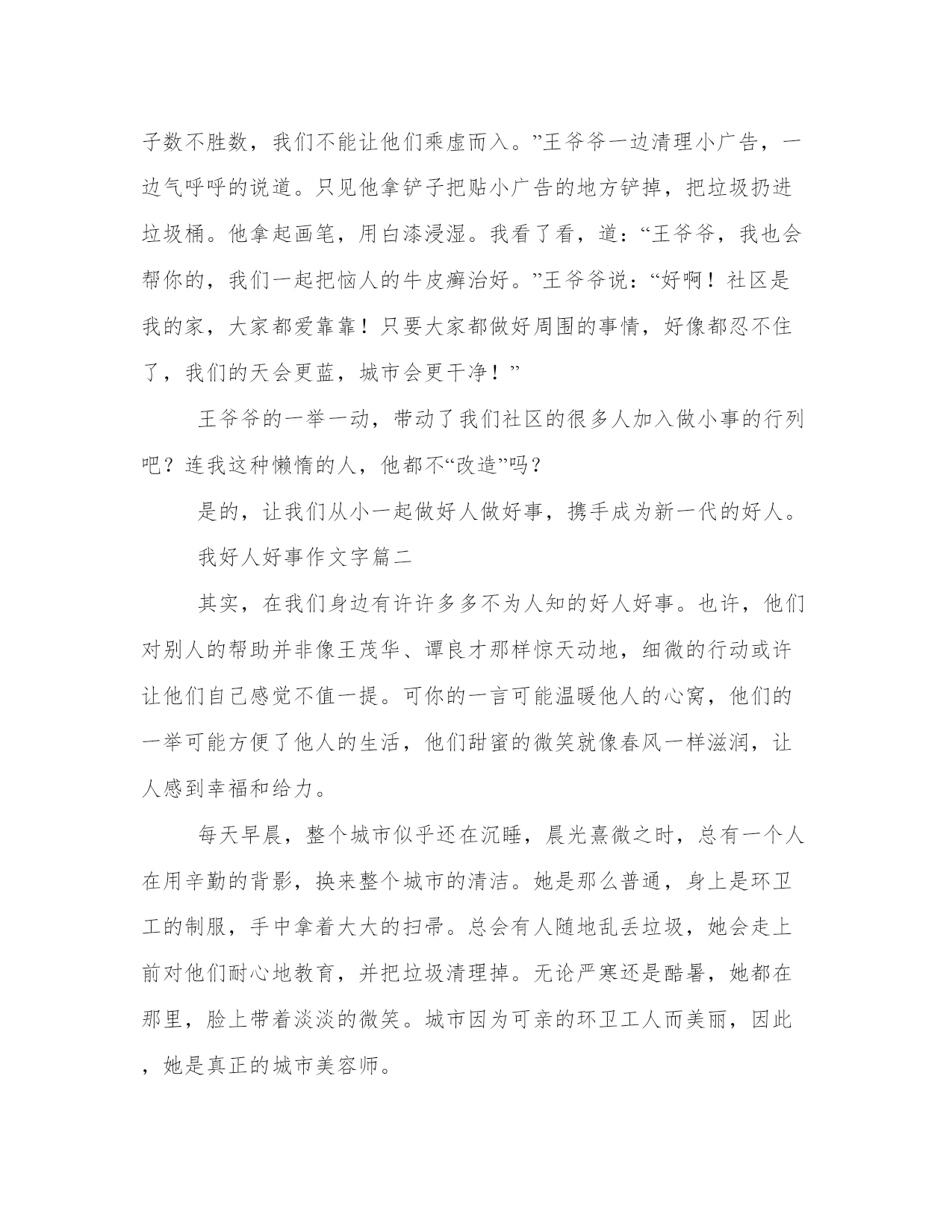2023年我好人好事作文字4篇(汇总)在日常学习、工作或生活中,大家总少不了接触作文或者范文吧,通过文章可以把我们那些零零散散的思想,聚集在一块。相信许多人会觉得范文很难写?以下是小编为大家收集的优秀范文,欢迎大家分享阅读。我好人好事作文字篇一在小区里,在街上,在路上,经常有人从后面看到他,经常做绿豆芝麻之类的事情。用实际行动告诉我们这些后辈:不要把事情做的越小越好。适合小人!每次见到他,他都在做力所能及的小事。小事虽小,但他毕竟84岁了!看到他忙碌的身影,我不禁担心起来。周六下午,阳光明媚。我读完书,开着车回家。车子刚到,一个熟悉的身影就出现在了我的眼前。这不是王爷爷吗?他左手提着油漆桶,右手提着大刷子,脚边提着一个垃圾桶和铲子。我连忙来到王爷爷的身边,“王爷爷!”我亲切地叫道。“是啊,是文文!你在这里做什么?”王爷爷关切的问道。“我下课了,把车开回家了,”我回答,“你又来美化环境了吗?”“哦,你看墙上的小广告太多了,阻碍了城市的面貌,是城市的‘牛皮癣’。首先,上海是奥运会的场馆之一,世博会是关于举办,老外都来上海了结果;其次,这些广告大多是骗钱的,有的江湖医生不仅骗人的钱,还乱医治人,无视别人的生命。这样的例子数不胜数,我们不能让他们乘虚而入。”王爷爷一边清理小广告,一边气呼呼的说道。只见他拿铲子把贴小广告的地方铲掉,把垃圾扔进垃圾桶。他拿起画笔,用白漆浸湿。我看了看,道:“王爷爷,我也会帮你的,我们一起把恼人的牛皮癣治好。”王爷爷说:“好啊!社区是我的家,大家都爱靠靠!只要大家都做好周围的事情,好像都忍不住了,我们的天会更蓝,城市会更干净!”王爷爷的一举一动,带动了我们社区的很多人加入做小事的行列吧?连我这种懒惰的人,他都不“改造”吗?是的,让我们从小一起做好人做好事,携手成为新一代的好人。我好人好事作文字篇二其实,在我们身边有许许多多不为人知的好人好事。也许,他们对别人的帮助并非像王茂华、谭良才那样惊天动地,细微的行动或许让他们自己感觉不值一提。可你的一言可能温暖他人的心窝,他们的一举可能方便了他人的生活,他们甜蜜的微笑就像春风一样滋润,让人感到幸福和给力。每天早晨,整个城市似乎还在沉睡,晨光熹微之时,总有一个人在用辛勤的背影,换来整个城市的清洁。她是那么普通,身上是环卫工的制服,手中拿着大大的扫帚。总会有人随地乱丢垃圾,她会走上前对他们耐心地教育,并把垃圾清理掉。无论严寒还是酷暑,她都在那里,脸上带着淡淡的微笑。城市因为可亲的环卫工人而美丽,因此,她是真正的城市美容师。对于我们的美容师,我怀着敬佩的心情。对于另一个人,则是满满的感动。没有人会忘记这一幕:去年7月的一个下午,2岁女童妞妞从10楼坠落。千钧一发的时刻,年轻妈妈吴菊萍奋不顾身地冲过去,用左臂接住了孩子。孩子获救了,吴菊萍的手臂却瞬间被巨大的冲击力撞成粉碎性骨折。事后,她说,这是我应做的本分。事实上,每个人在帮助别人的同时,自己也都在接受着帮助。从我们出生,一直到长大,帮助我们最多的人是我们的父母。是他们给予了我们生命,让我们快乐的成长,教会我们如何做人,当我们步入青春,他们却日渐老去。他们用无限的关爱让我们懂得感恩他人,从而懂得帮助他人。他们让我想到了雷锋,那个是我们所有人榜样的人。后人为了纪念他,还设立了雷锋纪念日。其实,每一天都是雷锋纪念日,帮助他人是中华民族的传统美德,我们作为炎黄子孙,自然就要将这种精神延续下去,向更多有困难的人伸出援手,即使你能做到的只有很少一部分,但你的爱心会让你的精神升华。罗丹说过,世界上不是缺少美,而是缺少发现美的眼睛。只要我们用心去寻找,终会有美的存在。从现在做起,从一点一滴的小事做起,从现在开始去发现挖掘正能量,世界会因此而美好。我好人好事作文字篇三寒假对我们学生来讲,除了可以缓解一下半学期来紧张的学习生活,还意味着岁末年初,又到了过新年……过年,对我们小孩儿来说,是一件非常高兴的事情,但是,外婆却说:“年关难过!”因为,每到此时,就有很多的家庭正为过年而犯愁。2013年元旦,我们“金色阳光”小队曾跟随南京市红十字会的丁部长、周老师一行,来到了位于建邺区河北村65号的黄文杰同学家里进行慰问。快过农历新年了,他们的境况怎么样?黄文杰的身体好些了吗?他们家的年货准备了多少?好人好事之一:新年慰问小伙伴带着事先准备好的新年礼物,我们再次踏上了去黄文杰家的路。和上次一样,在经过一条狭长而又阴暗潮湿的小巷后,我们来到了居住在棚户区的他们的家。屋内的桌椅橱柜依然是那么的干净、整洁,床上叠放着整齐的被单。黄妈妈还对我们说,本来黄文杰想和妈妈一起回老家过年,不过因为春运的火车票实在难买,所以他们最终放弃了这个想法,还是留在南京过年。和他们聊了有一个多小时,临走前,我们放下事先准备好的年货和红包,看着我们为他们准备的米、油、鸡蛋等年货时,