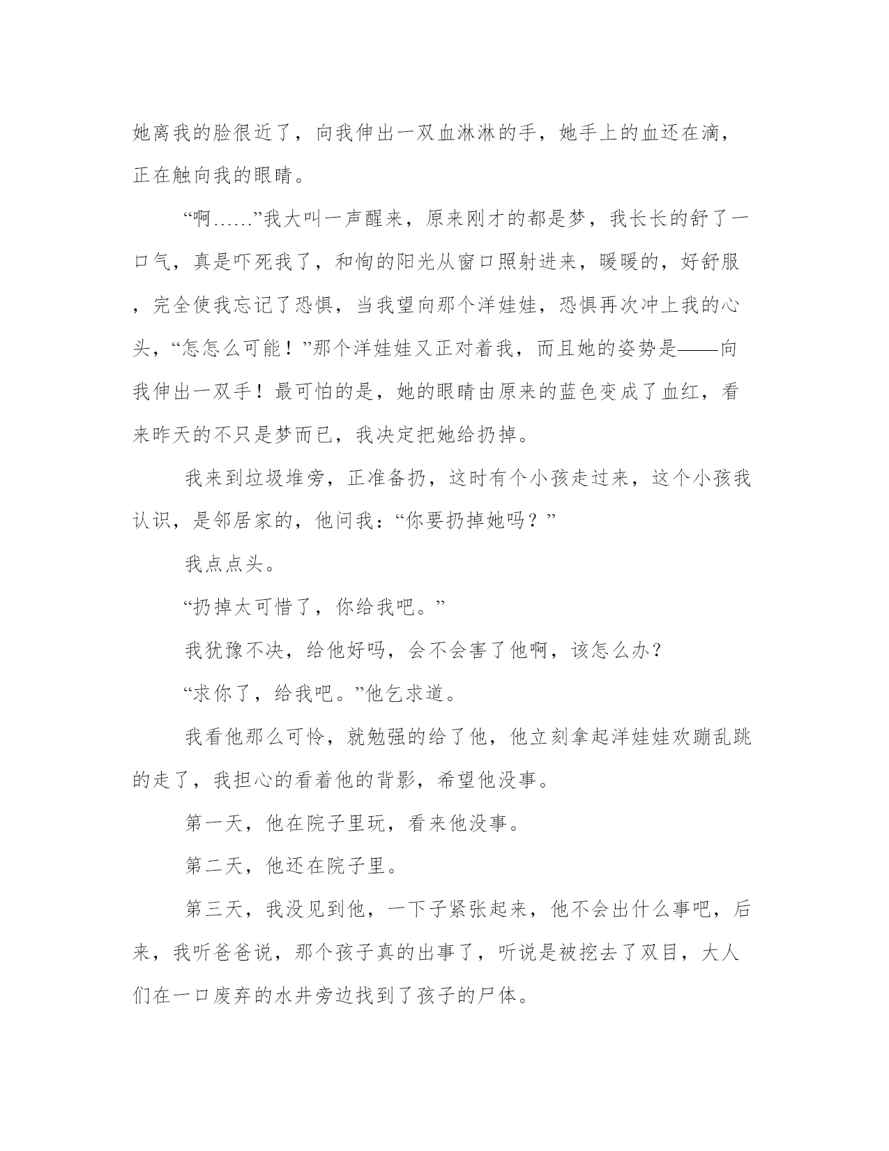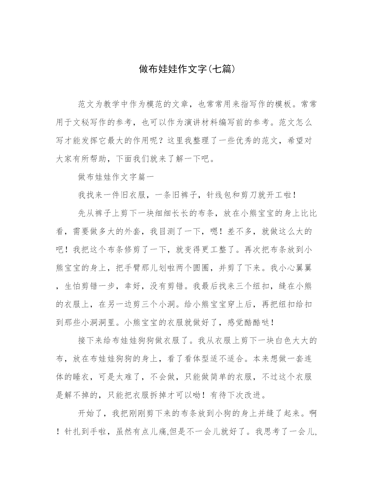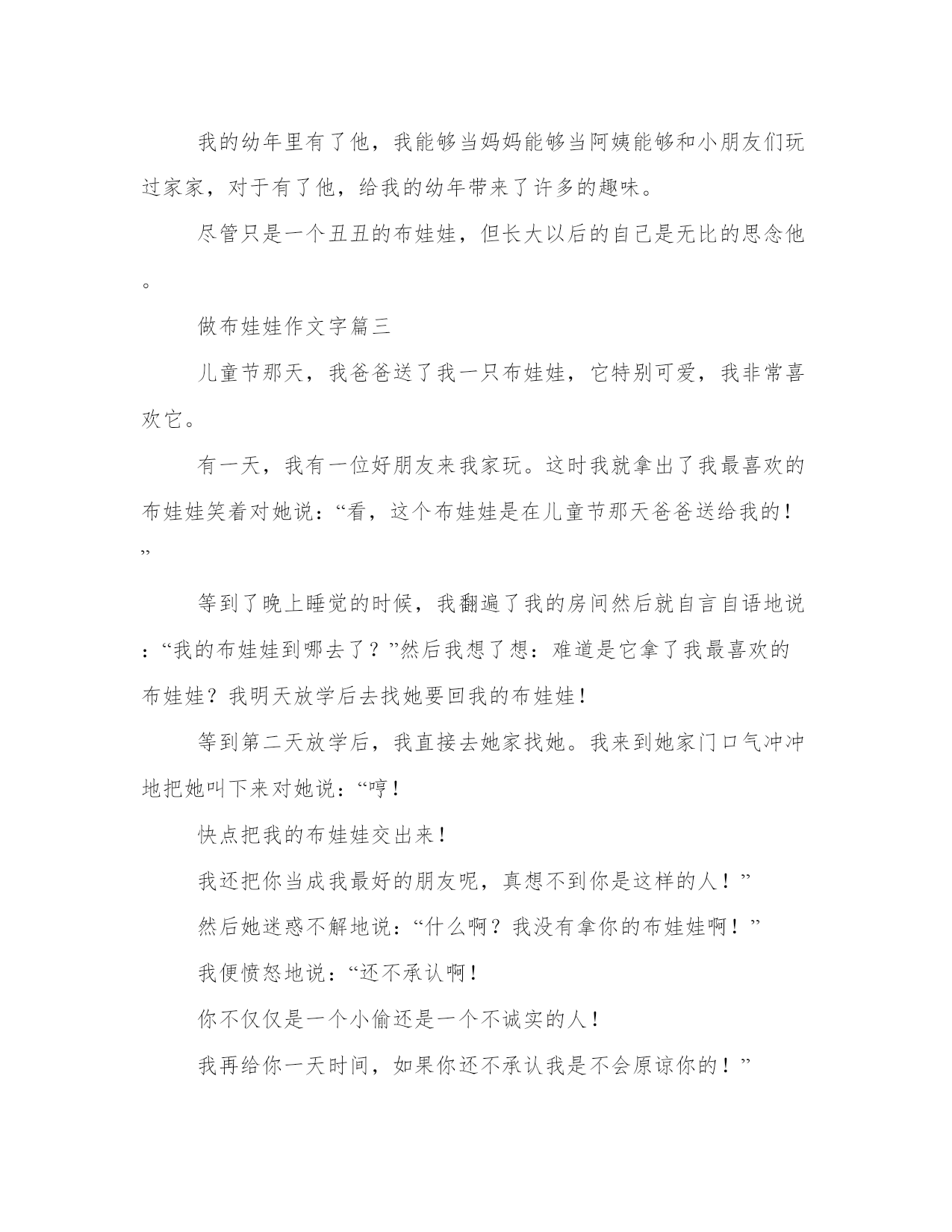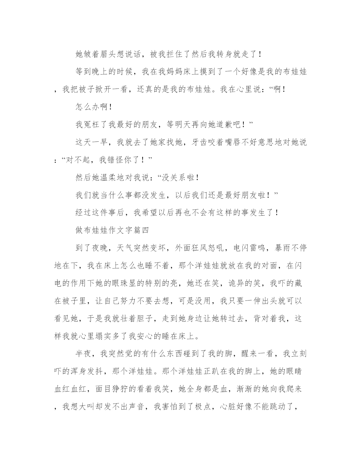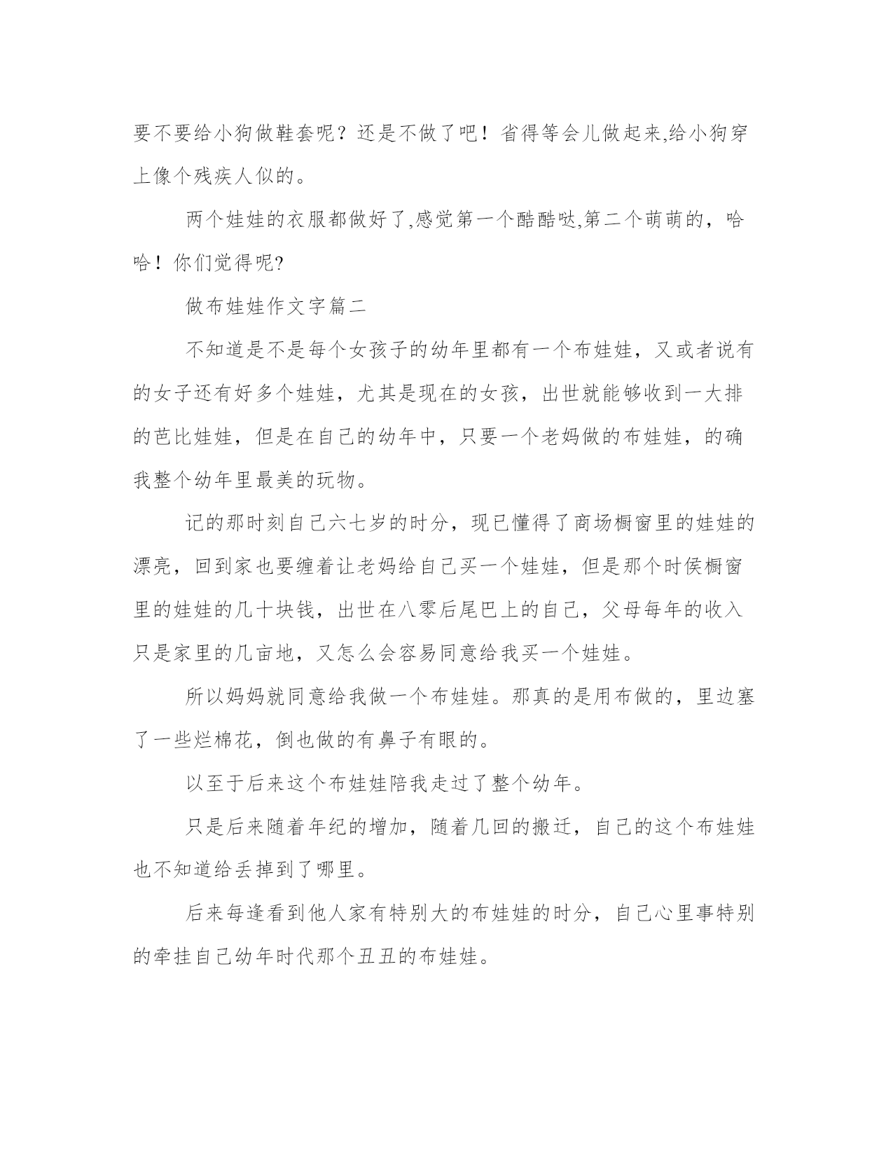 做布娃娃作文字(七篇)范文为教学中作为模范的文章,也常常用来指写作的模板。常常用于文秘写作的参考,也可以作为演讲材料编写前的参考。范文怎么写才能发挥它最大的作用呢?这里我整理了一些优秀的范文,希望对大家有所帮助,下面我们就来了解一下吧。做布娃娃作文字篇一我找来一件旧衣服,一条旧裤子,针线包和剪刀就开工啦!先从裤子上剪下一块细细长长的布条,放在小熊宝宝的身上比比看,需要做多大的外套,我目测了一下,嗯!差不多,就做这么大的吧!我把这个布条修剪了一下,就变得更工整了。再次把布条放到小熊宝宝的身上,把手臂那儿划啦两个圆圈,并剪了下来。我小心翼翼,生怕剪错一步,幸好,没有剪错。我最后找来三个纽扣,缝在小熊的衣服上,在另一边剪三个小洞。给小熊宝宝穿上后,再把纽扣给扣到那些小洞洞里。小熊宝宝的衣服就做好了,感觉酷酷哒!接下来给布娃娃狗狗做衣服了。我从衣服上剪下一块白色大大的布,放在布娃娃狗狗的身上,看了看体型适不适合。本来想做一套连体的睡衣,可是太难了,不会做,只能做简单的衣服,不过这个衣服是解不掉的,只能把衣服拆掉才可以呦!有待下次改进。开始了,我把刚刚剪下来的布条放到小狗的身上并缝了起来。啊!针扎到手啦,虽然有点儿痛,但是不一会儿就好了。我思考了一会儿,要不要给小狗做鞋套呢?还是不做了吧!省得等会儿做起来,给小狗穿上像个残疾人似的。两个娃娃的衣服都做好了,感觉第一个酷酷哒,第二个萌萌的,哈哈!你们觉得呢?做布娃娃作文字篇二不知道是不是每个女孩子的幼年里都有一个布娃娃,又或者说有的女子还有好多个娃娃,尤其是现在的女孩,出世就能够收到一大排的芭比娃娃,但是在自己的幼年中,只要一个老妈做的布娃娃,的确我整个幼年里最美的玩物。记的那时刻自己六七岁的时分,现已懂得了商场橱窗里的娃娃的漂亮,回到家也要缠着让老妈给自己买一个娃娃,但是那个时侯橱窗里的娃娃的几十块钱,出世在八零后尾巴上的自己,父母每年的收入只是家里的几亩地,又怎么会容易同意给我买一个娃娃。所以妈妈就同意给我做一个布娃娃。那真的是用布做的,里边塞了一些烂棉花,倒也做的有鼻子有眼的。以至于后来这个布娃娃陪我走过了整个幼年。只是后来随着年纪的增加,随着几回的搬迁,自己的这个布娃娃也不知道给丢掉到了哪里。后来每逢看到他人家有特别大的布娃娃的时分,自己心里事特别的牵挂自己幼年时代那个丑丑的布娃娃。我的幼年里有了他,我能够当妈妈能够当阿姨能够和小朋友们玩过家家,对于有了他,给我的幼年带来了许多的趣味。尽管只是一个丑丑的布娃娃,但长大以后的自己是无比的思念他。做布娃娃作文字篇三儿童节那天,我爸爸送了我一只布娃娃,它特别可爱,我非常喜欢它。有一天,我有一位好朋友来我家玩。这时我就拿出了我最喜欢的布娃娃笑着对她说:“看,这个布娃娃是在儿童节那天爸爸送给我的!”等到了晚上睡觉的时候,我翻遍了我的房间然后就自言自语地说:“我的布娃娃到哪去了?”然后我想了想:难道是它拿了我最喜欢的布娃娃?我明天放学后去找她要回我的布娃娃!等到第二天放学后,我直接去她家找她。我来到她家门口气冲冲地把她叫下来对她说:“哼!快点把我的布娃娃交出来!我还把你当成我最好的朋友呢,真想不到你是这样的人!”然后她迷惑不解地说:“什么啊?我没有拿你的布娃娃啊!”我便愤怒地说:“还不承认啊!你不仅仅是一个小偷还是一个不诚实的人!我再给你一天时间,如果你还不承认我是不会原谅你的!”她皱着眉头想说话,被我拦住了然后我转身就走了!等到晚上的时候,我在我妈妈床上摸到了一个好像是我的布娃娃,我把被子掀开一看,还真的是我的布娃娃。我在心里说:“啊!怎么办啊!我冤枉了我最好的朋友,等明天再向她道歉吧!”这天一早,我就去了她家找她,牙齿咬着嘴唇不好意思地对她说:“对不起,我错怪你了!”然后她温柔地对我说:“没关系啦!我们就当什么事都没发生,以后我们还是最好朋友啦!”经过这件事后,我希望以后再也不会有这样的事发生了!做布娃娃作文字篇四到了夜晚,天气突然变坏,外面狂风怒吼,电闪雷鸣,暴雨不停地在下,我在床上怎么也睡不着,那个洋娃娃就放在我的对面,在闪电的作用下她的眼珠显的特别的亮,她还在笑,诡异的笑,我吓的藏在被子里,让自己努力不要去想,可是没用,我只要一伸出头就可以看见她,于是我就壮着胆子,走到她身边让她转过去,背对着我,这样我就心里塌实多了我安心的睡在床上。半夜,我突然觉的有什么东西碰到了我的脚,醒来一看,我立刻吓的浑身发抖,那个洋娃娃。那个洋娃娃正趴在我的脚上,她的眼睛血红血红,面目狰狞的看着我笑,她全身都是血,渐渐的她向我爬来,我想大叫却发不出声音,我害怕到了极点,心脏好像不能跳动了,她离我的脸很近了,向我伸出一双血淋淋的手,她手上的血还在滴,正在触向我的眼睛。“啊……”我大叫一声醒来,原来刚才的都是梦,我长长的舒了一口气,真是吓死我了,和恂的阳光从窗口