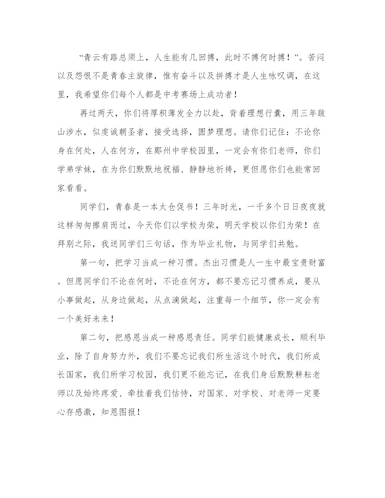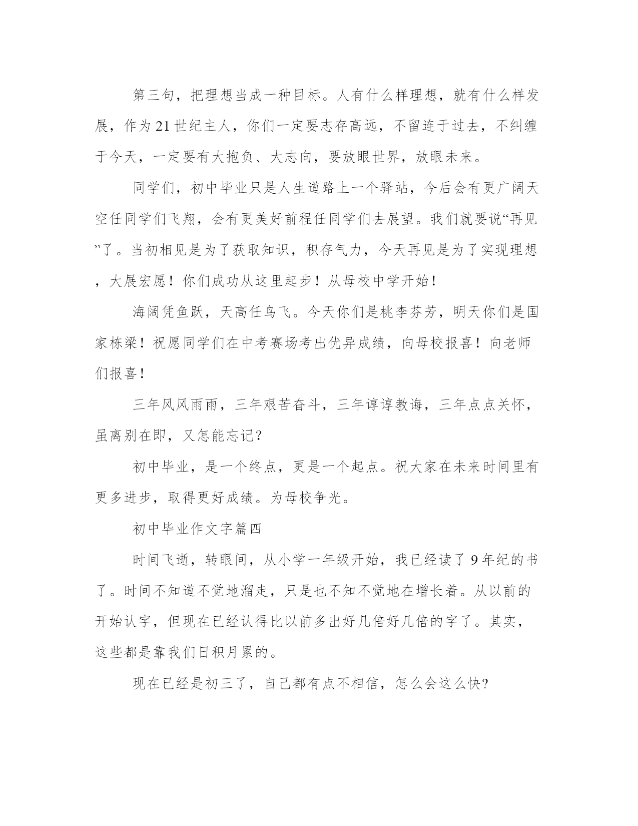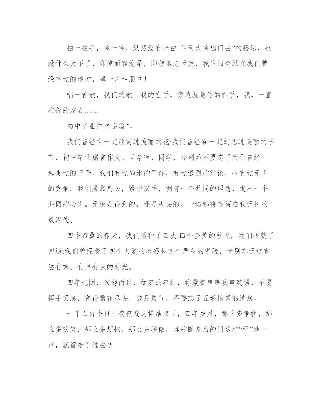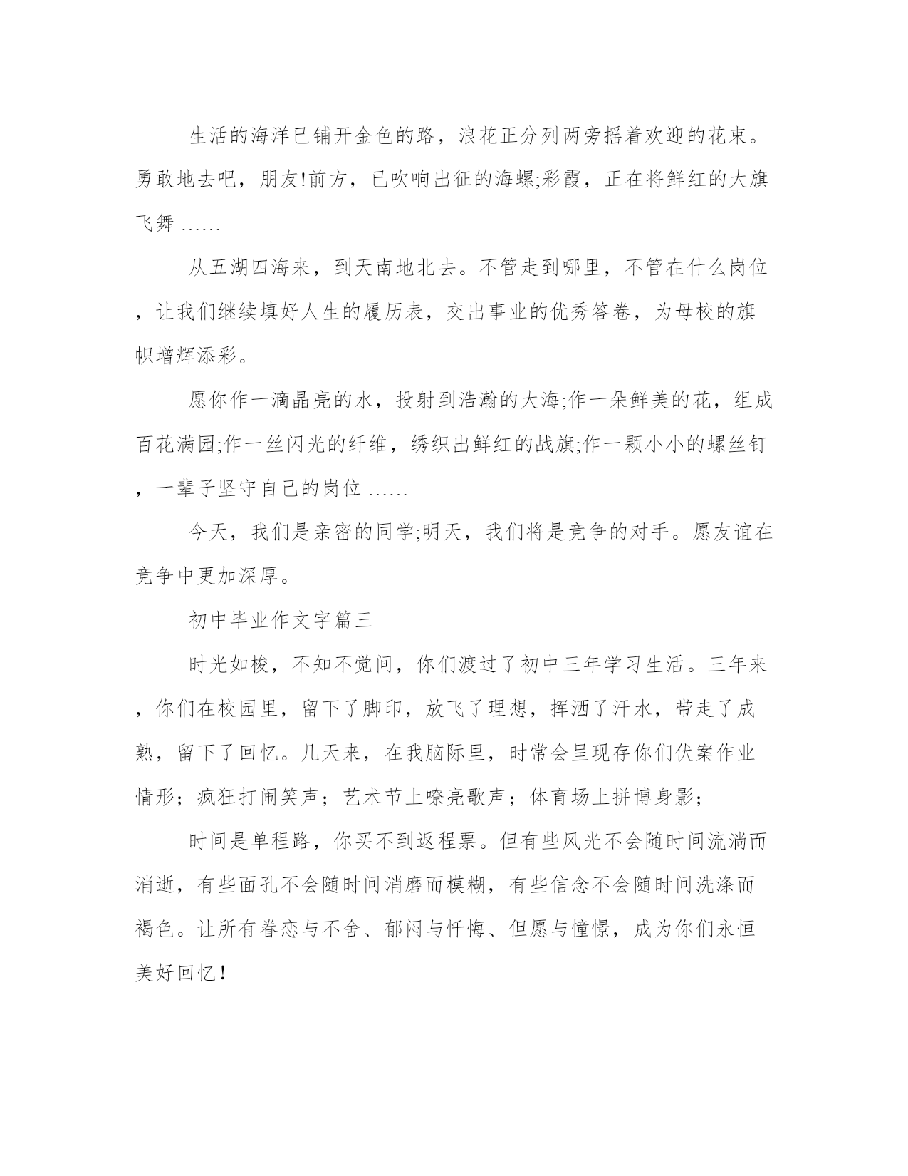 初中毕业作文字(八篇)在日常学习、工作或生活中,大家总少不了接触作文或者范文吧,通过文章可以把我们那些零零散散的思想,聚集在一块。范文怎么写才能发挥它最大的作用呢?下面我给大家整理了一些优秀范文,希望能够帮助到大家,我们一起来看一看吧。初中毕业作文字篇一八号晚上的同学聚会,我突然间发现,我们都长大了许多,那黯然缅怀的忧伤就像ktv的那道明媚的光,挂在了我们每一张成熟的脸上!是啊,这初三的365天,真的是我们一步一步坚强的走过来的吗?那久违的小塘边是否还波动着我们的读书声?也许,当我们重回到校园,重回到那即将成为历史的教室时,那隐隐的痕迹还能勾起我们当初最美的回忆!青春就是这样,年华的蹉跎就像疯长的水草.还好,我们都没有忘记当初相聚(一)班的誓言,那铮铮的承诺一直萦绕在我们耳旁:同一个班级,同一个梦想!就让我们再笑一笑吧,不管怎样,中国的国土有多广,我们之间的距离就会有多长.也许若干年后,我们都会拥有一个属于自己的世界.但是,那牵挂在心的依旧是这一中那断难以忘怀的思念!拍一拍手,笑一笑,纵然没有李白“仰天大笑出门去”的豁达,也没什么大不了,即使面容沧桑,即使地老天荒,我依旧会站在我们曾经笑过的地方,喊一声~朋友!唱一首歌,我们的歌…我的左手,旁边就是你的右手,我,一直在你的左右……初中毕业作文字篇二我们曾经在一起欣赏过美丽的花;我们曾经在一起幻想过美丽的季节,初中毕业赠言作文。同学啊,同学,分别后不要忘了我们曾经一起走过的日子。我们有过如水的平静,有过激烈的辩论,也有过无声的竞争。我们紧靠肩头,紧握双手,拥有一个共同的理想,发出一个共同的心声。无论是得到的,还是失去的,一切都将存留在我记忆的最深处。四个希冀的春天,我们播种了四次;四个金黄的秋天,我们收获了四遍;我们曾经受了四个火夏的磨砺和四个严冬的考验,请别忘记这有滋有味、有声有色的时光。四年光阴,匆匆而过,如梦的年纪,弥漫着串串欢声笑语,不要挥手叹息,觉得繁花尽去,鼓足勇气,不要忘了互递惊喜的消息。一千五百个日日夜夜就这样结束了,四年岁月,那么多争执,那么多欢笑,那么多烦恼,那么多骄傲,真的随身后的门这样“砰”地一声,就留给了过去?生活的海洋已铺开金色的路,浪花正分列两旁摇着欢迎的花束。勇敢地去吧,朋友!前方,已吹响出征的海螺;彩霞,正在将鲜红的大旗飞舞……从五湖四海来,到天南地北去。不管走到哪里,不管在什么岗位,让我们继续填好人生的履历表,交出事业的优秀答卷,为母校的旗帜增辉添彩。愿你作一滴晶亮的水,投射到浩瀚的大海;作一朵鲜美的花,组成百花满园;作一丝闪光的纤维,绣织出鲜红的战旗;作一颗小小的螺丝钉,一辈子坚守自己的岗位……今天,我们是亲密的同学;明天,我们将是竞争的对手。愿友谊在竞争中更加深厚。初中毕业作文字篇三时光如梭,不知不觉间,你们渡过了初中三年学习生活。三年来,你们在校园里,留下了脚印,放飞了理想,挥洒了汗水,带走了成熟,留下了回忆。几天来,在我脑际里,时常会呈现存你们伏案作业情形;疯狂打闹笑声;艺术节上嘹亮歌声;体育场上拼博身影;时间是单程路,你买不到返程票。但有些风光不会随时间流淌而消逝,有些面孔不会随时间消磨而模糊,有些信念不会随时间洗涤而褐色。让所有眷恋与不舍、郁闷与忏悔、但愿与憧憬,成为你们永恒美好回忆!“青云有路总须上,人生能有几回搏,此时不搏何时搏!”。苦闷以及怨恨不是青春主旋律,惟有奋斗以及拼搏才是人生咏叹调,在这里,我希望你们每个人都是中考赛场上成功者!再过两天,你们将厚积薄发全力以赴,背着理想行囊,用三年跋山涉水,似虔诚朝圣者,接受选择,圆梦理想。请你们记住:不论你身在何处,人在何方,在鄚州中学校园里,一定会有你们老师,你们学弟学妹,在为你们默默地祝福、静静地祈祷,更但愿你们也能常回家看看。同学们,青春是一本太仓促书!三年时光,一千多个日日夜夜就这样匆匆擦肩而过,今天你们以学校为荣,明天学校以你们为荣!在拜别之际,我送同学们三句话,作为毕业礼物,与同学们共勉。第一句,把学习当成一种习惯。杰出习惯是人一生中最宝贵财富。但愿同学们不论在何时,不论在何方,都不要忘记习惯养成,要从小事做起,从身边做起,从点滴做起,注重每一个细节,你一定会有一个美好未来!第二句,把感恩当成一种感恩责任。同学们能健康成长,顺利毕业,除了自身努力外,我们不要忘记我们所生活这个时代,我们所成长国家,我们所学习校园,我们更不能忘记,在我们身后默默耕耘老师以及始终疼爱、牵挂着我们怙恃,对国家、对学校、对老师一定要心存感激,知恩图报!第三句,把理想当成一种目标。人有什么样理想,就有什么样发展,作为21世纪主人,你们一定要志存高远,不留连于过去,不纠缠于今天,一定要有大抱负、大志向,要放眼世界,放眼未来。同学们,初中毕业只是人生道路上一个驿站,今后会有更广阔天空任同学们飞翔,会有更
