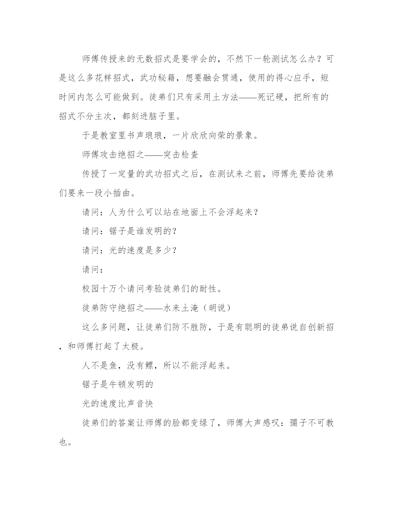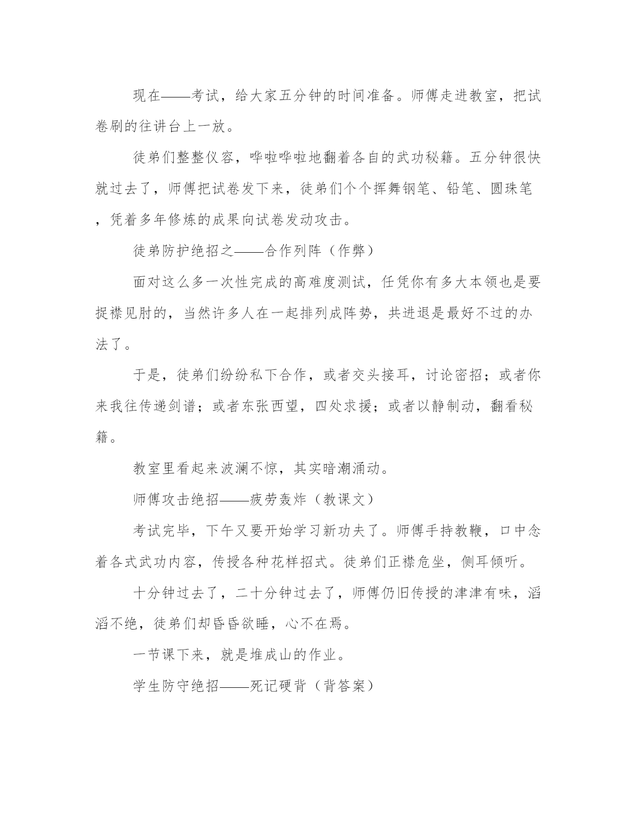 最新初一校园作文字初一校园作文字左右3篇(汇总)在日常的学习、工作、生活中,肯定对各类范文都很熟悉吧。写范文的时候需要注意什么呢?有哪些格式需要注意呢?下面是小编为大家收集的优秀范文,供大家参考借鉴,希望可以帮助到有需要的朋友。初一校园作文字初一校园作文字左右篇一远远就能看到一座高大的牌坊矗立在校门口,黄济老先生亲笔题写的“清照小学”四个大字格外醒目。学校是书院式结构,主要分为四座楼,分别用李清照诗词中的“风”“花”“雪”“月”来命名,叫做“清风厅”“簟花阙”“院雪阁”“乡月轩”。其中三座是教学楼,每一座楼都有五层高,上面有几十间教室。每一座楼都是口字型的,其中清风厅是主要的教学楼,其他几座教学楼众星捧月般地环绕在四周。我们学校大楼的主要色调是黛、白、褐,这更给学校平添了一丝庄严的气氛。外部设计庄严肃穆,而内部却是另一种风格,十分活泼可爱,令人眼前一亮。一楼的墙壁统一刷成了橙色,二楼是黄色,三楼是绿色,四楼是淡蓝色,五楼是深蓝色。这正好对应着从大地到天空的颜色。里面的设施也独具特色,一楼设置了蹦床,二楼有文化长廊,三楼有攀岩设施,每个楼层都有图书角,同学随时随地都可以看书,这正契合了学校“空间更课程,校园更文化”的办学理念。在几座大楼的环绕之下,校园中心的广场上屹立着李清照塑像。塑像前面还有一湾浅浅的池水,就像一面刚刚打磨过的明镜。一阵风吹来,水面上泛起层层涟漪,偶尔还会看见几条小鱼在池底戏水。这正体现了清照小学“若水清照,文化育人”的理念。李清照塑像旁边有一个小亭子,亭子旁边溪流涓涓,一直流入到旁边的一个水池内。站在这里,你可能会想到李清照小时候“常记溪亭日暮,沉醉不知归路”的景象。这个小亭子正是以“溪亭”命名的。在溪亭的不远处,就是宽阔而美丽的操场了。放眼望去,蓝天、绿地交相辉映,黑白相间的教学楼格外醒目。操场上有300米长的塑胶跑道,塑胶跑道附近,还有两个乒乓球台,同学们可以在宽阔的操场上尽情地玩耍。操场附近,我们学校还建设了豪华气派的漱玉剧场。剧场内部很宽敞,可以容纳五百余人,学校举办各种大型活动,同学们登台演出都在这里进行。在这里你会看到色彩绚丽的大幕布,还有五彩斑斓的灯光。屋顶线条也别具特色,像一根根琴弦。我想,国家大剧院也不过如此吧。除此之外,学校还设置了餐厅与体育馆。你见过这么美的学校吗?这哪里是学校,这是旅游景区啊!我们一定要好好保护我们的校园,使校园更加美丽。我们也一定要好好学习,为母校增光添彩。现在我为学校而骄傲,将来我要让学校以我为自豪。初一校园作文字初一校园作文字左右篇二风夹杂着“夏”的气息来到校园,使校园中弥漫着一丝温暖。碧湖映着蓝天的模样在仰望着“夏”,骄阳似火,荷花塘在碧湖中,炫耀着她的美——或许是她认为她是夏的使者吧。夏风寻找着人们的足迹,荷花将自己的味献给风,夏风滑过人的脸颊,一股花香吸入鼻中,人们感到心旷神怡,也流入人的心底,感受着夏,夏的来临是让人惊喜的。骄阳似火,照耀在人的脸上,太阳炽热的目光盯着大家,一丝温暖流向人的心底,风夹着温暖在树叶中穿过,发出“簌簌”的声音,这声音,不会让人觉得心烦,对于人们来说,她是夏的旋律。鸟儿站在树枝上,俯视着树下乘凉的人们,发出“叽叽喳喳”的声音——它在欢迎“夏”的到来。而接受阳光洗礼的一切事物,触摸着都是“烫”的,这种“烫”是夏的热情。阳光向地下望去,地面散发的金黄色的光芒,人们在它上面行走,总是觉得很神圣。夏是热情的;夏是“芬芳”的;夏是温暖的。校园的夏是出人意料的,是神圣的。初一校园作文字初一校园作文字左右篇三咳,校园中有太多的考验,让人晕头转向,稍不小心又被师傅耍了一把。师傅攻击决招之——功夫测试(考试)考试啦!考试啦!徒弟们呼喊着奔走相告。现在——考试,给大家五分钟的时间准备。师傅走进教室,把试卷刷的往讲台上一放。徒弟们整整仪容,哗啦哗啦地翻着各自的武功秘籍。五分钟很快就过去了,师傅把试卷发下来,徒弟们个个挥舞钢笔、铅笔、圆珠笔,凭着多年修炼的成果向试卷发动攻击。徒弟防护绝招之——合作列阵(作弊)面对这么多一次性完成的高难度测试,任凭你有多大本领也是要捉襟见肘的,当然许多人在一起排列成阵势,共进退是最好不过的办法了。于是,徒弟们纷纷私下合作,或者交头接耳,讨论密招;或者你来我往传递剑谱;或者东张西望,四处求援;或者以静制动,翻看秘籍。教室里看起来波澜不惊,其实暗潮涌动。师傅攻击绝招——疲劳轰炸(教课文)考试完毕,下午又要开始学习新功夫了。师傅手持教鞭,口中念着各式武功内容,传授各种花样招式。徒弟们正襟危坐,侧耳倾听。十分钟过去了,二十分钟过去了,师傅仍旧传授的津津有味,滔滔不绝,徒弟们却昏昏欲睡,心不在焉。一节课下来,就是堆成山的作业。学生防守绝招——死记硬背(背答案)师傅传授来的无数招式是要学会的,不然下一轮测试怎么办?可是这么多花样招式,