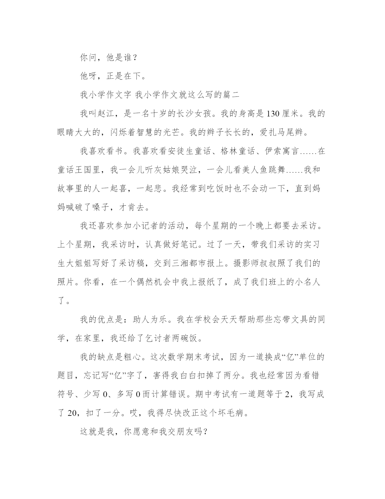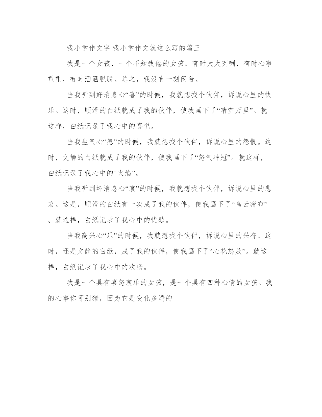 我小学作文字我小学作文就这么写的(三篇)在日常学习、工作或生活中,大家总少不了接触作文或者范文吧,通过文章可以把我们那些零零散散的思想,聚集在一块。大家想知道怎么样才能写一篇比较优质的范文吗?接下来小编就给大家介绍一下优秀的范文该怎么写,我们一起来看一看吧。我小学作文字我小学作文就这么写的篇一他,性情似火,每到下课就和伙伴们追追打打,教学楼四处回荡着他的脚步与欢笑。他还喜好打篮球,坚持每天下午都去打球。要说,他篮球打得不错,上次和别的班级打比赛,他获得了单局12分的好成绩。记得那次进攻时对方特意派人来盯他,随时准备抢球,他迅速弯腰,一个侧身假动作,完美骗过对手,待队友一个球传过来,他从容接住,一个跨下运球,绕开,不慌不忙地瞄准、跳起、出手。他,性格还有些张扬,当球在空中划过一道完美弧线,空心入网时,他激动地大喊,围着前场跑上一圈,和队友们击个掌,转几个小圈,方得罢休。他,爱玩,觉得学习也是一种玩儿,一种动脑筋的玩儿。于是,看到机器人兴趣班不错,就玩机器人,还别说,门门道道可真多,不知不觉竟玩得了省级金奖,国賽银奖。现下,他又觉得语言文字有意思了,玩儿一下语言文字又会如何呢?他就这样在心里默默期待着。带着一颗“玩儿”的心,接受生活中各种各样的挑战。你问,他是谁?他呀,正是在下。我小学作文字我小学作文就这么写的篇二我叫赵江,是一名十岁的长沙女孩。我的身高是130厘米。我的眼睛大大的,闪烁着智慧的光芒。我的辫子长长的,爱扎马尾辫。我喜欢看书。我喜欢看安徒生童话、格林童话、伊索寓言……在童话王国里,我一会儿听灰姑娘哭泣,一会儿看美人鱼跳舞……我和故事里的人一起喜,一起悲。我经常到吃饭时也不会动一下,直到妈妈喊破了嗓子,才肯去。我还喜欢参加小记者的活动,每个星期的一个晚上都要去采访。上个星期,我采访时,认真做好笔记。过了一天,带我们采访的实习生大姐姐写好了采访稿,交到三湘都市报上。摄影师叔叔照了我们的照片。你看,在一个偶然机会中我上报纸了,成了我们班上的小名人了。我的优点是:助人为乐。我在学校会天天帮助那些忘带文具的同学,在家里,我还给了乞讨者两碗饭。我的缺点是粗心。这次数学期末考试,因为一道换成“亿”单位的题目,忘记写“亿”字了,害得我白白扣掉了两分。我也经常因为看错符号、少写0、多写0而计算错误。期中考试有一道题等于2,我写成了20,扣了一分。哎,我得尽快改正这个坏毛病。这就是我,你愿意和我交朋友吗?我小学作文字我小学作文就这么写的篇三我是一个女孩,一个不知疲倦的女孩。有时大大咧咧,有时心事重重,有时洒洒脱脱。总之,我没有一刻闲着。当我听到好消息心“喜”的时候,我就想找个伙伴,诉说心里的快乐。这时,顺滑的白纸就成了我的伙伴,使我画下了“晴空万里”。就这样,白纸记录了我心中的喜悦。当我生气心“怒”的时候,我就想找个伙伴,诉说心里的怨恨。这时,文静的白纸就成了我的伙伴,使我画下了“怒气冲冠”。就这样,白纸记录了我心中的“火焰”。当我听到坏消息心“哀”的时候,我就想找个伙伴,诉说心里的悲哀。这是,顺滑的白纸有一次成了我的伙伴,使我画下了“乌云密布”。就这样,白纸记录了我心中的忧愁。当我高兴心“乐”的时候,我就想找个伙伴,诉说心里的兴奋。这时,还是文静的白纸,成了我的伙伴,使我画下了“心花怒放”。就这样,白纸记录了我心中的欢畅。我是一个具有喜怒哀乐的女孩,是一个具有四种心情的女孩。我的心事你可别猜,因为它是变化多端的
