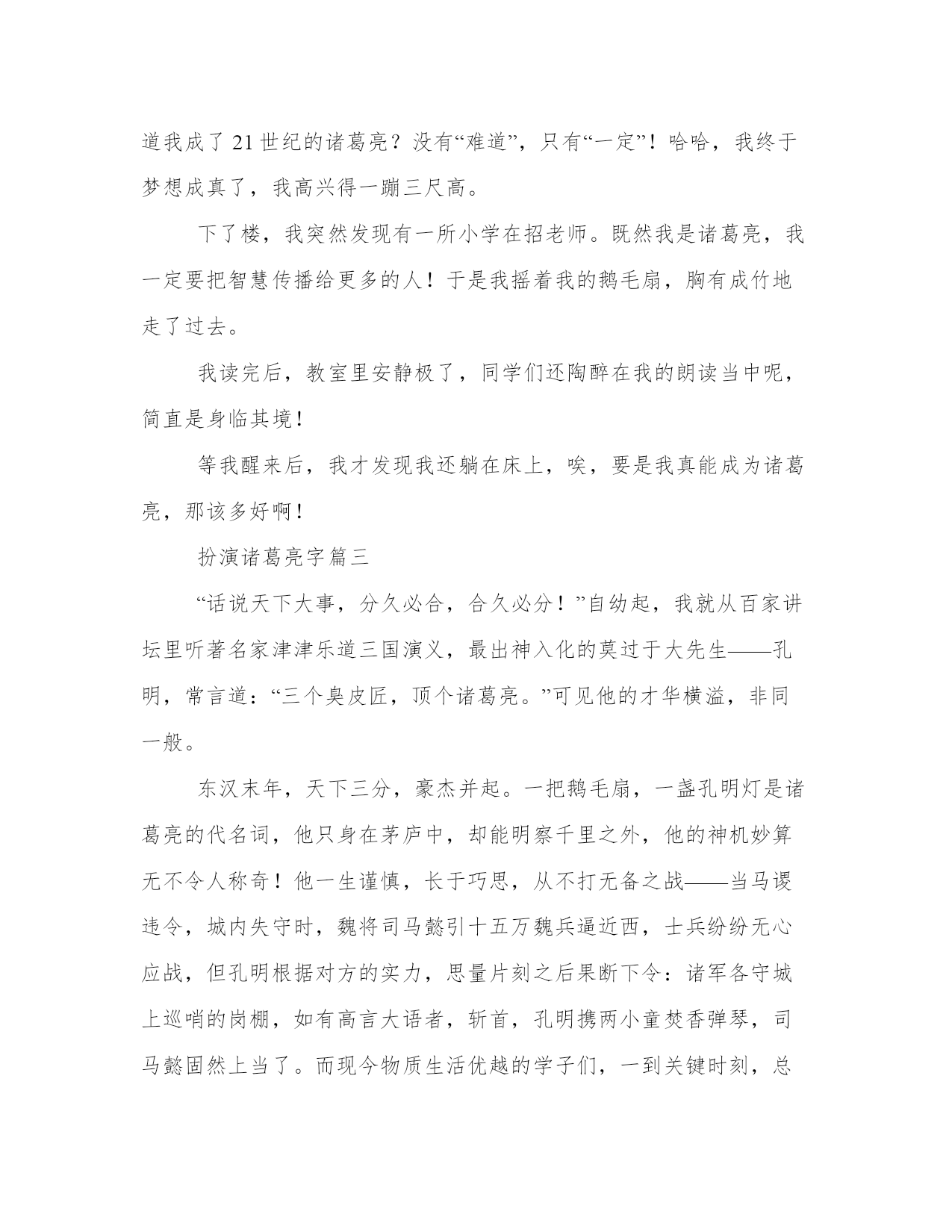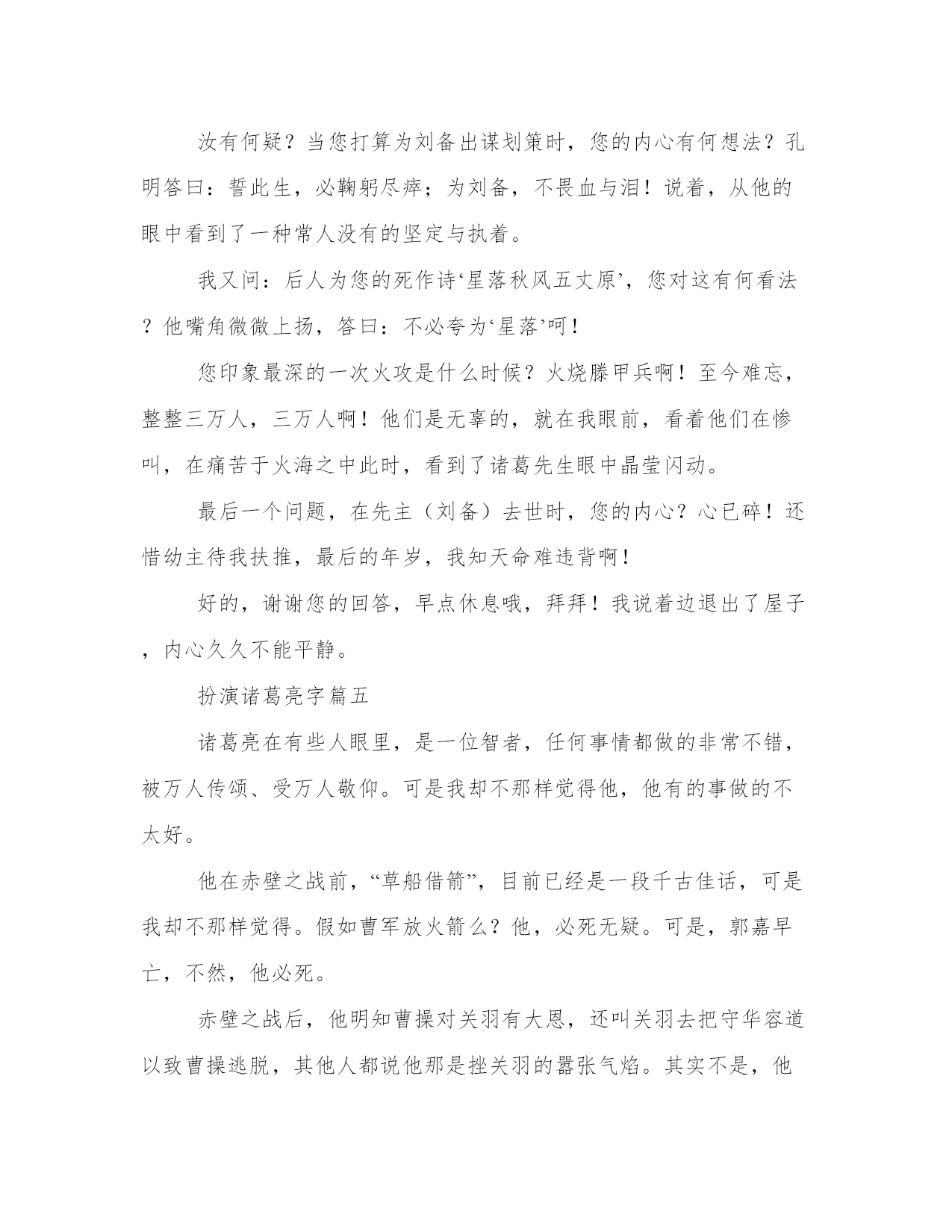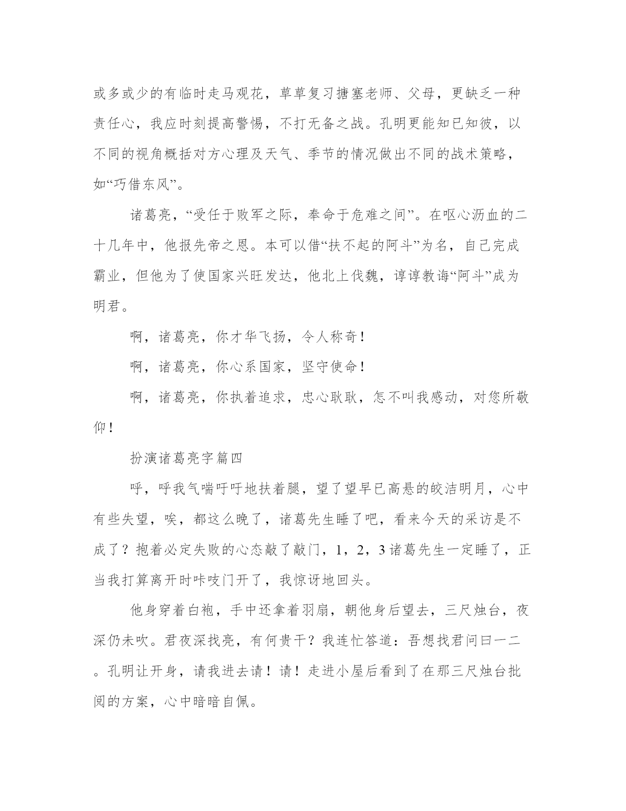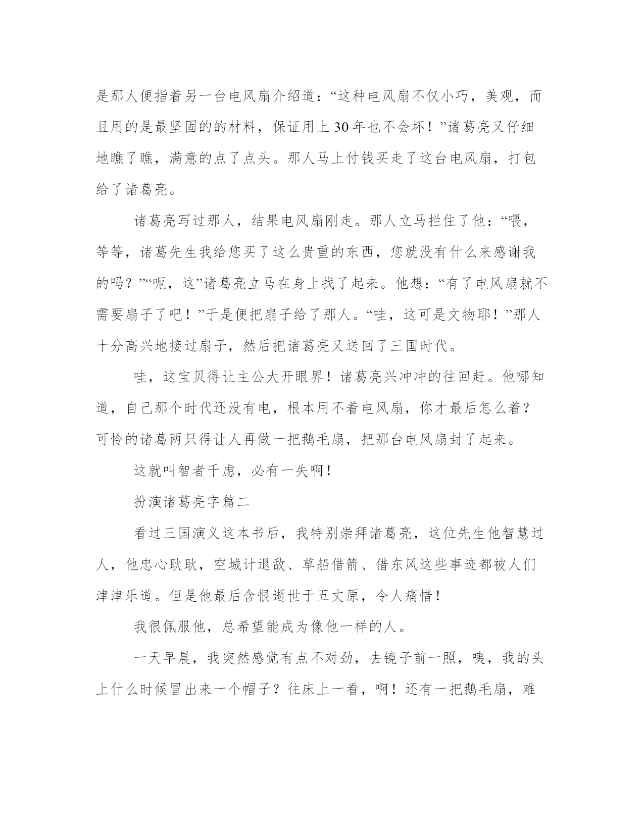 扮演诸葛亮作文字(八篇)在日常学习、工作或生活中,大家总少不了接触作文或者范文吧,通过文章可以把我们那些零零散散的思想,聚集在一块。范文怎么写才能发挥它最大的作用呢?这里我整理了一些优秀的范文,希望对大家有所帮助,下面我们就来了解一下吧。扮演诸葛亮字篇一话说诸葛亮在刘备那当了军师后,闲着无聊便偷偷溜出去找找乐子。当走进一片小树林的时候,他突然发现一位打扮十分古怪的人。他不知道那人是谁,就摇着鹅毛羽扇问“尔乃何许人也?为何打扮得如此古怪?“那人一看是诸葛亮,就立刻回答道:”我是未来人,来这溜达溜达。“这时又发现了诸葛亮手中的鹅毛羽扇,笑道:“诸葛先生还是在用鹅毛羽扇呀!走,我带你到未来世界去买个高科技电风扇。放心,钱有我出。”说完,没等他同意,那人就一把把他拉到了现代。换上现代衣服,那人把对现代科技一无所知的诸葛亮拉到了电风扇专卖店。他立刻被琳琅满目的电风扇晃花了眼睛。他走瞧瞧,右看看,上摸摸,下摸摸,一脸好奇。结果人家售货员直嘀咕,笑他是“乡下大老爷进城-头一回“,其实也差不多嘛。现代人指着一台大电风扇对诸葛亮介绍说这种风扇看起来很笨重,其实是最新的轻便材料做的,十分轻巧,你来拎拎看。”诸葛亮赶紧提了提,说:“的确不错,很轻,但用不着这么大的,再看看吧!”于是那人便指着另一台电风扇介绍道:“这种电风扇不仅小巧,美观,而且用的是最坚固的的材料,保证用上30年也不会坏!”诸葛亮又仔细地瞧了瞧,满意的点了点头。那人马上付钱买走了这台电风扇,打包给了诸葛亮。诸葛亮写过那人,结果电风扇刚走。那人立马拦住了他:“喂,等等,诸葛先生我给您买了这么贵重的东西,您就没有什么来感谢我的吗?”“呃,这”诸葛亮立马在身上找了起来。他想:“有了电风扇就不需要扇子了吧!”于是便把扇子给了那人。“哇,这可是文物耶!”那人十分高兴地接过扇子,然后把诸葛亮又送回了三国时代。哇,这宝贝得让主公大开眼界!诸葛亮兴冲冲的往回赶。他哪知道,自己那个时代还没有电,根本用不着电风扇,你才最后怎么着?可怜的诸葛两只得让人再做一把鹅毛扇,把那台电风扇封了起来。这就叫智者千虑,必有一失啊!扮演诸葛亮字篇二看过三国演义这本书后,我特别崇拜诸葛亮,这位先生他智慧过人,他忠心耿耿,空城计退敌、草船借箭、借东风这些事迹都被人们津津乐道。但是他最后含恨逝世于五丈原,令人痛惜!我很佩服他,总希望能成为像他一样的人。一天早晨,我突然感觉有点不对劲,去镜子前一照,咦,我的头上什么时候冒出来一个帽子?往床上一看,啊!还有一把鹅毛扇,难道我成了21世纪的诸葛亮?没有“难道”,只有“一定”!哈哈,我终于梦想成真了,我高兴得一蹦三尺高。下了楼,我突然发现有一所小学在招老师。既然我是诸葛亮,我一定要把智慧传播给更多的人!于是我摇着我的鹅毛扇,胸有成竹地走了过去。我读完后,教室里安静极了,同学们还陶醉在我的朗读当中呢,简直是身临其境!等我醒来后,我才发现我还躺在床上,唉,要是我真能成为诸葛亮,那该多好啊!扮演诸葛亮字篇三“话说天下大事,分久必合,合久必分!”自幼起,我就从百家讲坛里听著名家津津乐道三国演义,最出神入化的莫过于大先生——孔明,常言道:“三个臭皮匠,顶个诸葛亮。”可见他的才华横溢,非同一般。东汉末年,天下三分,豪杰并起。一把鹅毛扇,一盏孔明灯是诸葛亮的代名词,他只身在茅庐中,却能明察千里之外,他的神机妙算无不令人称奇!他一生谨慎,长于巧思,从不打无备之战——当马谡违令,城内失守时,魏将司马懿引十五万魏兵逼近西,士兵纷纷无心应战,但孔明根据对方的实力,思量片刻之后果断下令:诸军各守城上巡哨的岗棚,如有高言大语者,斩首,孔明携两小童焚香弹琴,司马懿固然上当了。而现今物质生活优越的学子们,一到关键时刻,总或多或少的有临时走马观花,草草复习搪塞老师、父母,更缺乏一种责任心,我应时刻提高警惕,不打无备之战。孔明更能知已知彼,以不同的视角概括对方心理及天气、季节的情况做出不同的战术策略,如“巧借东风”。诸葛亮,“受任于败军之际,奉命于危难之间”。在呕心沥血的二十几年中,他报先帝之恩。本可以借“扶不起的阿斗”为名,自己完成霸业,但他为了使国家兴旺发达,他北上伐魏,谆谆教诲“阿斗”成为明君。啊,诸葛亮,你才华飞扬,令人称奇!啊,诸葛亮,你心系国家,坚守使命!啊,诸葛亮,你执着追求,忠心耿耿,怎不叫我感动,对您所敬仰!扮演诸葛亮字篇四呼,呼我气喘吁吁地扶着腿,望了望早已高悬的皎洁明月,心中有些失望,唉,都这么晚了,诸葛先生睡了吧,看来今天的采访是不成了?抱着必定失败的心态敲了敲门,1,2,3诸葛先生一定睡了,正当我打算离开时咔吱门开了,我惊讶地回头。他身穿着白袍,手中还拿着羽扇,朝他身后望去,三尺烛台,夜深仍未吹。君夜深找亮,有何贵干?我连忙答道:吾想找君问曰一二。孔明让开身,请我进去请!请!走进小屋后看到了在