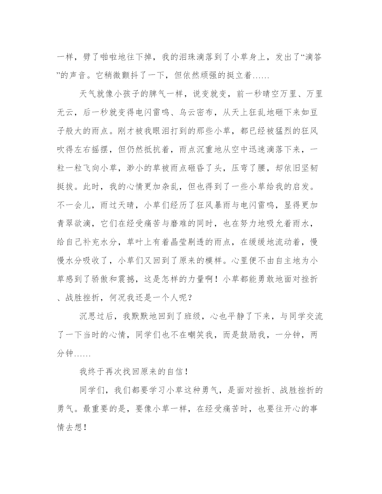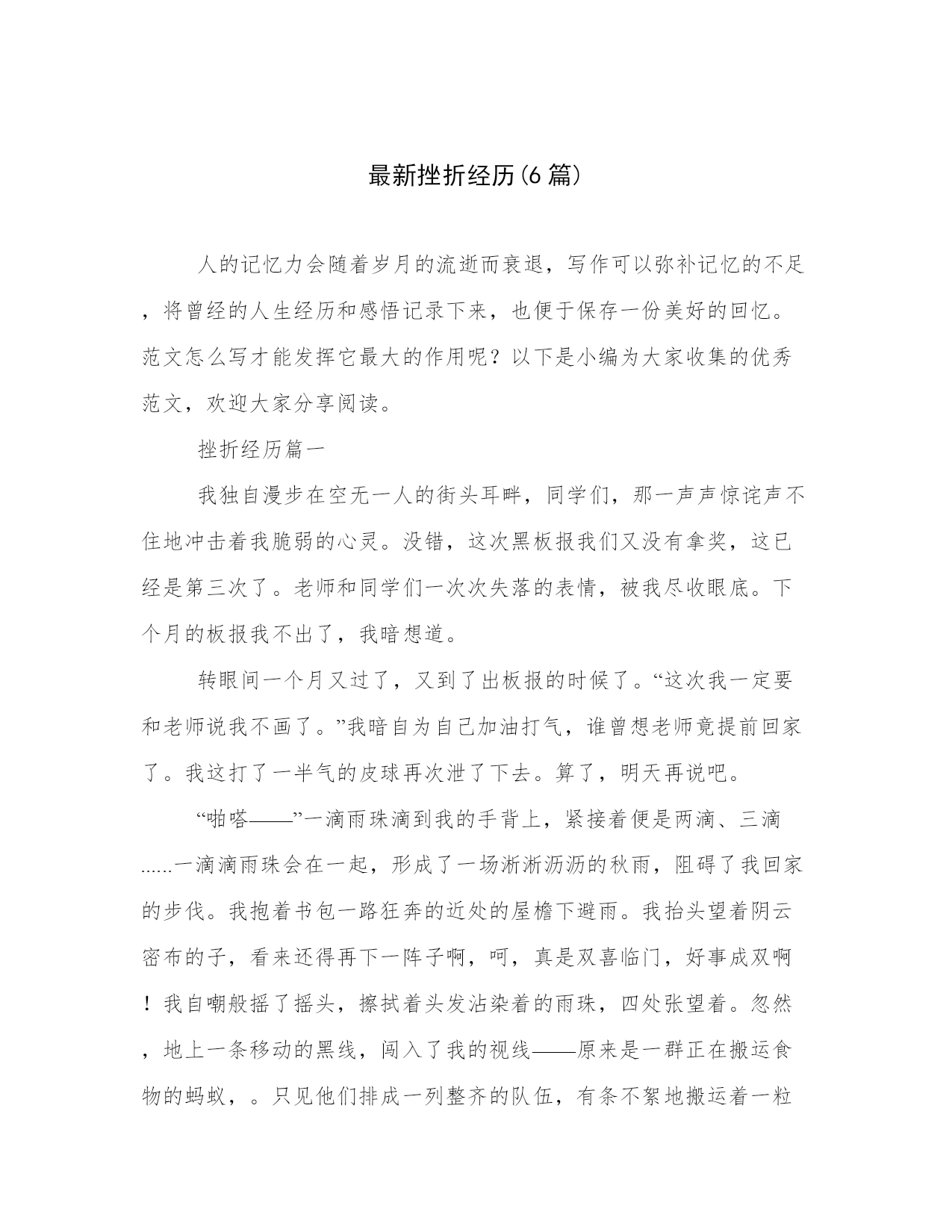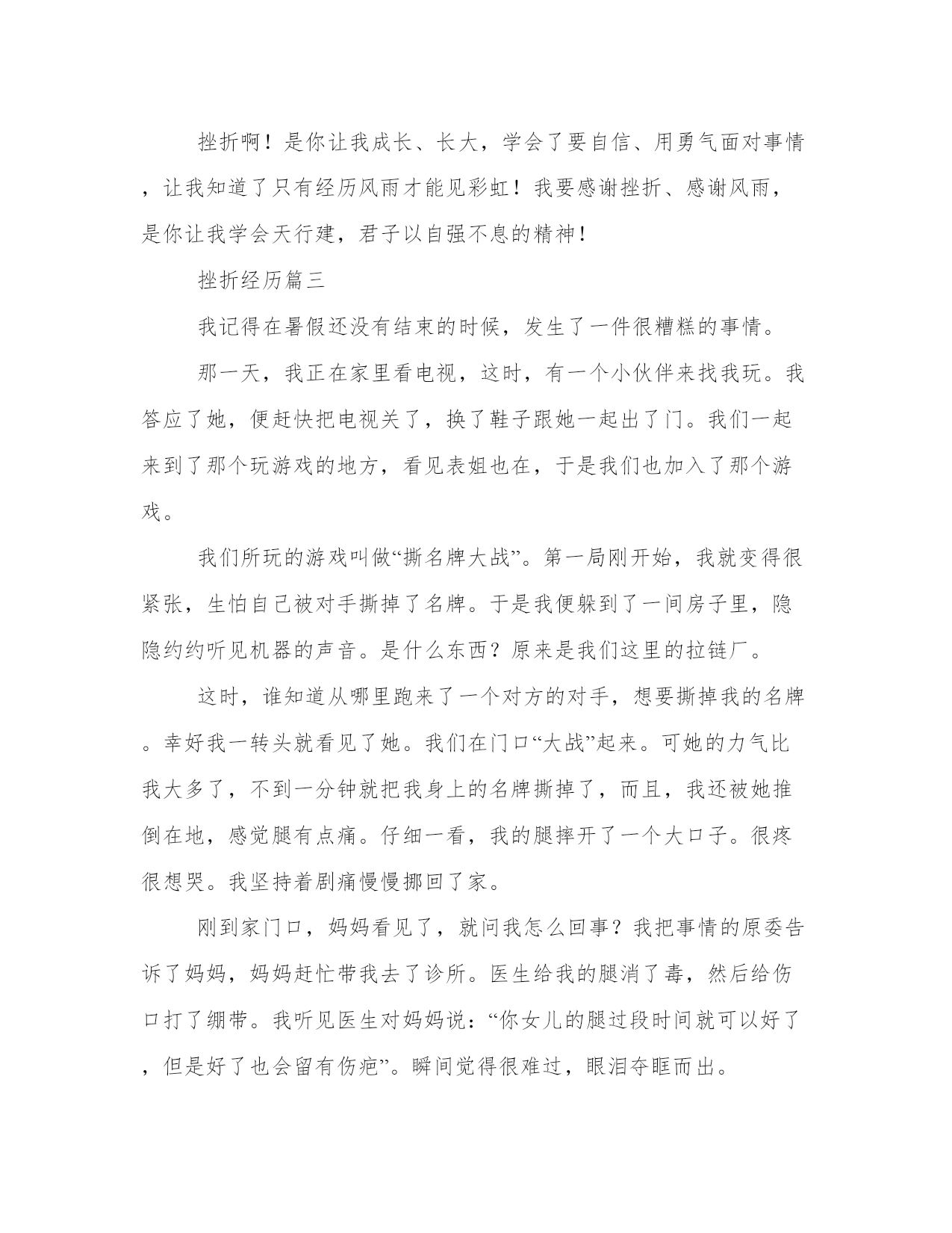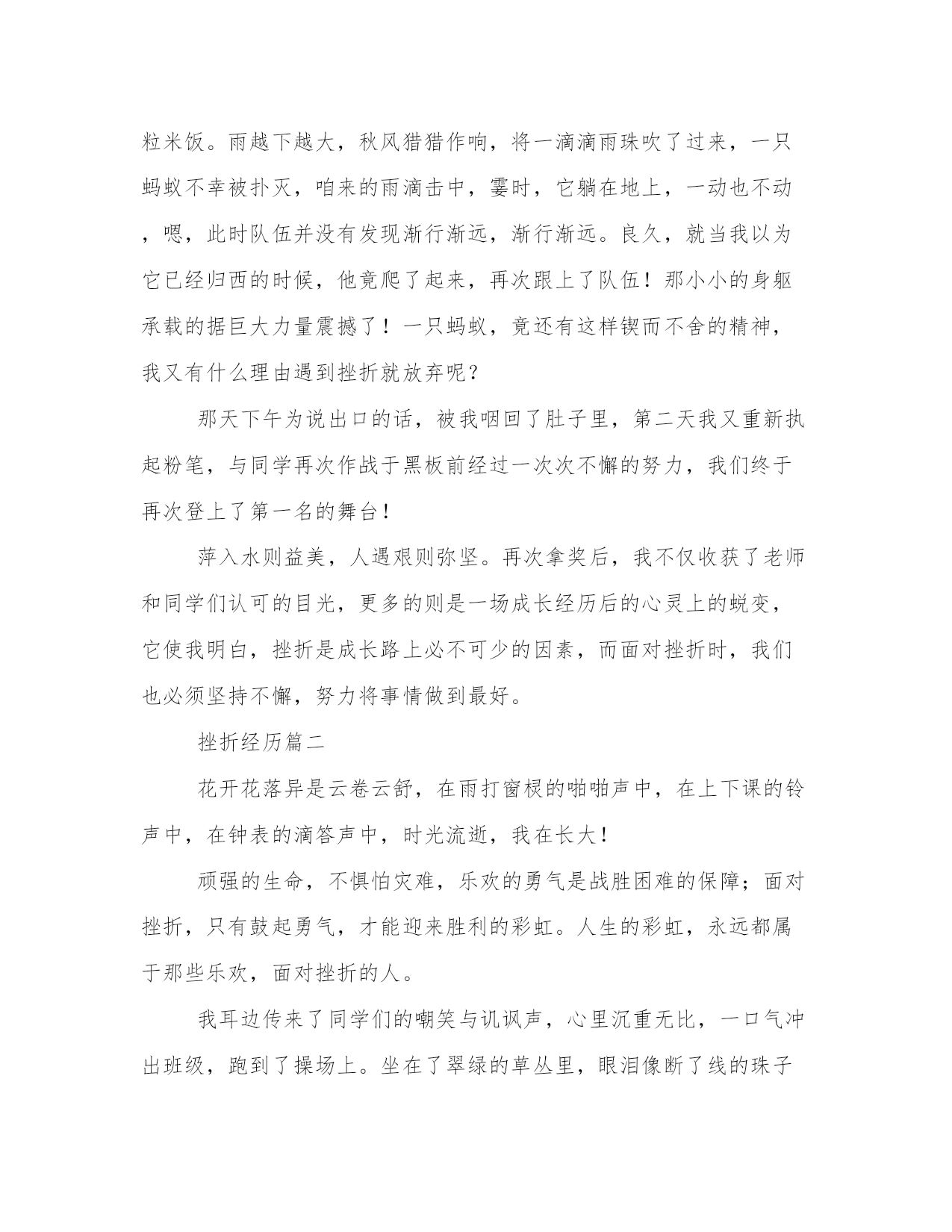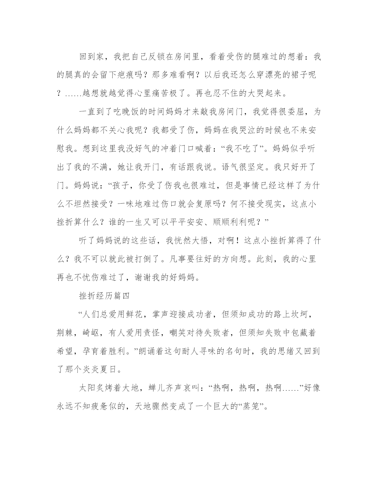 最新挫折经历(6篇)人的记忆力会随着岁月的流逝而衰退,写作可以弥补记忆的不足,将曾经的人生经历和感悟记录下来,也便于保存一份美好的回忆。范文怎么写才能发挥它最大的作用呢?以下是小编为大家收集的优秀范文,欢迎大家分享阅读。挫折经历篇一我独自漫步在空无一人的街头耳畔,同学们,那一声声惊诧声不住地冲击着我脆弱的心灵。没错,这次黑板报我们又没有拿奖,这已经是第三次了。老师和同学们一次次失落的表情,被我尽收眼底。下个月的板报我不出了,我暗想道。转眼间一个月又过了,又到了出板报的时候了。“这次我一定要和老师说我不画了。”我暗自为自己加油打气,谁曾想老师竟提前回家了。我这打了一半气的皮球再次泄了下去。算了,明天再说吧。“啪嗒——”一滴雨珠滴到我的手背上,紧接着便是两滴、三滴......一滴滴雨珠会在一起,形成了一场淅淅沥沥的秋雨,阻碍了我回家的步伐。我抱着书包一路狂奔的近处的屋檐下避雨。我抬头望着阴云密布的子,看来还得再下一阵子啊,呵,真是双喜临门,好事成双啊!我自嘲般摇了摇头,擦拭着头发沾染着的雨珠,四处张望着。忽然,地上一条移动的黑线,闯入了我的视线——原来是一群正在搬运食物的蚂蚁,。只见他们排成一列整齐的队伍,有条不絮地搬运着一粒粒米饭。雨越下越大,秋风猎猎作响,将一滴滴雨珠吹了过来,一只蚂蚁不幸被扑灭,咱来的雨滴击中,霎时,它躺在地上,一动也不动,嗯,此时队伍并没有发现渐行渐远,渐行渐远。良久,就当我以为它已经归西的时候,他竟爬了起来,再次跟上了队伍!那小小的身躯承载的据巨大力量震撼了!一只蚂蚁,竟还有这样锲而不舍的精神,我又有什么理由遇到挫折就放弃呢?那天下午为说出口的话,被我咽回了肚子里,第二天我又重新执起粉笔,与同学再次作战于黑板前经过一次次不懈的努力,我们终于再次登上了第一名的舞台!萍入水则益美,人遇艰则弥坚。再次拿奖后,我不仅收获了老师和同学们认可的目光,更多的则是一场成长经历后的心灵上的蜕变,它使我明白,挫折是成长路上必不可少的因素,而面对挫折时,我们也必须坚持不懈,努力将事情做到最好。挫折经历篇二花开花落异是云卷云舒,在雨打窗棂的啪啪声中,在上下课的铃声中,在钟表的滴答声中,时光流逝,我在长大!顽强的生命,不惧怕灾难,乐欢的勇气是战胜困难的保障;面对挫折,只有鼓起勇气,才能迎来胜利的彩虹。人生的彩虹,永远都属于那些乐欢,面对挫折的人。我耳边传来了同学们的嘲笑与讥讽声,心里沉重无比,一口气冲出班级,跑到了操场上。坐在了翠绿的草丛里,眼泪像断了线的珠子一样,劈了啪啦地往下掉,我的泪珠滴落到了小草身上,发出了“滴答”的声音。它稍微颤抖了一下,但依然顽强的挺立着……天气就像小孩子的脾气一样,说变就变,前一秒晴空万里、万里无云,后一秒就变得电闪雷鸣、乌云密布,从天上狂乱地砸下来如豆子般大的雨点。刚才被我眼泪打到的那些小草,都已经被猛烈的狂风吹得左右摇摆,但仍然抵抗着,雨点沉重地从空中迅速滴落下来,一粒一粒飞向小草,渺小的草被雨点砸昏了头,压弯了腰,却依旧坚韧挺拔。此时,我的心情更加杂乱,但也得到了一些小草给我的启发。不一会儿,雨过天晴,小草们经历了狂风暴雨与电闪雷鸣,显得更加青翠欲滴,它们在经受痛苦与磨难的同时,也在努力地吸允着雨水,给自己补充水分,草叶上有着晶莹剔透的雨点,在缓缓地流动着,慢慢水分吸收了,小草们又回到了原来的模样。心里便不由自主地为小草感到了骄傲和震撼,这是怎样的力量啊!小草都能勇敢地面对挫折、战胜挫折,何况我还是一个人呢?沉思过后,我默默地回到了班级,心也平静了下来,与同学交流了一下当时的心情,同学们也不在嘲笑我,而是鼓励我,一分钟,两分钟……我终于再次找回原来的自信!同学们,我们都要学习小草这种勇气,是面对挫折、战胜挫折的勇气。最重要的是,要像小草一样,在经受痛苦时,也要往开心的事情去想!挫折啊!是你让我成长、长大,学会了要自信、用勇气面对事情,让我知道了只有经历风雨才能见彩虹!我要感谢挫折、感谢风雨,是你让我学会天行建,君子以自强不息的精神!挫折经历篇三我记得在暑假还没有结束的时候,发生了一件很糟糕的事情。那一天,我正在家里看电视,这时,有一个小伙伴来找我玩。我答应了她,便赶快把电视关了,换了鞋子跟她一起出了门。我们一起来到了那个玩游戏的地方,看见表姐也在,于是我们也加入了那个游戏。我们所玩的游戏叫做“撕名牌大战”。第一局刚开始,我就变得很紧张,生怕自己被对手撕掉了名牌。于是我便躲到了一间房子里,隐隐约约听见机器的声音。是什么东西?原来是我们这里的拉链厂。这时,谁知道从哪里跑来了一个对方的对手,想要撕掉我的名牌。幸好我一转头就看见了她。我们在门口“大战”起来。可她的力气比我大多了,不到一分钟就把我身上的名牌撕掉了,而且,我还被她推倒在地,感觉腿有点痛。仔细一看,我的腿摔开了一个大口子。很疼很想哭。我坚持着