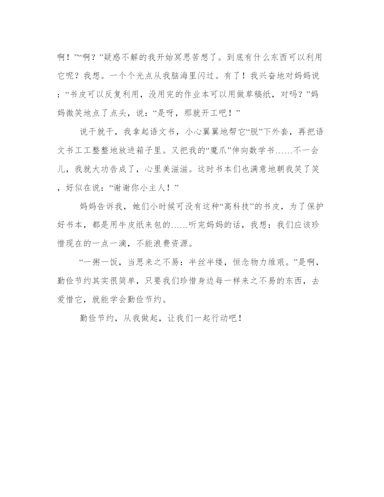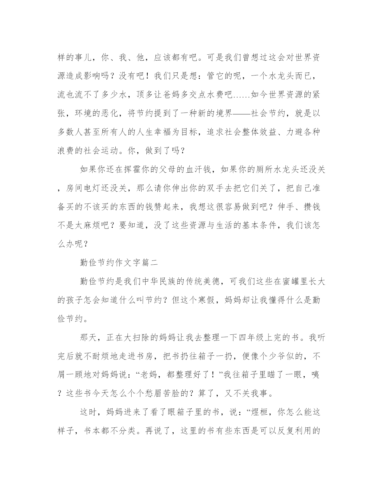最新勤俭节约作文字模板在日常的学习、工作、生活中,肯定对各类范文都很熟悉吧。相信许多人会觉得范文很难写?以下是小编为大家收集的优秀范文,欢迎大家分享阅读。勤俭节约作文字篇一勤俭节约是什么呢?虽然一直把这个词挂在嘴边,但是你们真的做过勤俭节约的事吗?你们真的理解了这个词吗?让我们先来说说钱物吧!父母的钱都来之不易,有打工的,也有的是日夜奔波到客户家里推销产品的、出差到好几个月才回一次家的……而因为你的贪吃、贪玩,这些血汗钱都被一点一滴的“吞噬”,而父母的生活也得因为你而变得艰难,哪怕你的家境多么富裕,因为你的随意挥霍,这些钱财总会花光的。所以,我们要将那些买零食、买游戏卡、玩具的钱攒起来。一天、两天、三天……你总会攒到很多钱的:十元、一百元甚至一千元!你会变成一个“小富翁”!小时候的成功,会对你未来的事业很有帮助,钱物上的节约,请千万要记住哦!再来说说资源吧。随着经济的飞速发展和人们的生活水平日益提高,而使用的资源也不断的增多,资源也更加短缺。我们在生活中洗手完水龙头有拧紧吗?我们出门了有把空调还一直开着吗?仔细想想,我们肯定有过这样的事儿,你、我、他,应该都有吧。可是我们曾想过这会对世界资源造成影响吗?没有吧!我们只是想:管它的呢,一个水龙头而已,流也流不了多少水,顶多让爸妈多交点水费吧……如今世界资源的紧张,环境的恶化,将节约提到了一种新的境界——社会节约,就是以多数人甚至所有人的人生幸福为目标,追求社会整体效益、力避各种浪费的社会运动。你,做到了吗?如果你还在挥霍你的父母的血汗钱,如果你的厕所水龙头还没关,房间电灯还没关,那么请你伸出你的双手去把它们关了,把自己准备买的不该买的东西的钱赞起来,我想这很容易做到吧?伸手、攒钱不是太麻烦吧?要知道,没了这些资源与生活的基本条件,我们该怎么办呢?勤俭节约作文字篇二勤俭节约是我们中华民族的传统美德,可我们这些在蜜罐里长大的孩子怎会知道什么叫节约?但这个寒假,妈妈却让我懂得什么是勤俭节约。那天,正在大扫除的妈妈让我去整理一下四年级上完的书。我听完后就不耐烦地走进书房,把书扔往箱子一扔,便像个少爷似的,不屑一顾地对妈妈说:“老妈,都整理好了!”我往箱子里瞄了一眼,咦?这些书今天怎么个个愁眉苦脸的?算了,又不关我事。这时,妈妈进来了看了眼箱子里的书,说:“煜桓,你怎么能这样子,书本都不分类。再说了,这里的书有些东西是可以反复利用的啊!”“啊?”疑惑不解的我开始冥思苦想了。到底有什么东西可以利用它呢?我想。一个个光点从我脑海里闪过。有了!我兴奋地对妈妈说:“书皮可以反复利用,没用完的作业本可以用做草稿纸,对吗?”妈妈微笑地点了点头,说:“是呀,那就开工吧!”说干就干,我拿起语文书,小心翼翼地帮它“脱”下外套,再把语文书工工整整地放进箱子里。又把我的“魔爪”伸向数学书……不一会儿,我就大功告成了,心里美滋滋。这时书本们也满意地朝我笑了笑,好似在说:“谢谢你小主人!”妈妈告诉我,她们小时候可没有这种“高科技”的书皮,为了保护好书本,都是用牛皮纸来包的……听完妈妈的话,我想:我们应该珍惜现在的一点一滴,不能浪费资源。“一粥一饭,当思来之不易:半丝半缕,恒念物力维艰。”是啊,勤俭节约其实很简单,只要我们珍惜身边每一样来之不易的东西,去爱惜它,就能学会勤俭节约。勤俭节约,从我做起,让我们一起行动吧!