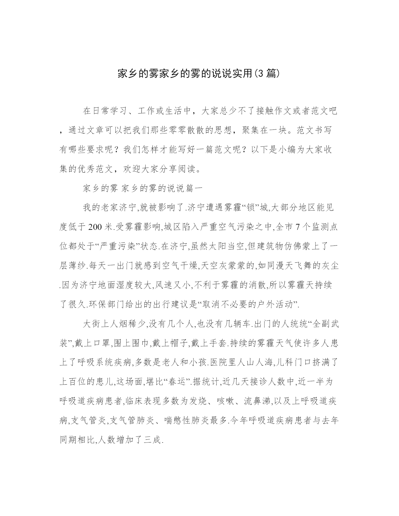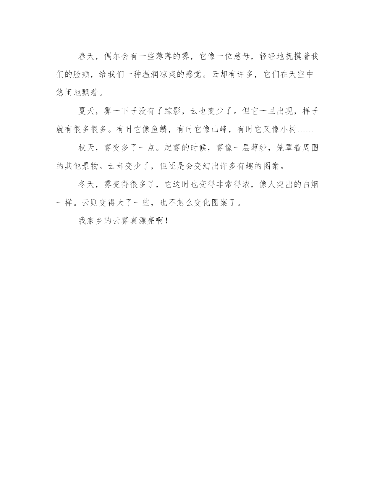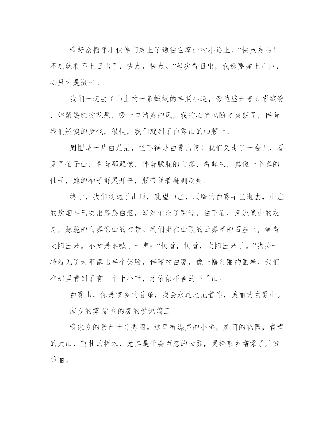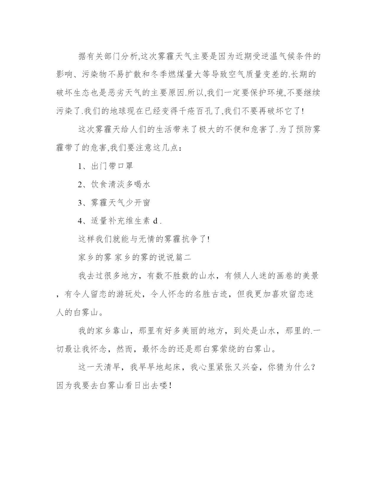 家乡的雾家乡的雾的说说实用(3篇)在日常学习、工作或生活中,大家总少不了接触作文或者范文吧,通过文章可以把我们那些零零散散的思想,聚集在一块。范文书写有哪些要求呢?我们怎样才能写好一篇范文呢?以下是小编为大家收集的优秀范文,欢迎大家分享阅读。家乡的雾家乡的雾的说说篇一我的老家济宁,就被影响了.济宁遭遇雾霾“锁”城,大部分地区能见度低于200米.受雾霾影响,城区陷入严重空气污染之中,全市7个监测点位都处于“严重污染”状态.在济宁,虽然太阳当空,但建筑物仿佛蒙上了一层薄纱.每天一出门就感到空气干燥,天空灰蒙蒙的,如同漫天飞舞的灰尘.因为济宁地面湿度较大,风速又小,不利于雾霾的消散,所以雾霾天持续了很久.环保部门给出的出行建议是“取消不必要的户外活动”.大街上人烟稀少,没有几个人,也没有几辆车.出门的人统统“全副武装”,戴上口罩,围上围巾,戴上帽子,戴上手套.持续的雾霾天气使许多人患上了呼吸系统疾病,多数是老人和小孩.医院里人山人海,儿科门口挤满了上百位的患儿,这场面,堪比“春运”.据统计,近几天接诊人数中,近一半为呼吸道疾病患者,临床表现多数为发烧、咳嗽、流鼻涕,以及上呼吸道疾病,支气管炎,支气管肺炎、喘憋性肺炎最多.今年呼吸道疾病患者与去年同期相比,人数增加了三成.据有关部门分析,这次雾霾天气主要是因为近期受逆温气候条件的影响、污染物不易扩散和冬季燃煤量大等导致空气质量变差的.长期的破坏生态也是恶劣天气的主要原因.所以,我们一定要保护环境,不要继续污染了.我们的地球现在已经变得千疮百孔了,我们不要再破坏它了!这次雾霾天给人们的生活带来了极大的不便和危害了.为了预防雾霾带了的危害,我们要注意这几点:1、出门带口罩2、饮食清淡多喝水3、雾霾天气少开窗4、适量补充维生素d.这样我们就能与无情的雾霾抗争了!家乡的雾家乡的雾的说说篇二我去过很多地方,有数不胜数的山水,有倾人人迷的画卷的美景,有令人留恋的游玩处,令人怀念的名胜古迹,但我更加喜欢留恋迷人的白雾山。我的家乡靠山,那里有好多美丽的地方,到处是山水,那里的.一切最让我怀念,然而,最怀念的还是那白雾萦绕的白雾山。这一天清早,我早早地起床,我心里紧张又兴奋,你猜为什么?因为我要去白雾山看日出去喽!我赶紧招呼小伙伴们走上了通往白雾山的小路上。“快点走啦!不然就看不上日出了,快点,快点。”每次看日出,我都要喊上几声,心里才是滋味。我们一起去了山上的一条蜿蜒的羊肠小道,旁边盛开着五彩缤纷,姹紫嫣红的花果,吸一口清爽的风,我的心情也随之爽朗了,伴着我们矫健的步伐,很快,我们就到了白雾山的山腰上。周围是一片白茫茫,怪不得是白雾山啊!我们又走了一会儿,看见了仙子山,看着那雕像,伴着朦胧的白雾,看起来,真像一个真的仙子,她的袖子舒展开来,腰带随着翩翩起舞。终于,我们到达了山顶,眺望山庄,顶峰的白雾早已逝去,山庄的炊烟早已吹出袅袅白烟,渐渐地没了踪迹,往下看,河流像山的衣身,朦胧的白雾像山的衣带。我们坐在山顶的云雾亭的石座上,等着太阳出来。不知是谁喊了一声:“快看,快看,太阳出来了。”我头一转看见了太阳露出半个笑脸,伴随的白雾,像一幅美丽的画卷,我们在那里看到了有一个半小时,才依依不舍的下了山。白雾山,你是家乡的首峰,我会永远地记着你,美丽的白雾山。家乡的雾家乡的雾的说说篇三我家乡的景色十分秀丽。这里有漂亮的小桥,美丽的花园,青青的大山,茁壮的树木,尤其是千姿百态的云雾,更给家乡增添了几份美丽。春天,偶尔会有一些薄薄的雾,它像一位慈母,轻轻地抚摸着我们的脸颊,给我们一种温润凉爽的感觉。云却有许多,它们在天空中悠闲地飘着。夏天,雾一下子没有了踪影,云也变少了。但它一旦出现,样子就有很多很多。有时它像鱼鳞,有时它像山峰,有时它又像小树……秋天,雾变多了一点。起雾的时候,雾像一层薄纱,笼罩着周围的其他景物。云却变少了,但还是会变幻出许多有趣的图案。冬天,雾变得很多了,它这时也变得非常得浓,像人突出的白烟一样。云则变得大了一些,也不怎么变化图案了。我家乡的云雾真漂亮啊!