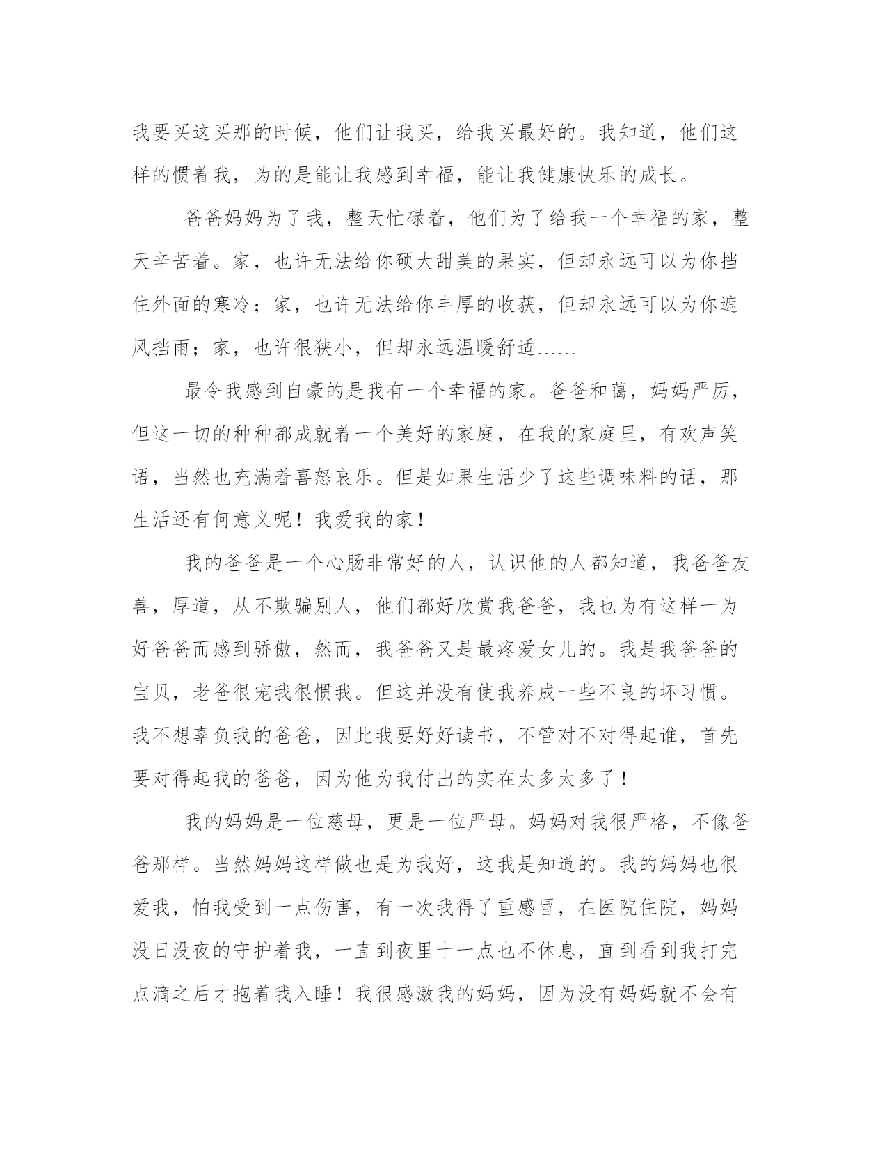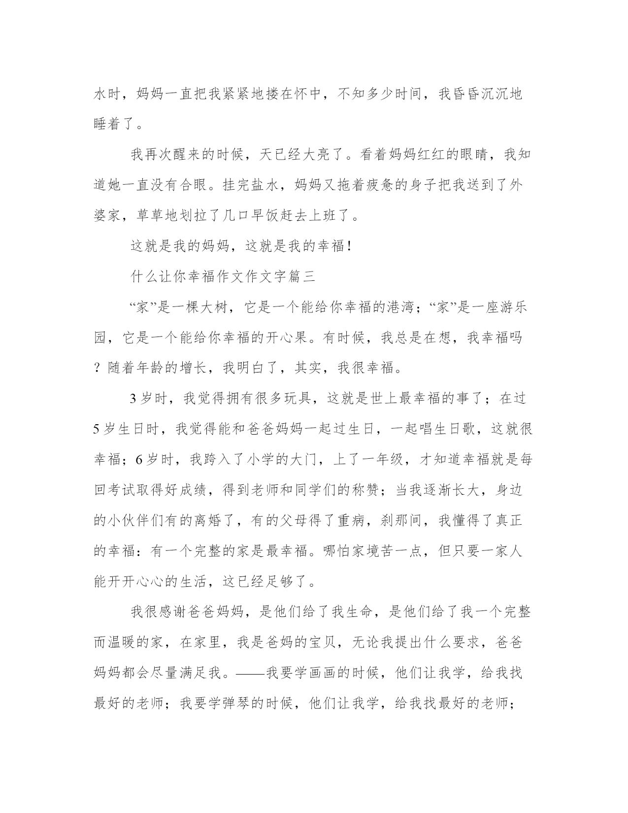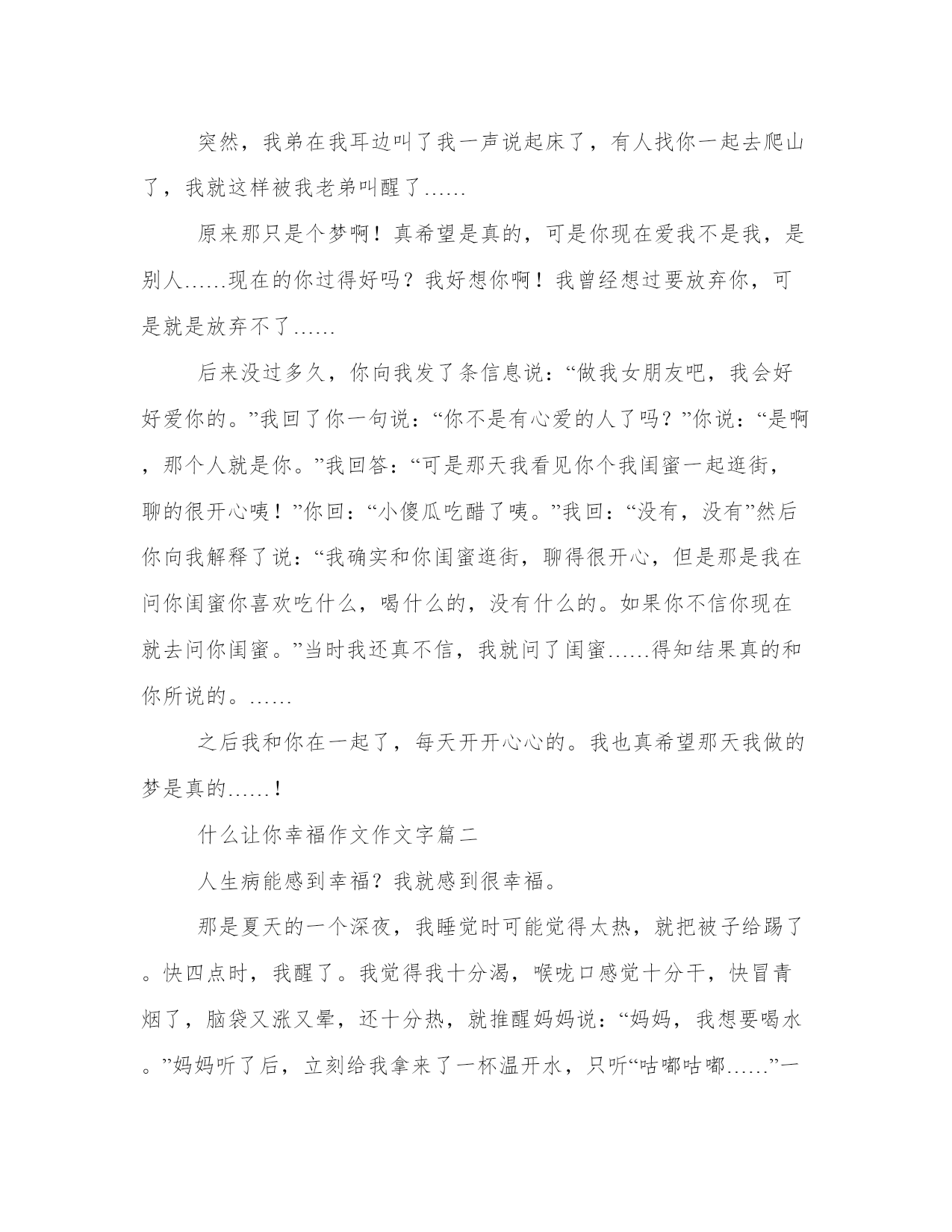 2023年什么让你幸福作文作文字(14篇)范文为教学中作为模范的文章,也常常用来指写作的模板。常常用于文秘写作的参考,也可以作为演讲材料编写前的参考。写范文的时候需要注意什么呢?有哪些格式需要注意呢?以下是我为大家搜集的优质范文,仅供参考,一起来看看吧什么让你幸福作文作文字篇一听了你说的一堆话,我眼泪都留了下来,对着你说:“这我太荒突了吧。”你带着吃醋的语气回答我,说:“我看见有很多人喜欢你,前几天我还看见你和一个男的聊得很开心,那个男的而且还对你表白过……”听着听着,我实在听不下去了,我回:“嘿嘿,你在想什么,别乱说。”我刚说完,你就大声的在我身边喊了一句,说:“梅,我爱你,嫁给我吧,我会对你一生一世好的,做我的小公主,只吃甜,不吃苦”你一说完,你的身边朋友在纷纷的说:“在一起,在一起,嫁给他嫁给他……”看见这一幕,我的眼泪越流越多,我也大声的喊了一声说:“笨蛋我爱你,我答应你求婚。”你听我说了的话,起身抱住了我,抱得很紧、很紧,在我耳朵说了句:“傻瓜,你放心我会照顾好你的一生的,你永远是我的唯一……”没过多久,我们结婚了。在婚礼殿堂里,我们脸上满脸甜蜜笑容,你也向我发誓说今生只允许我吃甜,苦的他来吃……突然,我弟在我耳边叫了我一声说起床了,有人找你一起去爬山了,我就这样被我老弟叫醒了……原来那只是个梦啊!真希望是真的,可是你现在爱我不是我,是别人……现在的你过得好吗?我好想你啊!我曾经想过要放弃你,可是就是放弃不了……后来没过多久,你向我发了条信息说:“做我女朋友吧,我会好好爱你的。”我回了你一句说:“你不是有心爱的人了吗?”你说:“是啊,那个人就是你。”我回答:“可是那天我看见你个我闺蜜一起逛街,聊的很开心咦!”你回:“小傻瓜吃醋了咦。”我回:“没有,没有”然后你向我解释了说:“我确实和你闺蜜逛街,聊得很开心,但是那是我在问你闺蜜你喜欢吃什么,喝什么的,没有什么的。如果你不信你现在就去问你闺蜜。”当时我还真不信,我就问了闺蜜……得知结果真的和你所说的。……之后我和你在一起了,每天开开心心的。我也真希望那天我做的梦是真的……!什么让你幸福作文作文字篇二人生病能感到幸福?我就感到很幸福。那是夏天的一个深夜,我睡觉时可能觉得太热,就把被子给踢了。快四点时,我醒了。我觉得我十分渴,喉咙口感觉十分干,快冒青烟了,脑袋又涨又晕,还十分热,就推醒妈妈说:“妈妈,我想要喝水。”妈妈听了后,立刻给我拿来了一杯温开水,只听“咕嘟咕嘟……”一杯水下去了,一点都不解渴,又要了一杯水喝下去,仍然觉得渴,喝完第三杯后居然还是渴。妈妈十分奇怪:“你怎么喝那么多水,是不是发烧啦?”她边说边把手放在了我的额头上。我也把我的难受告诉了妈妈,她判断是发烧了,立刻拿来冷毛巾敷在我头上。并拿起衣服帮我穿:“儿子,我立刻带你去医院。”我听了妈妈的话,便不再吱声了。妈妈也急速穿好衣服后,背我下了楼,骑上电瓶车,向医院赶去。一路上,我坐在妈妈后面,靠在妈妈的背上,紧紧抱着妈妈,感觉到头似乎不那么晕了,喉咙也不那么渴了。可总觉得坐不住,身体好像不停地往下软。妈妈似乎感觉到了什么,十分着急,不停地喊着我的名字,让我坚持一会儿。她快速地骑着车,闯了好几个红灯,有次还差点摔跤。我贴着妈妈的后背,可以清晰地听到她急促的呼吸声和越来越快的心跳声。到了医院后,妈妈又背着我,一路小跑快冲到急诊处,挂好号。然后背着我去量体温,结果是四十度八。妈妈更急了,通红的脸上汗水越来越多,背起我又向取药处急赶,途中有几点汗水滴在了我的手背上。终于到了输液处,妈妈已经累得上气不接下气了。我十分怕疼,扎针时一下子哭了出来,声音惊天动地。妈妈在一旁看得十分心疼,把我的脑袋紧紧地抱在她的胸前,说:“儿子,你别哭了,我知道你疼,可这也没有办法呀,你是男子汉,忍一忍,马上就好了。”听着妈妈的心跳和安慰,我的哭声渐渐小了,妈妈的心也放松了许多。挂盐水时,妈妈一直把我紧紧地搂在怀中,不知多少时间,我昏昏沉沉地睡着了。我再次醒来的时候,天已经大亮了。看着妈妈红红的眼睛,我知道她一直没有合眼。挂完盐水,妈妈又拖着疲惫的身子把我送到了外婆家,草草地划拉了几口早饭赶去上班了。这就是我的妈妈,这就是我的幸福!什么让你幸福作文作文字篇三“家”是一棵大树,它是一个能给你幸福的港湾;“家”是一座游乐园,它是一个能给你幸福的开心果。有时候,我总是在想,我幸福吗?随着年龄的增长,我明白了,其实,我很幸福。3岁时,我觉得拥有很多玩具,这就是世上最幸福的事了;在过5岁生日时,我觉得能和爸爸妈妈一起过生日,一起唱生日歌,这就很幸福;6岁时,我跨入了小学的大门,上了一年级,才知道幸福就是每回考试取得好成绩,得到老师和同学们的称赞;当我逐渐长大,身边的小伙伴们有的离婚了,有的父母得了重病,刹那间,我懂得了真正的幸福:有一个完整的家是最幸福。哪
