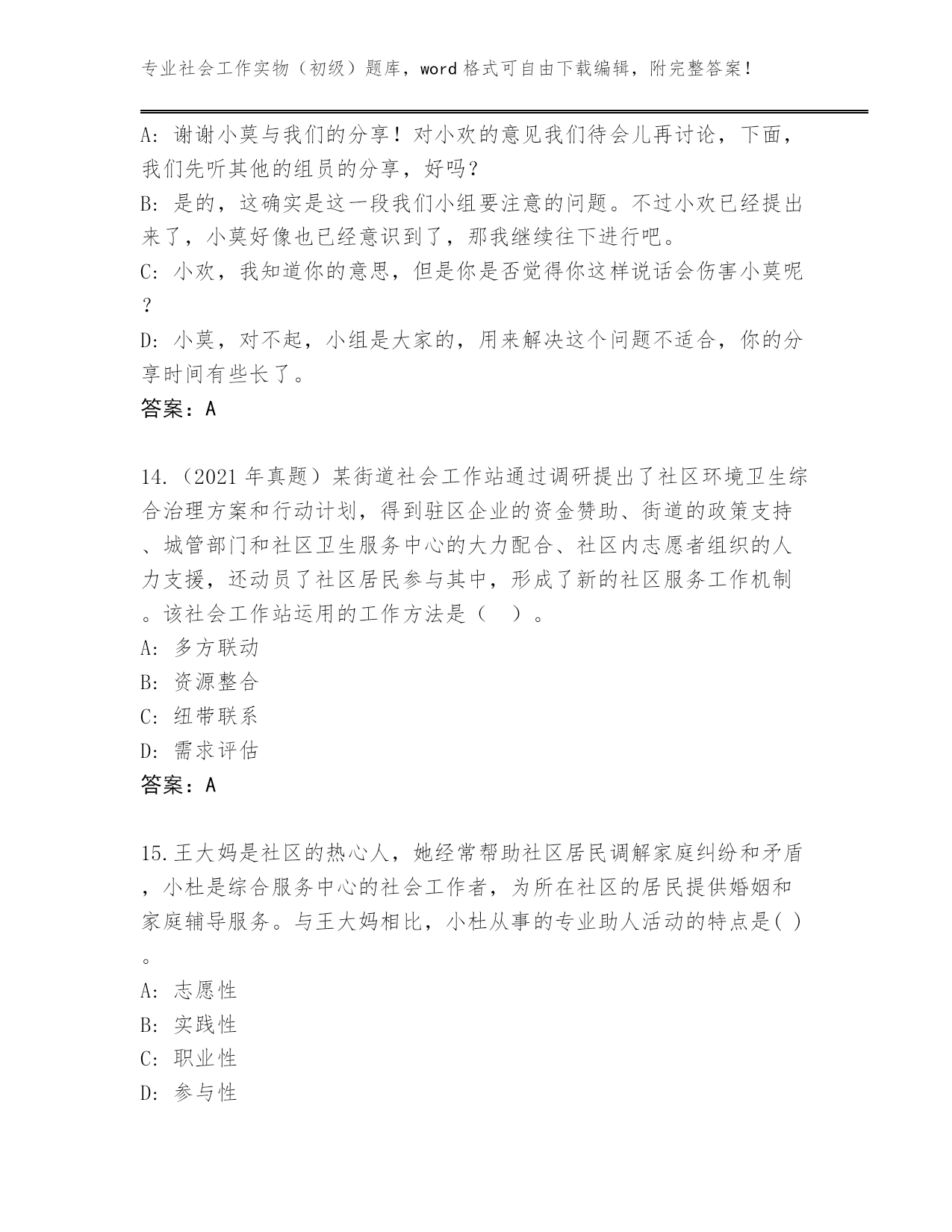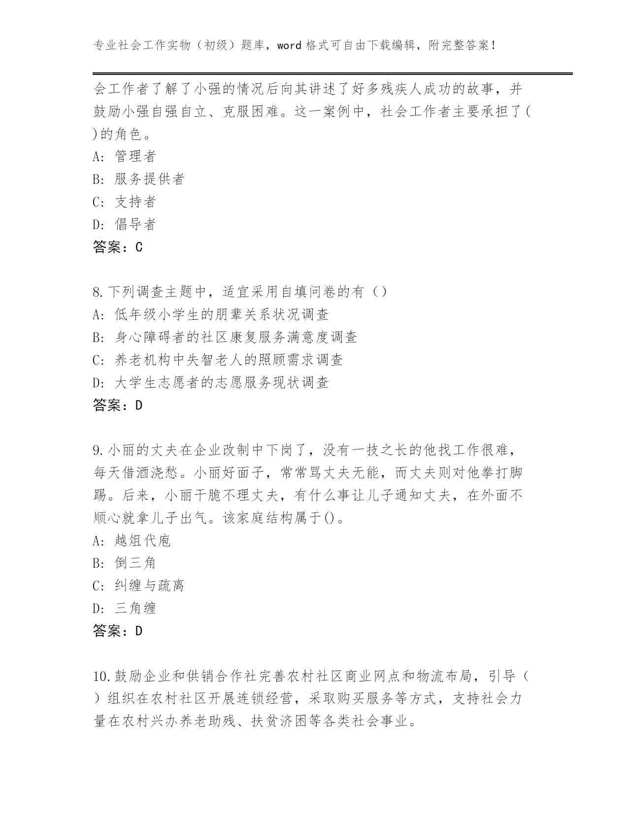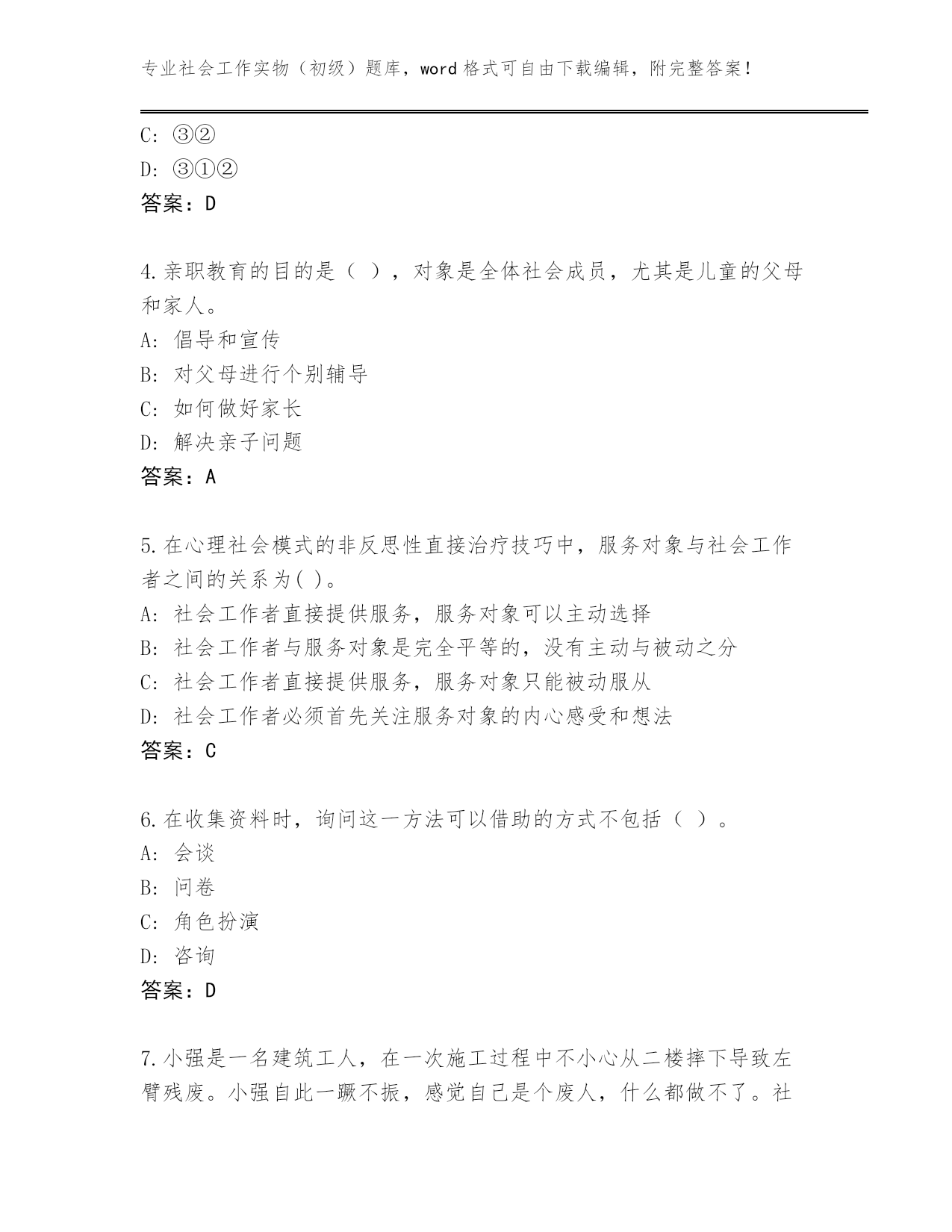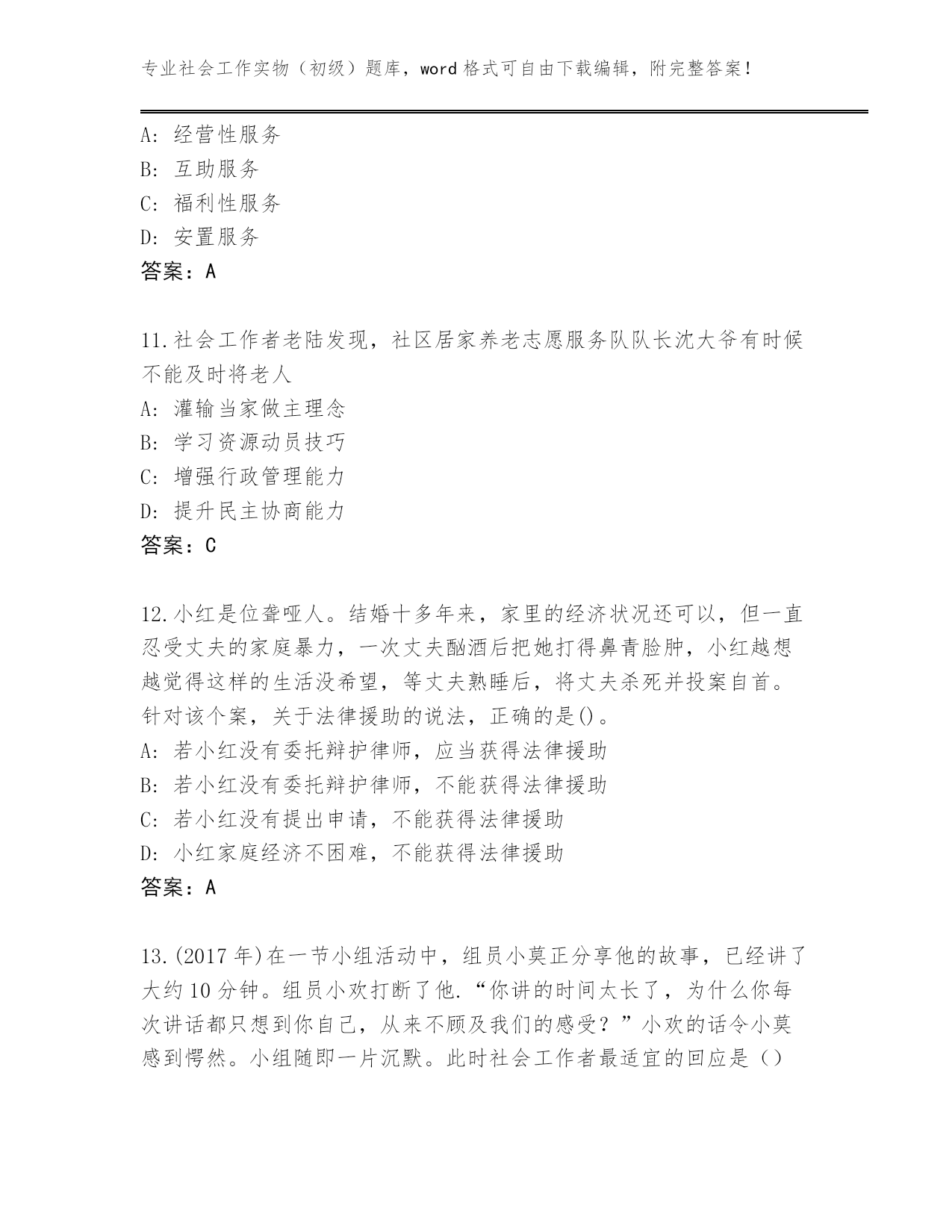 专业社会工作实物(初级)题库,word格式可自由下载编辑,附完整答案!历年河南省兰考县社会工作实物(初级)题库大全含答案(B卷)第I部分单选题(100题)1.夕阳红养老院近日举办了“亲亲桥——亲子汇”活动,形式是每位老人和一位子女一起通过讲故事、唱歌、舞蹈、诗歌朗诵、绘画、书法等任选的方式展现亲情。此活动回应了老年人()的需要。A:经济保障B:居家安全C:婚姻家庭D:健康维护答案:C2.社会工作者要同服务对象建立专业关系,要同机构成员及其他机构建立工作关系,并发展和维护这种关系,以推进社会服务。社会工作者要能够与不同的人打交道,说明社会工作应该具备()的能力。A:评估与计划B:提供服务和干预C:沟通与建立关系D:促进和使能答案:C3.在社区老年人外出活动结束后,社会工作者小林设计了一份调查问卷,旨在了解社区老年人参与外出活动的满意度。这份调查问卷中涉及3个问题。根据问题设计的排序原则,适宜的排序是()。A:②①③B:②③①C:③②D:③①②答案:D4.亲职教育的目的是(),对象是全体社会成员,尤其是儿童的父母和家人。A:倡导和宣传B:对父母进行个别辅导C:如何做好家长D:解决亲子问题答案:A5.在心理社会模式的非反思性直接治疗技巧中,服务对象与社会工作者之间的关系为()。A:社会工作者直接提供服务,服务对象可以主动选择B:社会工作者与服务对象是完全平等的,没有主动与被动之分C:社会工作者直接提供服务,服务对象只能被动服从D:社会工作者必须首先关注服务对象的内心感受和想法答案:C6.在收集资料时,询问这一方法可以借助的方式不包括()。A:会谈B:问卷C:角色扮演D:咨询答案:D7.小强是一名建筑工人,在一次施工过程中不小心从二楼摔下导致左臂残废。小强自此一蹶不振,感觉自己是个废人,什么都做不了。社会工作者了解了小强的情况后向其讲述了好多残疾人成功的故事,并鼓励小强自强自立、克服困难。这一案例中,社会工作者主要承担了()的角色。A:管理者B:服务提供者C:支持者D:倡导者答案:C8.下列调查主题中,适宜采用自填问卷的有()A:低年级小学生的朋辈关系状况调查B:身心障碍者的社区康复服务满意度调查C:养老机构中失智老人的照顾需求调查D:大学生志愿者的志愿服务现状调查答案:D9.小丽的丈夫在企业改制中下岗了,没有一技之长的他找工作很难,每天借酒浇愁。小丽好面子,常常骂丈夫无能,而丈夫则对他拳打脚踢。后来,小丽干脆不理丈夫,有什么事让儿子通知丈夫,在外面不顺心就拿儿子出气。该家庭结构属于()。A:越俎代庖B:倒三角C:纠缠与疏离D:三角缠答案:D10.鼓励企业和供销合作社完善农村社区商业网点和物流布局,引导()组织在农村社区开展连锁经营,采取购买服务等方式,支持社会力量在农村兴办养老助残、扶贫济困等各类社会事业。A:经营性服务B:互助服务C:福利性服务D:安置服务答案:A11.社会工作者老陆发现,社区居家养老志愿服务队队长沈大爷有时候不能及时将老人A:灌输当家做主理念B:学习资源动员技巧C:增强行政管理能力D:提升民主协商能力答案:C12.小红是位聋哑人。结婚十多年来,家里的经济状况还可以,但一直忍受丈夫的家庭暴力,一次丈夫酗酒后把她打得鼻青脸肿,小红越想越觉得这样的生活没希望,等丈夫熟睡后,将丈夫杀死并投案自首。针对该个案,关于法律援助的说法,正确的是()。A:若小红没有委托辩护律师,应当获得法律援助B:若小红没有委托辩护律师,不能获得法律援助C:若小红没有提出申请,不能获得法律援助D:小红家庭经济不困难,不能获得法律援助答案:A13.(2017年)在一节小组活动中,组员小莫正分享他的故事,已经讲了大约10分钟。组员小欢打断了他.“你讲的时间太长了,为什么你每次讲话都只想到你自己,从来不顾及我们的感受?”小欢的话令小莫感到愕然。小组随即一片沉默。此时社会工作者最适宜的回应是()A:谢谢小莫与我们的分享!对小欢的意见我们待会儿再讨论,下面,我们先听其他的组员的分享,好吗?B:是的,这确实是这一段我们小组要注意的问题。不过小欢已经提出来了,小莫好像也已经意识到了,那我继续往下进行吧。C:小欢,我知道你的意思,但是你是否觉得你这样说话会伤害小莫呢?D:小莫,对不起,小组是大家的,用来解决这个问题不适合,你的分享时间有些长了。答案:A14.(2021年真题)某街道社会工作站通过调研提出了社区环境卫生综合治理方案和行动计划,得到驻区企业的资金赞助、街道的政策支持、城管部门和社区卫生服务中心的大力配合、社区内志愿者组织的人力支援,还动员了社区居民参与其中,形成了新的社区服务工作机制。该社会工作站运用的工作方法是()。A:多方联动B:资源整合C:纽带联系D:需求评估答案:A15.王大妈是社区的热心人,她经常帮助社区居民调解家庭纠纷和矛盾,小杜是综合服