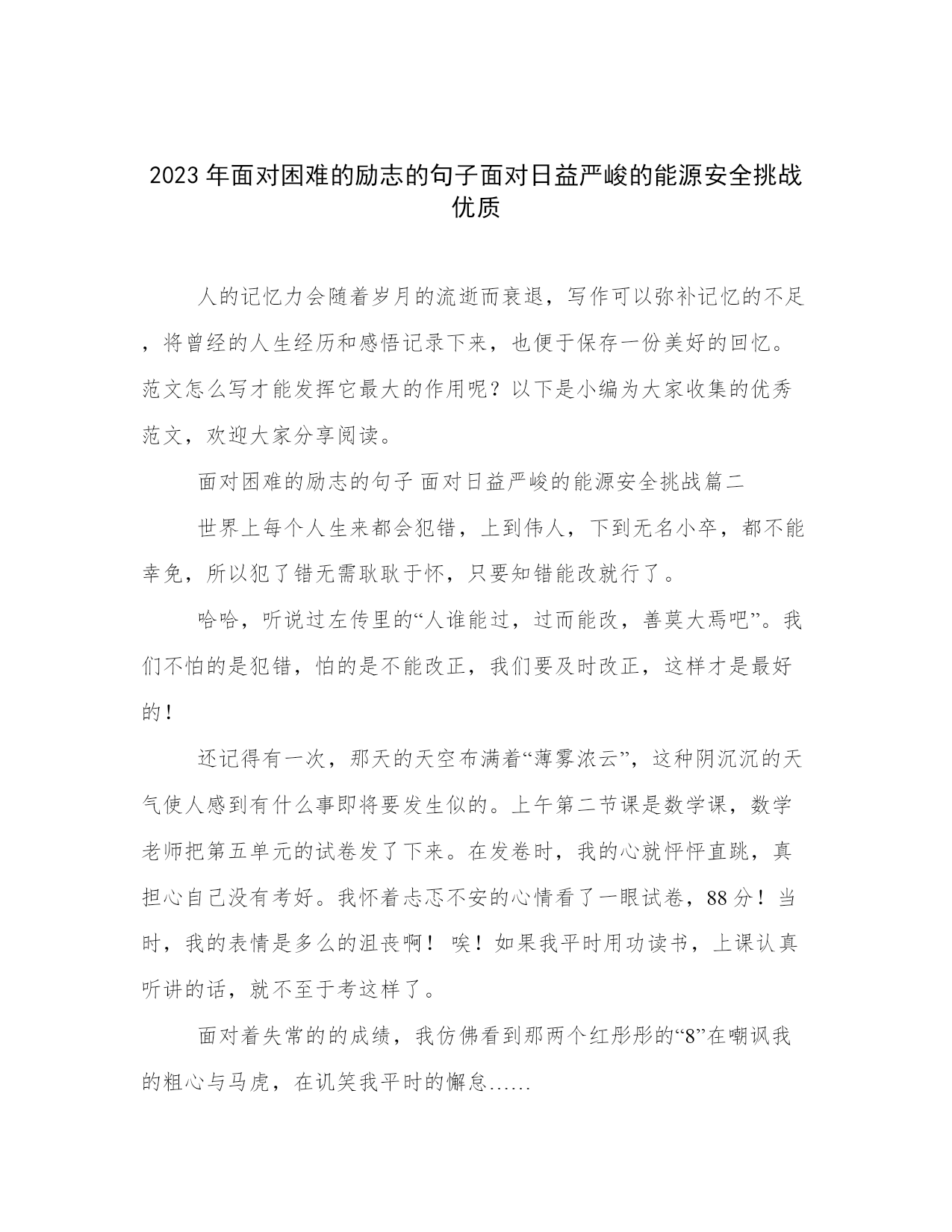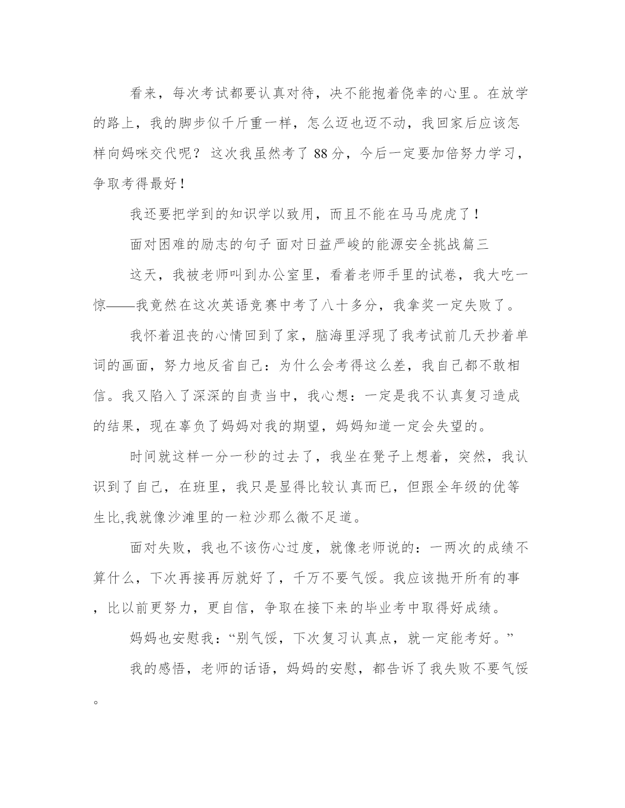 2023年面对困难的励志的句子面对日益严峻的能源安全挑战优质人的记忆力会随着岁月的流逝而衰退,写作可以弥补记忆的不足,将曾经的人生经历和感悟记录下来,也便于保存一份美好的回忆。范文怎么写才能发挥它最大的作用呢?以下是小编为大家收集的优秀范文,欢迎大家分享阅读。面对困难的励志的句子面对日益严峻的能源安全挑战篇二世界上每个人生来都会犯错,上到伟人,下到无名小卒,都不能幸免,所以犯了错无需耿耿于怀,只要知错能改就行了。哈哈,听说过左传里的“人谁能过,过而能改,善莫大焉吧”。我们不怕的是犯错,怕的是不能改正,我们要及时改正,这样才是最好的!还记得有一次,那天的天空布满着“薄雾浓云”,这种阴沉沉的天气使人感到有什么事即将要发生似的。上午第二节课是数学课,数学老师把第五单元的试卷发了下来。在发卷时,我的心就怦怦直跳,真担心自己没有考好。我怀着忐忑不安的心情看了一眼试卷,88分!当时,我的表情是多么的沮丧啊!唉!如果我平时用功读书,上课认真听讲的话,就不至于考这样了。面对着失常的的成绩,我仿佛看到那两个红彤彤的“8”在嘲讽我的粗心与马虎,在讥笑我平时的懈怠……看来,每次考试都要认真对待,决不能抱着侥幸的心里。在放学的路上,我的脚步似千斤重一样,怎么迈也迈不动,我回家后应该怎样向妈咪交代呢?这次我虽然考了88分,今后一定要加倍努力学习,争取考得最好!我还要把学到的知识学以致用,而且不能在马马虎虎了!面对困难的励志的句子面对日益严峻的能源安全挑战篇三这天,我被老师叫到办公室里,看着老师手里的试卷,我大吃一惊——我竟然在这次英语竞赛中考了八十多分,我拿奖一定失败了。我怀着沮丧的心情回到了家,脑海里浮现了我考试前几天抄着单词的画面,努力地反省自己:为什么会考得这么差,我自己都不敢相信。我又陷入了深深的自责当中,我心想:一定是我不认真复习造成的结果,现在辜负了妈妈对我的期望,妈妈知道一定会失望的。时间就这样一分一秒的过去了,我坐在凳子上想着,突然,我认识到了自己,在班里,我只是显得比较认真而已,但跟全年级的优等生比,我就像沙滩里的一粒沙那么微不足道。面对失败,我也不该伤心过度,就像老师说的:一两次的成绩不算什么,下次再接再厉就好了,千万不要气馁。我应该抛开所有的事,比以前更努力,更自信,争取在接下来的毕业考中取得好成绩。妈妈也安慰我:“别气馁,下次复习认真点,就一定能考好。”我的感悟,老师的话语,妈妈的安慰,都告诉了我失败不要气馁。我一定会更加努力的!