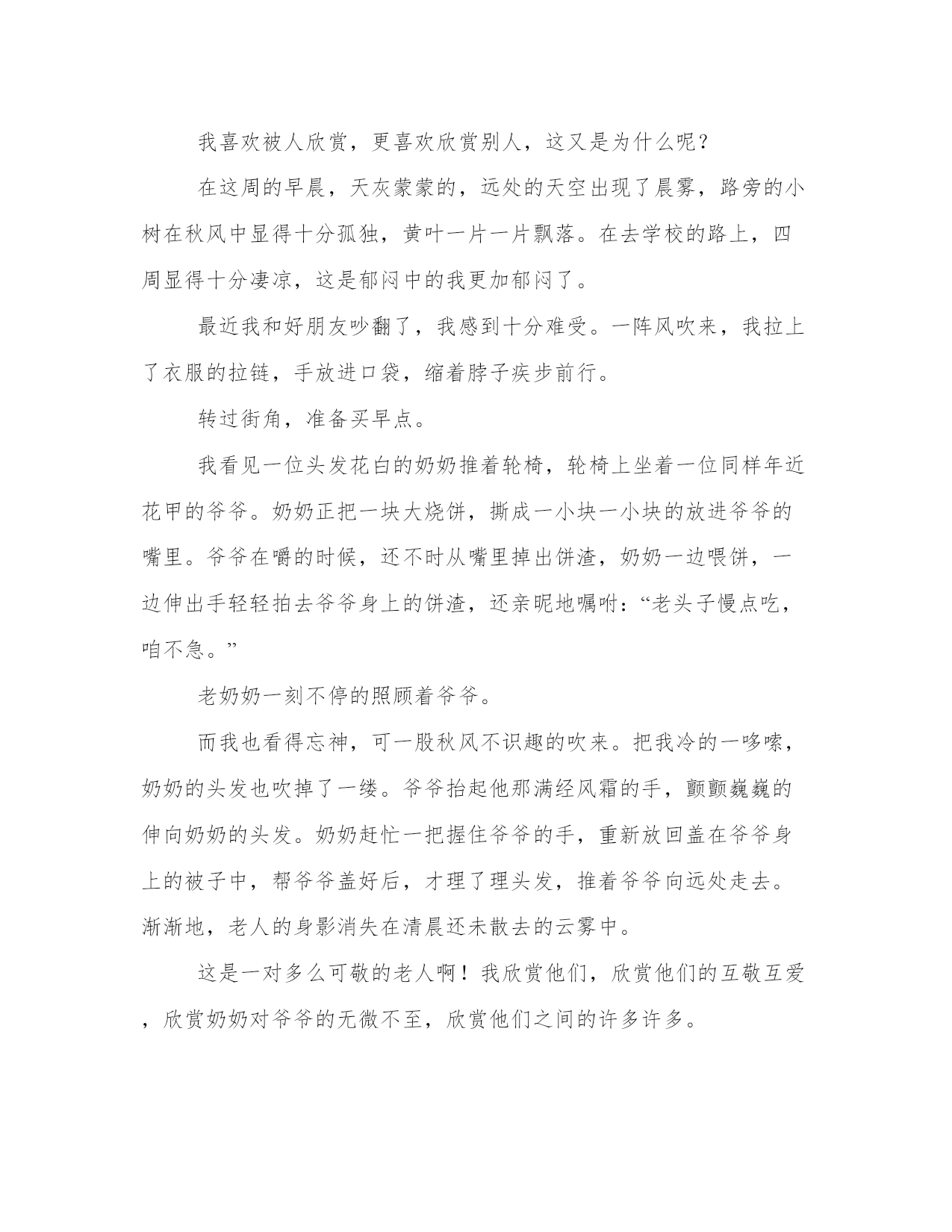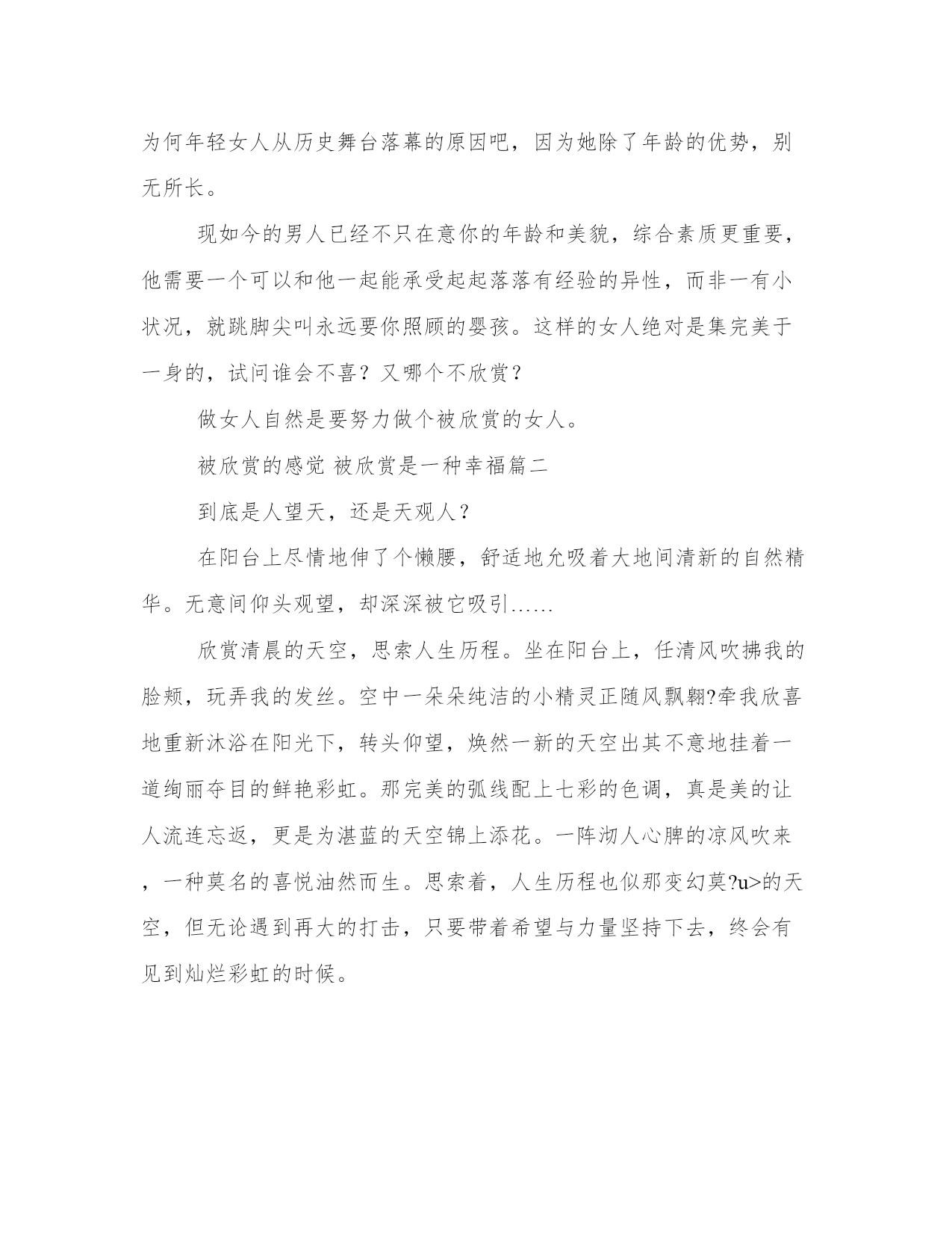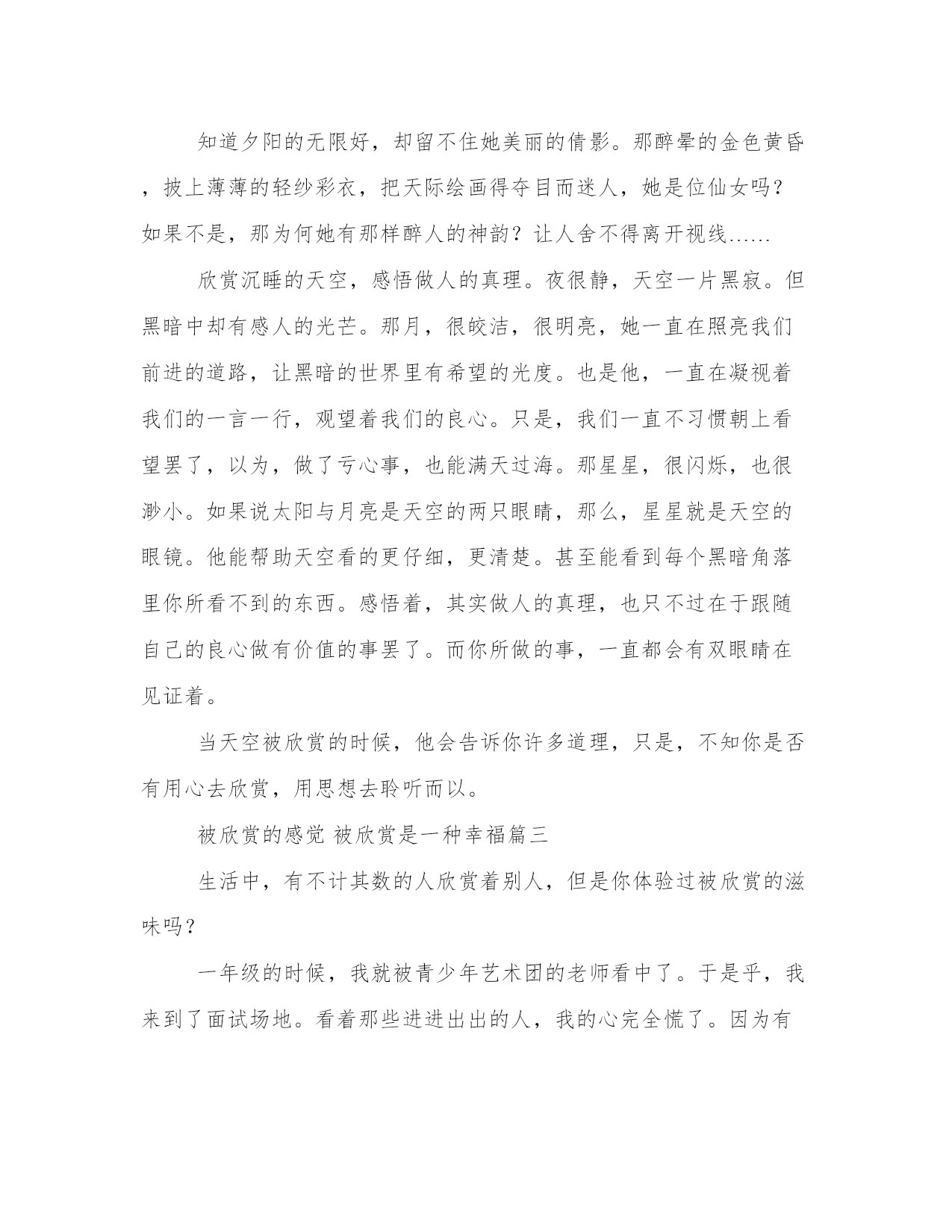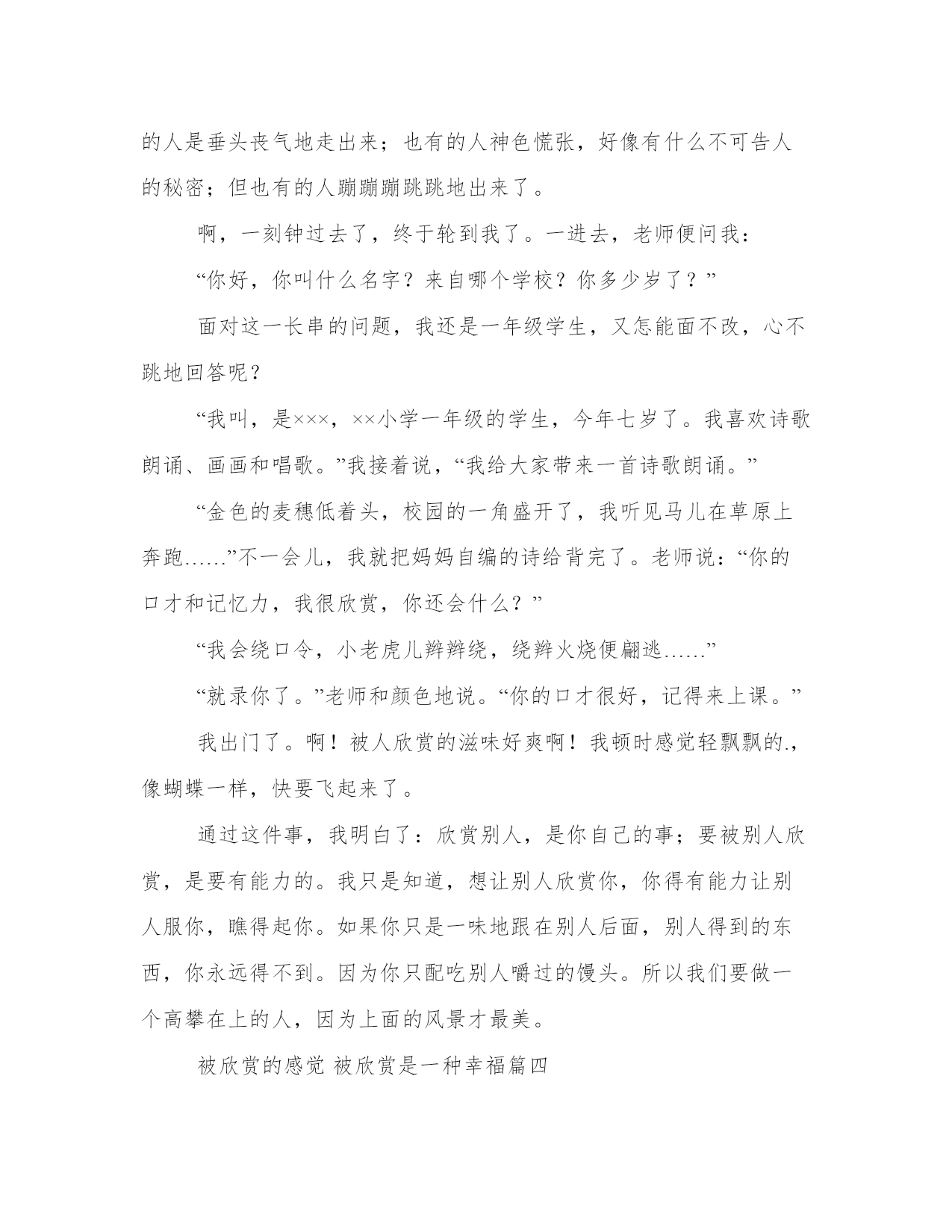 2023年被欣赏的感觉被欣赏是一种幸福(优质四篇)每个人都曾试图在平淡的学习、工作和生活中写一篇文章。写作是培养人的观察、联想、想象、思维和记忆的重要手段。范文怎么写才能发挥它最大的作用呢?接下来小编就给大家介绍一下优秀的范文该怎么写,我们一起来看一看吧。被欣赏的感觉被欣赏是一种幸福篇一呵呵,其实我要提醒你的是,千万别笑的过早,我想那些男人所欣赏的可不是家居服和外出服不分,蓬头垢面的黄脸婆,而是指那些皮滑肉嫩,万种风情的俏娇娘,既不青涩,也不显露沧桑。出得台面,进得厅堂,需要时雷厉风行,不便时静若雕塑的那一类。如此的女人才是男人心中的首选,图占了个年纪没有任何意思,这样算来怕是有很大一部分女子要扼腕了,因为这个年龄段的女子大都以自我毁灭性的状态在生活。其实我很不解,我一直认为男人多是留恋青春靓丽的,因为可以从中找到曾经青春的痕迹,并以熟男的身躯在小女子的心中树立伟岸的形象,而只有女人才会贪恋偏年长的男人,可以恃宠而骄。看来我的观点还是停留在80年代,不过随着科技的进步,而且只要女人肯下功夫,(呵呵,当然还包括了很多人工合成的产物)有时候还真难从外观判断一个女人的真实年龄,但是本身的阅历,自我的修养,言谈的尺度,却是无法像年龄一样可以隐遁的。也许这正是为何年轻女人从历史舞台落幕的原因吧,因为她除了年龄的优势,别无所长。现如今的男人已经不只在意你的年龄和美貌,综合素质更重要,他需要一个可以和他一起能承受起起落落有经验的异性,而非一有小状况,就跳脚尖叫永远要你照顾的婴孩。这样的女人绝对是集完美于一身的,试问谁会不喜?又哪个不欣赏?做女人自然是要努力做个被欣赏的女人。被欣赏的感觉被欣赏是一种幸福篇二到底是人望天,还是天观人?在阳台上尽情地伸了个懒腰,舒适地允吸着大地间清新的自然精华。无意间仰头观望,却深深被它吸引……欣赏清晨的天空,思索人生历程。坐在阳台上,任清风吹拂我的脸颊,玩弄我的发丝。空中一朵朵纯洁的小精灵正随风飘翱?牵我欣喜地重新沐浴在阳光下,转头仰望,焕然一新的天空出其不意地挂着一道绚丽夺目的鲜艳彩虹。那完美的弧线配上七彩的色调,真是美的让人流连忘返,更是为湛蓝的天空锦上添花。一阵沏人心脾的凉风吹来,一种莫名的喜悦油然而生。思索着,人生历程也似那变幻莫?u>的天空,但无论遇到再大的打击,只要带着希望与力量坚持下去,终会有见到灿烂彩虹的时候。知道夕阳的无限好,却留不住她美丽的倩影。那醉晕的金色黄昏,披上薄薄的轻纱彩衣,把天际绘画得夺目而迷人,她是位仙女吗?如果不是,那为何她有那样醉人的神韵?让人舍不得离开视线……欣赏沉睡的天空,感悟做人的真理。夜很静,天空一片黑寂。但黑暗中却有感人的光芒。那月,很皎洁,很明亮,她一直在照亮我们前进的道路,让黑暗的世界里有希望的光度。也是他,一直在凝视着我们的一言一行,观望着我们的良心。只是,我们一直不习惯朝上看望罢了,以为,做了亏心事,也能满天过海。那星星,很闪烁,也很渺小。如果说太阳与月亮是天空的两只眼睛,那么,星星就是天空的眼镜。他能帮助天空看的更仔细,更清楚。甚至能看到每个黑暗角落里你所看不到的东西。感悟着,其实做人的真理,也只不过在于跟随自己的良心做有价值的事罢了。而你所做的事,一直都会有双眼睛在见证着。当天空被欣赏的时候,他会告诉你许多道理,只是,不知你是否有用心去欣赏,用思想去聆听而以。被欣赏的感觉被欣赏是一种幸福篇三生活中,有不计其数的人欣赏着别人,但是你体验过被欣赏的滋味吗?一年级的时候,我就被青少年艺术团的老师看中了。于是乎,我来到了面试场地。看着那些进进出出的人,我的心完全慌了。因为有的人是垂头丧气地走出来;也有的人神色慌张,好像有什么不可告人的秘密;但也有的人蹦蹦蹦跳跳地出来了。啊,一刻钟过去了,终于轮到我了。一进去,老师便问我:“你好,你叫什么名字?来自哪个学校?你多少岁了?”面对这一长串的问题,我还是一年级学生,又怎能面不改,心不跳地回答呢?“我叫,是×××,××小学一年级的学生,今年七岁了。我喜欢诗歌朗诵、画画和唱歌。”我接着说,“我给大家带来一首诗歌朗诵。”“金色的麦穗低着头,校园的一角盛开了,我听见马儿在草原上奔跑……”不一会儿,我就把妈妈自编的诗给背完了。老师说:“你的口才和记忆力,我很欣赏,你还会什么?”“我会绕口令,小老虎儿辫辫绕,绕辫火烧便翩逃……”“就录你了。”老师和颜色地说。“你的口才很好,记得来上课。”我出门了。啊!被人欣赏的滋味好爽啊!我顿时感觉轻飘飘的.,像蝴蝶一样,快要飞起来了。通过这件事,我明白了:欣赏别人,是你自己的事;要被别人欣赏,是要有能力的。我只是知道,想让别人欣赏你,你得有能力让别人服你,瞧得起你。如果你只是一味地跟在别人后面,别人得到的东西,你永远得不到。因为你只配吃别人嚼过的馒头。所以我们要做一个高攀在上的人,因为上面的风景才