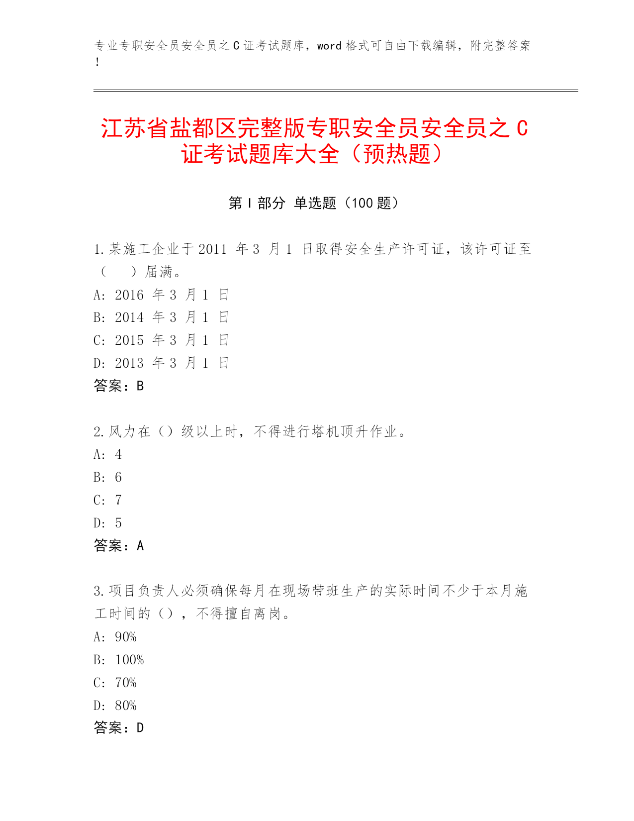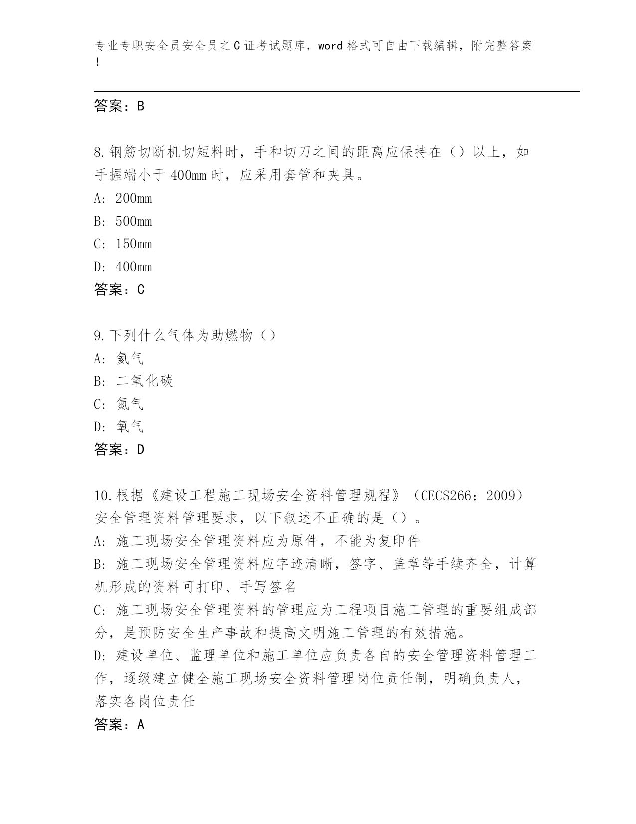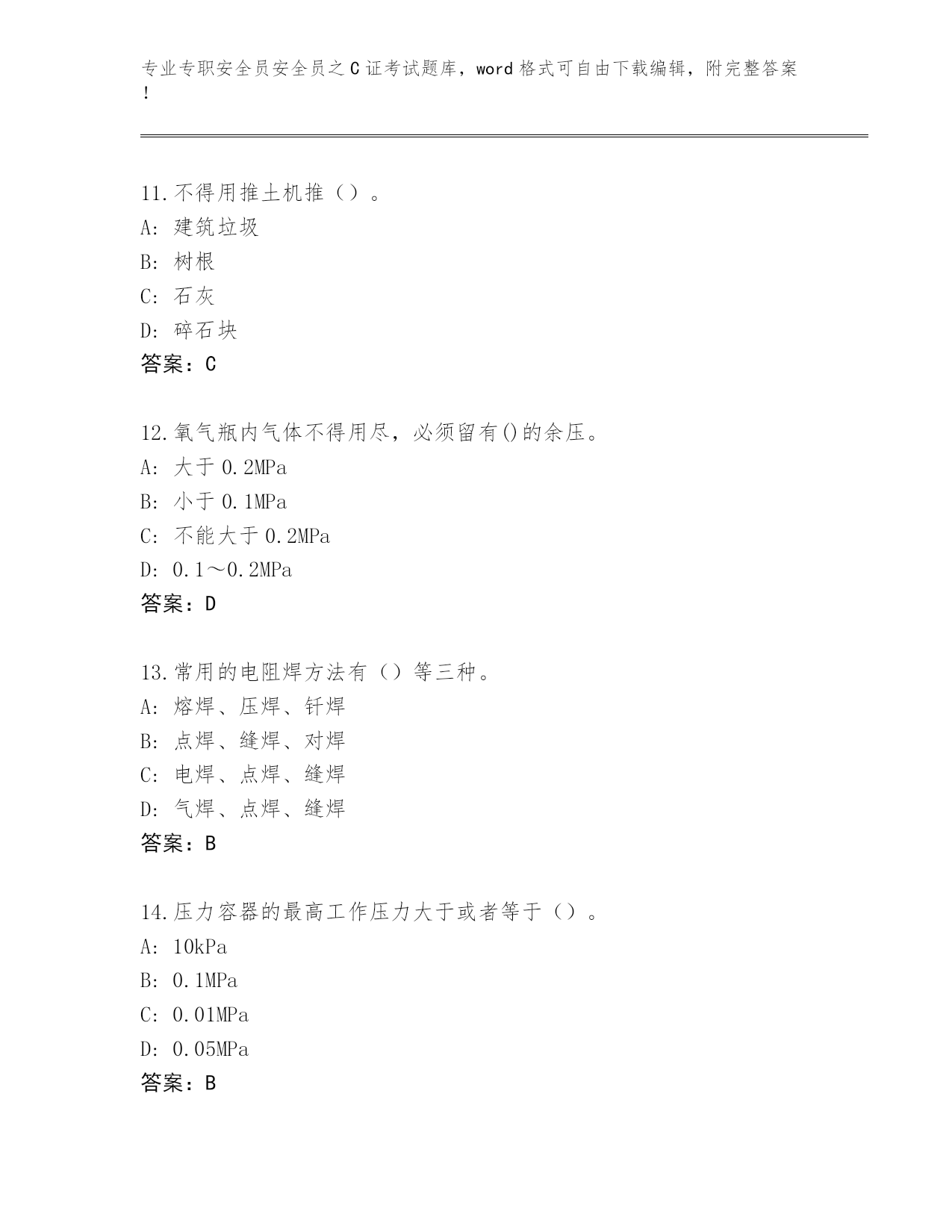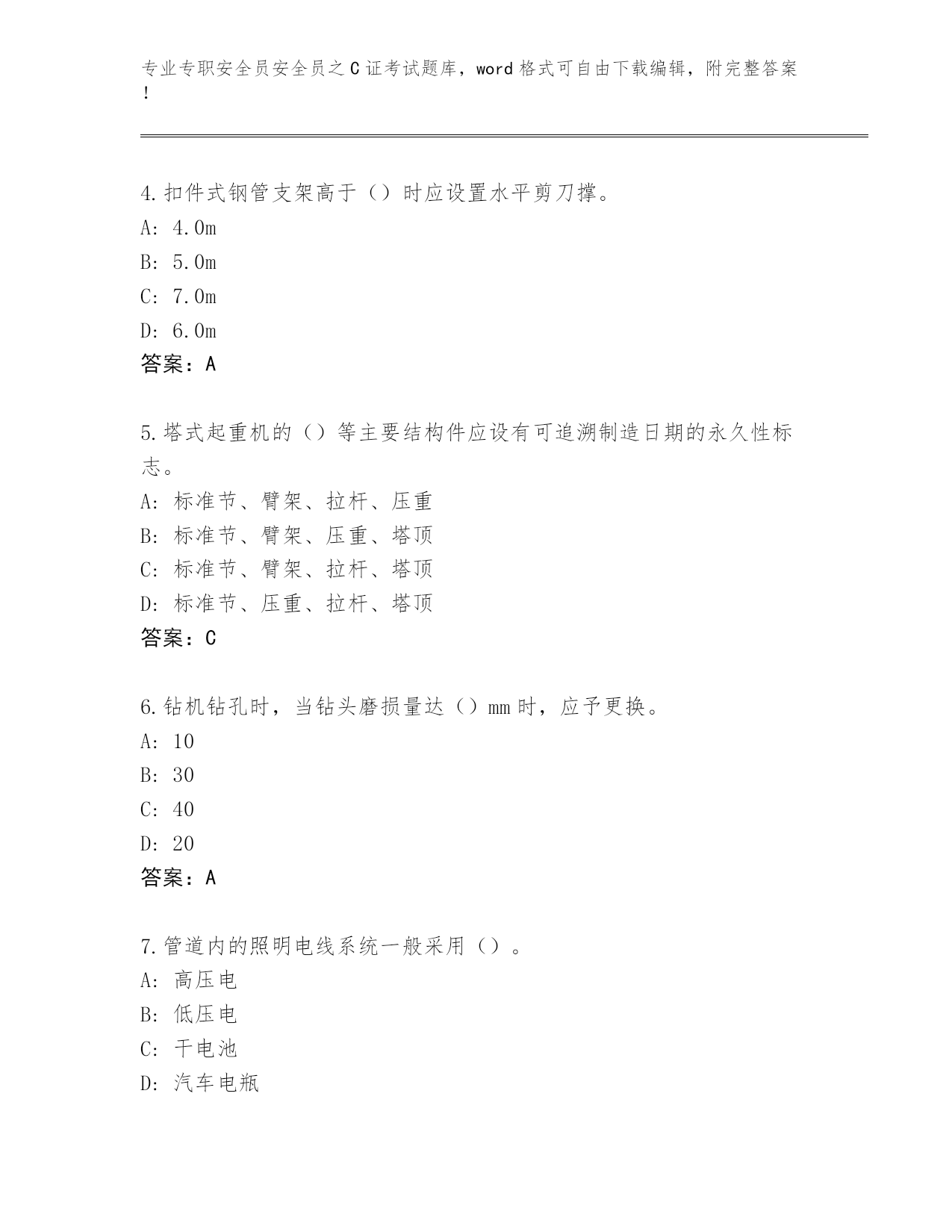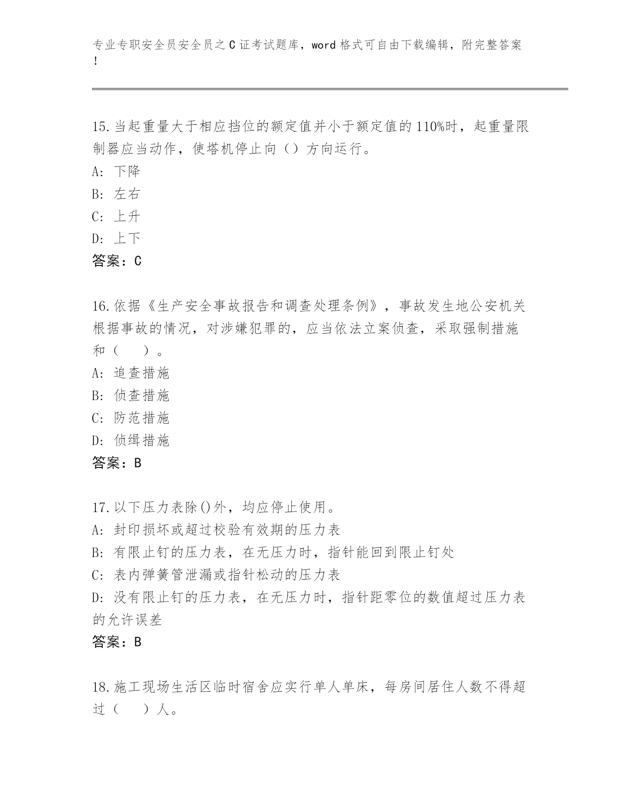 专业专职安全员安全员之C证考试题库,word格式可自由下载编辑,附完整答案!江苏省盐都区完整版专职安全员安全员之C证考试题库大全(预热题)第I部分单选题(100题)1.某施工企业于2011年3月1日取得安全生产许可证,该许可证至()届满。A:2016年3月1日B:2014年3月1日C:2015年3月1日D:2013年3月1日答案:B2.风力在()级以上时,不得进行塔机顶升作业。A:4B:6C:7D:5答案:A3.项目负责人必须确保每月在现场带班生产的实际时间不少于本月施工时间的(),不得擅自离岗。A:90%B:100%C:70%D:80%答案:D4.扣件式钢管支架高于()时应设置水平剪刀撑。A:4.0mB:5.0mC:7.0mD:6.0m答案:A5.塔式起重机的()等主要结构件应设有可追溯制造日期的永久性标志。A:标准节、臂架、拉杆、压重B:标准节、臂架、压重、塔顶C:标准节、臂架、拉杆、塔顶D:标准节、压重、拉杆、塔顶答案:C6.钻机钻孔时,当钻头磨损量达()mm时,应予更换。A:10B:30C:40D:20答案:A7.管道内的照明电线系统一般采用()。A:高压电B:低压电C:干电池D:汽车电瓶答案:B8.钢筋切断机切短料时,手和切刀之间的距离应保持在()以上,如手握端小于400mm时,应采用套管和夹具。A:200mmB:500mmC:150mmD:400mm答案:C9.下列什么气体为助燃物()A:氦气B:二氧化碳C:氮气D:氧气答案:D10.根据《建设工程施工现场安全资料管理规程》(CECS266:2009)安全管理资料管理要求,以下叙述不正确的是()。A:施工现场安全管理资料应为原件,不能为复印件B:施工现场安全管理资料应字迹清晰,签字、盖章等手续齐全,计算机形成的资料可打印、手写签名C:施工现场安全管理资料的管理应为工程项目施工管理的重要组成部分,是预防安全生产事故和提高文明施工管理的有效措施。D:建设单位、监理单位和施工单位应负责各自的安全管理资料管理工作,逐级建立健全施工现场安全资料管理岗位责任制,明确负责人,落实各岗位责任答案:A11.不得用推土机推()。A:建筑垃圾B:树根C:石灰D:碎石块答案:C12.氧气瓶内气体不得用尽,必须留有()的余压。A:大于0.2MPaB:小于0.1MPaC:不能大于0.2MPaD:0.1~0.2MPa答案:D13.常用的电阻焊方法有()等三种。A:熔焊、压焊、钎焊B:点焊、缝焊、对焊C:电焊、点焊、缝焊D:气焊、点焊、缝焊答案:B14.压力容器的最高工作压力大于或者等于()。A:10kPaB:0.1MPaC:0.01MPaD:0.05MPa答案:B15.当起重量大于相应挡位的额定值并小于额定值的110%时,起重量限制器应当动作,使塔机停止向()方向运行。A:下降B:左右C:上升D:上下答案:C16.依据《生产安全事故报告和调查处理条例》,事故发生地公安机关根据事故的情况,对涉嫌犯罪的,应当依法立案侦查,采取强制措施和()。A:追查措施B:侦查措施C:防范措施D:侦缉措施答案:B17.以下压力表除()外,均应停止使用。A:封印损坏或超过校验有效期的压力表B:有限止钉的压力表,在无压力时,指针能回到限止钉处C:表内弹簧管泄漏或指针松动的压力表D:没有限止钉的压力表,在无压力时,指针距零位的数值超过压力表的允许误差答案:B18.施工现场生活区临时宿舍应实行单人单床,每房间居住人数不得超过()人。A:20B:16C:24D:12答案:B19.根据《生产安全事故报告和调查处理条例》,企业在安全生产许可证有效期内,严格遵守有关安全生产的法律法规,()安全生产许可证有效期届满时,经原安全生产许可证颁发管理机关同意,不再审查,安全生产许可证有效期延期三年。A:未发生重大事故的B:未发生较大事故的C:未发生死亡事故的D:未发生一般事故的答案:C20.某工地没有塔吊,则塔吊在汇总表中有缺项,其他个分项检查在汇总表实得分为84分,计算改工地汇总表实得分为()。A:84分B:9.4分C:93.34分D:8.4分答案:C21.应急预案演习时,()都应参加应急演习,以熟悉应急状态后的行动方案。A:现场管理人员B:全体安全员C:相关单位D:所有施工现场人员答案:D22.根据《建设工程安全生产管理条例》规定,施工现场临时搭建的建筑物应当符合安全使用要求。施工现场使用的装配式活动房屋应当具有()。A:产品装箱单B:安装验收单C:产品合格证D:使用说明书答案:C23.建设施工企业应及时将工程项目重大隐患排查治理的有关情况向()报告。建设单位应积极协调勘察、设计,施工、监理、监测等单位,并在资金,人员等方面积极配合做好重大隐患排查治理工作。A:设计单位B:监理单位C:勘察单位D:建设单位答案:D24.双排脚手架横向水