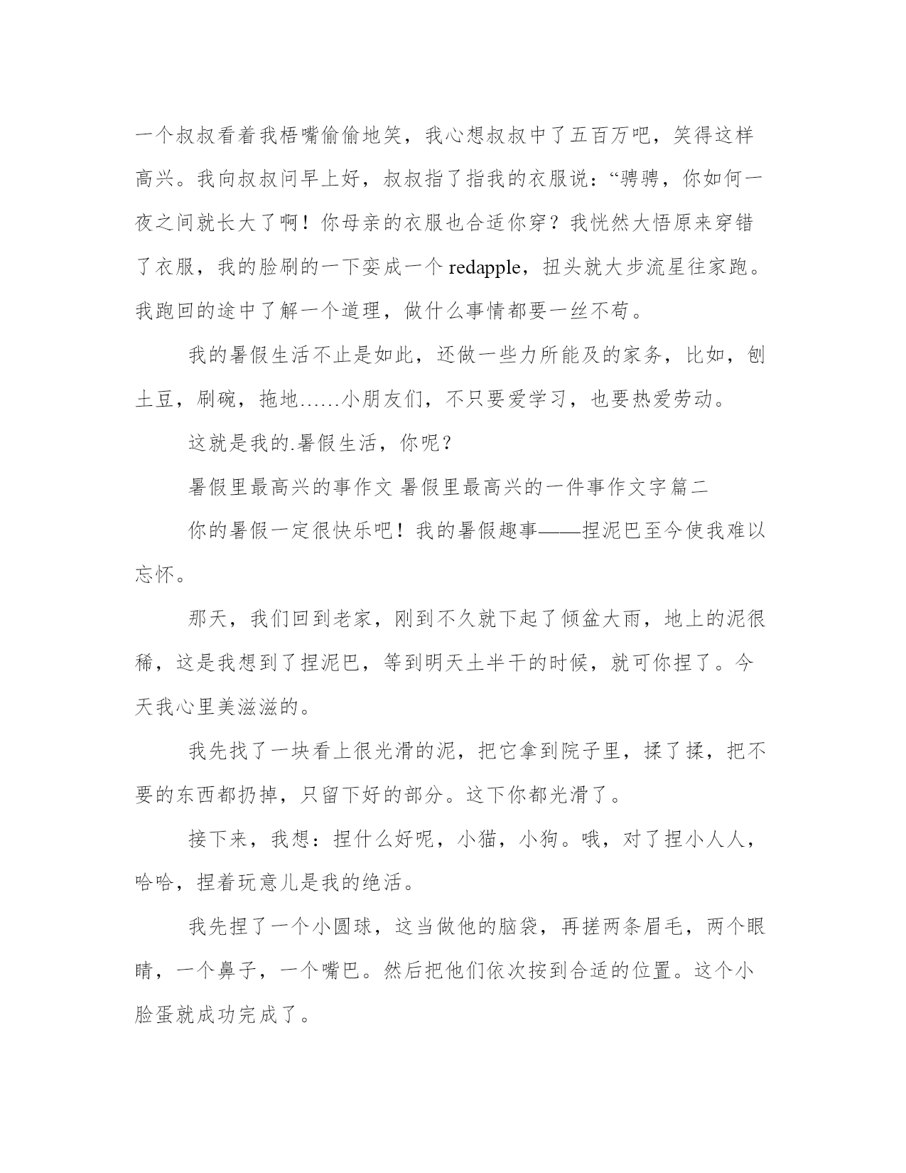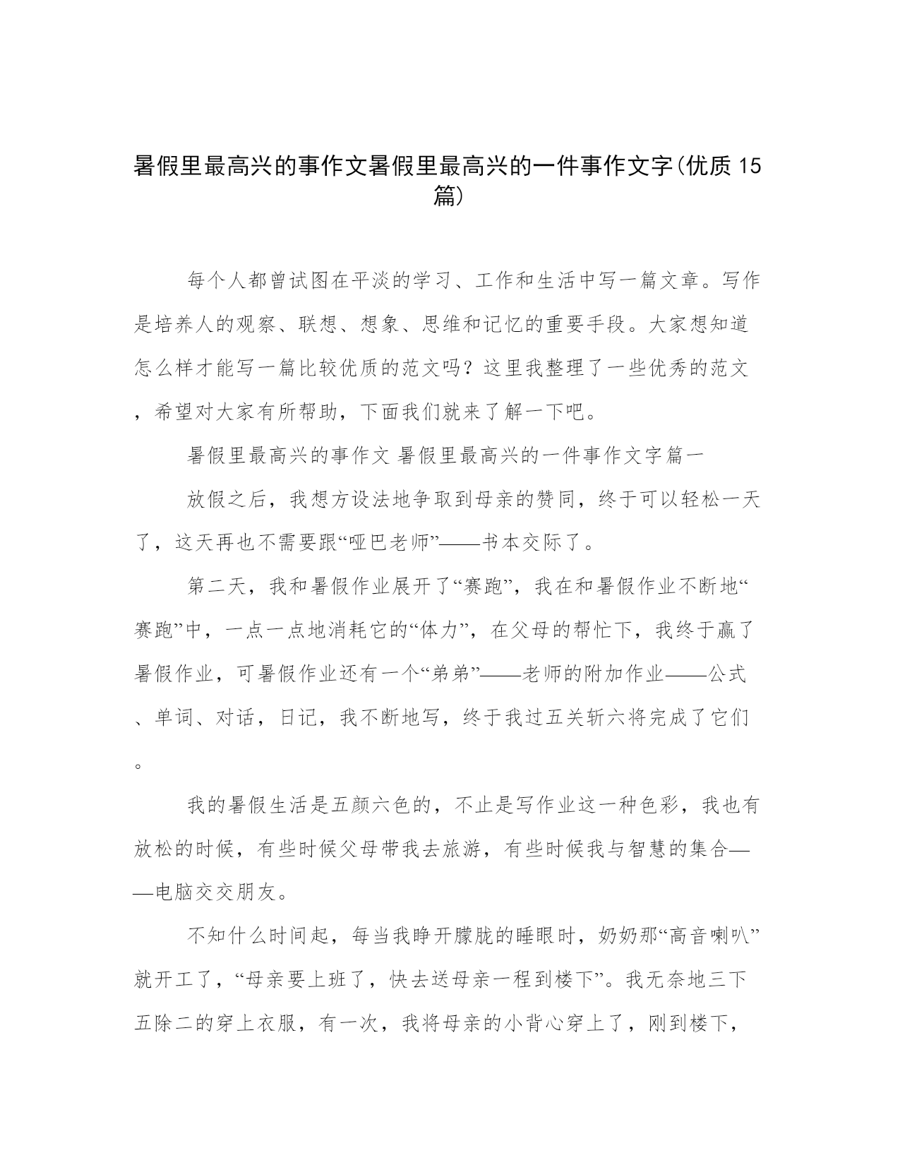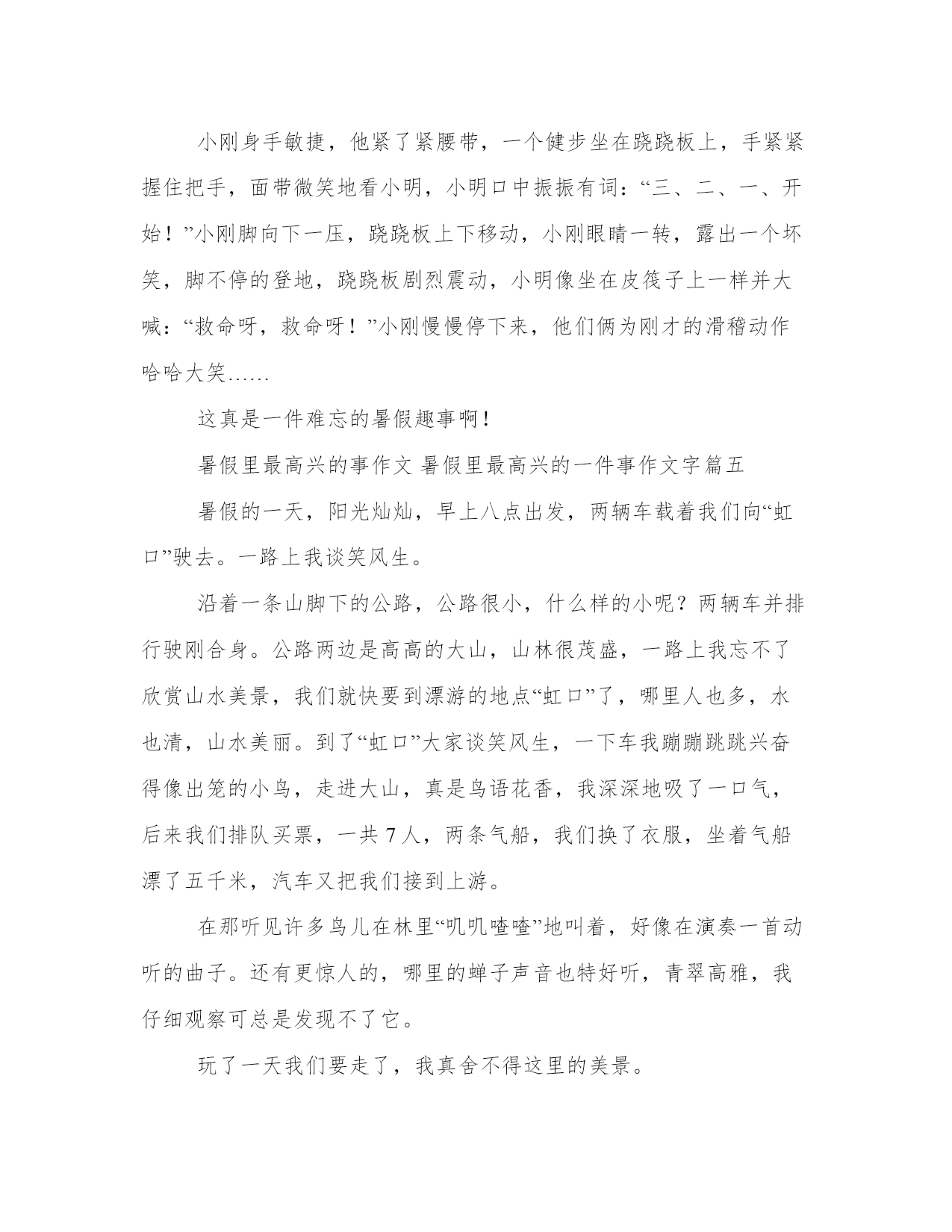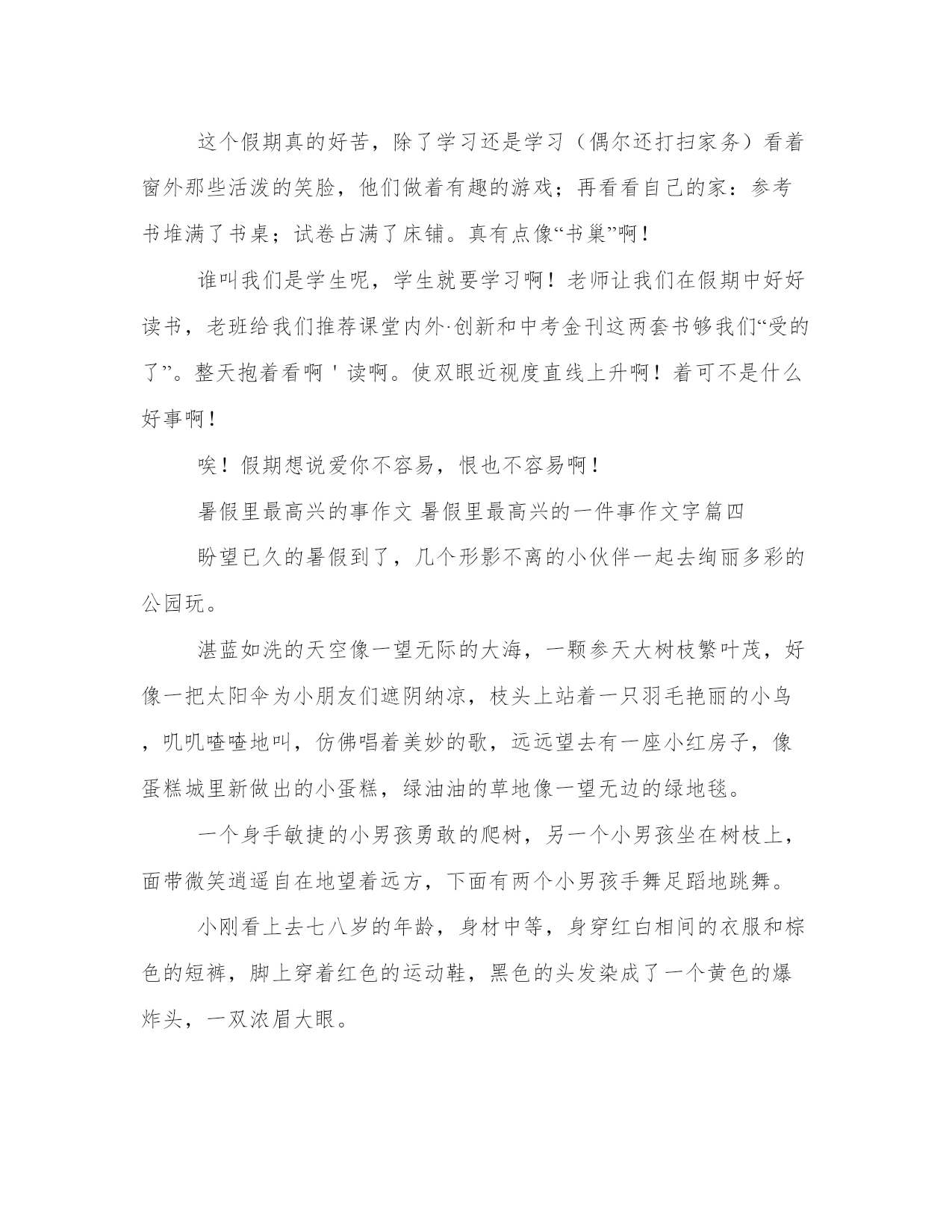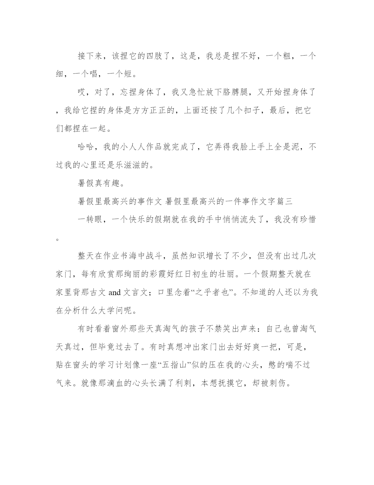 暑假里最高兴的事作文暑假里最高兴的一件事作文字(优质15篇)每个人都曾试图在平淡的学习、工作和生活中写一篇文章。写作是培养人的观察、联想、想象、思维和记忆的重要手段。大家想知道怎么样才能写一篇比较优质的范文吗?这里我整理了一些优秀的范文,希望对大家有所帮助,下面我们就来了解一下吧。暑假里最高兴的事作文暑假里最高兴的一件事作文字篇一放假之后,我想方设法地争取到母亲的赞同,终于可以轻松一天了,这天再也不需要跟“哑巴老师”——书本交际了。第二天,我和暑假作业展开了“赛跑”,我在和暑假作业不断地“赛跑”中,一点一点地消耗它的“体力”,在父母的帮忙下,我终于赢了暑假作业,可暑假作业还有一个“弟弟”——老师的附加作业——公式、单词、对话,日记,我不断地写,终于我过五关斩六将完成了它们。我的暑假生活是五颜六色的,不止是写作业这一种色彩,我也有放松的时候,有些时候父母带我去旅游,有些时候我与智慧的集合——电脑交交朋友。不知什么时间起,每当我睁开朦胧的睡眼时,奶奶那“高音喇叭”就开工了,“母亲要上班了,快去送母亲一程到楼下”。我无奈地三下五除二的穿上衣服,有一次,我将母亲的小背心穿上了,刚到楼下,一个叔叔看着我梧嘴偷偷地笑,我心想叔叔中了五百万吧,笑得这样高兴。我向叔叔问早上好,叔叔指了指我的衣服说:“骋骋,你如何一夜之间就长大了啊!你母亲的衣服也合适你穿?我恍然大悟原来穿错了衣服,我的脸刷的一下娈成一个redapple,扭头就大步流星往家跑。我跑回的途中了解一个道理,做什么事情都要一丝不苟。我的暑假生活不止是如此,还做一些力所能及的家务,比如,刨土豆,刷碗,拖地……小朋友们,不只要爱学习,也要热爱劳动。这就是我的.暑假生活,你呢?暑假里最高兴的事作文暑假里最高兴的一件事作文字篇二你的暑假一定很快乐吧!我的暑假趣事——捏泥巴至今使我难以忘怀。那天,我们回到老家,刚到不久就下起了倾盆大雨,地上的泥很稀,这是我想到了捏泥巴,等到明天土半干的时候,就可你捏了。今天我心里美滋滋的。我先找了一块看上很光滑的泥,把它拿到院子里,揉了揉,把不要的东西都扔掉,只留下好的部分。这下你都光滑了。接下来,我想:捏什么好呢,小猫,小狗。哦,对了捏小人人,哈哈,捏着玩意儿是我的绝活。我先捏了一个小圆球,这当做他的脑袋,再搓两条眉毛,两个眼睛,一个鼻子,一个嘴巴。然后把他们依次按到合适的位置。这个小脸蛋就成功完成了。接下来,该捏它的四肢了,这是,我总是捏不好,一个粗,一个细,一个唱,一个短。哎,对了,忘捏身体了,我又急忙放下胳膊腿,又开始捏身体了,我给它捏的身体是方方正正的,上面还按了几个扣子,最后,把它们都捏在一起。哈哈,我的小人人作品就完成了,它弄得我脸上手上全是泥,不过我的心里还是乐滋滋的。暑假真有趣。暑假里最高兴的事作文暑假里最高兴的一件事作文字篇三一转眼,一个快乐的假期就在我的手中悄悄流失了,我没有珍惜。整天在作业书海中战斗,虽然知识增长了不少,但没有出过几次家门,每有欣赏那绚丽的彩霞好红日初生的壮丽。一个假期整天就在家里背那古文and文言文;口里念着“之乎者也”。不知道的人还以为我在分析什么大学问呢。有时看着窗外那些天真淘气的孩子不禁笑出声来:自己也曾淘气天真过,但毕竟过去了。有时真想冲出家门出去好好爽一把,可是,贴在窗头的学习计划像一座“五指山”似的压在我的心头,憋的喘不过气来。就像那滴血的心头长满了利刺,本想抚摸它,却被刺伤。这个假期真的好苦,除了学习还是学习(偶尔还打扫家务)看着窗外那些活泼的笑脸,他们做着有趣的游戏;再看看自己的家:参考书堆满了书桌;试卷占满了床铺。真有点像“书巢”啊!谁叫我们是学生呢,学生就要学习啊!老师让我们在假期中好好读书,老班给我们推荐课堂内外·创新和中考金刊这两套书够我们“受的了”。整天抱着看啊'读啊。使双眼近视度直线上升啊!着可不是什么好事啊!唉!假期想说爱你不容易,恨也不容易啊!暑假里最高兴的事作文暑假里最高兴的一件事作文字篇四盼望已久的暑假到了,几个形影不离的小伙伴一起去绚丽多彩的公园玩。湛蓝如洗的天空像一望无际的大海,一颗参天大树枝繁叶茂,好像一把太阳伞为小朋友们遮阴纳凉,枝头上站着一只羽毛艳丽的小鸟,叽叽喳喳地叫,仿佛唱着美妙的歌,远远望去有一座小红房子,像蛋糕城里新做出的小蛋糕,绿油油的草地像一望无边的绿地毯。一个身手敏捷的小男孩勇敢的爬树,另一个小男孩坐在树枝上,面带微笑逍遥自在地望着远方,下面有两个小男孩手舞足蹈地跳舞。小刚看上去七八岁的年龄,身材中等,身穿红白相间的衣服和棕色的短裤,脚上穿着红色的运动鞋,黑色的头发染成了一个黄色的爆炸头,一双浓眉大眼。小刚身手敏捷,他紧了紧腰带,一个健步坐在跷跷板上,手紧紧握住把手,面带微笑地看小明,小明口中振振有词:“三、二、一、开始!”小刚脚向下一压,跷跷板上下移动,小刚