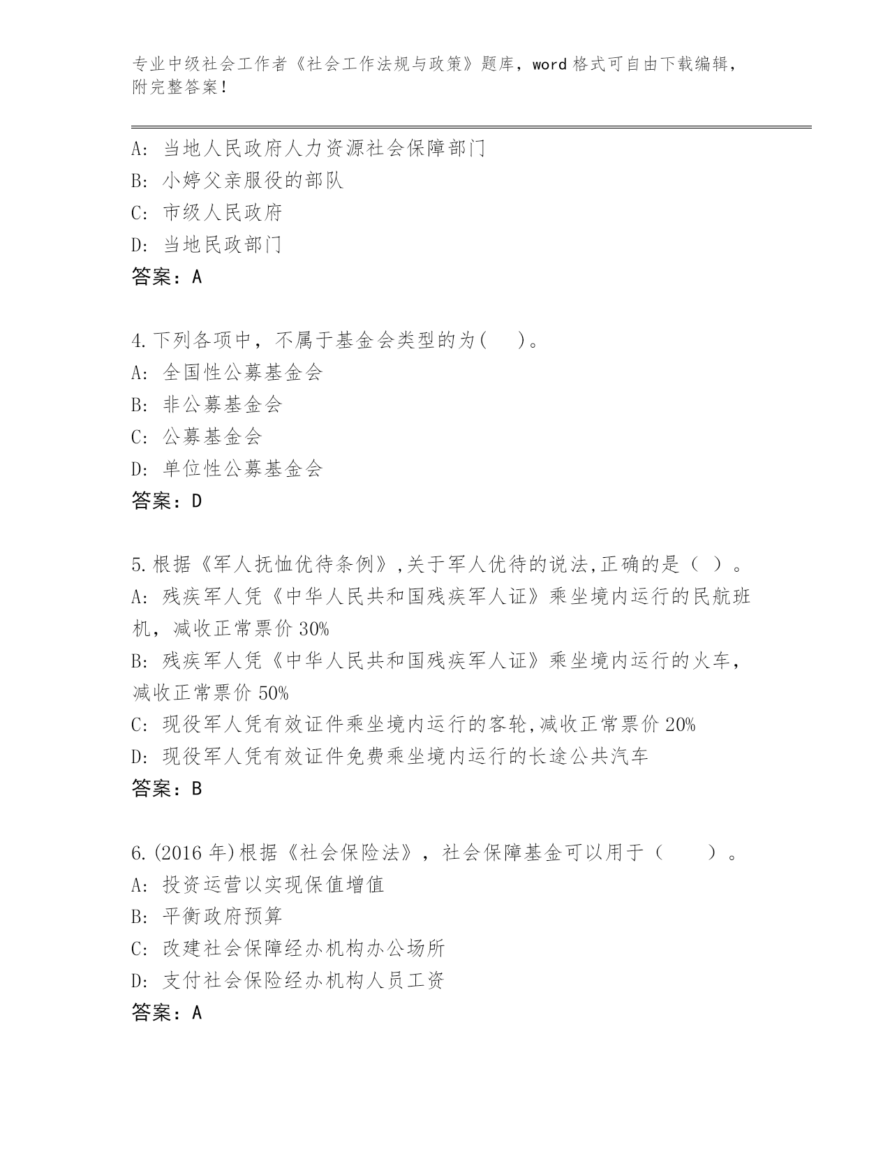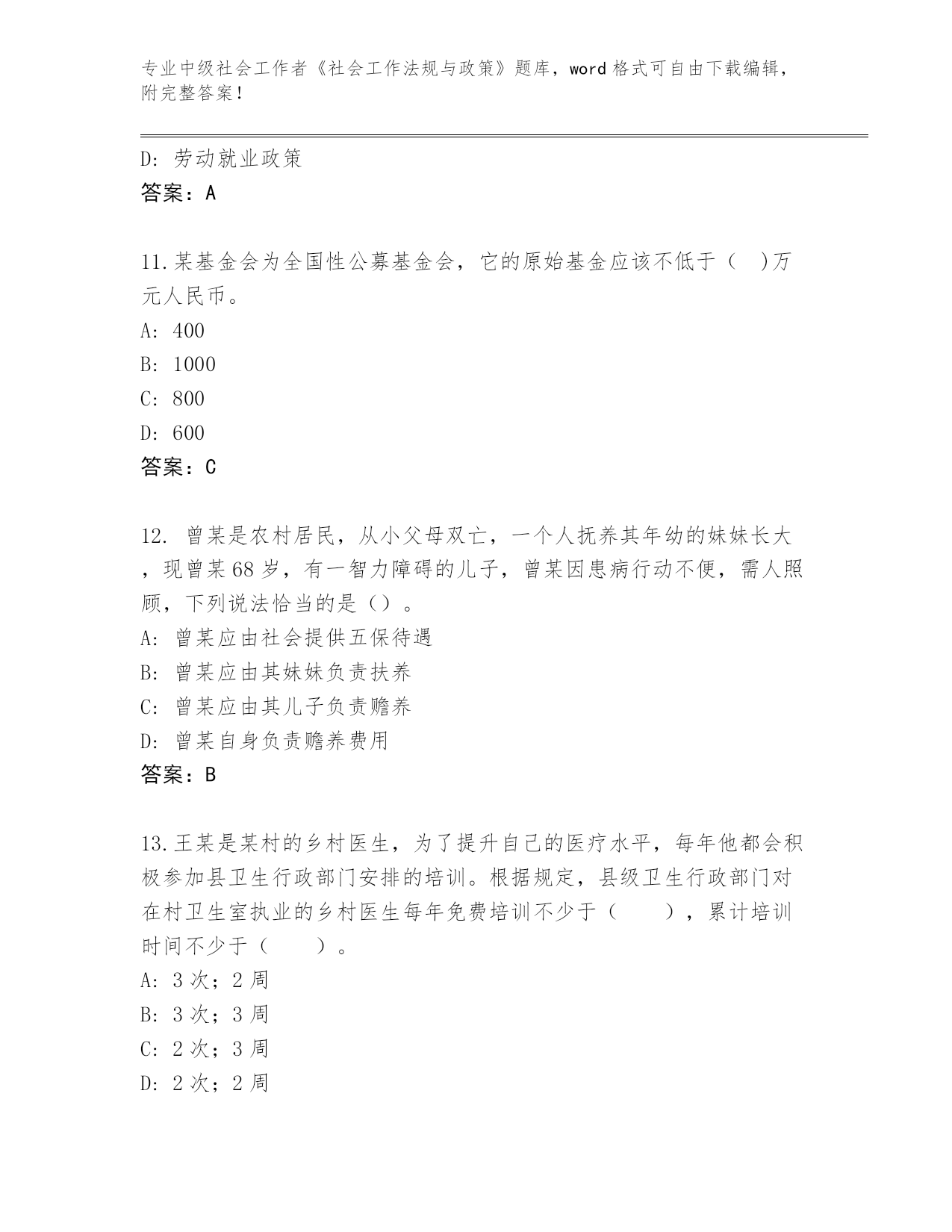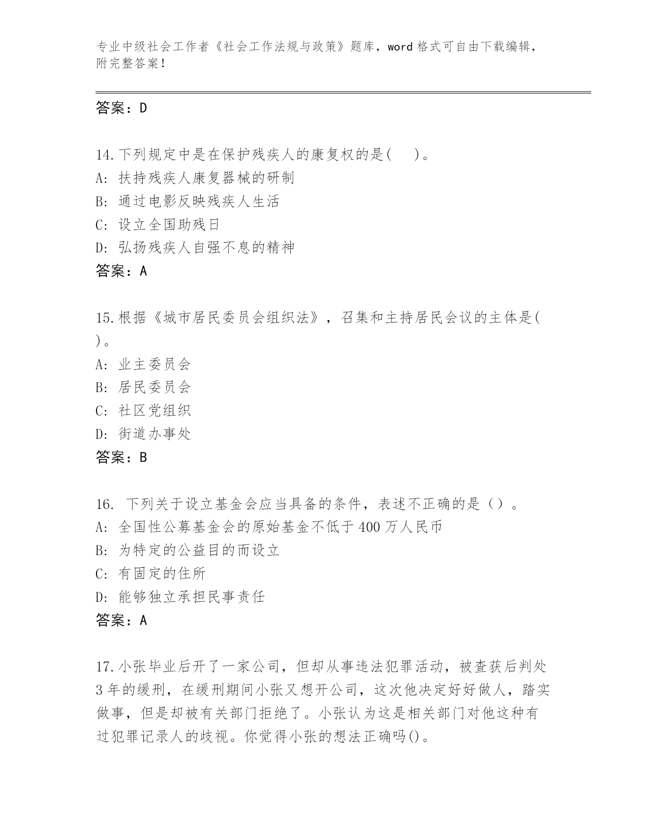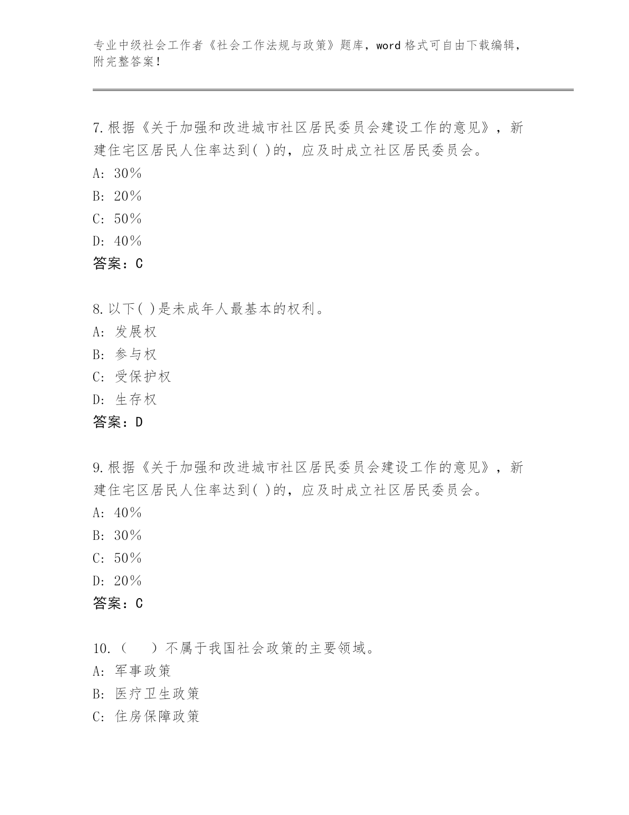 专业中级社会工作者《社会工作法规与政策》题库,word格式可自由下载编辑,附完整答案!云南省勐腊县2024年中级社会工作者《社会工作法规与政策》完整题库带答案(预热题)第I部分单选题(100题)1.下列()不属于《民法典》继承编规定的遗嘱形式。A:代书遗嘱B:录音遗嘱C:自书遗嘱D:要式遗嘱答案:D2.赵某在外地出差途中。遇见钱某、孙某和李某殴打一游客,上前制止,被三人打伤,花去医疗费5000元。赵某的行为被认定为见义勇为。赵某欲向法院起诉三人支付医疗费,但因生活困难无钱聘请律师,准备申请法律救援。根据《法律援助条例》,应当受理赵某法律援助申请的是()的法律援助机构。A:事件发生地B:赵某户籍地C:赵某所住地D:钱某、孙某或李某住所地答案:D3.小婷的父亲在部队服现役时牺牲,被批准为烈士。大学毕业后小婷回家找工作却屡屡碰壁。根据《烈士褒扬条例》的规定,小婷可以向哪个部门寻求就业服务?()A:当地人民政府人力资源社会保障部门B:小婷父亲服役的部队C:市级人民政府D:当地民政部门答案:A4.下列各项中,不属于基金会类型的为()。A:全国性公募基金会B:非公募基金会C:公募基金会D:单位性公募基金会答案:D5.根据《军人抚恤优待条例》,关于军人优待的说法,正确的是()。A:残疾军人凭《中华人民共和国残疾军人证》乘坐境内运行的民航班机,减收正常票价30%B:残疾军人凭《中华人民共和国残疾军人证》乘坐境内运行的火车,减收正常票价50%C:现役军人凭有效证件乘坐境内运行的客轮,减收正常票价20%D:现役军人凭有效证件免费乘坐境内运行的长途公共汽车答案:B6.(2016年)根据《社会保险法》,社会保障基金可以用于()。A:投资运营以实现保值增值B:平衡政府预算C:改建社会保障经办机构办公场所D:支付社会保险经办机构人员工资答案:A7.根据《关于加强和改进城市社区居民委员会建设工作的意见》,新建住宅区居民人住率达到()的,应及时成立社区居民委员会。A:30%B:20%C:50%D:40%答案:C8.以下()是未成年人最基本的权利。A:发展权B:参与权C:受保护权D:生存权答案:D9.根据《关于加强和改进城市社区居民委员会建设工作的意见》,新建住宅区居民人住率达到()的,应及时成立社区居民委员会。A:40%B:30%C:50%D:20%答案:C10.()不属于我国社会政策的主要领域。A:军事政策B:医疗卫生政策C:住房保障政策D:劳动就业政策答案:A11.某基金会为全国性公募基金会,它的原始基金应该不低于()万元人民币。A:400B:1000C:800D:600答案:C12.曾某是农村居民,从小父母双亡,一个人抚养其年幼的妹妹长大,现曾某68岁,有一智力障碍的儿子,曾某因患病行动不便,需人照顾,下列说法恰当的是()。A:曾某应由社会提供五保待遇B:曾某应由其妹妹负责扶养C:曾某应由其儿子负责赡养D:曾某自身负责赡养费用答案:B13.王某是某村的乡村医生,为了提升自己的医疗水平,每年他都会积极参加县卫生行政部门安排的培训。根据规定,县级卫生行政部门对在村卫生室执业的乡村医生每年免费培训不少于(),累计培训时间不少于()。A:3次;2周B:3次;3周C:2次;3周D:2次;2周答案:D14.下列规定中是在保护残疾人的康复权的是()。A:扶持残疾人康复器械的研制B:通过电影反映残疾人生活C:设立全国助残日D:弘扬残疾人自强不息的精神答案:A15.根据《城市居民委员会组织法》,召集和主持居民会议的主体是()。A:业主委员会B:居民委员会C:社区党组织D:街道办事处答案:B16.下列关于设立基金会应当具备的条件,表述不正确的是()。A:全国性公募基金会的原始基金不低于400万人民币B:为特定的公益目的而设立C:有固定的住所D:能够独立承担民事责任答案:A17.小张毕业后开了一家公司,但却从事违法犯罪活动,被查获后判处3年的缓刑,在缓刑期间小张又想开公司,这次他决定好好做人,踏实做事,但是却被有关部门拒绝了。小张认为这是相关部门对他这种有过犯罪记录人的歧视。你觉得小张的想法正确吗()。A:不正确。因为我国法律规定,有过犯罪记录的人员不得开办公司,所以相关部门的做法是正确的B:正确。我国法律规定每个公民都有合法经营公司的权利,相关部门不得对有过犯罪记录的人员设置障碍C:不正确。因为我国法律规定,对于社区矫正期间的人员,暂时剥夺其开办公司,企业,事业单位的权利D:不正确。因为我国法律规定个人为进行违法犯罪活动而设立公司的,在缓刑期间不得开办公司答案:D18.残疾人是指在心理、生理、人体结构上,某种组织、功能丧失或不正常,()的人。A:全部或者部分丧失以正常方式从事某种活动能力B:完全丧失生活自理能力C:部分丧失生活自理能力D:全部或者部分丧失从事某种活动能力答