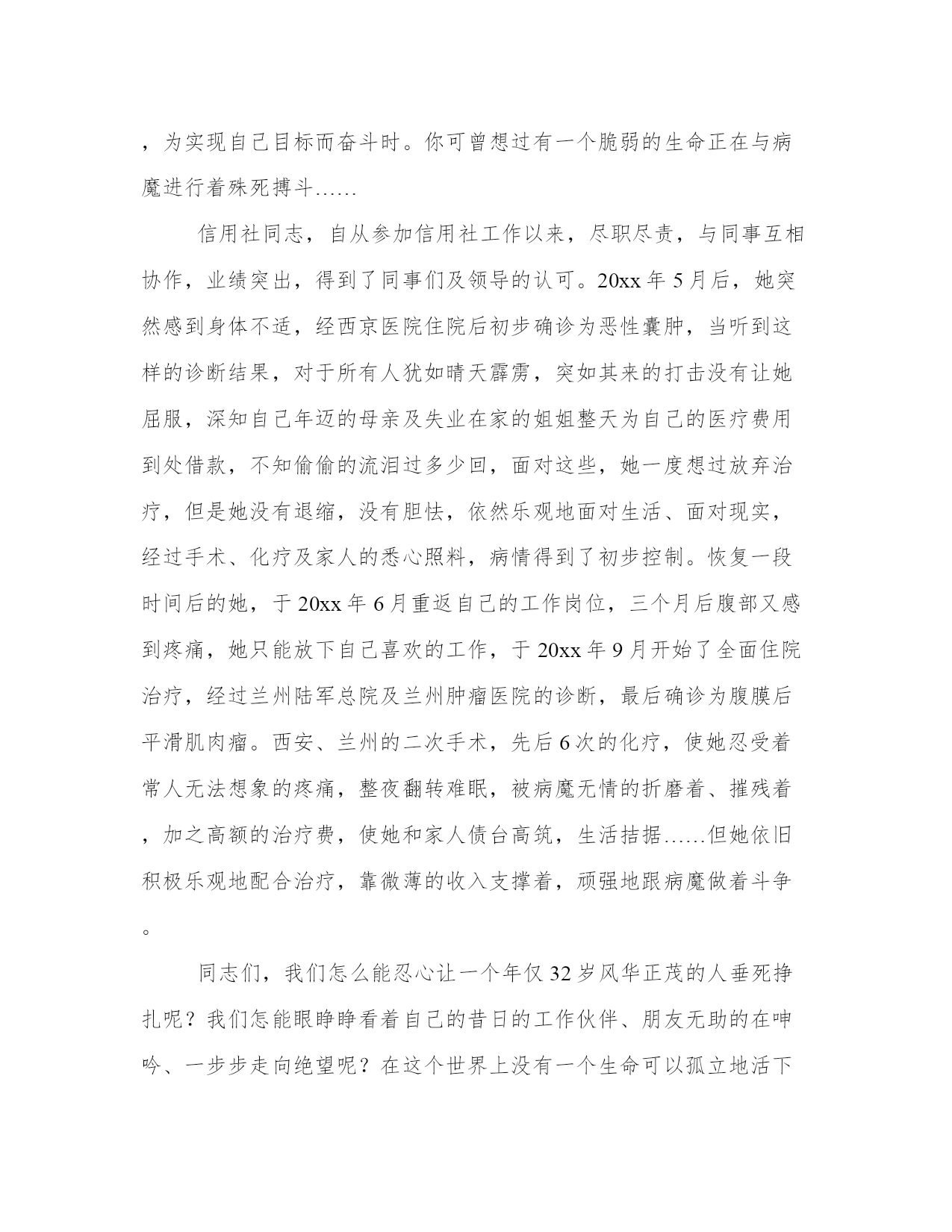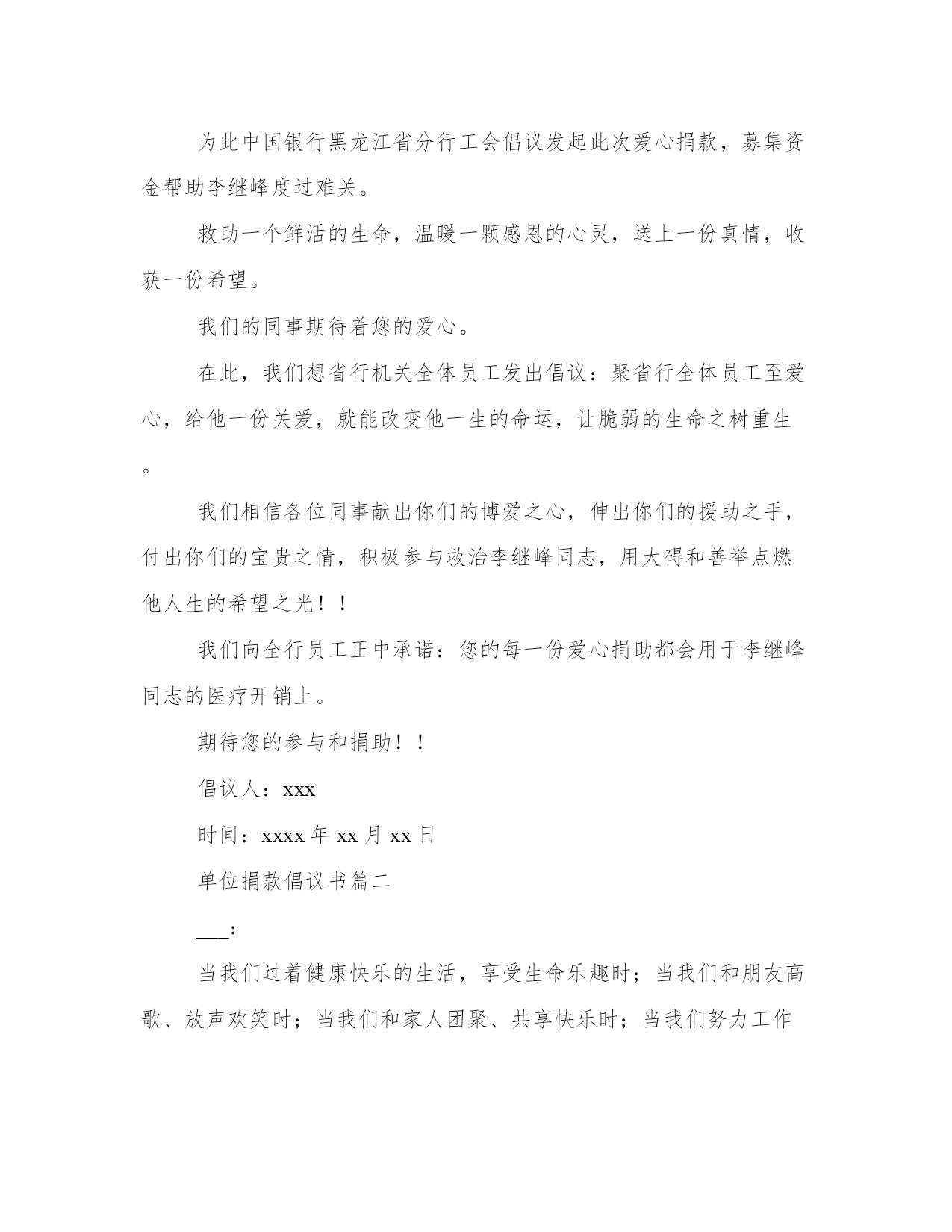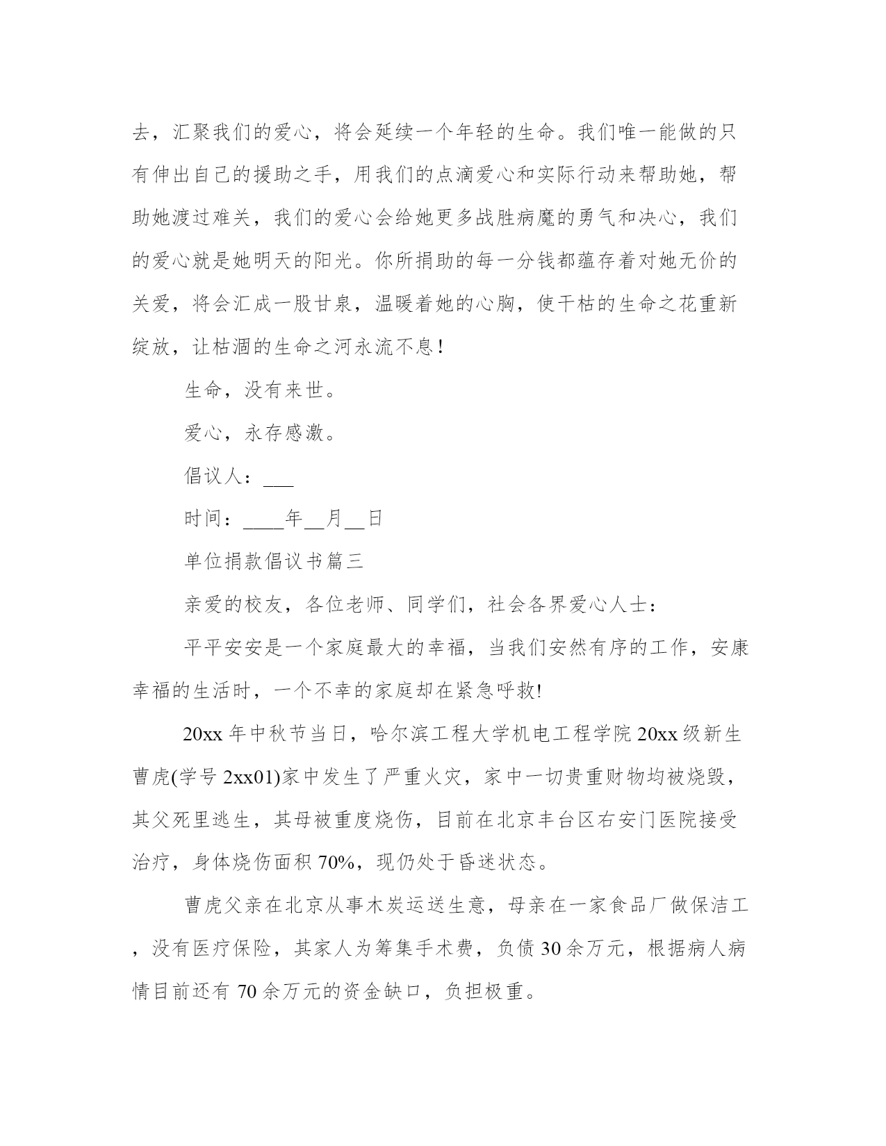 2023年单位捐款倡议书三篇(通用)在日常学习、工作或生活中,大家总少不了接触作文或者范文吧,通过文章可以把我们那些零零散散的思想,聚集在一块。大家想知道怎么样才能写一篇比较优质的范文吗?下面是小编帮大家整理的优质范文,仅供参考,大家一起来看看吧。单位捐款倡议书篇一你们好!张继峰是我行个人金融部的一名员工,xxx加入中行大家庭。xxx年罹患尿毒症,目前病情不断恶化,已经出现了心衰等肾脏器功能损坏,采取肾脏移植是生命唯一的希望。目前吉林大学附属第一医院已给出治疗方案,本次手术总体费用预计需要38万元,可作为一名普通员工,虽然在工作中诚恳热情、勤奋敬业、积极上进、兢兢业业。但xxx年家庭出现变故,与妻子离婚,房产留给女方和儿子,七年来一直独身一人租房生活,无人照料,同时还要支付正在哈工大上大四的`儿子生活费。患病之后高额的透析费用与药费花光了这些年来的积蓄,为了这次手术东拼西凑筹集了18万元资金,但这些钱对于治病来说远远不够,这让张继峰几近陷入绝境,举步维艰。为此中国银行黑龙江省分行工会倡议发起此次爱心捐款,募集资金帮助李继峰度过难关。救助一个鲜活的生命,温暖一颗感恩的心灵,送上一份真情,收获一份希望。我们的同事期待着您的爱心。在此,我们想省行机关全体员工发出倡议:聚省行全体员工至爱心,给他一份关爱,就能改变他一生的命运,让脆弱的生命之树重生。我们相信各位同事献出你们的博爱之心,伸出你们的援助之手,付出你们的宝贵之情,积极参与救治李继峰同志,用大碍和善举点燃他人生的希望之光!!我们向全行员工正中承诺:您的每一份爱心捐助都会用于李继峰同志的医疗开销上。期待您的参与和捐助!!倡议人:xxx时间:xxxx年xx月xx日单位捐款倡议书篇二___:当我们过着健康快乐的生活,享受生命乐趣时;当我们和朋友高歌、放声欢笑时;当我们和家人团聚、共享快乐时;当我们努力工作,为实现自己目标而奋斗时。你可曾想过有一个脆弱的生命正在与病魔进行着殊死搏斗……信用社同志,自从参加信用社工作以来,尽职尽责,与同事互相协作,业绩突出,得到了同事们及领导的认可。20xx年5月后,她突然感到身体不适,经西京医院住院后初步确诊为恶性囊肿,当听到这样的诊断结果,对于所有人犹如晴天霹雳,突如其来的打击没有让她屈服,深知自己年迈的母亲及失业在家的姐姐整天为自己的医疗费用到处借款,不知偷偷的流泪过多少回,面对这些,她一度想过放弃治疗,但是她没有退缩,没有胆怯,依然乐观地面对生活、面对现实,经过手术、化疗及家人的悉心照料,病情得到了初步控制。恢复一段时间后的她,于20xx年6月重返自己的工作岗位,三个月后腹部又感到疼痛,她只能放下自己喜欢的工作,于20xx年9月开始了全面住院治疗,经过兰州陆军总院及兰州肿瘤医院的诊断,最后确诊为腹膜后平滑肌肉瘤。西安、兰州的二次手术,先后6次的化疗,使她忍受着常人无法想象的疼痛,整夜翻转难眠,被病魔无情的折磨着、摧残着,加之高额的治疗费,使她和家人债台高筑,生活拮据……但她依旧积极乐观地配合治疗,靠微薄的收入支撑着,顽强地跟病魔做着斗争。同志们,我们怎么能忍心让一个年仅32岁风华正茂的人垂死挣扎呢?我们怎能眼睁睁看着自己的昔日的工作伙伴、朋友无助的在呻吟、一步步走向绝望呢?在这个世界上没有一个生命可以孤立地活下去,汇聚我们的爱心,将会延续一个年轻的生命。我们唯一能做的只有伸出自己的援助之手,用我们的点滴爱心和实际行动来帮助她,帮助她渡过难关,我们的爱心会给她更多战胜病魔的勇气和决心,我们的爱心就是她明天的阳光。你所捐助的每一分钱都蕴存着对她无价的关爱,将会汇成一股甘泉,温暖着她的心胸,使干枯的生命之花重新绽放,让枯涸的生命之河永流不息!生命,没有来世。爱心,永存感激。倡议人:___时间:____年__月__日单位捐款倡议书篇三亲爱的校友,各位老师、同学们,社会各界爱心人士:平平安安是一个家庭最大的幸福,当我们安然有序的工作,安康幸福的生活时,一个不幸的家庭却在紧急呼救!20xx年中秋节当日,哈尔滨工程大学机电工程学院20xx级新生曹虎(学号2xx01)家中发生了严重火灾,家中一切贵重财物均被烧毁,其父死里逃生,其母被重度烧伤,目前在北京丰台区右安门医院接受治疗,身体烧伤面积70%,现仍处于昏迷状态。曹虎父亲在北京从事木炭运送生意,母亲在一家食品厂做保洁工,没有医疗保险,其家人为筹集手术费,负债30余万元,根据病人病情目前还有70余万元的资金缺口,负担极重。曹虎的不幸得到社会及广大校友的关注,为保证校友爱心捐赠渠道畅通,哈尔滨工程大学教育发展基金会设立专项基金用于资助曹虎同学,所有捐赠款项均会在基金会网站上公布。倡议人:20xx年x月x日